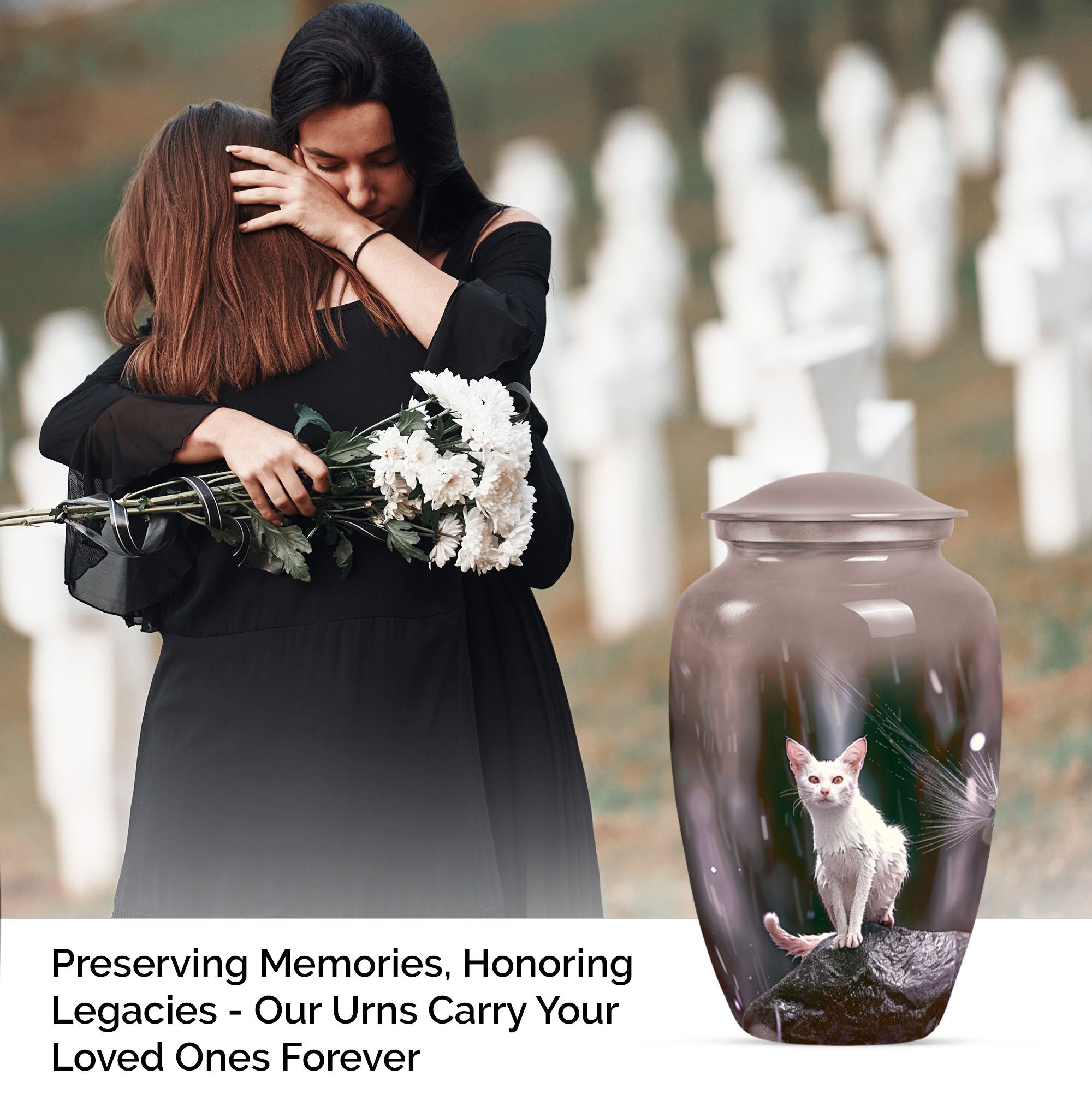 This impeccable 10-inch white cat urn is an excellent embarking of honoring the life of a loved one. Crafted meticulously from premium quality, lightweight aluminium, this funeral large urn provides a durable and elegant resting place for human adult male ashes. It boasts a capacity of 200 cubic inches which adeptly holds ashes and weighs only 3.3 pounds. The package comes complete with a luxurious velvet pouch designed for containment of the ashes in the urn. The urn honors the 'Abstract' theme thereby making it more elaborative and appealing. A standout feature is the possibility of adding that extra personal touch by engraving names of your choice. Note, this offering is also suitable as memorial urns for ashes of adult female hence providing a beautiful representation for both genders. Known for its durability, this urn cumulatively caters to all sexes and stands out as a resplendent piece of corporality among other cremation, companion urns. In memoriam, purchase our unique urn to cherish the unforgettable memories of the departed soul.