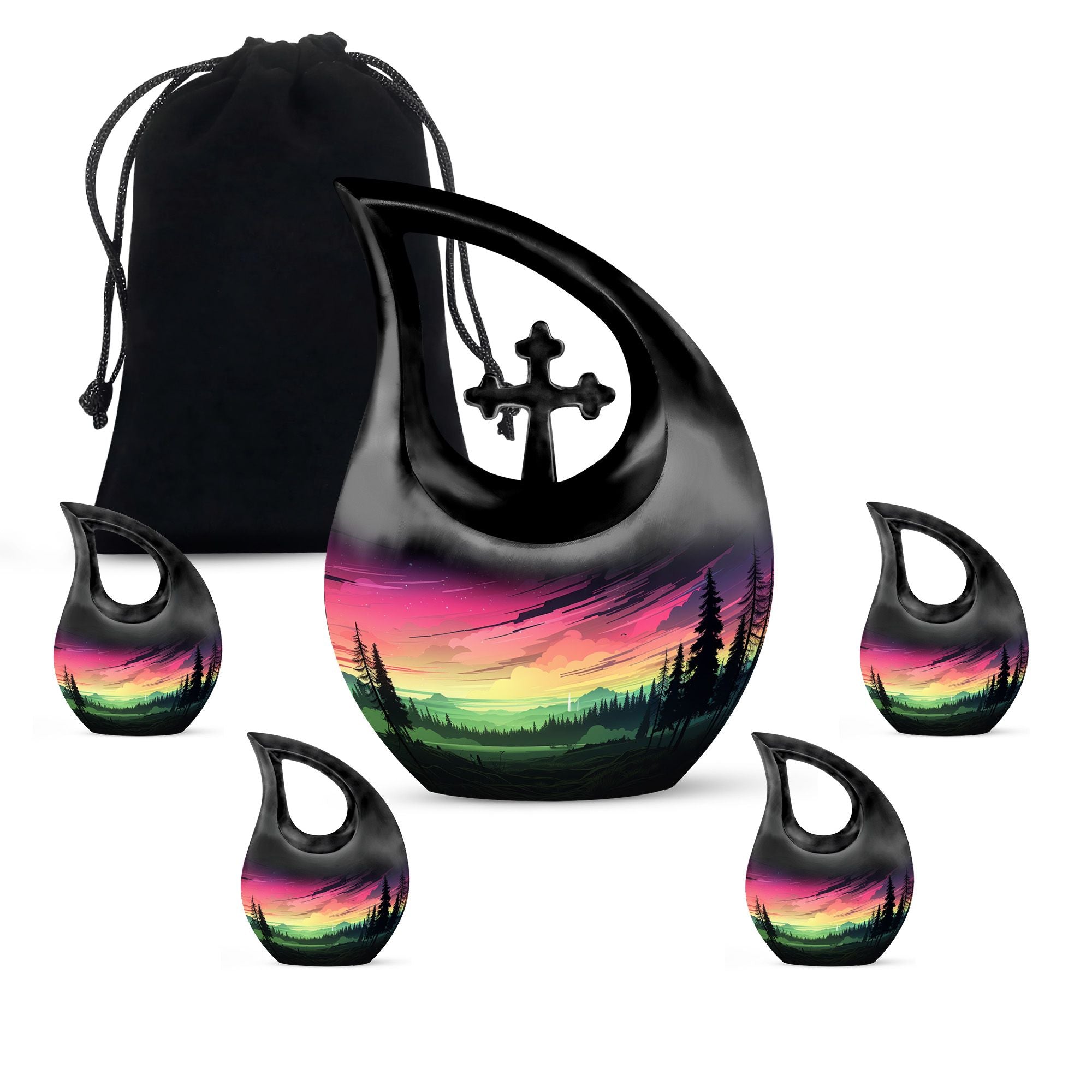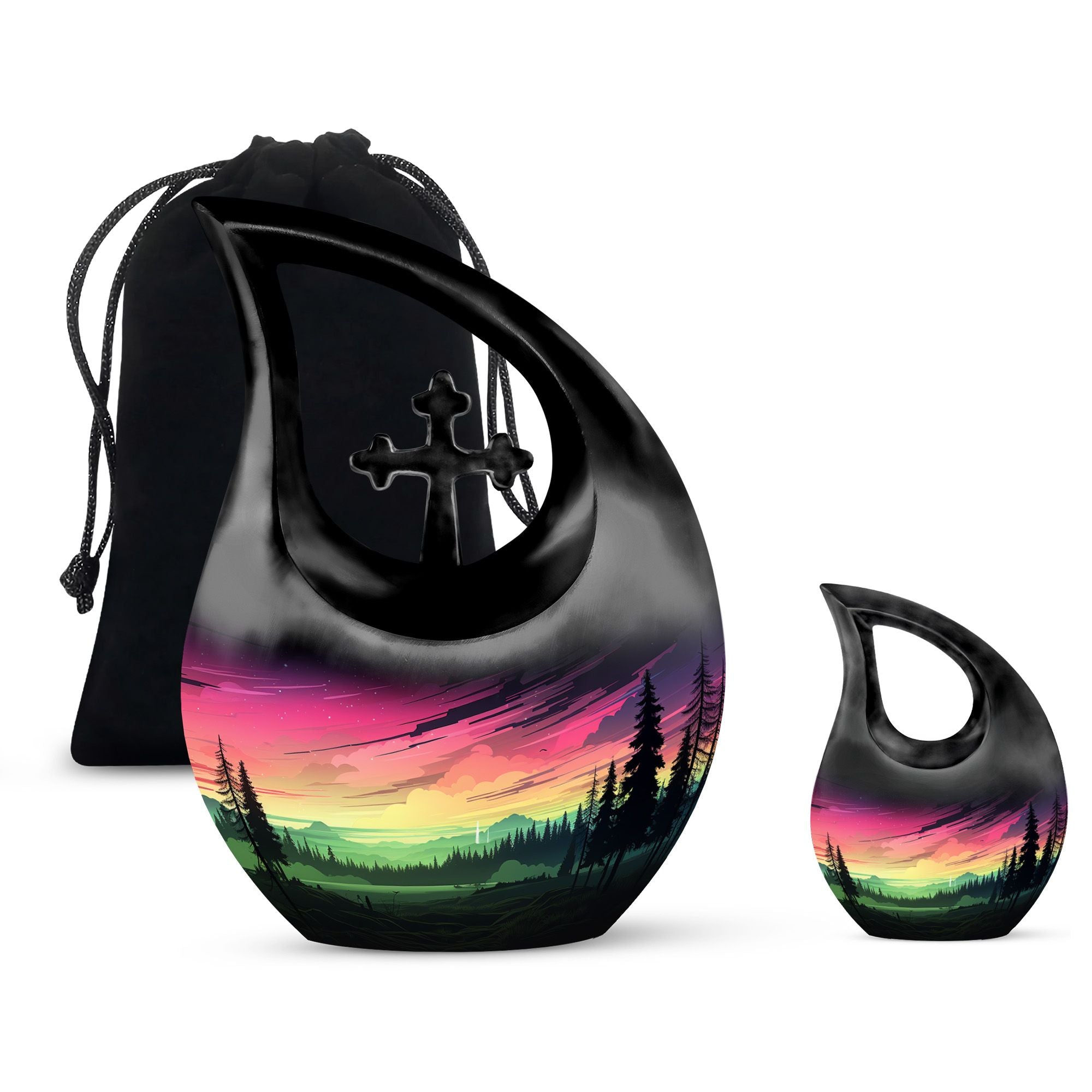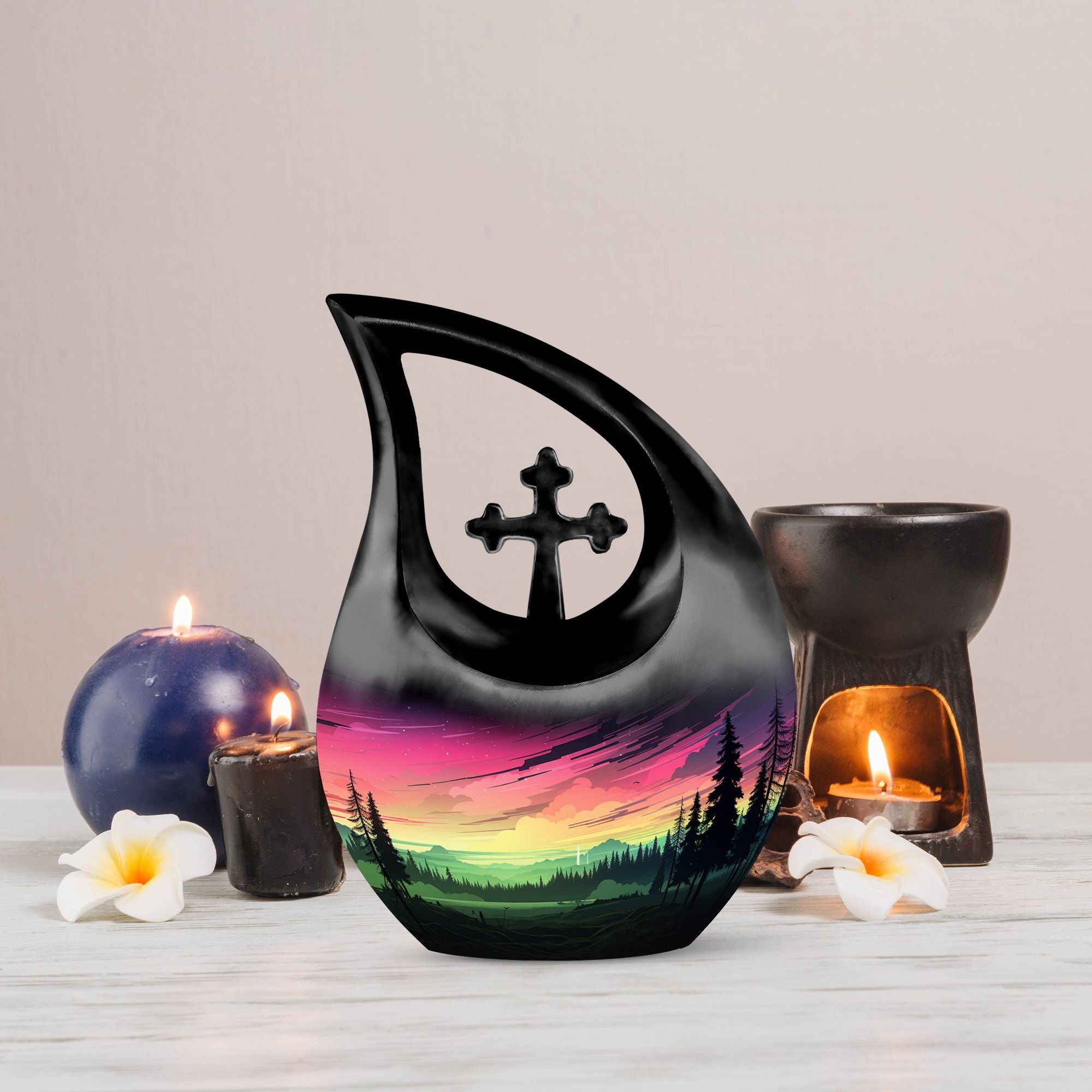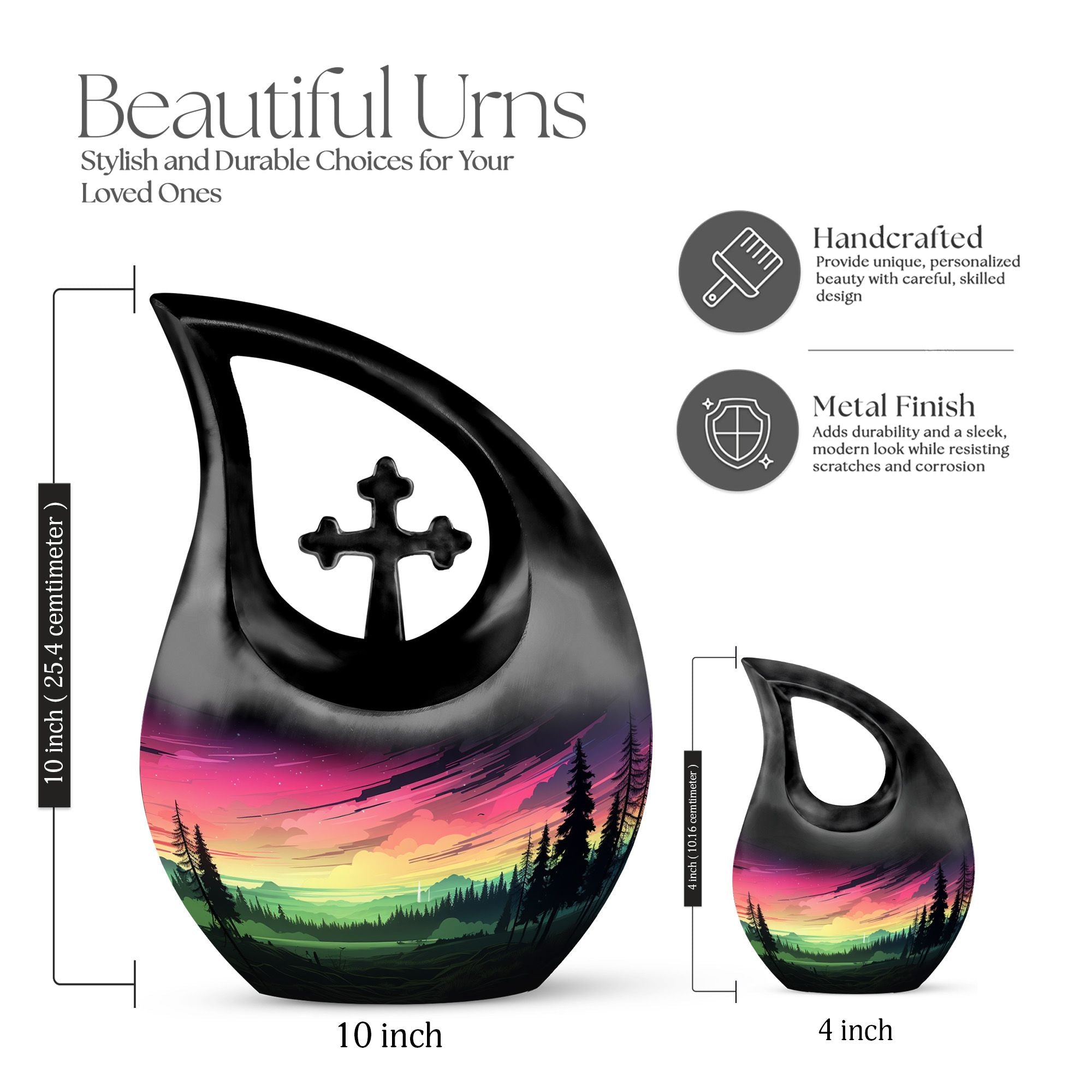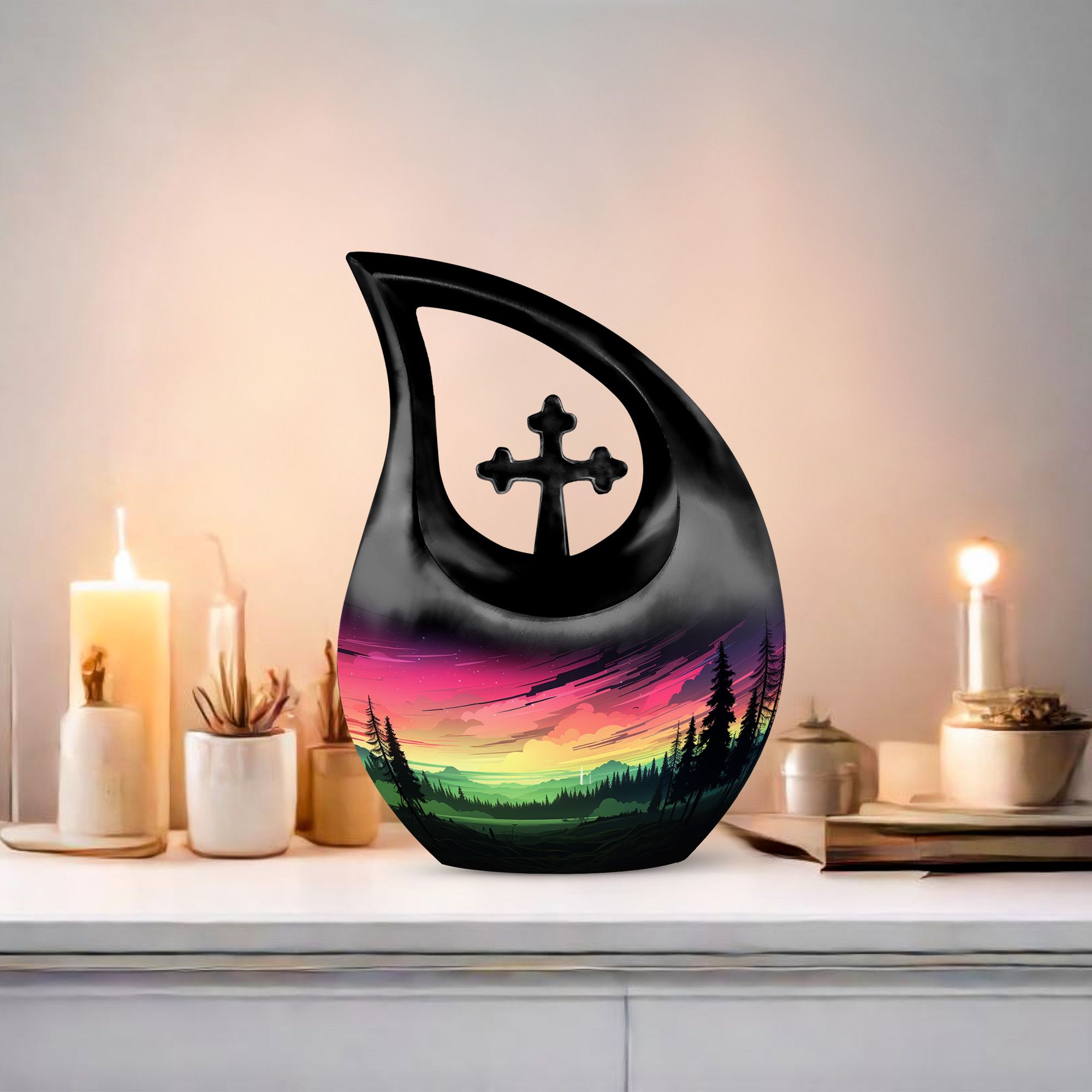 Keep the memory of your loved ones alive with the Aurora Urn, tastefully designed to honor and celebrate life. Crafted from high-quality aluminium, this large urn offers a substantial capacity of 200 cubic inches, making it suitable for housing ashes after cremation. The urn features a unique Cross Drop theme that evokes a sense of serenity and respect. This item measures 10 inches in height and weighs in at 3.3 pounds, demonstrating its solid, enduring nature. Personalize your urn with engraved names for that special touch. Our urn is not only an elegant memorial urn, but also a beautiful piece of home decor. It comes with a velvet pouch for containment of ashes, showing our attention to detail and concern for your comfort during this difficult time. Searching for designer urns for ashes often leads to Aurora Urn, a preferred choice of many. Ideal for giving your loved one a dignified last resting place, this urn truly encapsulates the spirit of love, memory, and peace.