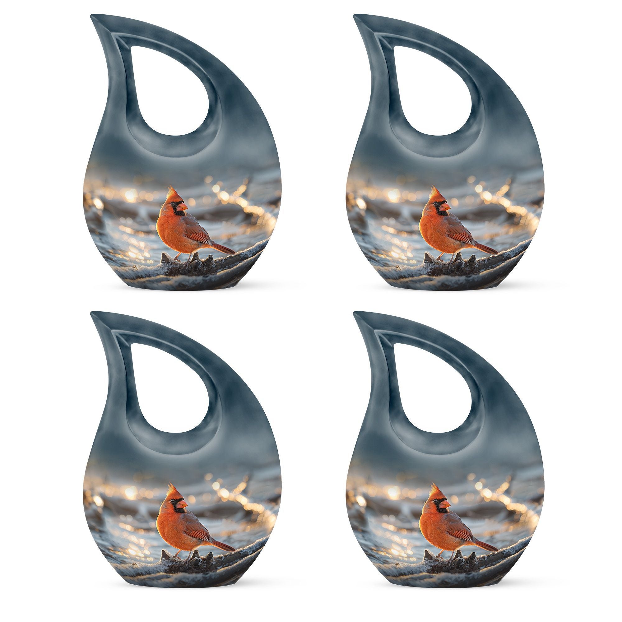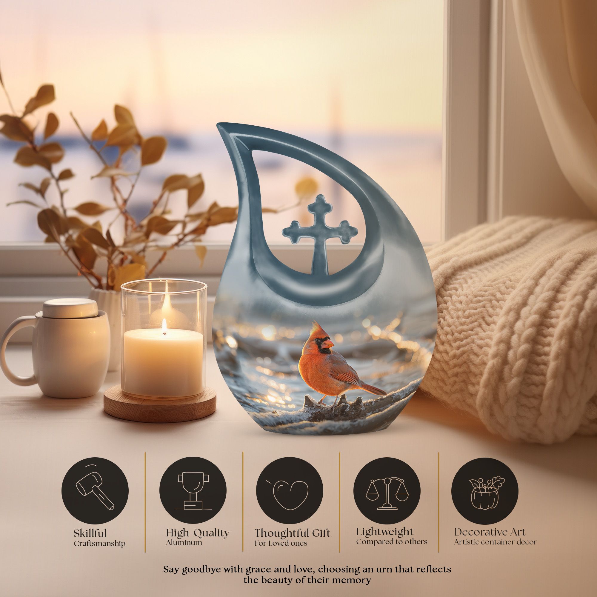 The Cardinal Bird Urn, a tastefully detailed homage to loved ones who have passed on. Crafted from durable aluminum, this Cremation Urn measures a full-bodied 10 inches in height, accommodating an ample capacity of 200 cubic inches of ashes. Weighing in at a sturdy 3.3 pounds, this Large Urn represents a blend of elegance and durability. Its Cardinal Bird theme is beautifully woven into a Cross Drop motif, offering vivid symbolism and exquisite artistry. Each urn comes with a soft velvet pouch, providing a dignified containing element for your cherished one's remains. Additionally, with personalization options available, you can enhance the urn with engraved names of your choice, adding an extra layer of depth, connectivity, and dignity to this memorial urn. Infuse an element of serenity, dignity, and remembrance into your memorial ceremonies with these Cardinal Bird Cremation Urns. Whether you're searching for Burial Urns, Urns For Ashes, Urns For Human Ashes, or Affordable Urns, this meticulously crafted piece serves as a poignant tribute.