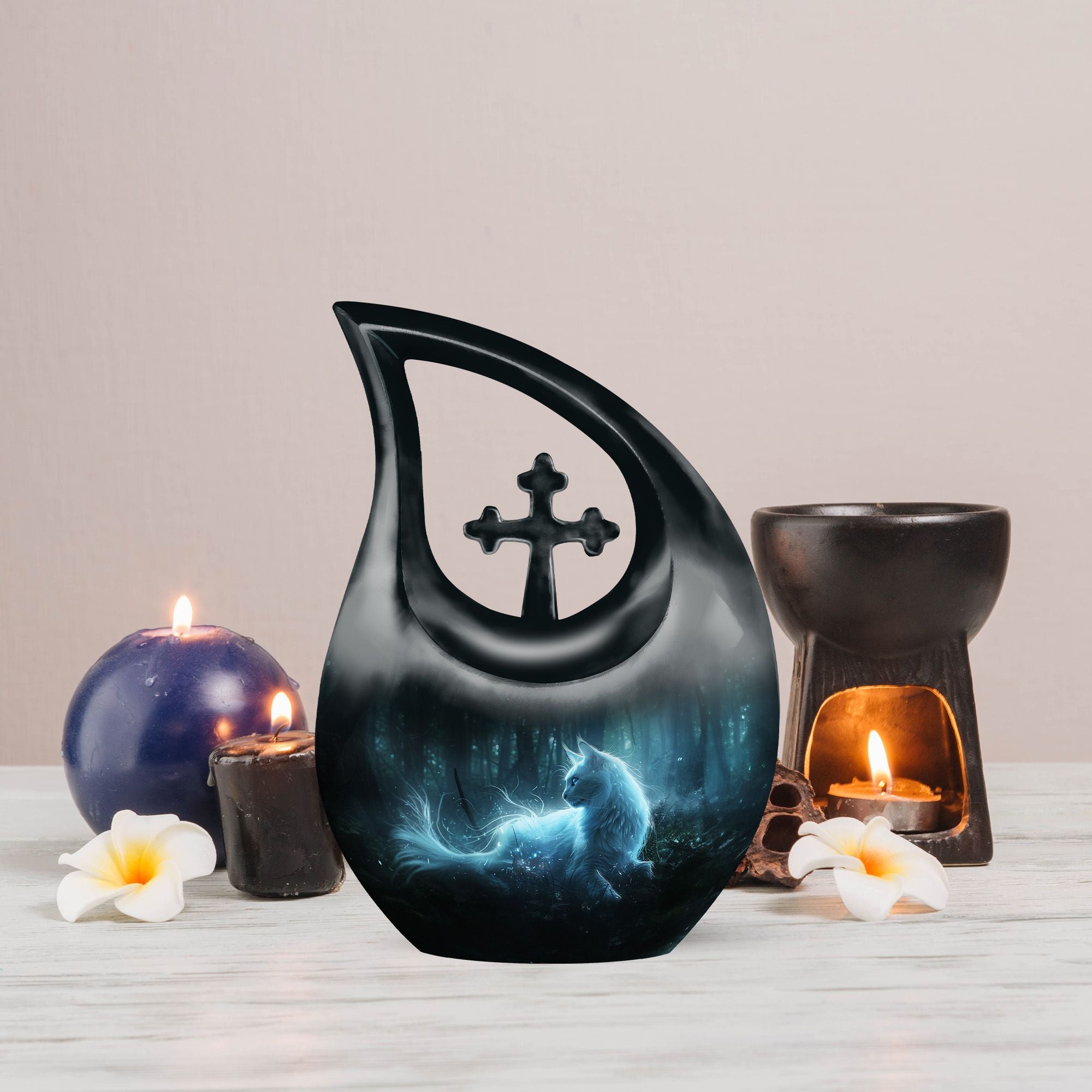 Cherish the memory of your feline friend with our Cat Urn, an affordable cremation and burial option. This large urn, embodied by an aluminium structure, carries the weight of your love without being burdensome at just 3.3 pounds. Its size of 10 inches stands as a dignified tribute to your beloved pet. This unique urn lends an aura of serenity with its 'Cross Drop' theme. Crafted with attention to detail, it has a capacity to accommodate up to 200 cubic inches of ash. Your urn package comes with a velvet pouch, respectfully containing the ashes of your treasured companion. Add a touch of personal affection with our customization option, allowing you to engrave names for that special connection. It's more than just an urn, it's a 'memorial urn', a tangible reminder of your cat's precious life. This urn, an 'ash keepsake' serves as a fitting tribute. Its biodegradable nature adds an eco-friendly touch, embodying our commitment to the preservation of nature. Keep the memory alive with this exquisite memorial piece.