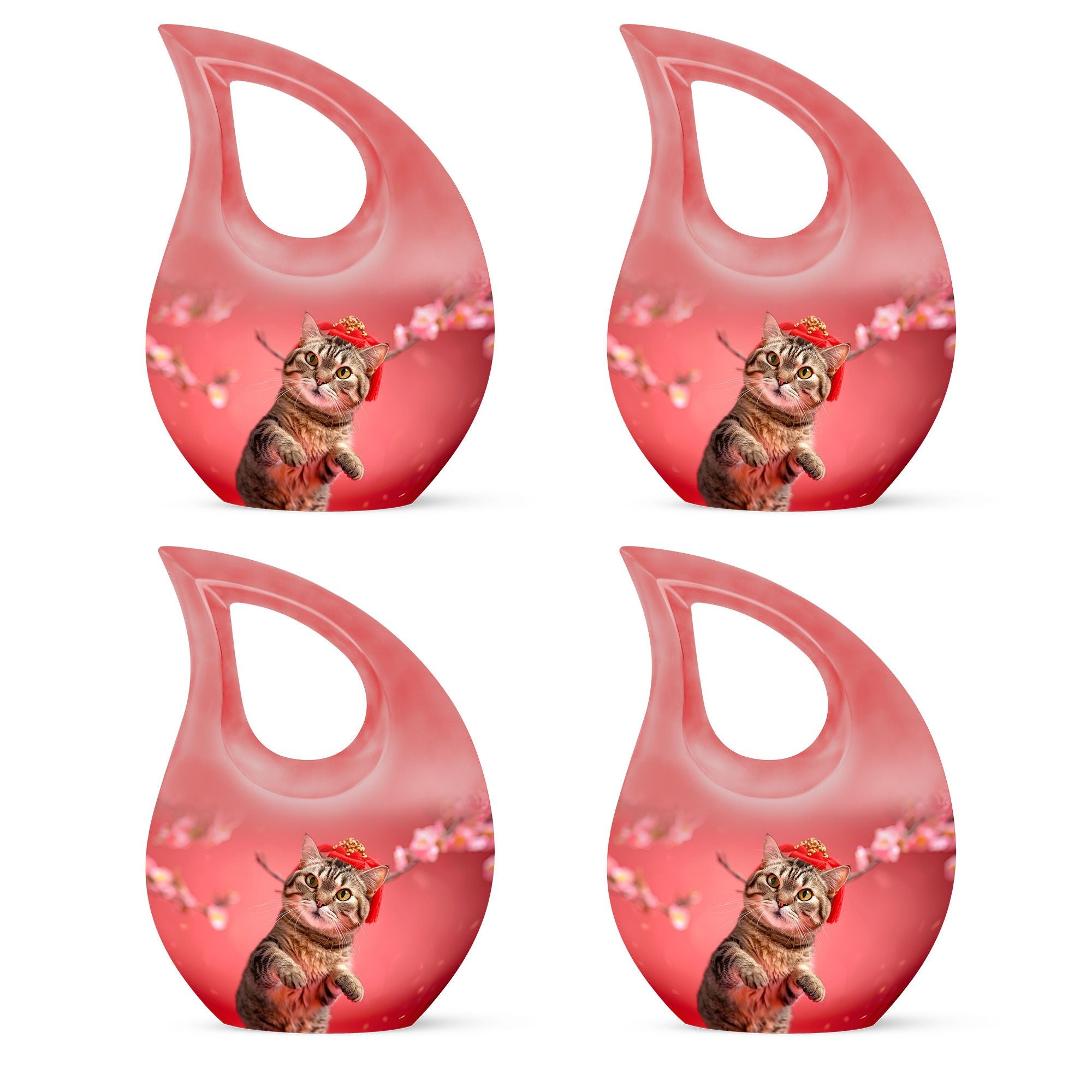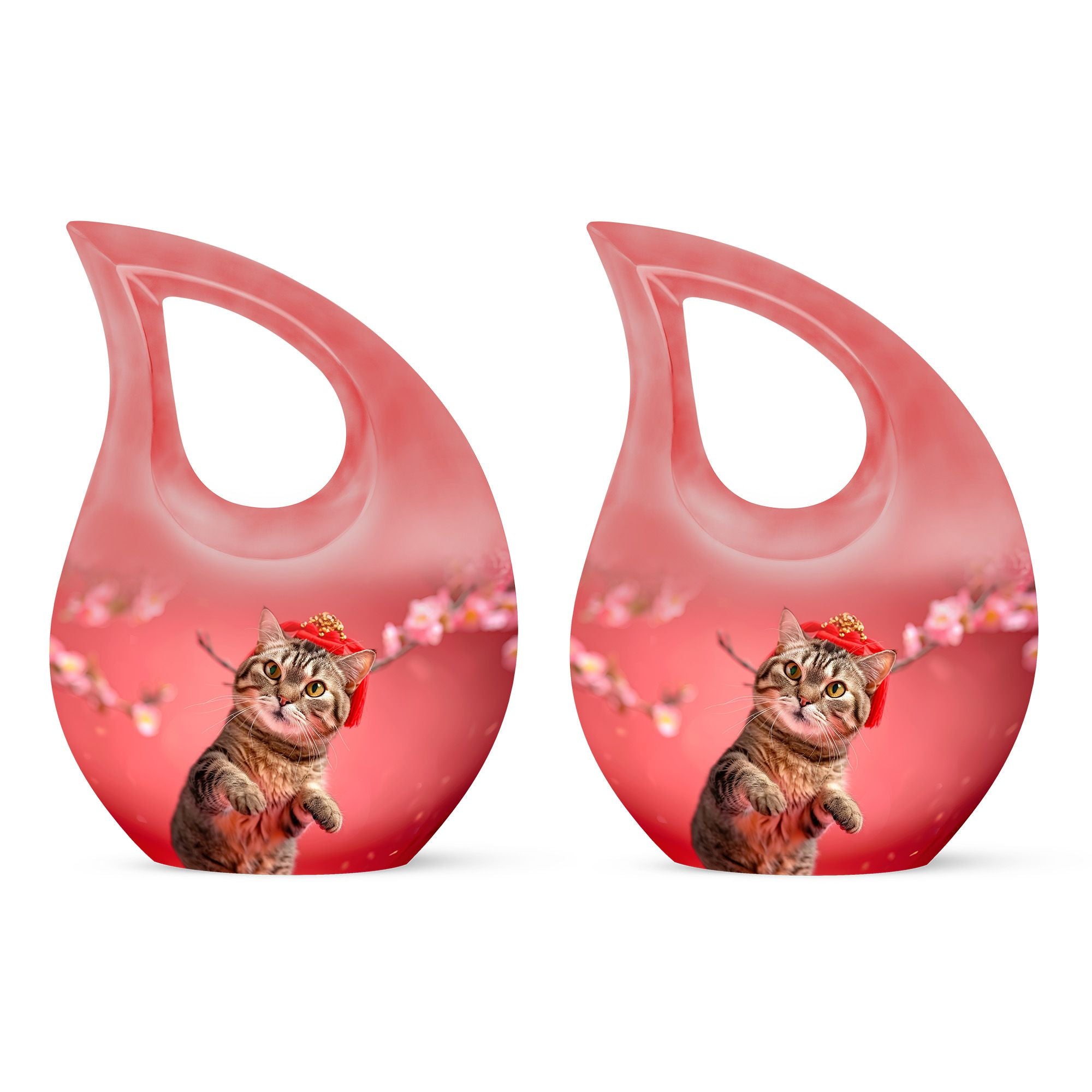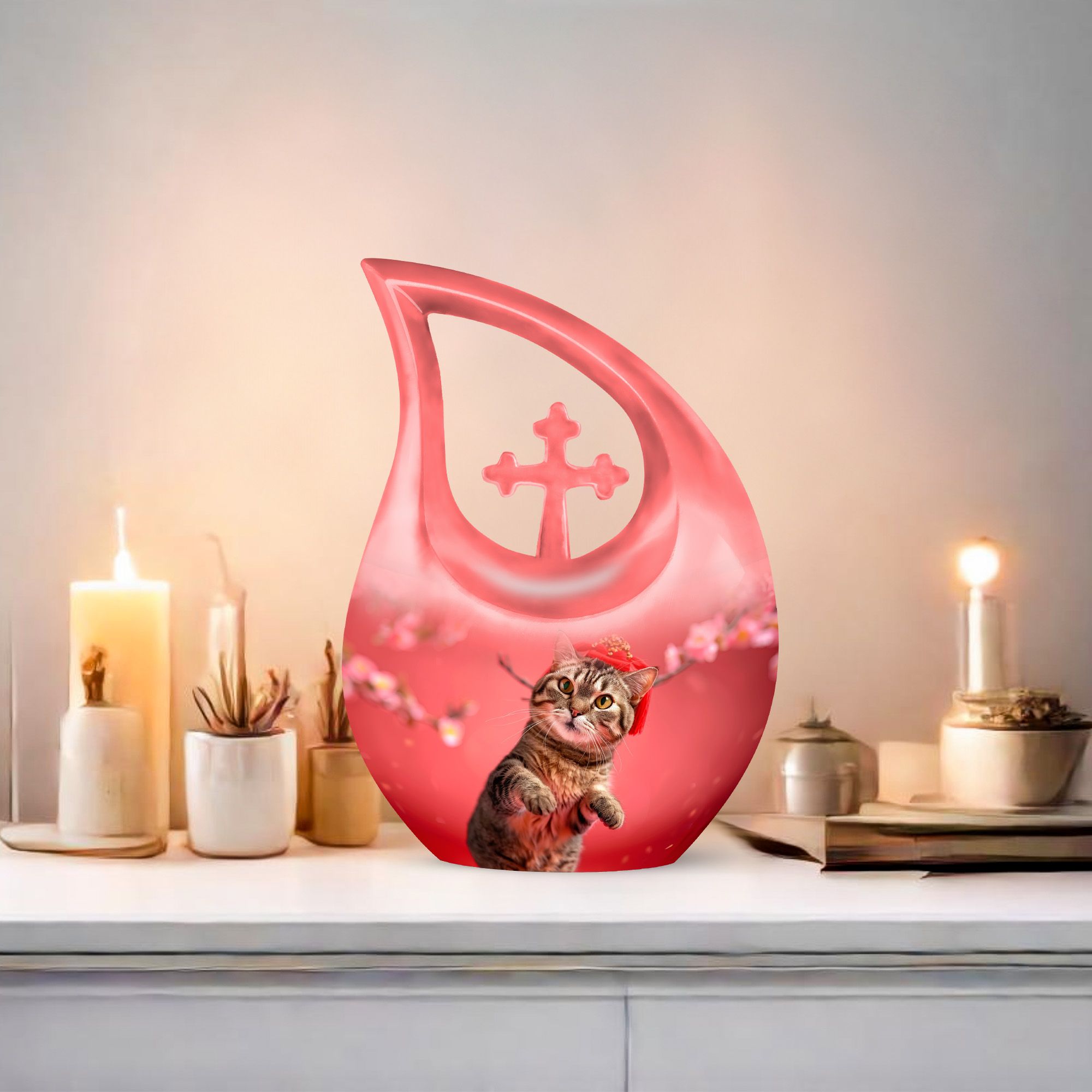 Introduce a beautiful tribute for your beloved feline with our Cat Themed Aluminium Keepsake Urn, tailored to provide precious memories a dignified resting place. Not typical at all, this urn measures 10 inches in stature and is constructed from high-quality Aluminium, rendering it durable and long-lasting. Being a large urn, its thoughtful 200 cubic inch capacity will tastefully accommodate the ashes of your dearly departed. To add even more uniqueness, you can personalize it with engraved names, making the urn a special memento. The urn weighs 3.3 pounds, adding to its overall sturdiness. Adding to the convenience of its use, it comes together with a velvet pouch for containment of ashes. Enriched with a serene Cross Drop theme, this urn shines brightly among modern urns for human ashes, cremation caskets, and a host of unique urns for human ashes. Discover peace in memorializing your cherished one with our esteemed keepsake urns for ashes, epitomizing deeply cherished memories.