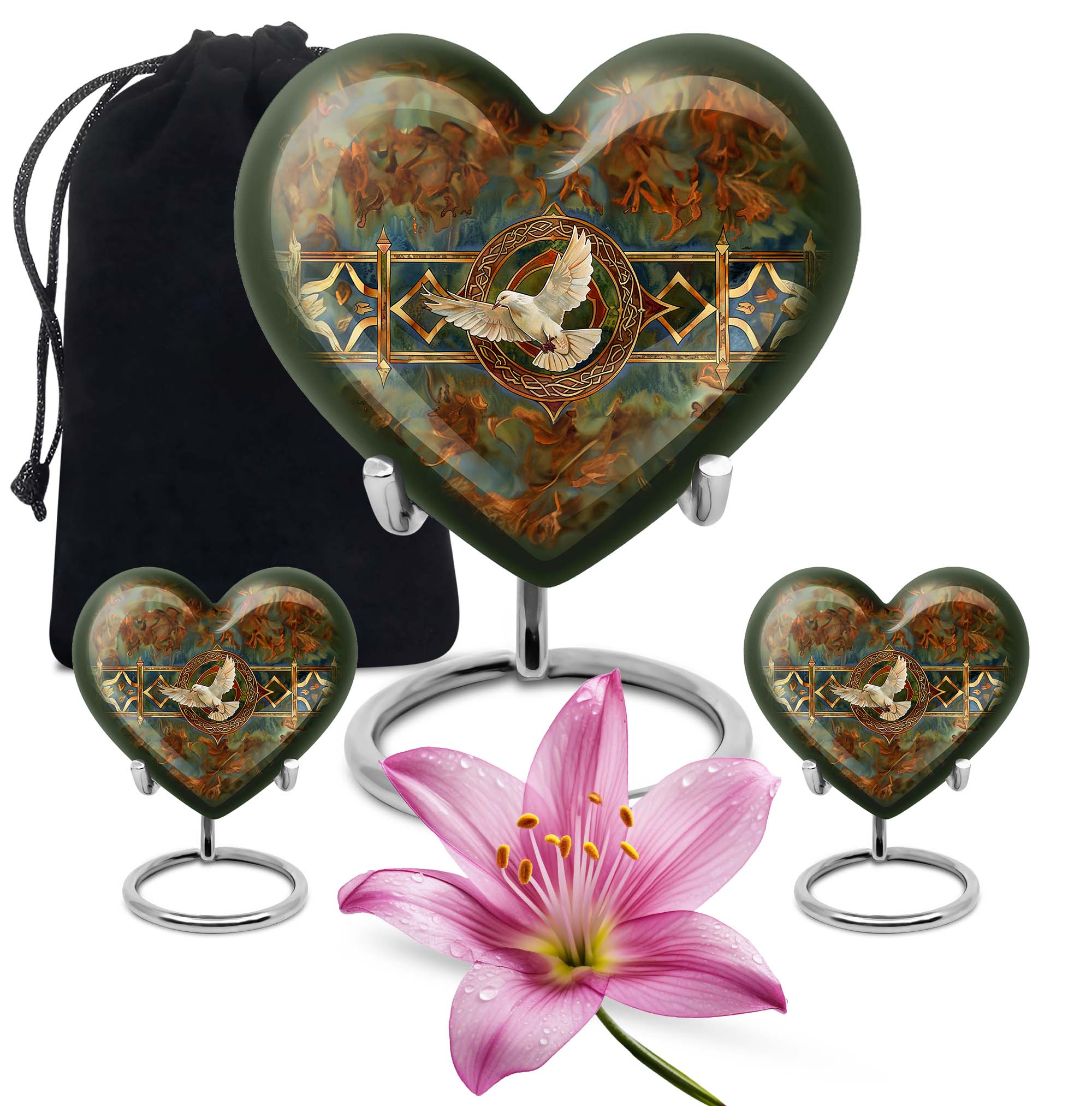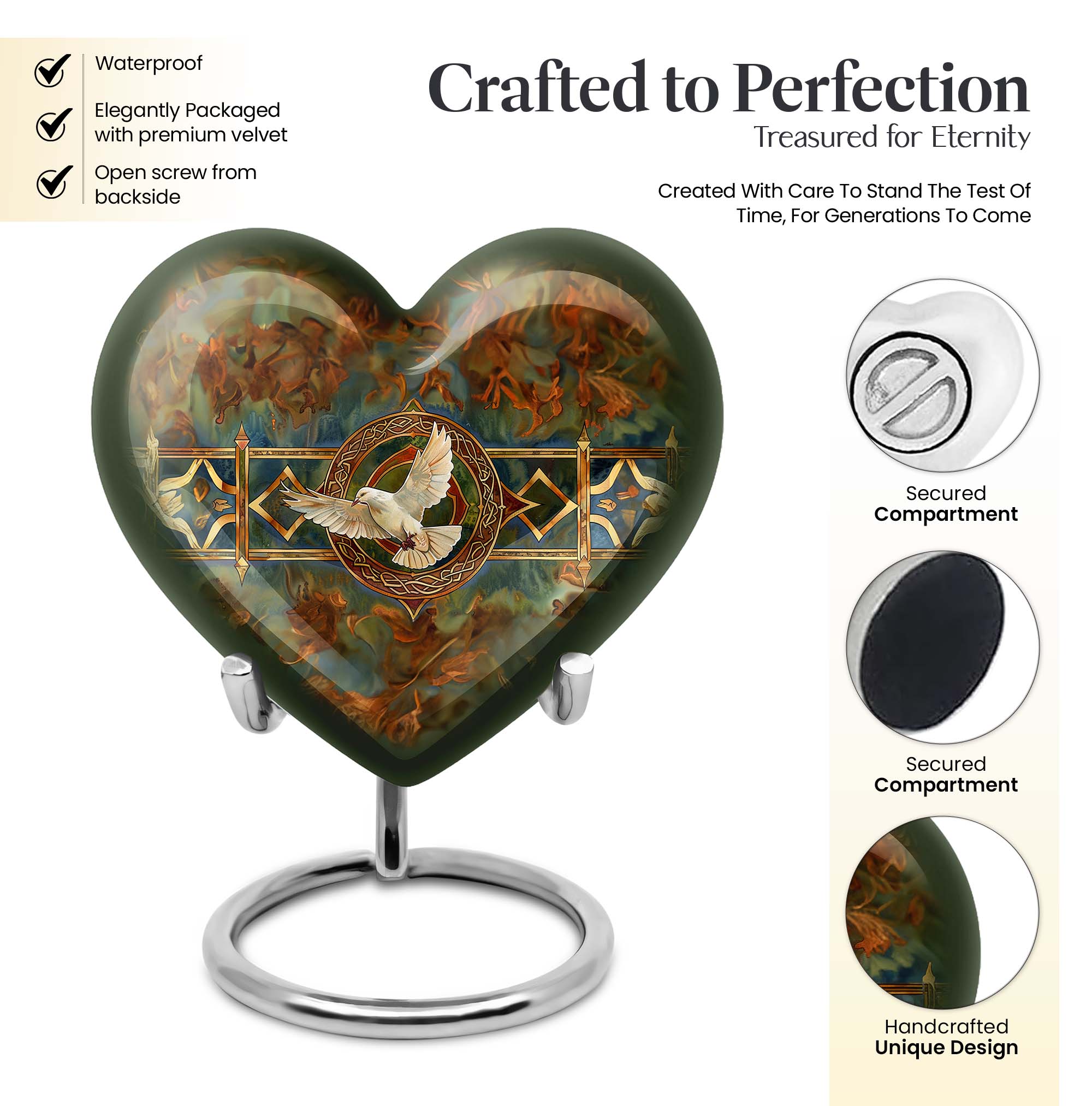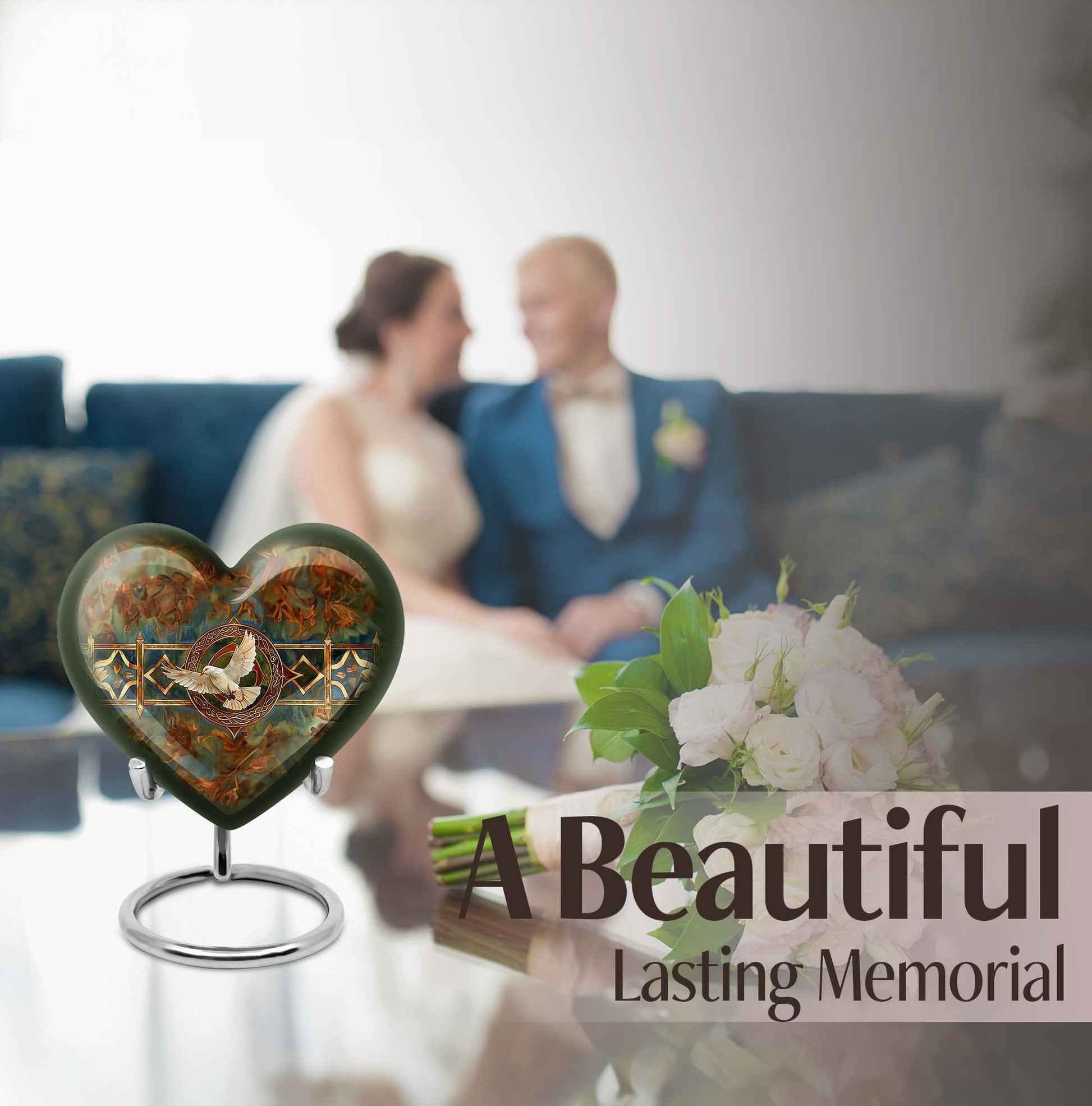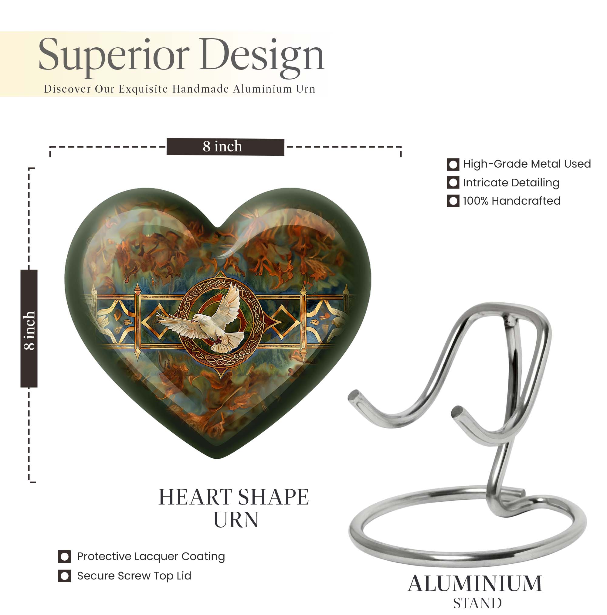 Cherish your loved one's memory with this exquisite Catholic Urn, a touching tribute designed with heartfelt emotions in every inch. With its substantial size of 10 inches and 200 cubic inches capacity, this memorial large urn accommodates human ashes with grace and respect. The high-quality aluminium construction leads to a sturdy weight of 3.3 pounds, ensuring the urn stands resolute in remembrance. The abstract theme of this large urn echoes enigmatic bliss, encapsulating the mystery of life after death. Offering the convenience of customization, this product allows personal engravings of names, adding a touch of familiarity to the divinity. Easy containment of ashes is facilitated with the included velvet pouch. Whether you're looking for cremation urns for men or women, or an adult female or male catholic urn, our product is crafted to serve your needs. Please note the design is based on an enticing heart motif, enhancing the aesthetic appeal of the urn.