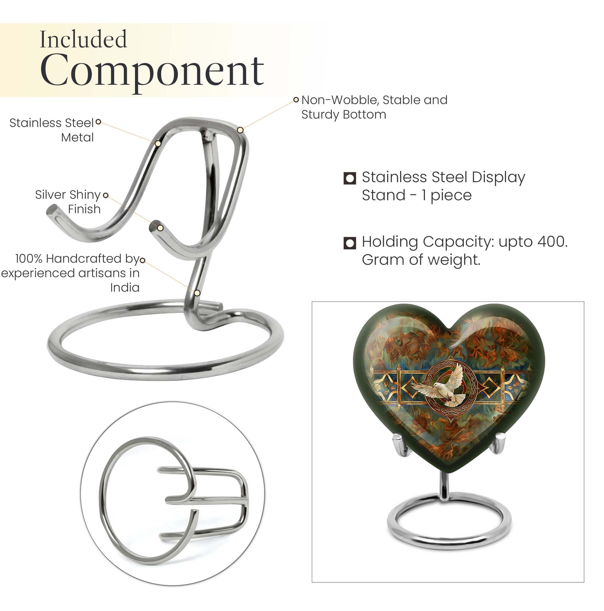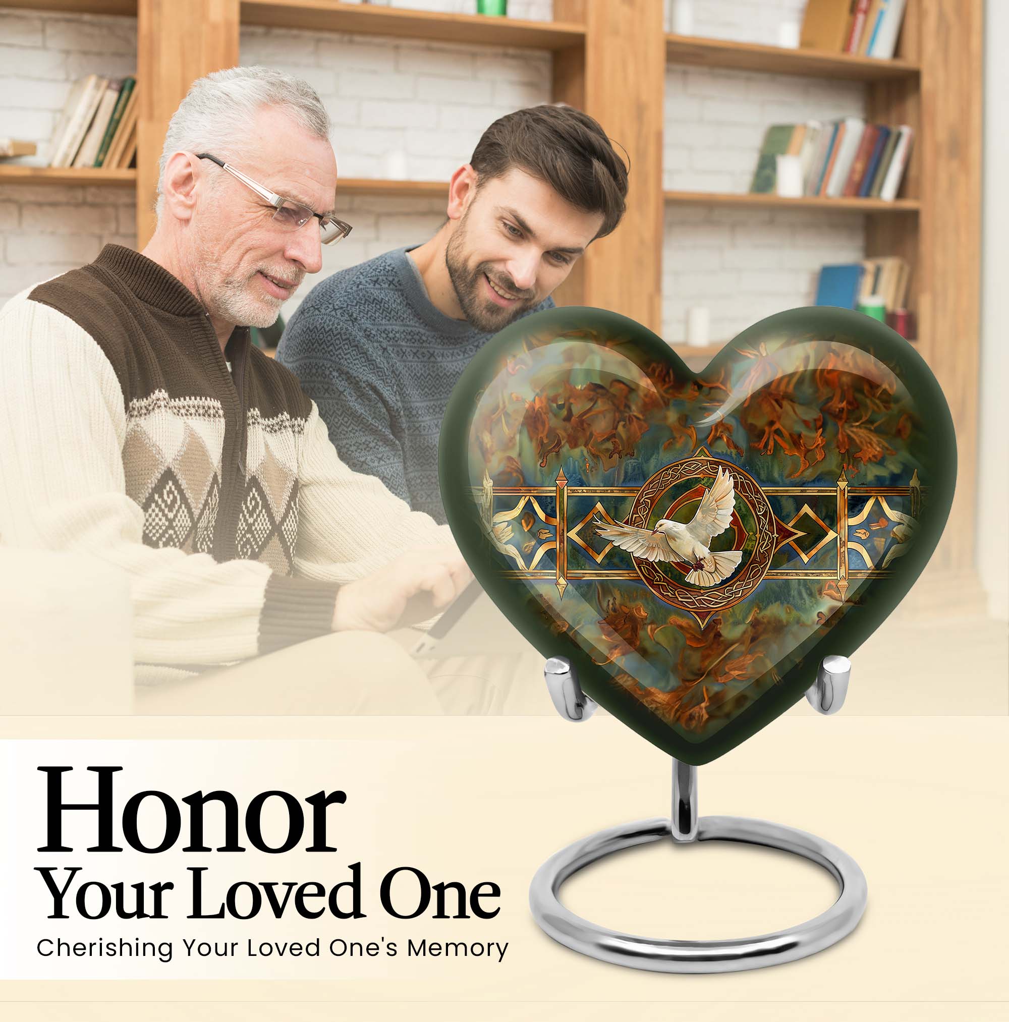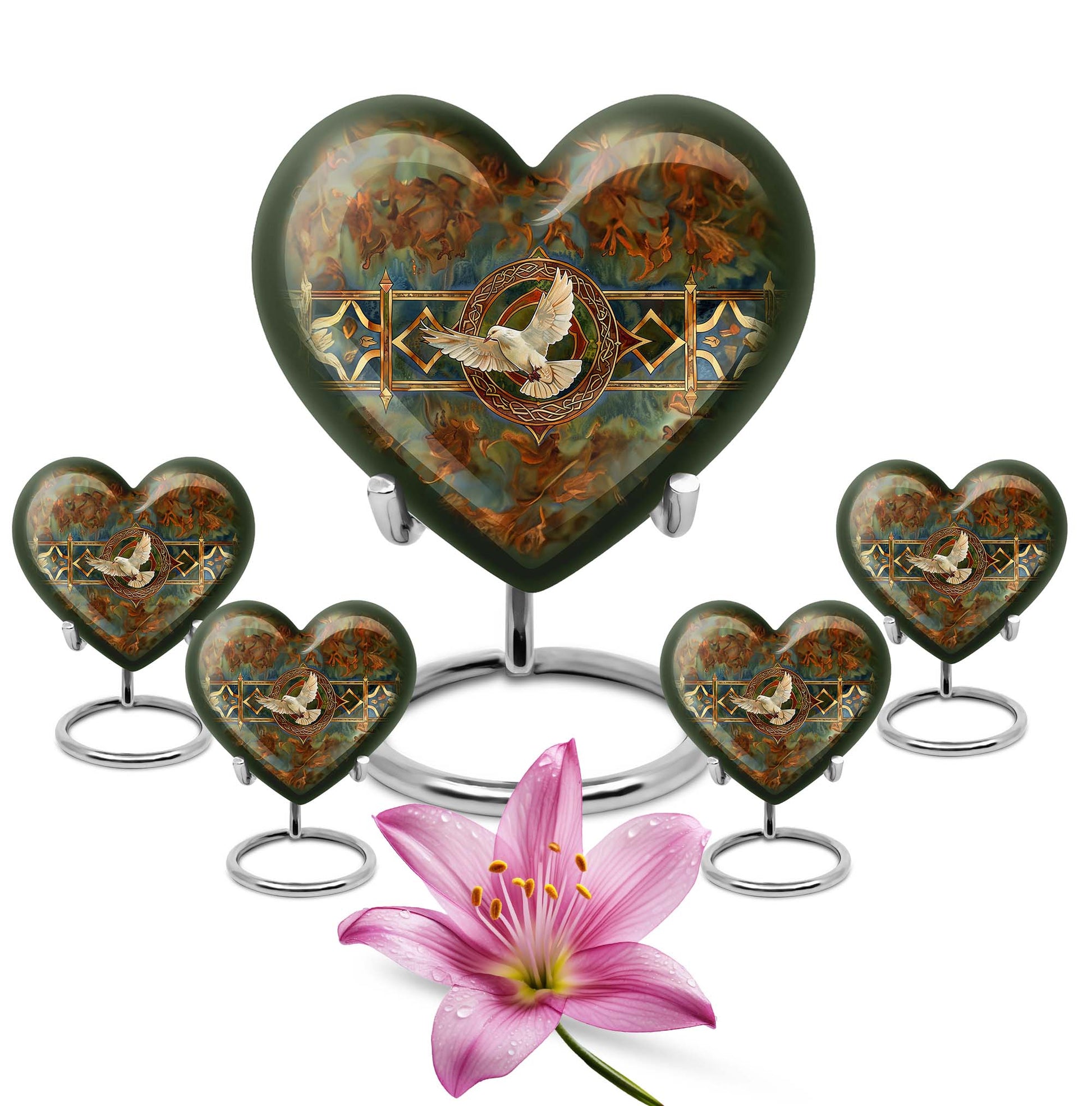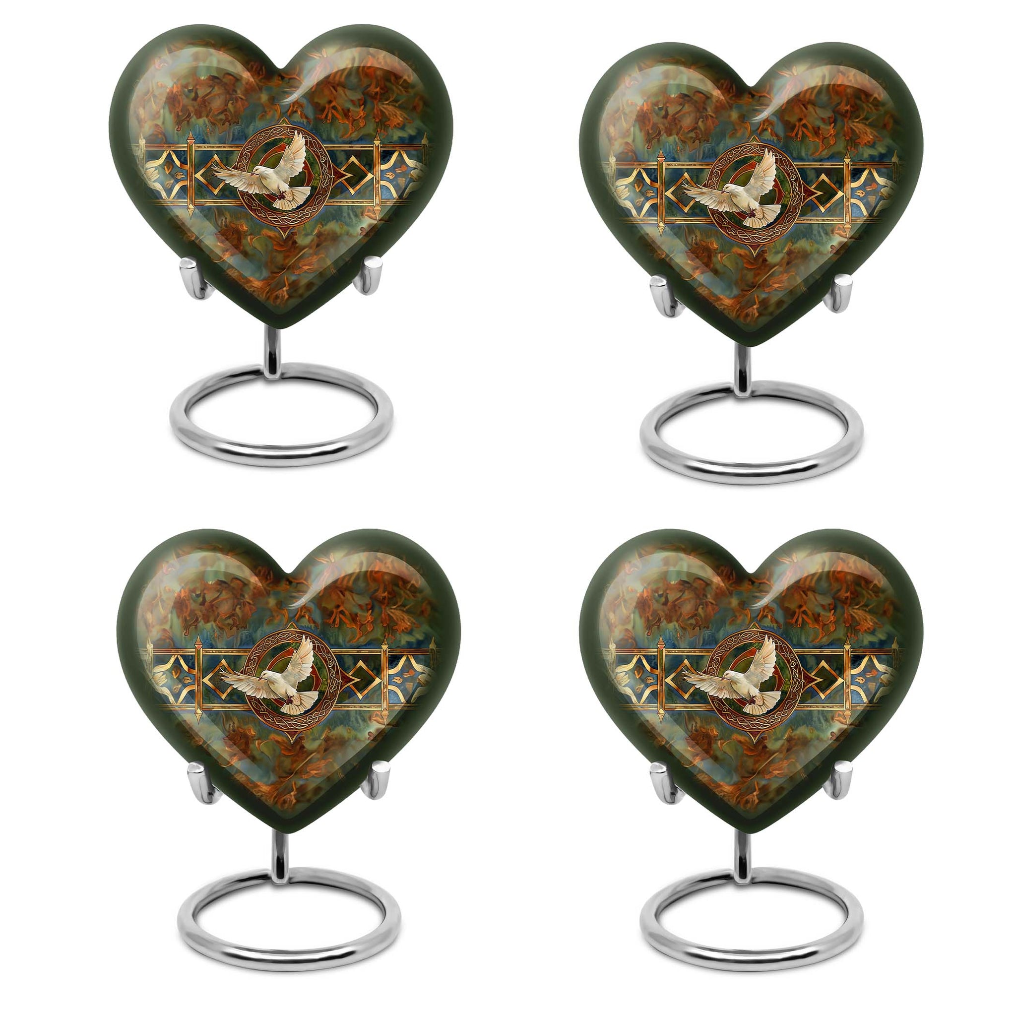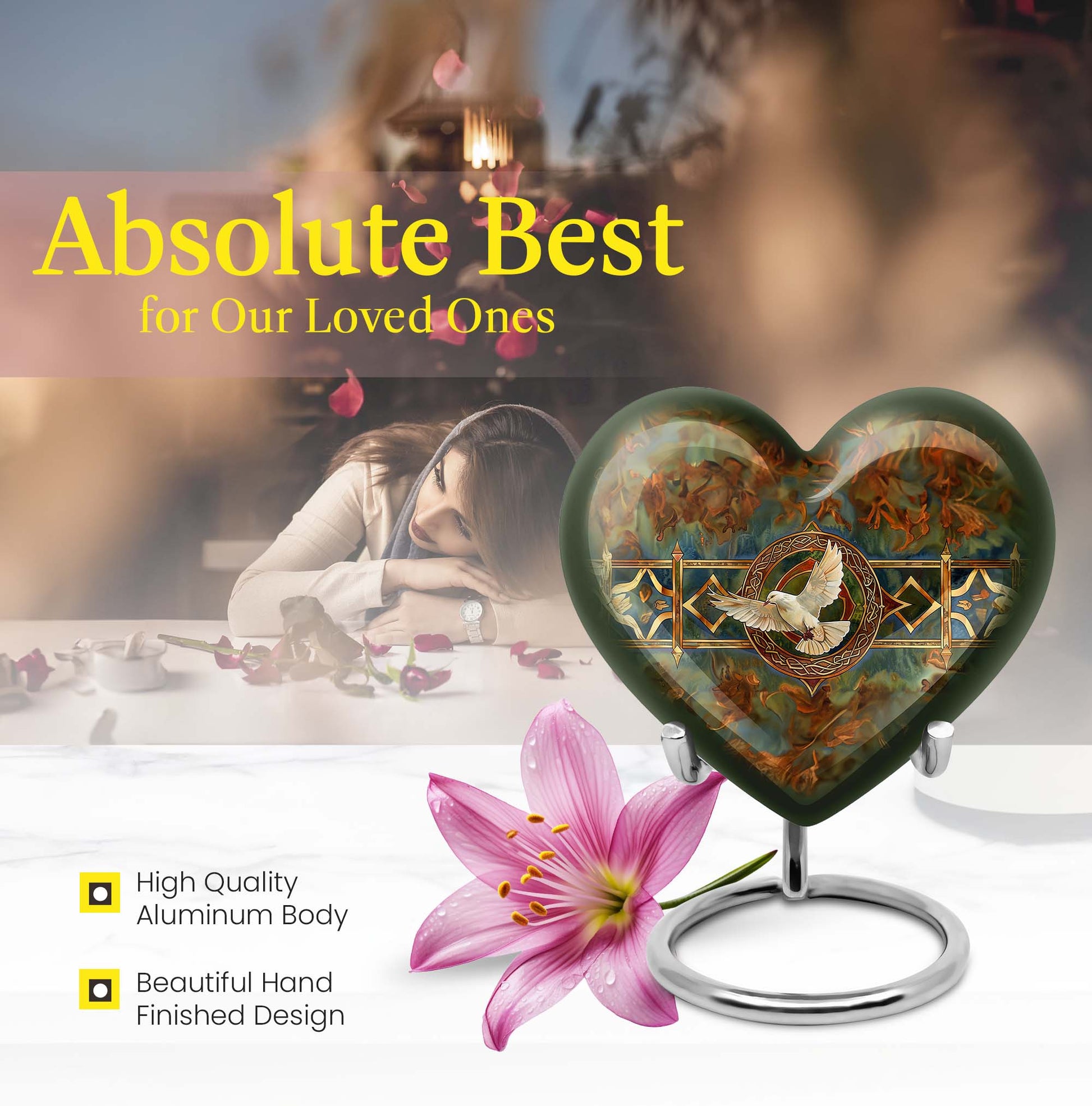 Cherish your loved one's memory with this exquisite Catholic Urn, a touching tribute designed with heartfelt emotions in every inch. With its substantial size of 10 inches and 200 cubic inches capacity, this memorial large urn accommodates human ashes with grace and respect. The high-quality aluminium construction leads to a sturdy weight of 3.3 pounds, ensuring the urn stands resolute in remembrance. The abstract theme of this large urn echoes enigmatic bliss, encapsulating the mystery of life after death. Offering the convenience of customization, this product allows personal engravings of names, adding a touch of familiarity to the divinity. Easy containment of ashes is facilitated with the included velvet pouch. Whether you're looking for cremation urns for men or women, or an adult female or male catholic urn, our product is crafted to serve your needs. Please note the design is based on an enticing heart motif, enhancing the aesthetic appeal of the urn.