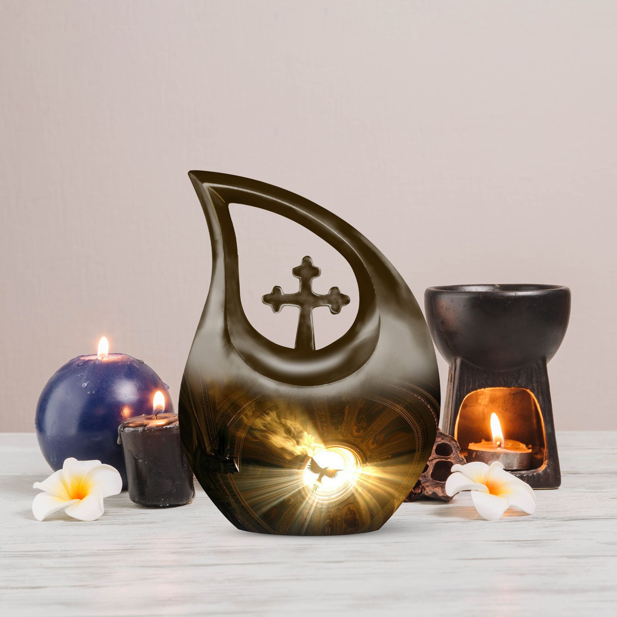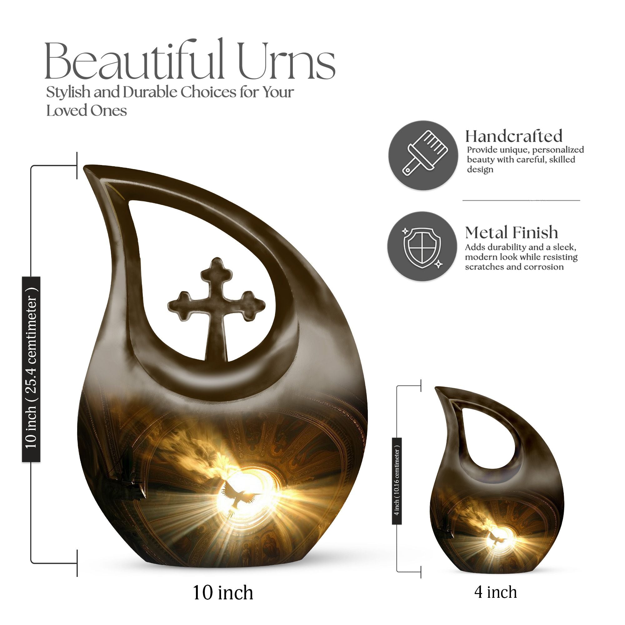 Crafted from durable aluminium, this 10 inch urn features intricate golden cathedral artwork with a radiant dove motif, making it a heartfelt choice for both men and women. Its secure screw-top lid protects the ashes, while the elegant design blends seamlessly into any memorial space. Whether you are searching for cremation urns adults, urn for cremations, or high-quality cremation urns small, this urn meets a wide range of needs with dignity and beauty. Families looking for small urns for human ashes keepsake, small keepsake urns for human ashes, or a single small keepsake urn will find this a serene and meaningful option.