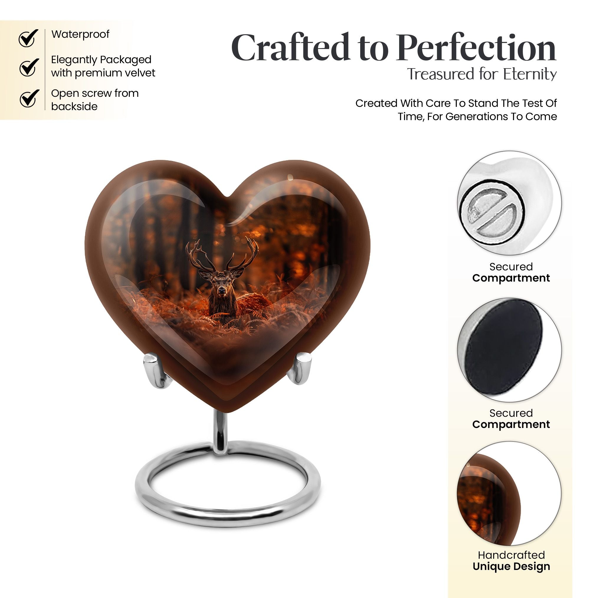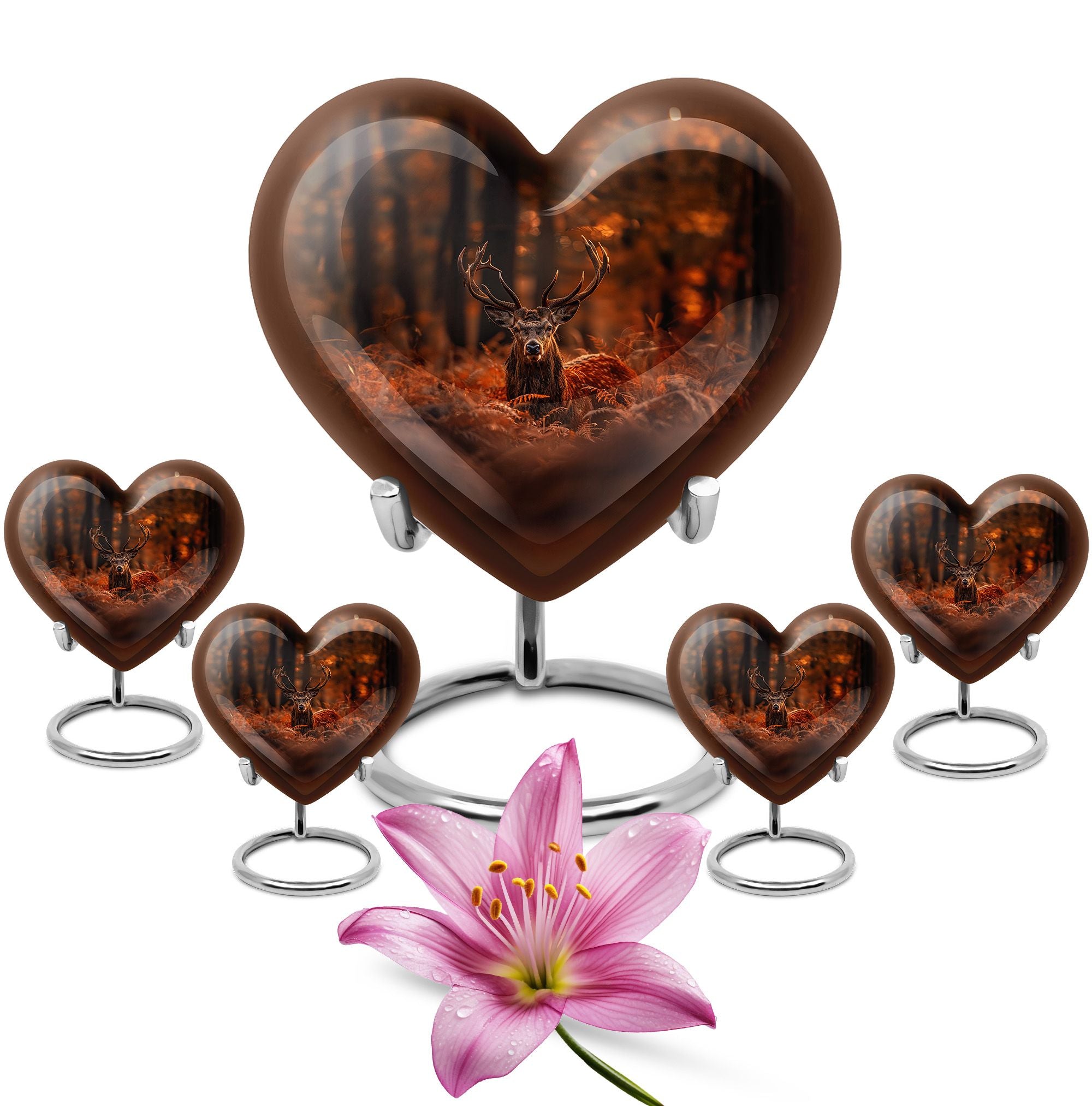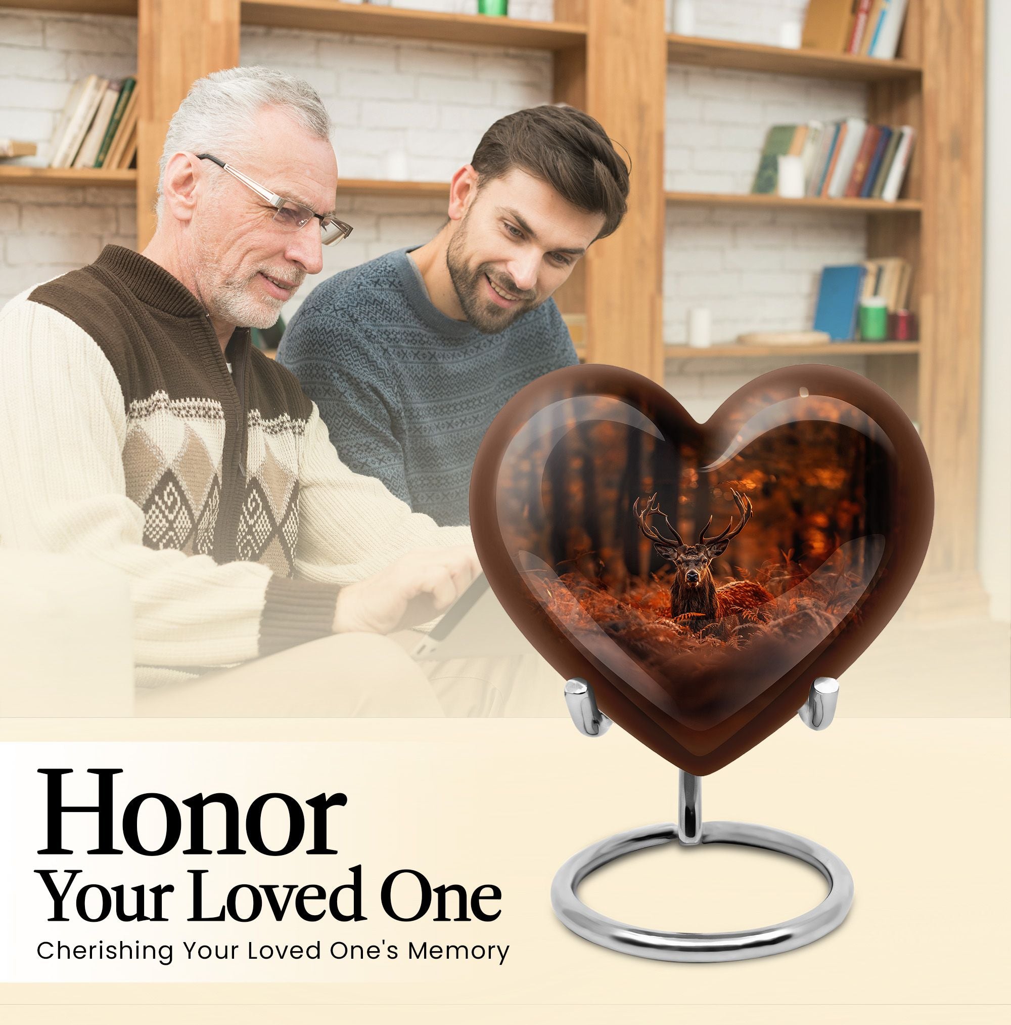 Celebrate your loved one's memory with our large, 10-inch Aluminium 'Heart Urn'. Our uniquely crafted burial cremation urn features an elegant and timeless Gramophone theme, reflecting music's transformative power and everlasting resonance. This deer urn stands 10 inches in height, weighing a solid 3.3 pounds, with an accommodation capacity of 200 cubic inches. Each urn is accompanied by a velvet pouch offering a dignified and secure containment for the cherished ashes. As an added personal touch, we also offer an engraving service; personalize your urn with the names of your beloved. Whether you're searching for 'cremation urns', 'adult female elegant urn in porcelain', or 'metal s urn for burial', our 'Heart Urn' serves as a reminder of the love and cherished moments shared. Note: the product does not include a 'HEART URN' design as specified in the product specifications. Make the memory of your loved one's echo with our 'Heart Urn' - a symbol of eternal love and perseverance.