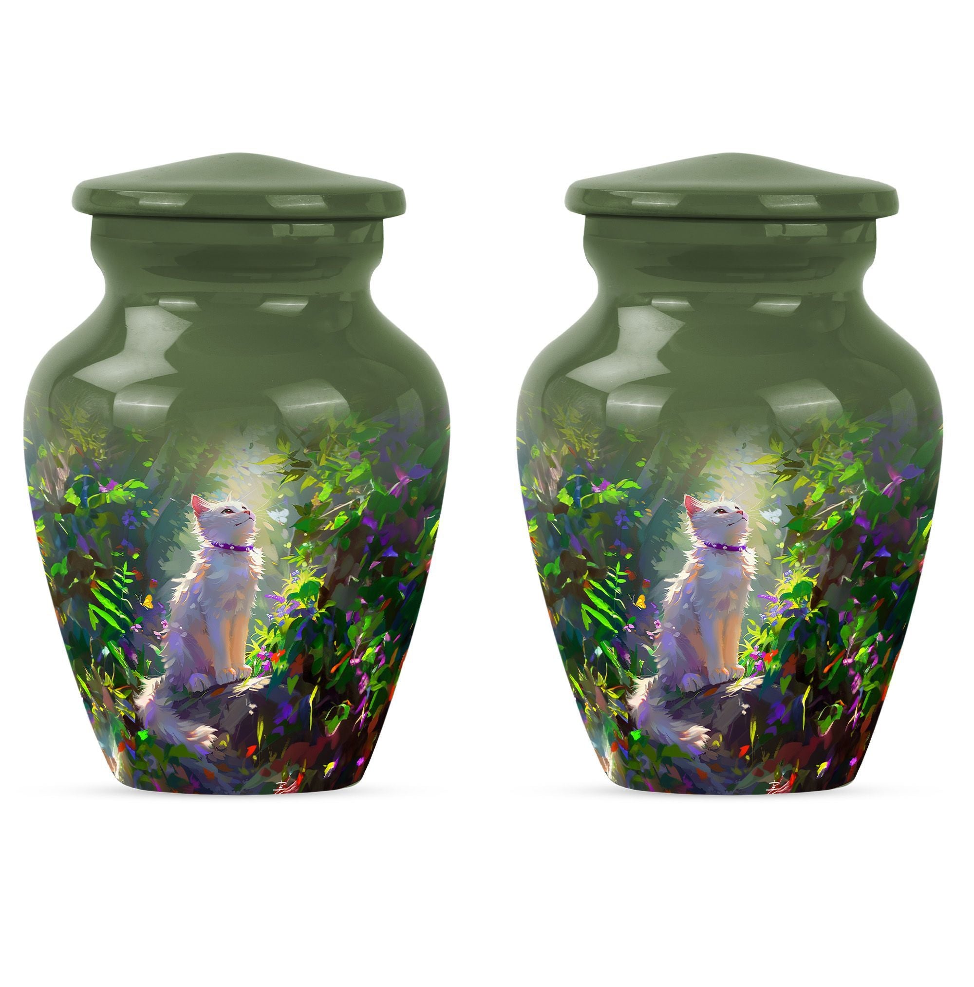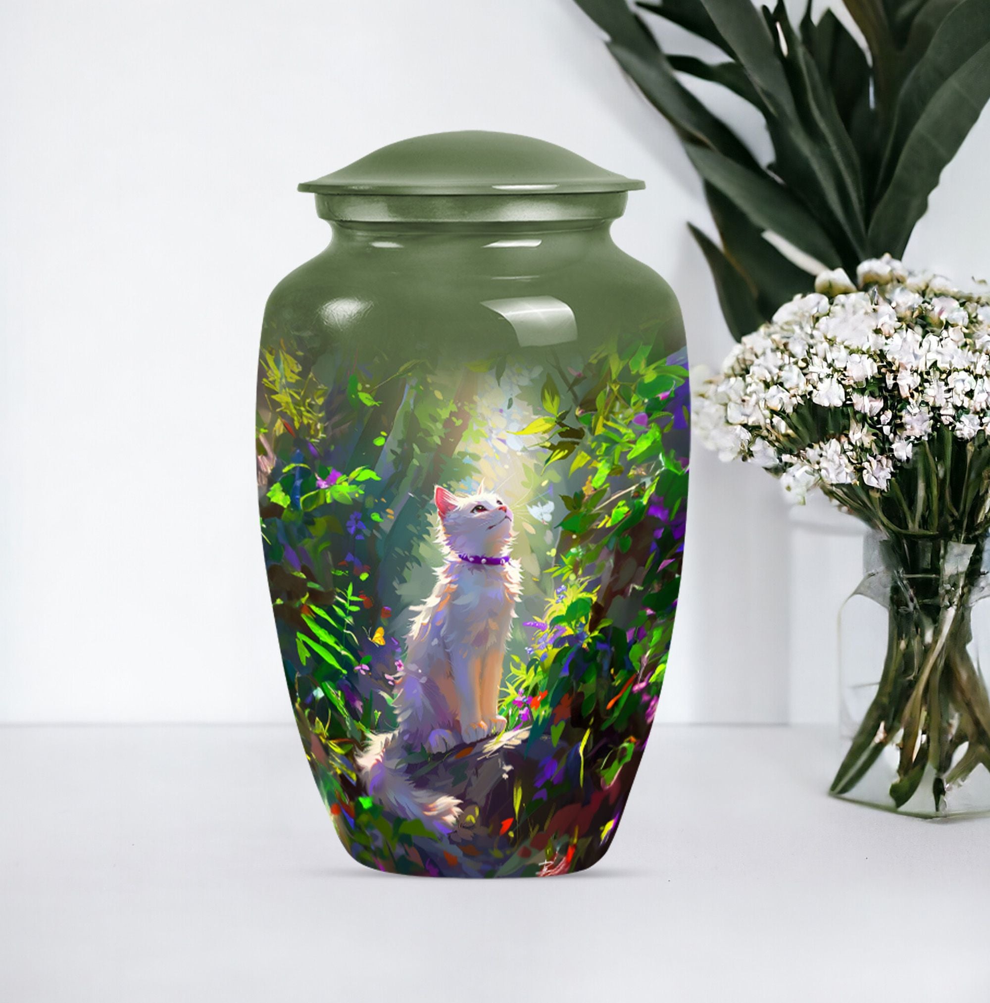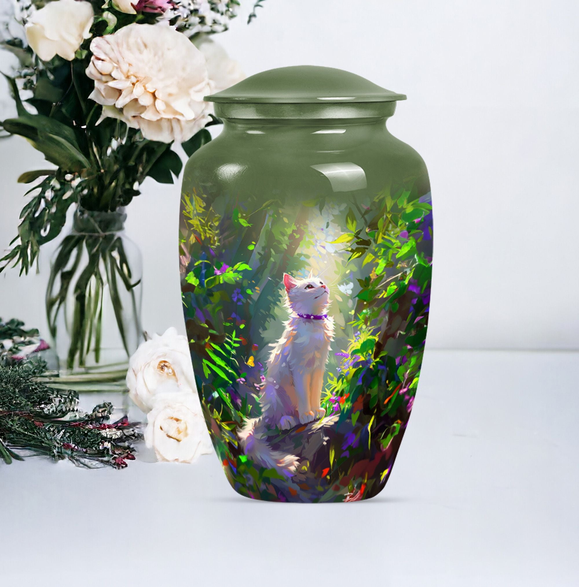 Honor the memory of your departed loved ones with our elegant White Cat Urn. As a cherished piece from our selection of adult urns for human ashes, this memorial urn's abstract theme soothes the soul and imparts a sense of peace. Crafted from robust aluminium, it showcases both durability and tasteful aesthetic. Its substantial size of 10 inches in height and weight of 3.3 pounds adds to its solemnity, capable of holding up to 200 cubic inches of ashes. The urn comes complete with a velvet pouch, offering a dignified containment for ashes. Our large urn's timeless and classic urn disposition is dedicated to preserving the essence of your loved ones. Personalize this piece with engraved names, adding a unique touch to commemorate the departed. This noble artifact serves as more than just an ash urn or a cremation urn for ashes - it's a tribute to a life well-lived and values treasured.