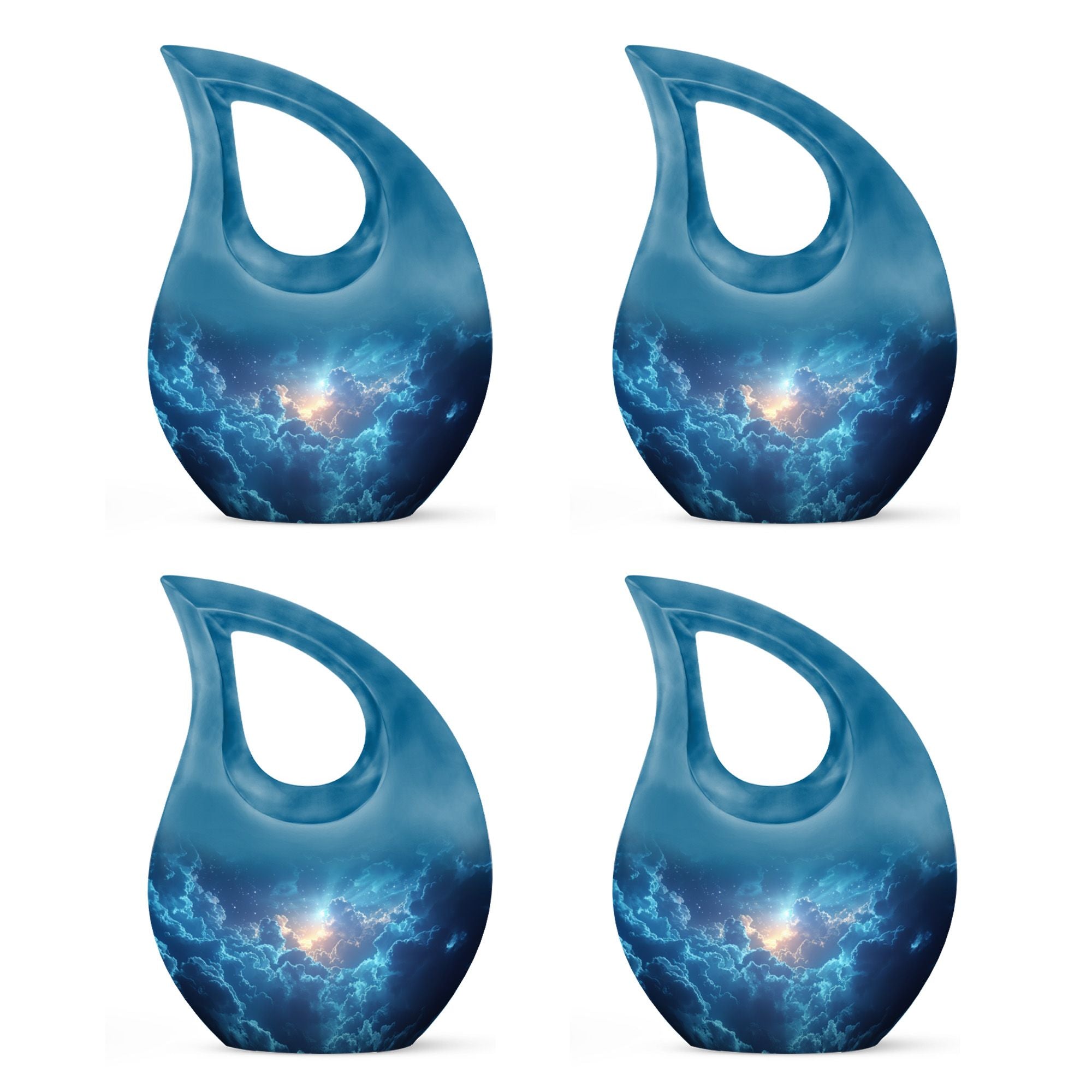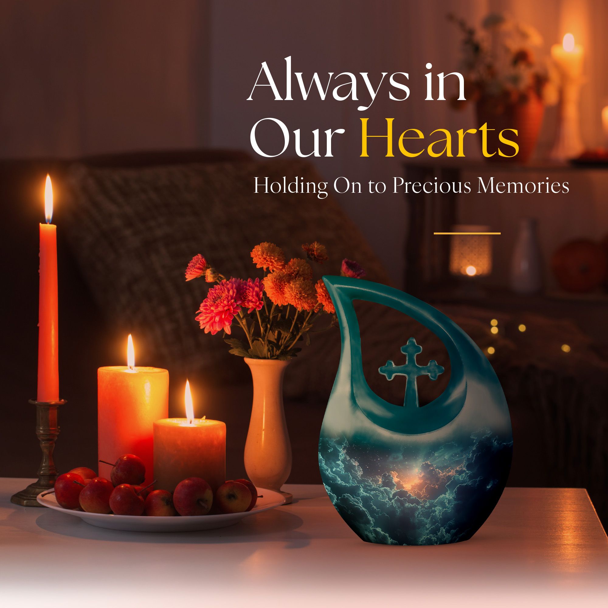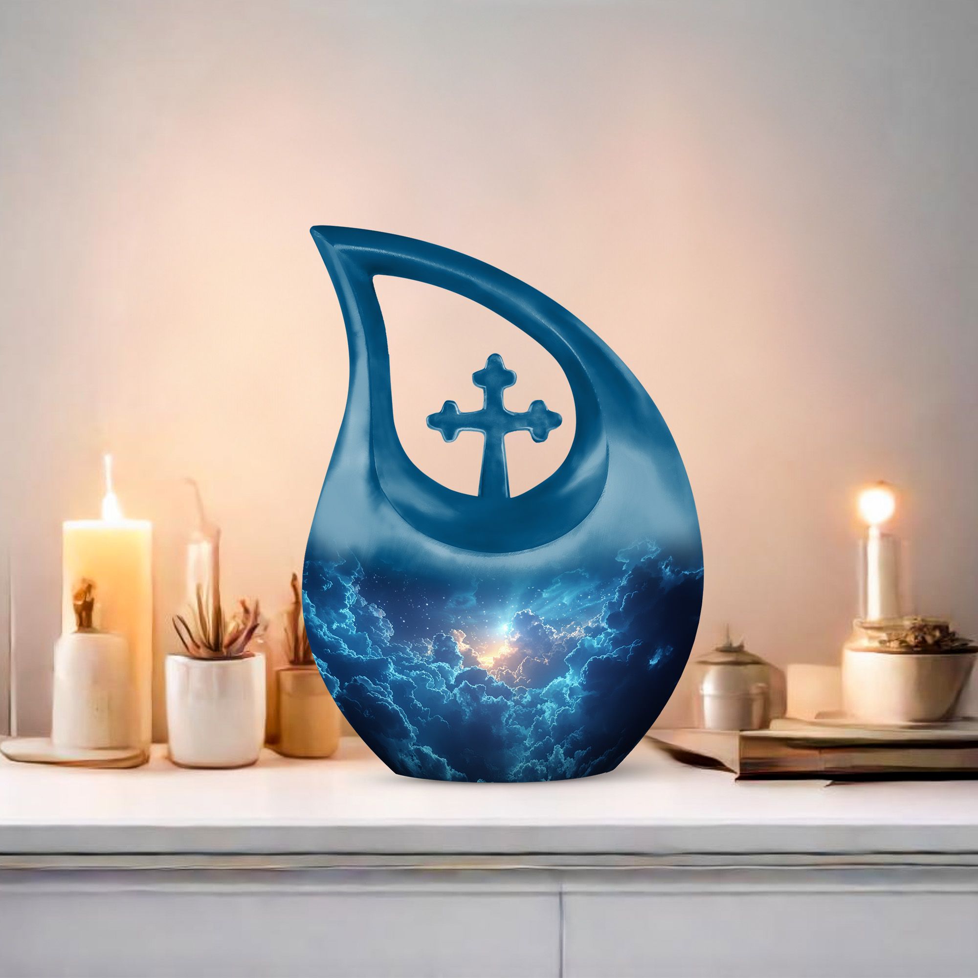 Turn a painful loss into a beautiful tribute with our Ethereal Sky Radiance Urn, a perfect epitome of love and respect for your departed loved ones. This 10-inch aluminum Large Urn is meticulously designed with a distinct 'Cross Drop' theme, delivering a sublime expression of honor and reverence. With a capacity of 200 cubic inches, it can tastefully hold human ashes, ensuring a lasting memorial. Your purchase comes with a velvet pouch, adding an extra layer of security and care for your cherished memories within. This refined urn is robust in weight, at 3.3 pounds, and offers the option for personal engraving, transforming it into a unique sanctuary for reminiscences. The urn elegantly combines function with aesthetics, envisaging the gentle radiance of the ethereal sky in its design. Get ready to experience a dignified approach to memorial urns, specifically crafted for those seeking an exclusive token of remembrance.