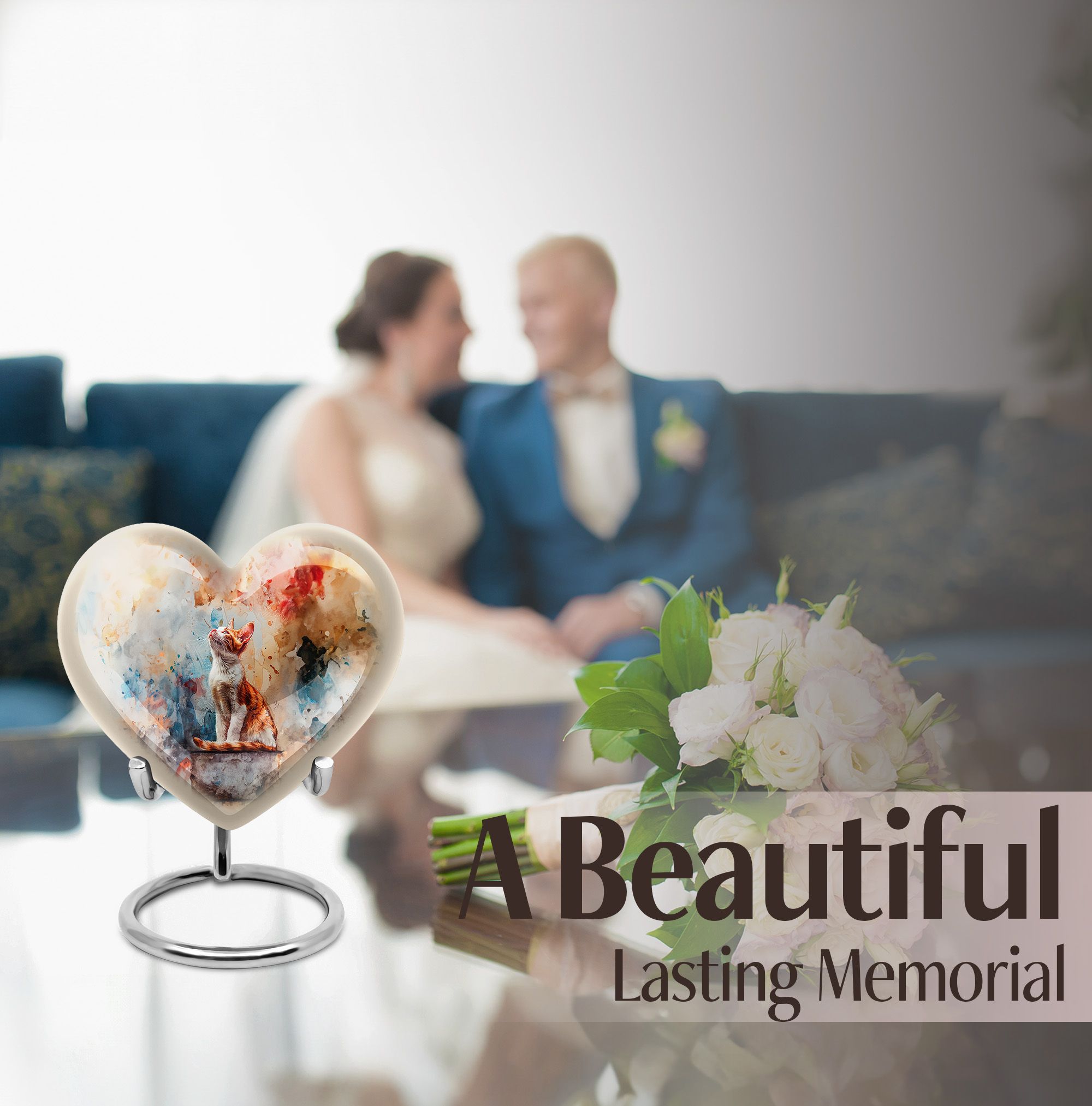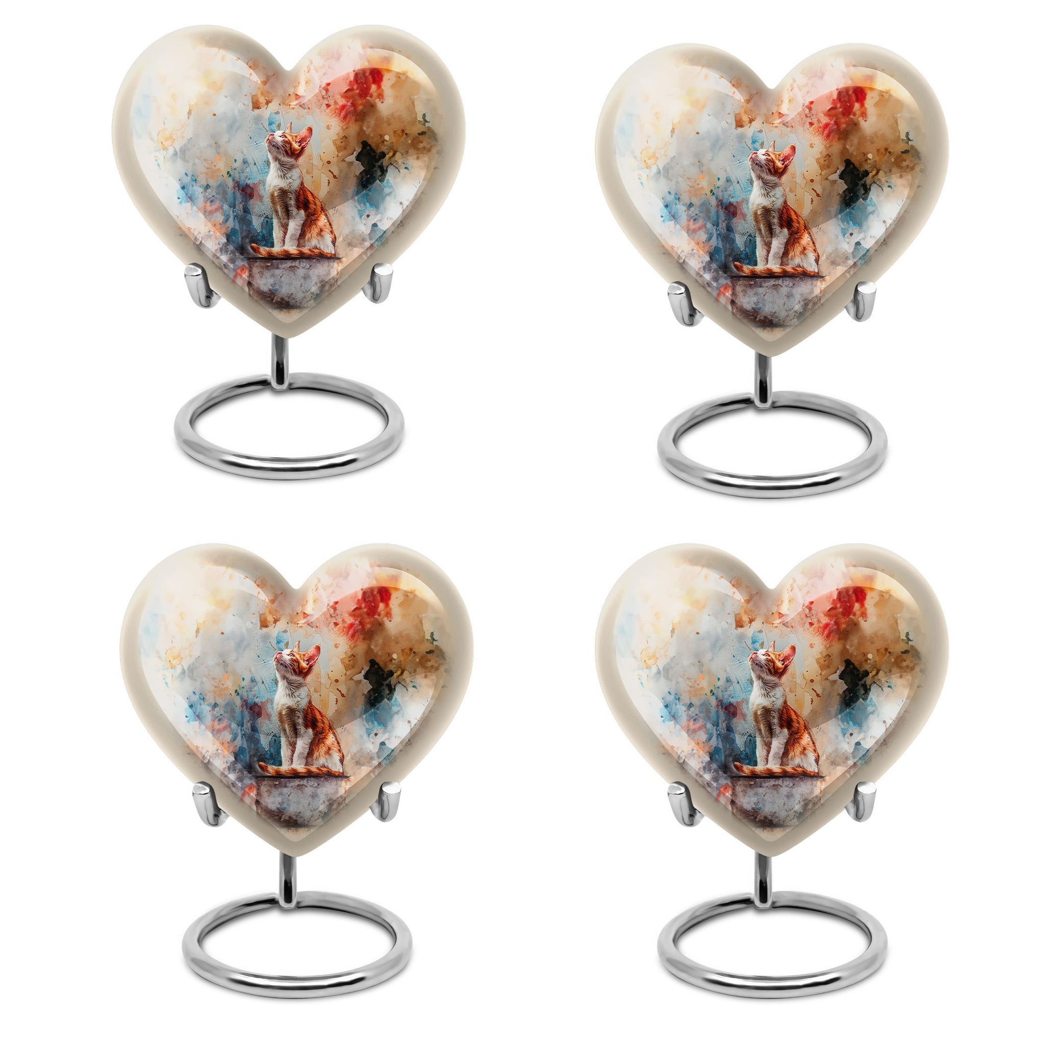 Experience a touching tribute to your dearly departed with our Orange Cat Heart urn. Crafted meticulously with high-grade Aluminium, rendering a sturdy weight of 3.3 pounds, it exemplifies lasting durability. This unique heart-shaped large urn, standing at 10 inches in height, effortlessly transcends the traditional memorial ceremony supplies with an abstract theme. To meet your needs, this cremation urn provides ample capacity, holding up to 200 cubic inches of ashes. It comes with the thoughtful addition of a velvet pouch for containment of ashes, aiding in the gentle handling of the remains of your loved one. Customize it further by engraving names to add a personal touch, making it a heartwarming remembrance. Terms such as 'cremation urns', 'urns for funeral', 'burial urns for men', and 'large urn iridescent metal' are associated with this product. Bid an affectionate farewell with the class and charm of our cremation urn.