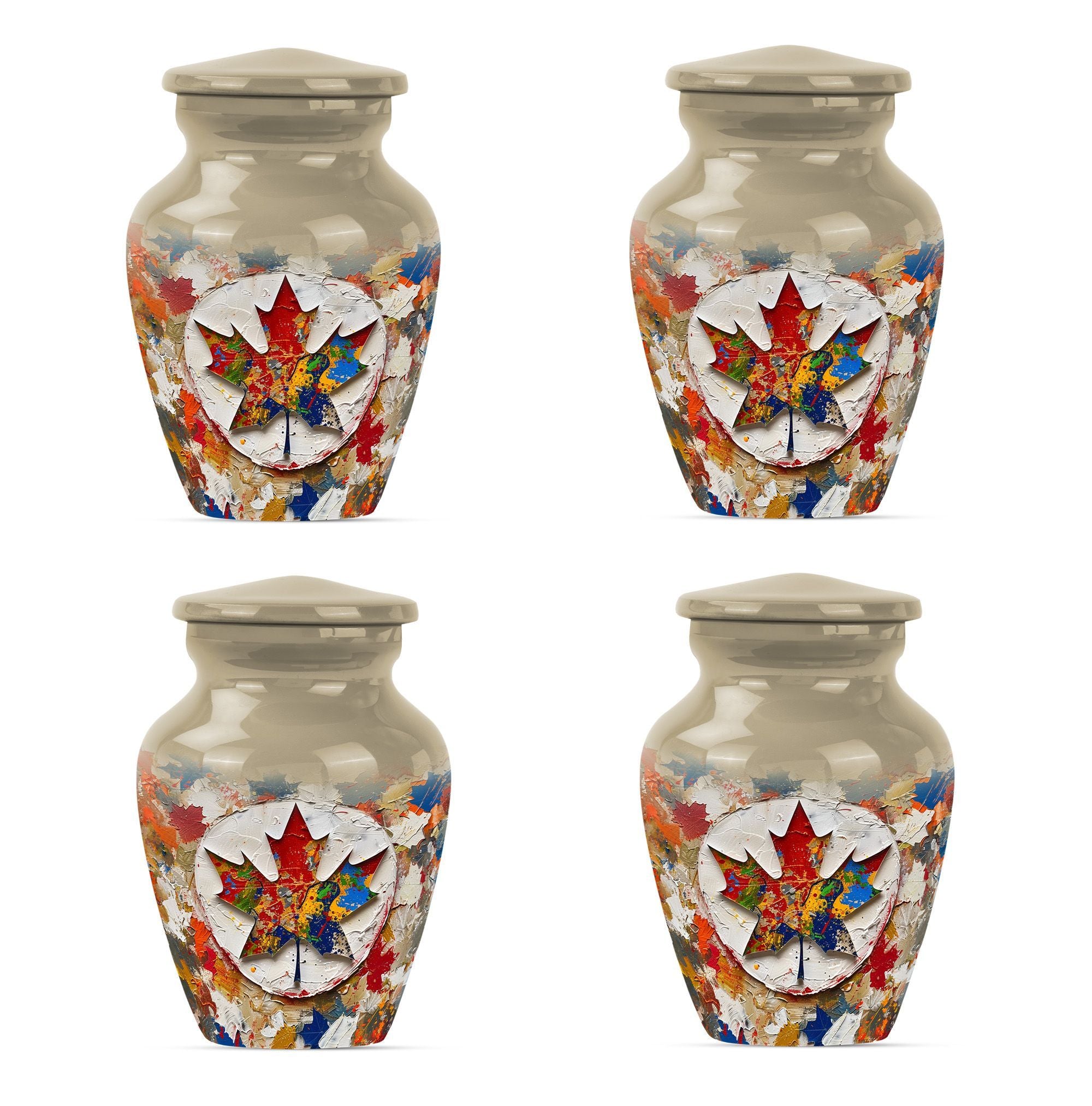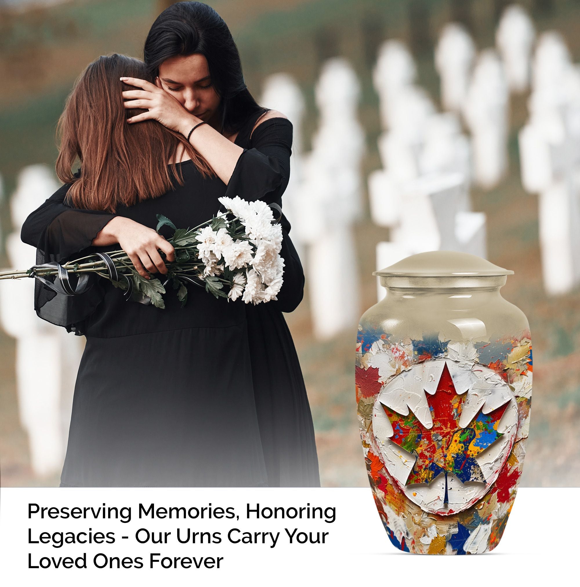 This 10-inch, mapple leaf urn is a distinct and personalized memorial urn, meticulously designed to honor your loved ones. The craftsmanship of this large urn, weighing 3.3 pounds, bears an opulent aluminium exterior that invariably exudes timeless dignity. The classic urn design is influenced by the beauty of nature; it is adorned with a floral theme capturing tranquility, love, and eternal peace. With a capacity of 200 cubic inches, it's specifically manufactured to respectfully hold ashes, making it a perfect funeral urn for mom or an appropriate selection for any other beloved female in your life. This unique urn for ashes also comes with a complementary velvet pouch for containment of ashes, ensuring an additional layer of care and respect for the departed. One of the key features is the customization option offered, where the urn can be personalized with engraved names transforming it into an eternal homage. This metal urn is also suitable for burial in the ground. Our cremation urn, more than a receptacle, is an emotional connection, a part of a healing process, and a unique yet solemn tribute to the departed.