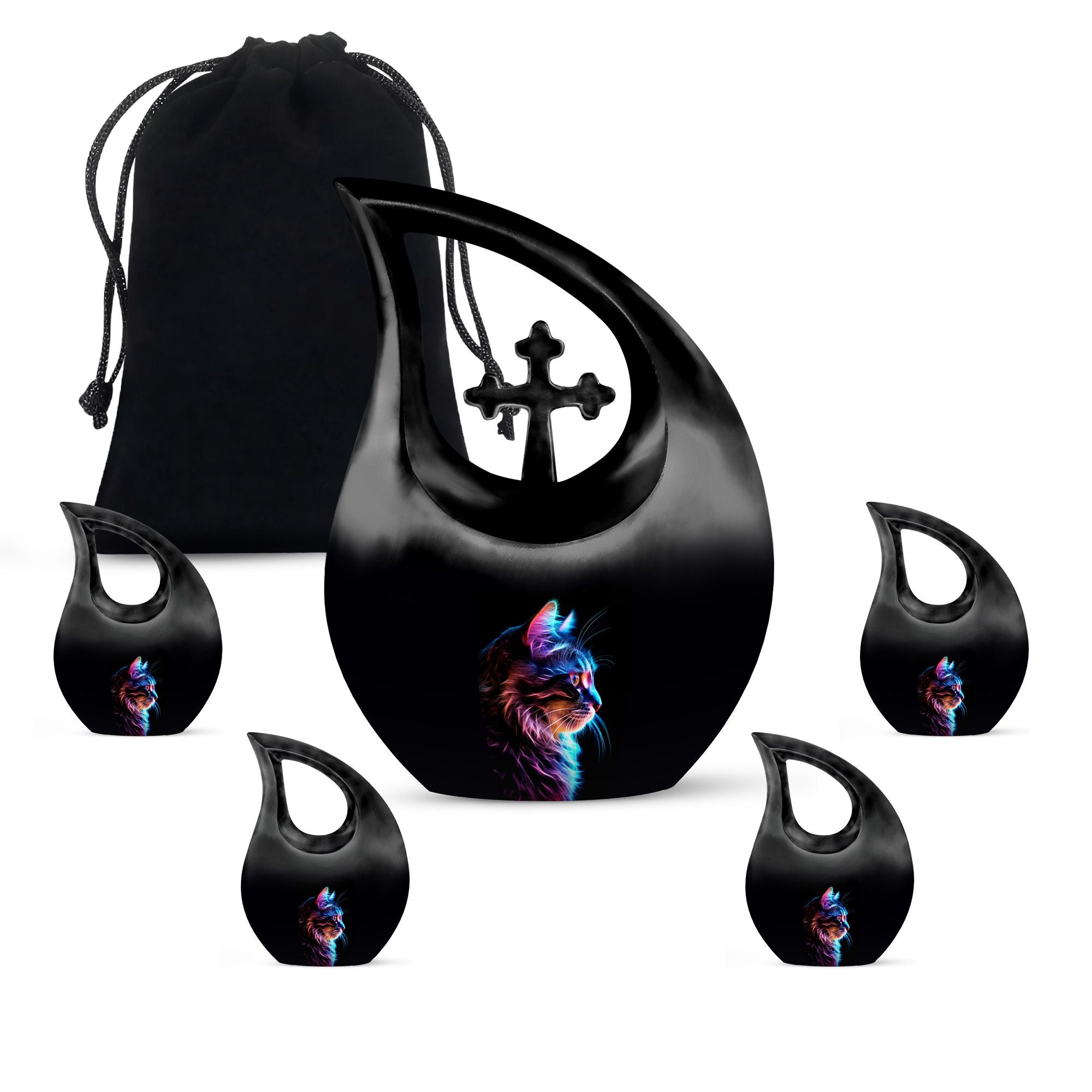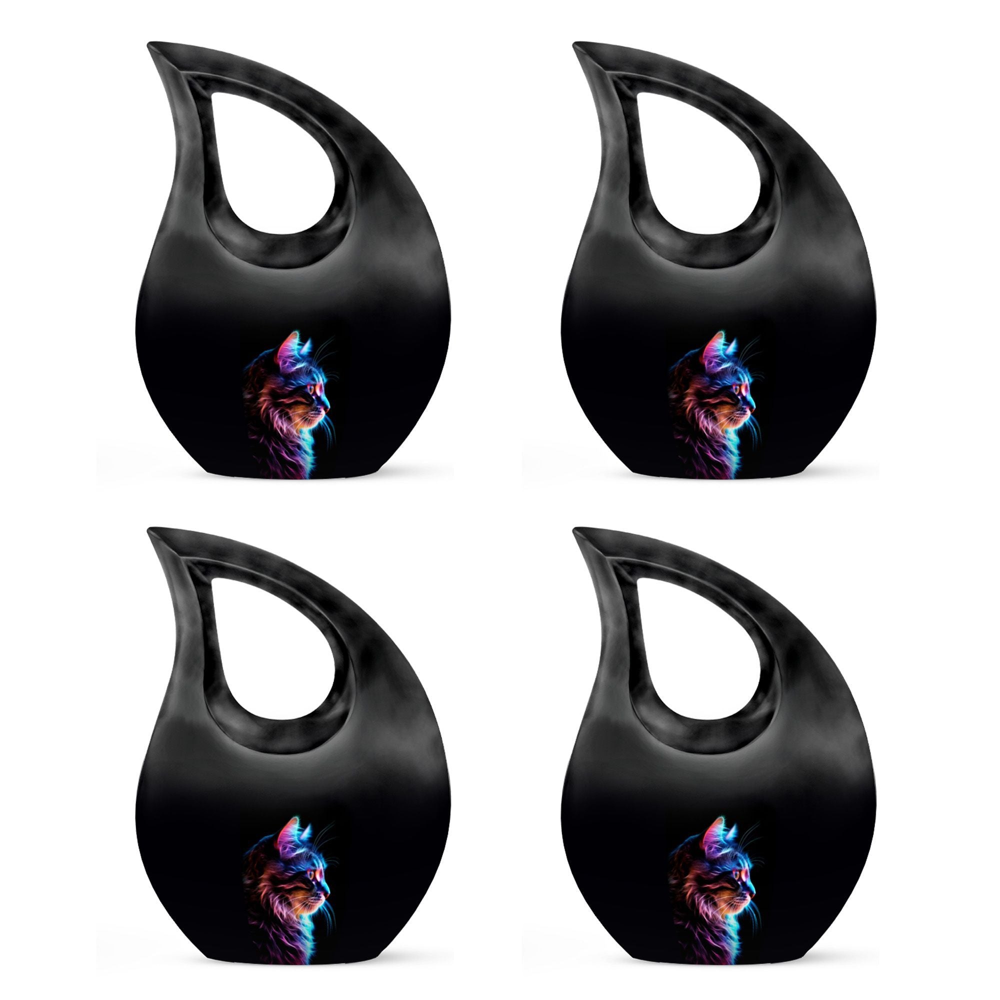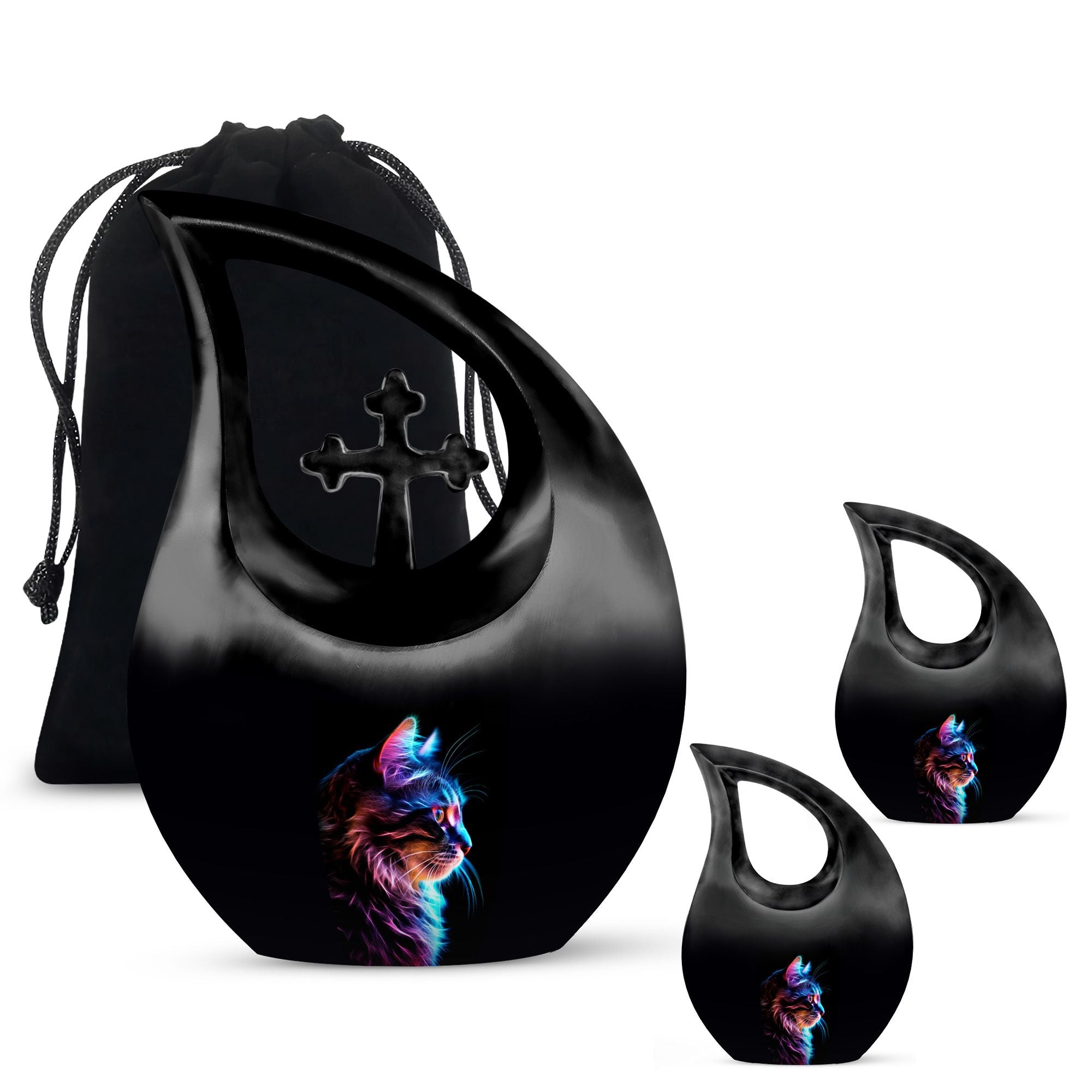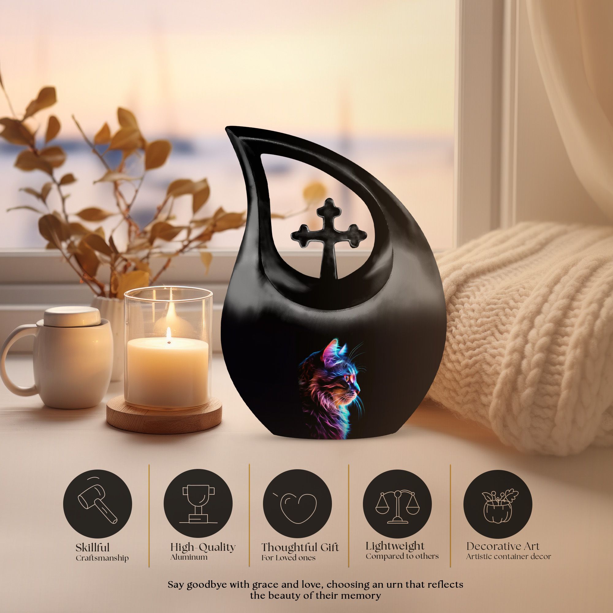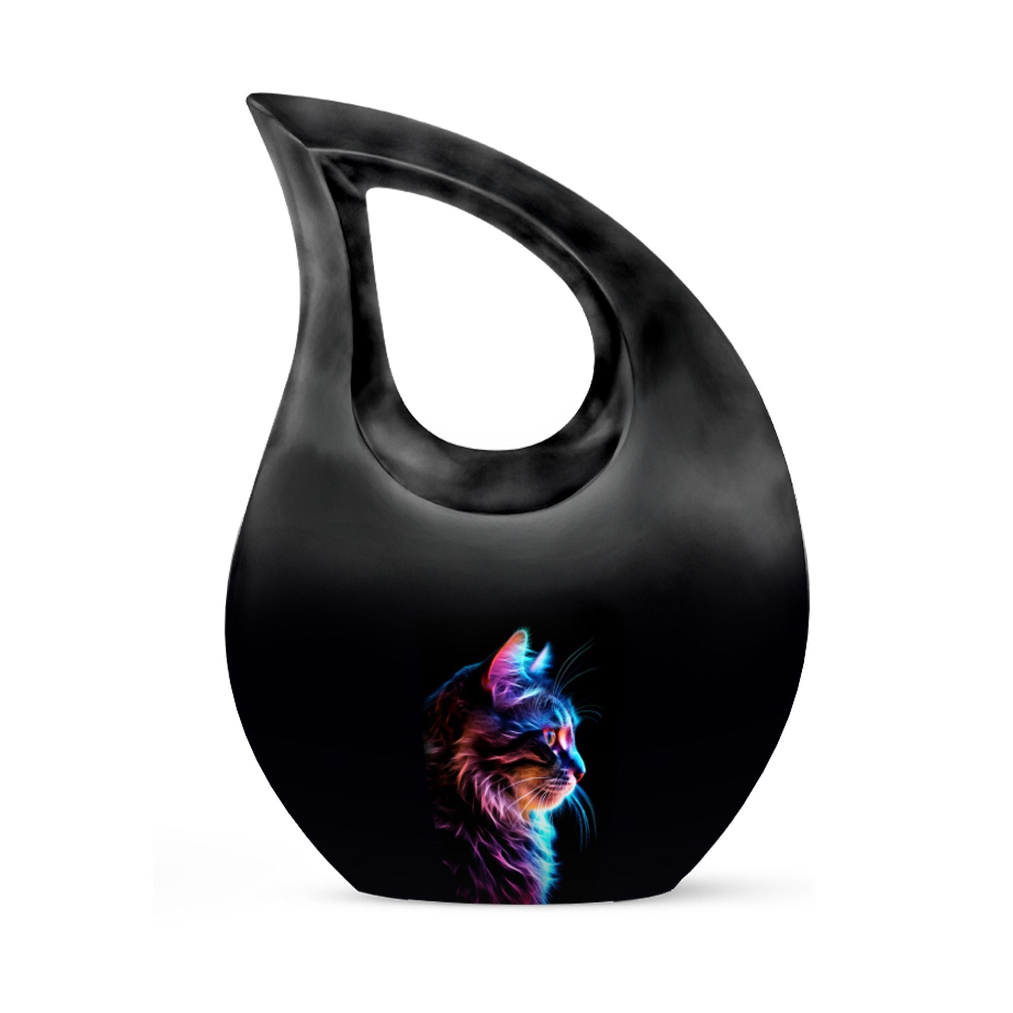 Presenting our Neon Cat Urn, a large urn crafted from high-quality aluminium, perfect to pay tribute to loved ones. Its size, 10-inch in height, can conveniently hold up to 200 cubic inches of ashes and weighs just 3.3 pounds for an easy placement. Uploaded with a unique Cross Drop theme, the urn depicts a radiant neon cat illustration, invoking serenity and tenderness. Our package comes with a lovely velvet pouch, providing a dignified home for your cherished one's ashes, symbolizing the lasting memory. For a truly personal touch, we provide engraving services for names, allowing you to etch an affectionate sentiment of remembrance. This affordable cremation solution is benefited by its durability and attractive design. A versatile choice from cheap urns, it is notably one of the sought-after cool urns for ashes. Ideal for those seeking Box for Ashes Human, or a pop of color like our purple urn, this product is a fitting tribute to the memories of the departed.