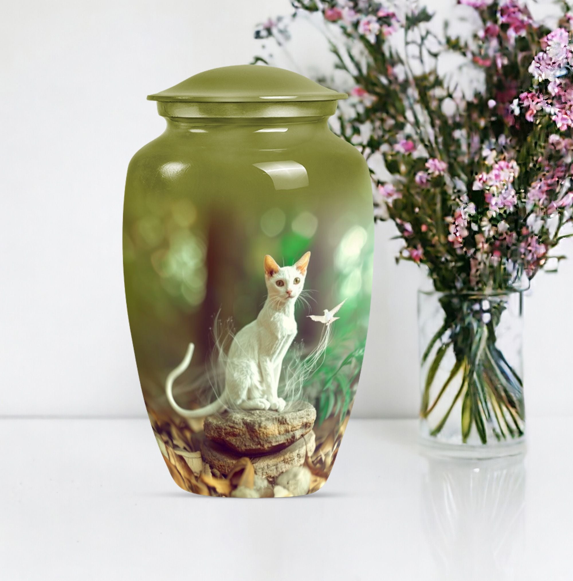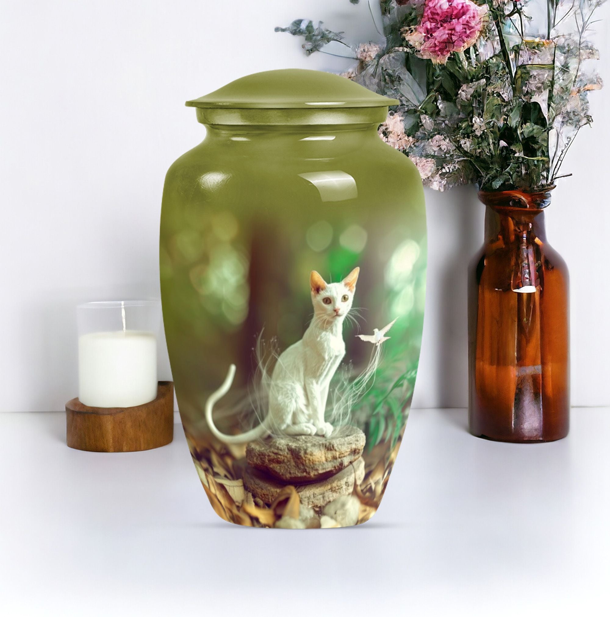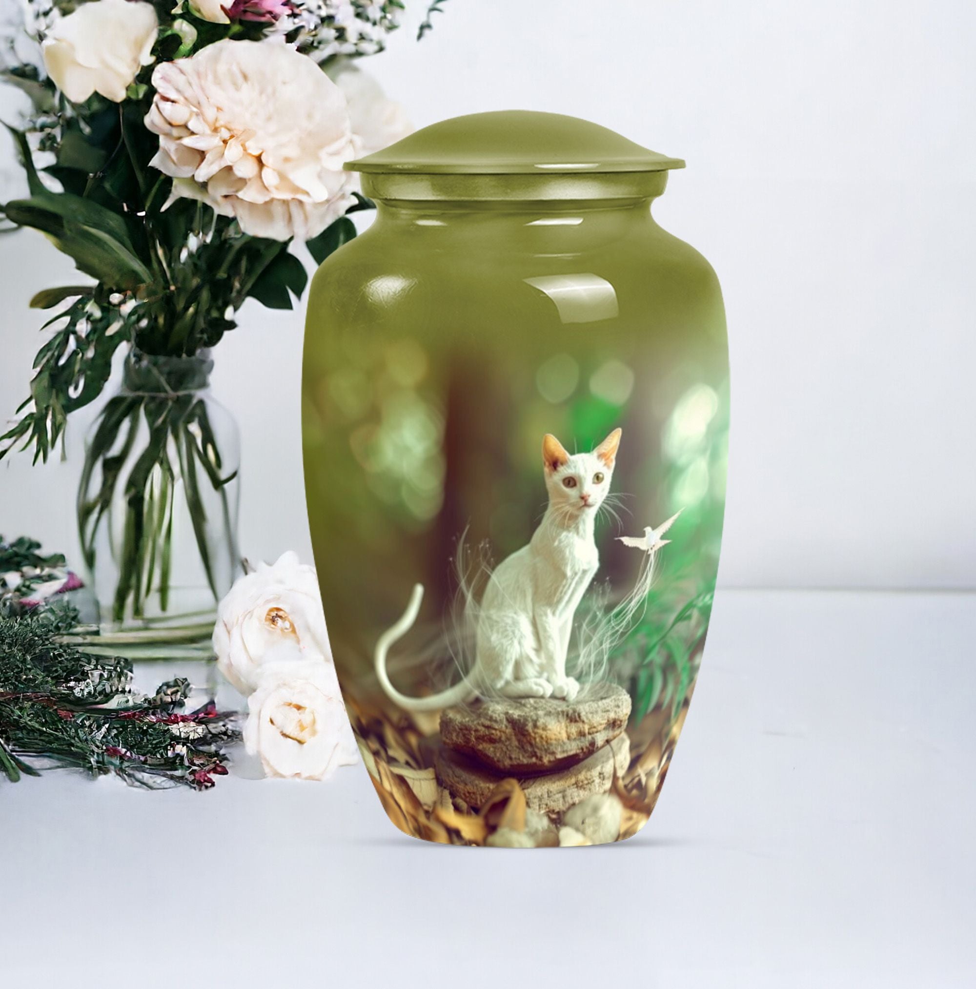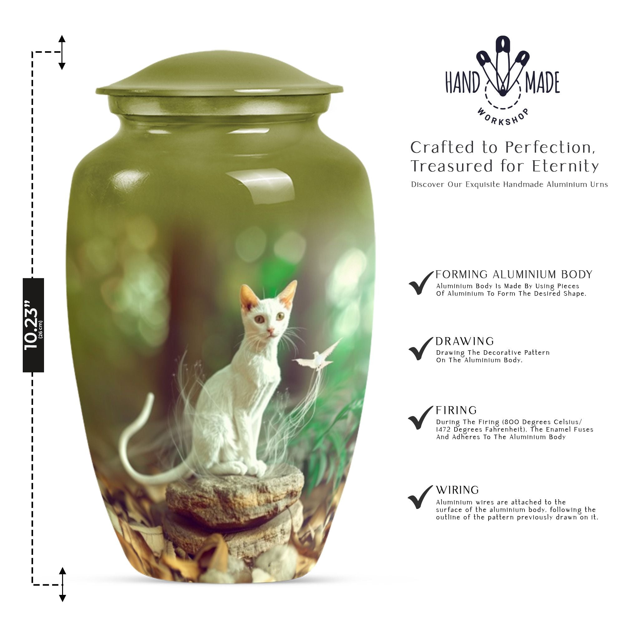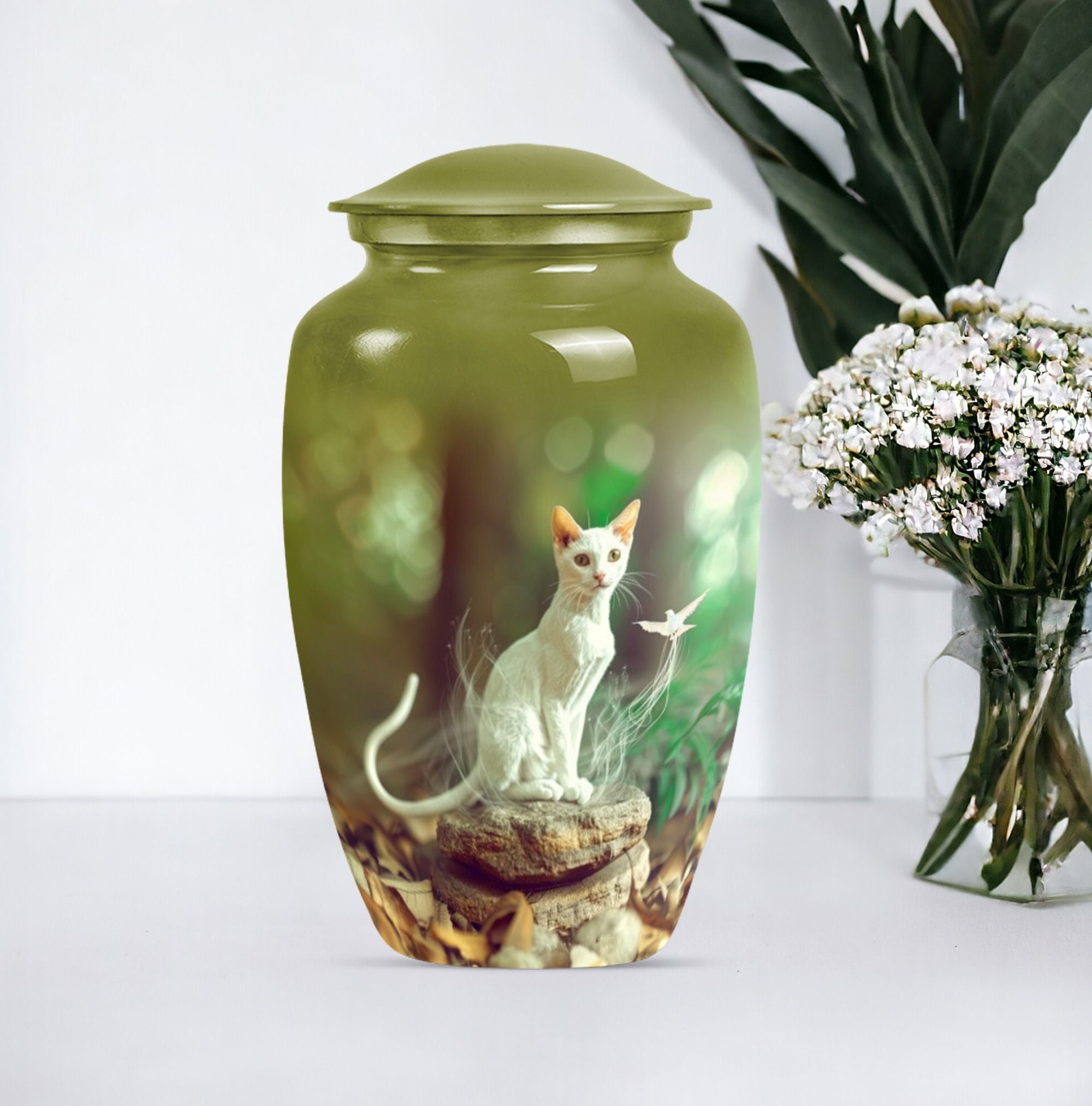 Eternal rest has never been so elegant with our Classic White Cat Urn, a stunning piece serving as a respectful resting place for your lamented loved ones. This finely crafted burial ashes urn is ideal for seniors and adults in matters religious and ceremonial. Created from high-grade Aluminium, this 10-inch urn weighs 3.3 pounds, providing substantial and reposing beauty. The superior build provides a capacity of 200 cubic inches, ample room for cherished remains. This large urn oozes abstract charm, echoing not only the love but also personalized memories, with the option to engrave names on it. Alongside the urn, a velvet pouch completes the set, an exquisite containment for ashes. Also noteworthy as a cremation funeral urn, this urn for human ash humans is versatile for various ceremonial rites or memorials. Revive those peace-filled moments with this striking urn for cremation ashes, a perfect tribute to eternal love.
