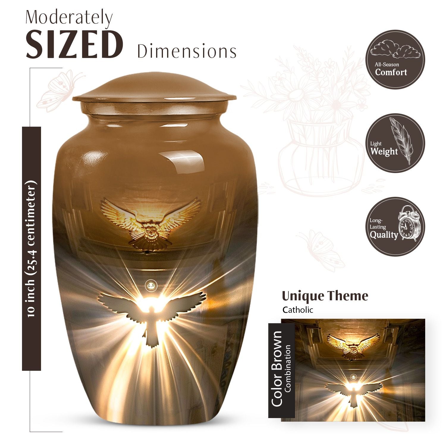An exceptional commemoration, this 10-inch catholic urn honors your loved ones in a beautifully sculpted, classic urn form. Made from sturdy, high-quality aluminium, this large urn surpasses mediocrity with an abstract theme that speaks volumes in character. Offered in a size suitable to hold approximately 200 cubic inches of ash, our burial funeral urn is gently weighted at a mere 3.3 pounds, making transitions from indoor mantels to in-ground burial sites easy to manage. Painstakingly designed to accommodate adult ashes and fitting for both men and women, our cremation urn comes inclusive with a velvet pouch for a dignified containment of your loved one's ashes. To further create an endearing legacy, customize this earnest cremation urn with engraved names of the departed. This urn's uniqueness is heightened by less common terminology like 'earn cremation' and 'metal urns for burial in ground', strategically selected keywords in line with prevalent trends. Truly a profound embodiment of memorial ceremony supplies.