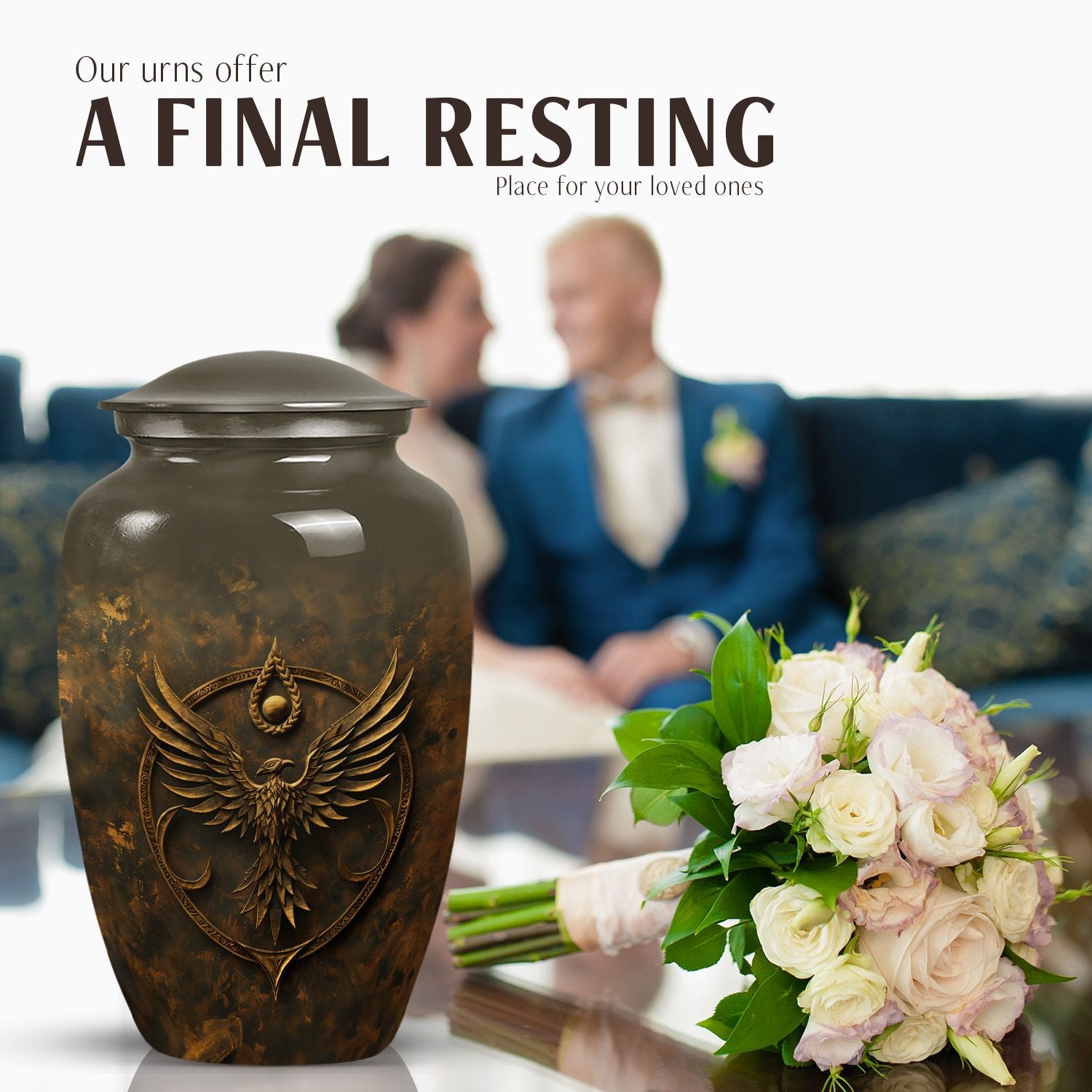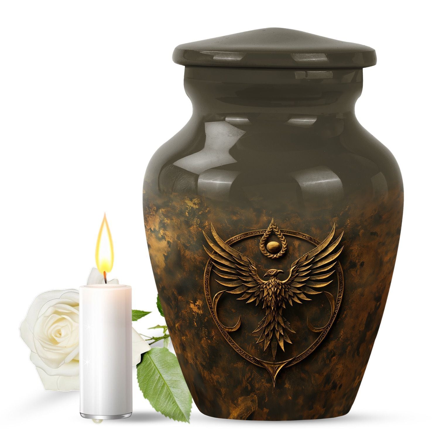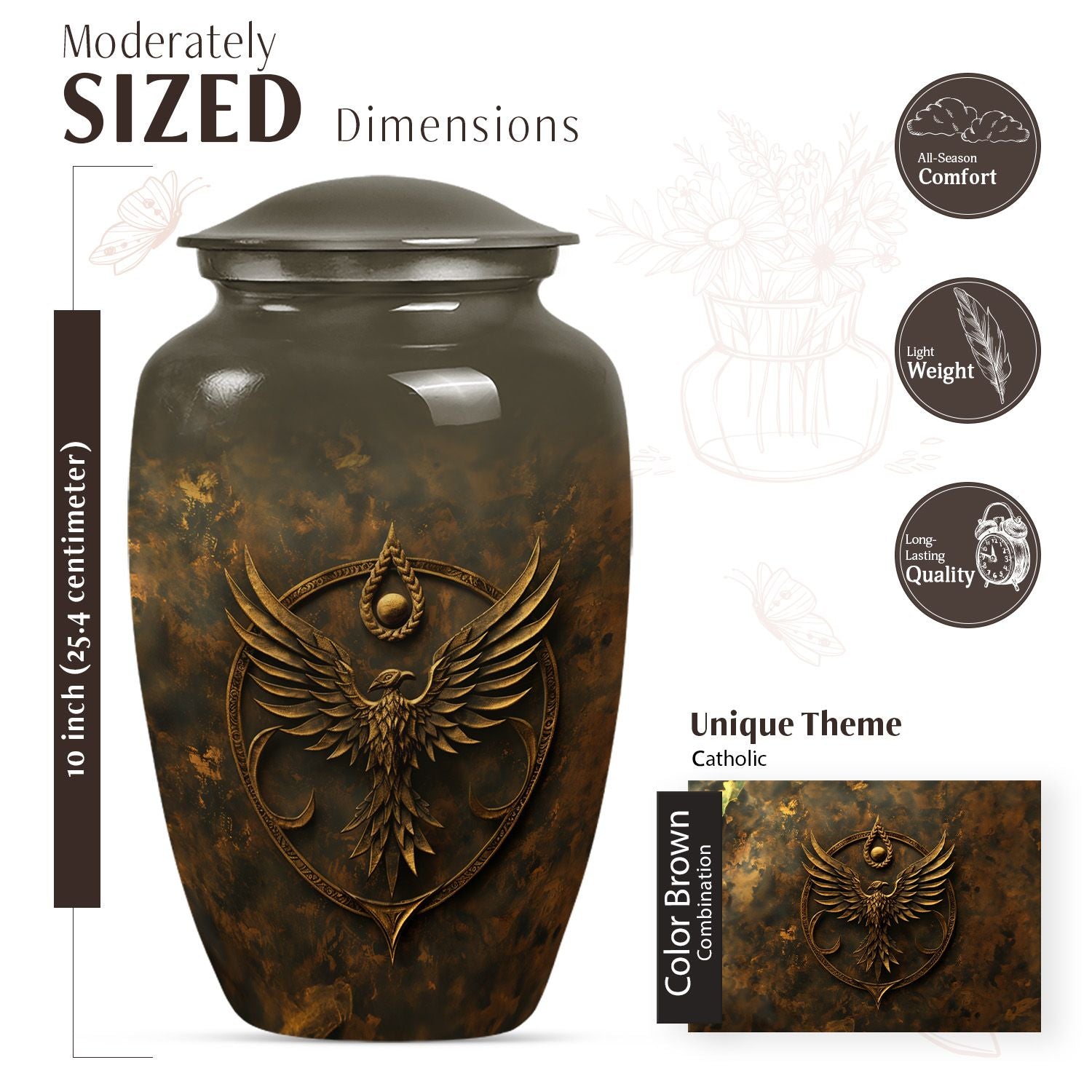 Presenting a one-of-a-kind, Large Aluminium Catholic Urn. This abstract themed Memorial Urn stands out with its unique aesthetics and weighs a mere 3.3 pounds. Sized at 10 inches, this impressive urn serves as an exquisite homage to your cherished one. It has a substantial capacity of 200 cubic inches, adequately fitting your loved one's remains. Not just an urn, but a respectful memento that can be personalized with engraved names, adding an intimate touch to your remembrance. Its strong aluminium make-up ensures durability while its classic urn design gives it a sense of timeless elegance. Furthermore, this urn comes with a soft velvet pouch, an ideal containment for ashes. What's more—this urn extends to serve diverse search queries such as 'cremation urns for men,' 'burial urns for cremation ashes mother,' 'urn ash funeral urn,' and others alike. This urn redefines confrontation with loss, offering a dignified and passionate way to memorialize your loved one.