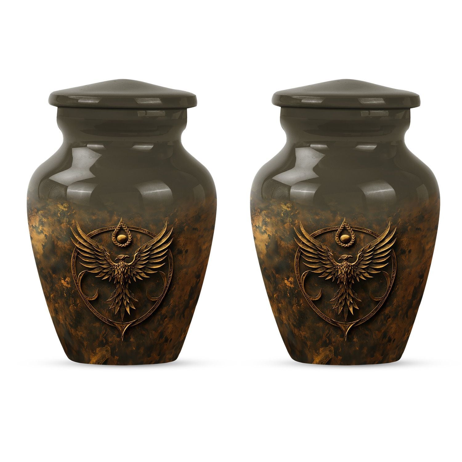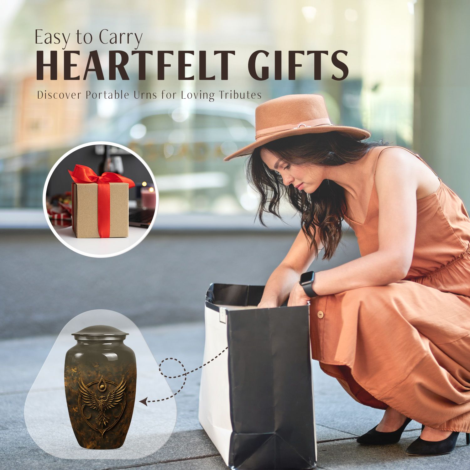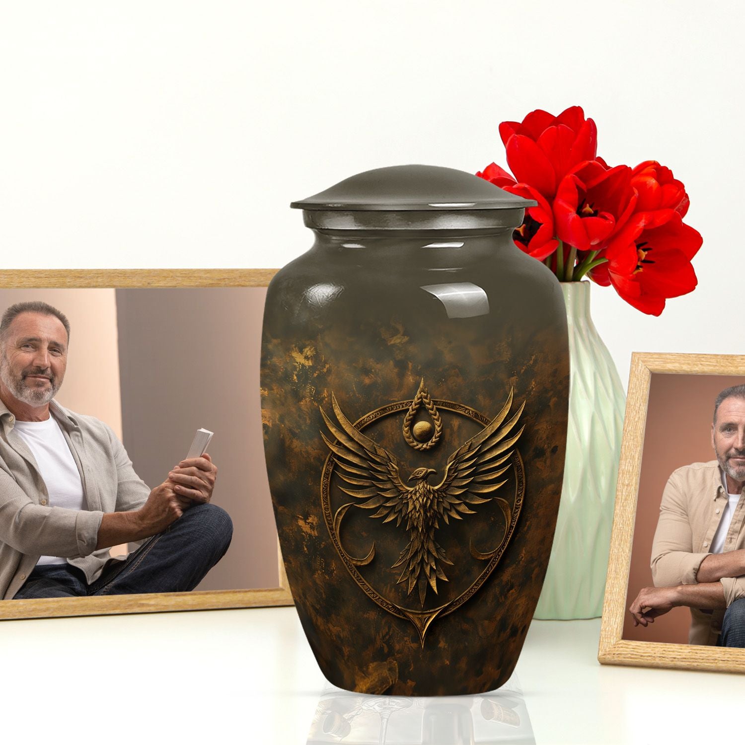 Presenting a one-of-a-kind, Large Aluminium Catholic Urn. This abstract themed Memorial Urn stands out with its unique aesthetics and weighs a mere 3.3 pounds. Sized at 10 inches, this impressive urn serves as an exquisite homage to your cherished one. It has a substantial capacity of 200 cubic inches, adequately fitting your loved one's remains. Not just an urn, but a respectful memento that can be personalized with engraved names, adding an intimate touch to your remembrance. Its strong aluminium make-up ensures durability while its classic urn design gives it a sense of timeless elegance. Furthermore, this urn comes with a soft velvet pouch, an ideal containment for ashes. What's more—this urn extends to serve diverse search queries such as 'cremation urns for men,' 'burial urns for cremation ashes mother,' 'urn ash funeral urn,' and others alike. This urn redefines confrontation with loss, offering a dignified and passionate way to memorialize your loved one.