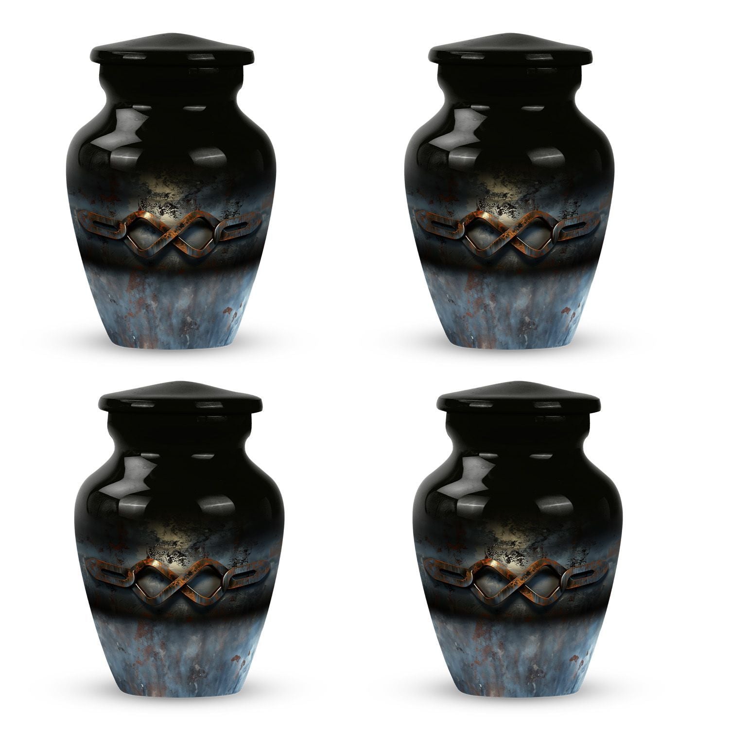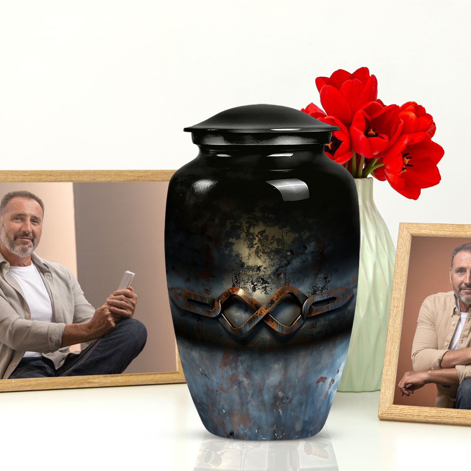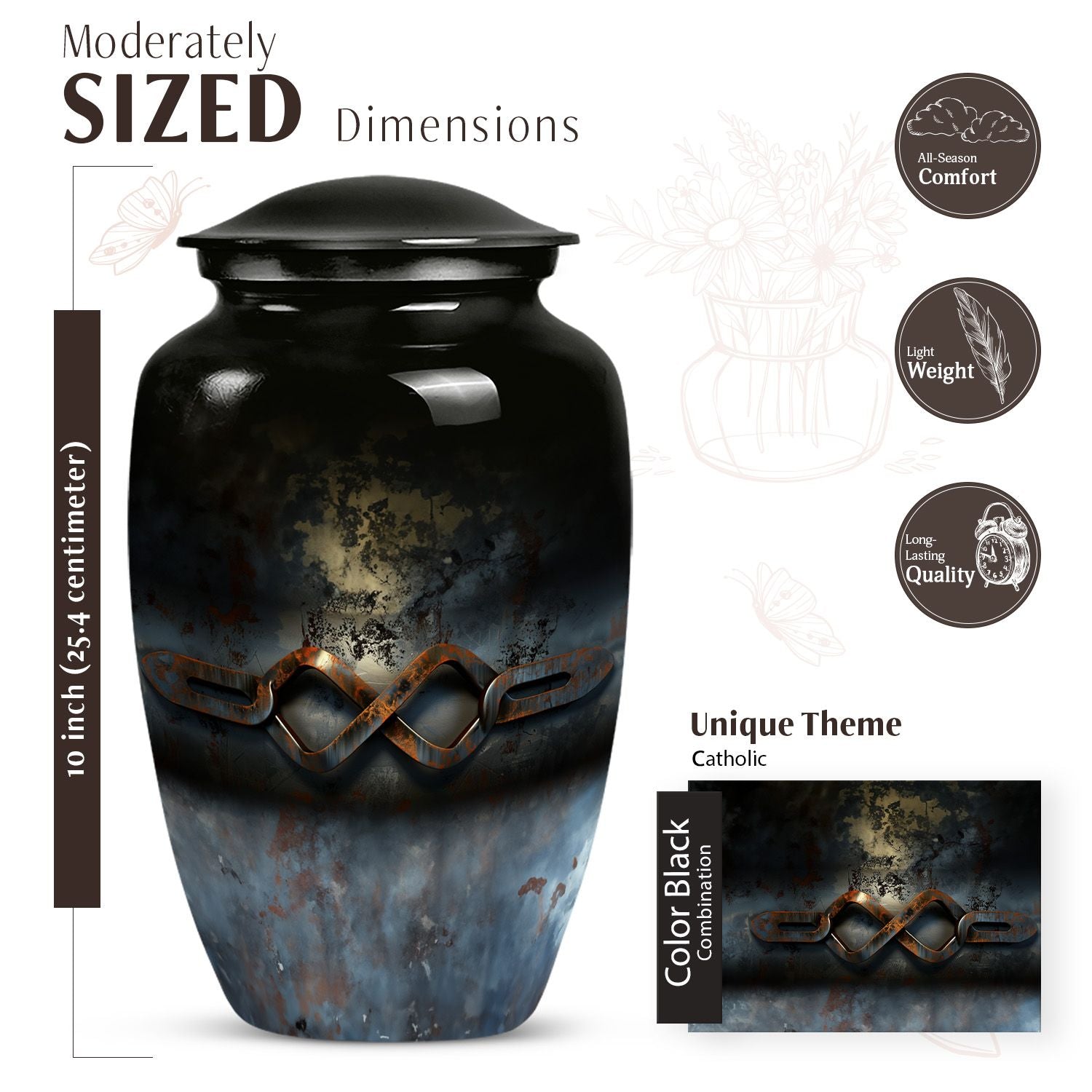 Immerse yourself in a fitting tribute to your beloved with our classic Catholic urn, thoughtfully designed for a majestic and memorable commemorative ceremony. Crafted from durable aluminium, the urn comes with an abstract theme that embodies purity and transcendence. Our large urn measures 10 inches in height, carrying a weight of 3.3 pounds, and has a capacity of holding up to 200 cubic inches of ashes. Your purchase includes a velvet pouch for secure containment of ashes, ensuring respectful handling throughout the ceremony. The urn offers an option of a personal touch with engraved names, promoting a lasting commemoration. Don't limit your search for 'funeral urns for adult ashes', 'ash urn ashes adult', 'outdoor urns', or 'burial urns metal', this catholic urn is meant for both indoor and outdoor ceremonies. This is a quintessential memorial urn for your mom's ashes, who will forever remain in your heart and soul.