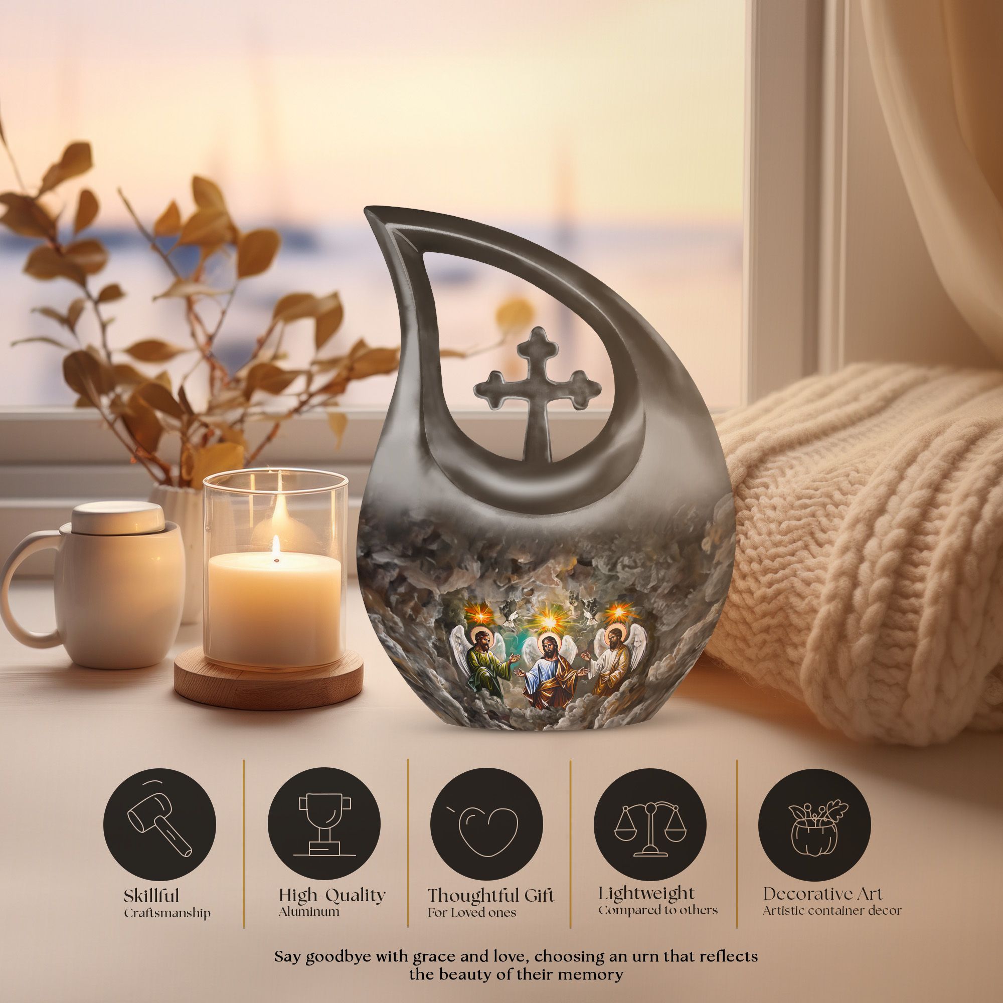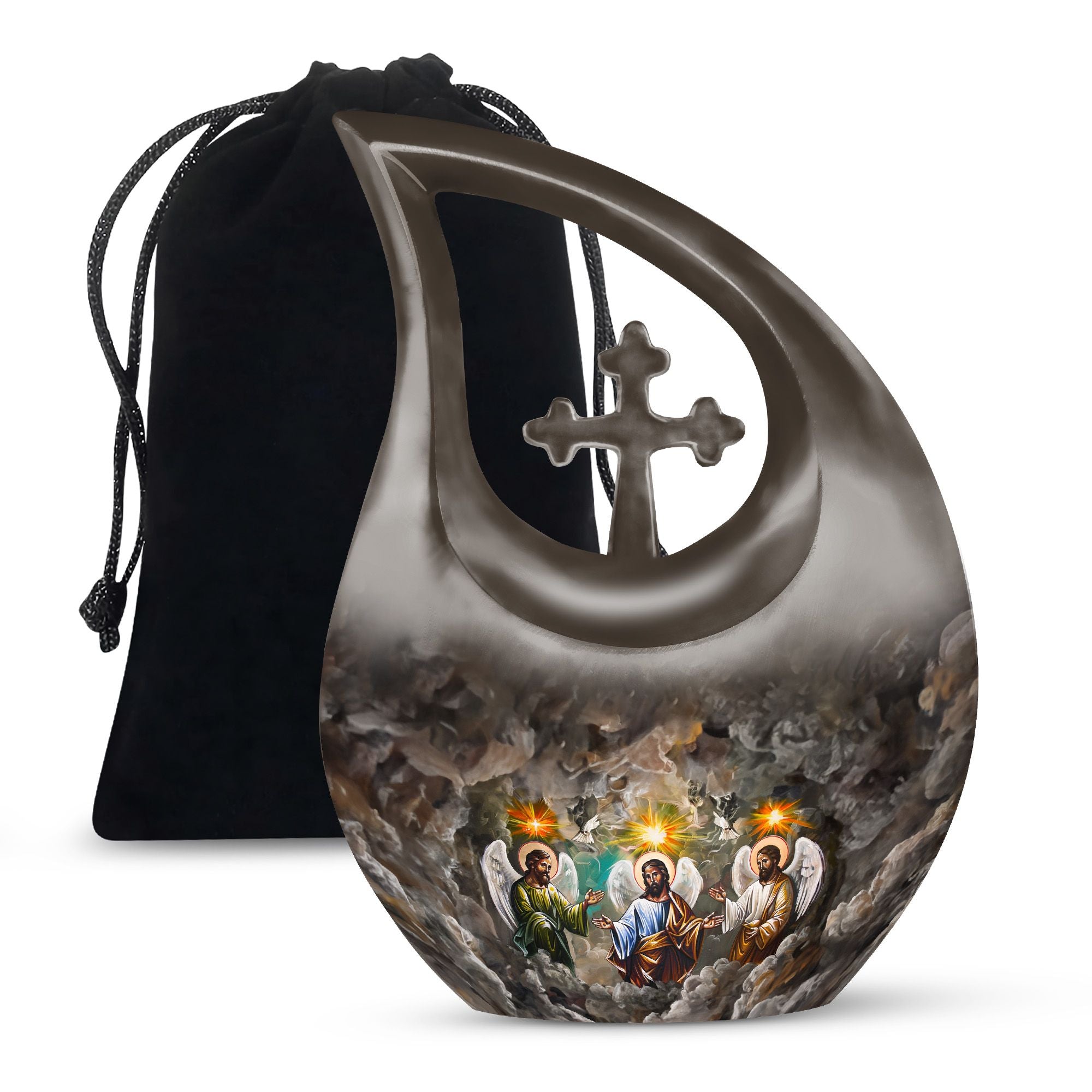 Preserve the memory of your beloved one in our respectful and dignified large Catholic urn. This aluminium 10-inch affordable burial urn will securely hold up to 200 cubic inches of cremation ashes. The urn's solemn and serene cross drop theme brings reverence and consolation, while its substantial weight of 3.3 pounds assures stability. It's impeccably suited for memorial ceremonies and as an abiding ashes keepsake. The urn comes with a velvet pouch for careful containment of the ashes. To make it truly special and unique, take advantage of our customization offer and personalize with engraved names. Notable for its sophisticated design, this urn perfectly caters to those searching for Catholic urns or keepsake urns for human ashes, creating a thoughtful connection during times of grieving. As you honor and remember your dearly departed, this urn will serve as a lasting tribute to their life.