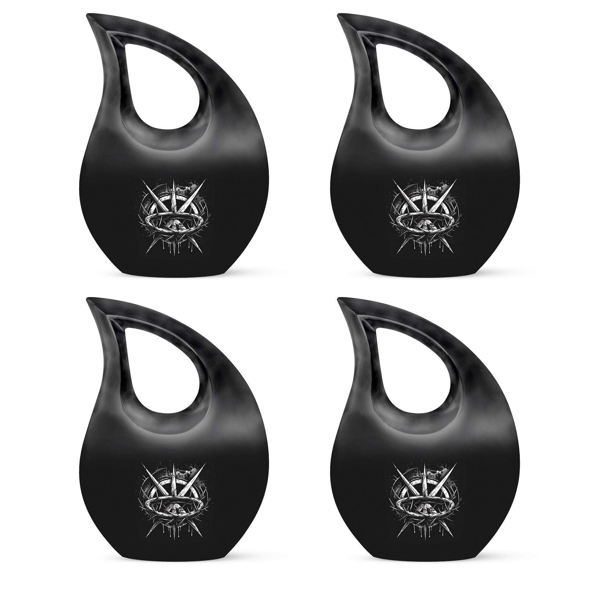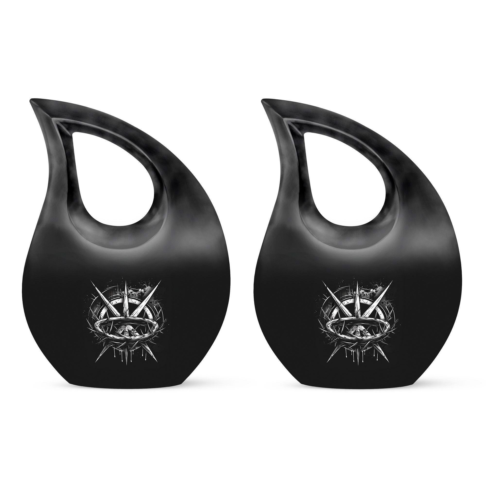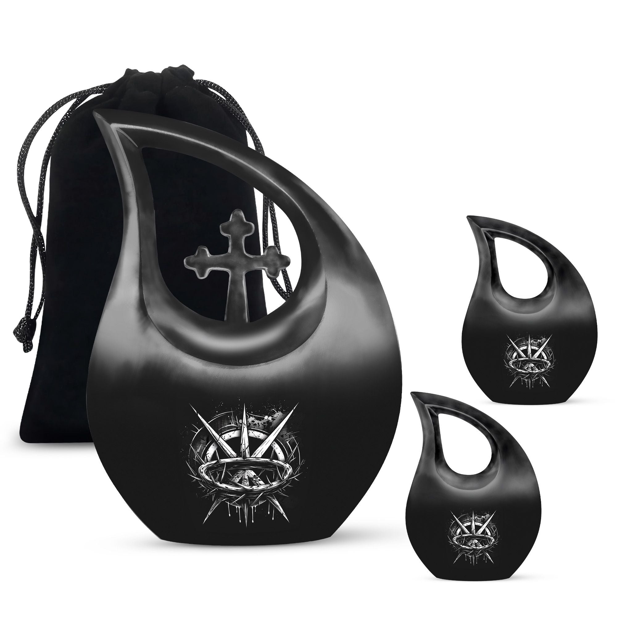 A distinguished and meaningful option for remembrance, this 10 Inch large 'Cross Drop' Catholic urn symbolizes the everlasting love and faith. It is an affordable burial urn, made from durable aluminium, weighing 3.3 pounds. The urn showcases a unique detail - a beautiful 'Cross Drop' design, an emblem of profound Catholic spirituality. It possesses a capacity to hold up to 200 cubic inches of ashes. With our personalized customization feature, you can engrave names and make it truly unique. The product along with a velvet pouch becomes more than just a memorial urn, they transform into a cherished tribute your loved ones. These custom urns for ashes are also available as small urns and companion urns as per your needs. It is sized to be a visible tribute at 10 inches in height, with fine lines and a textured finish that draws in the observer. This multi-purpose, elegant urn is not just a place to keep earthly remains but rather an artifact to remember and celebrate the life lived.