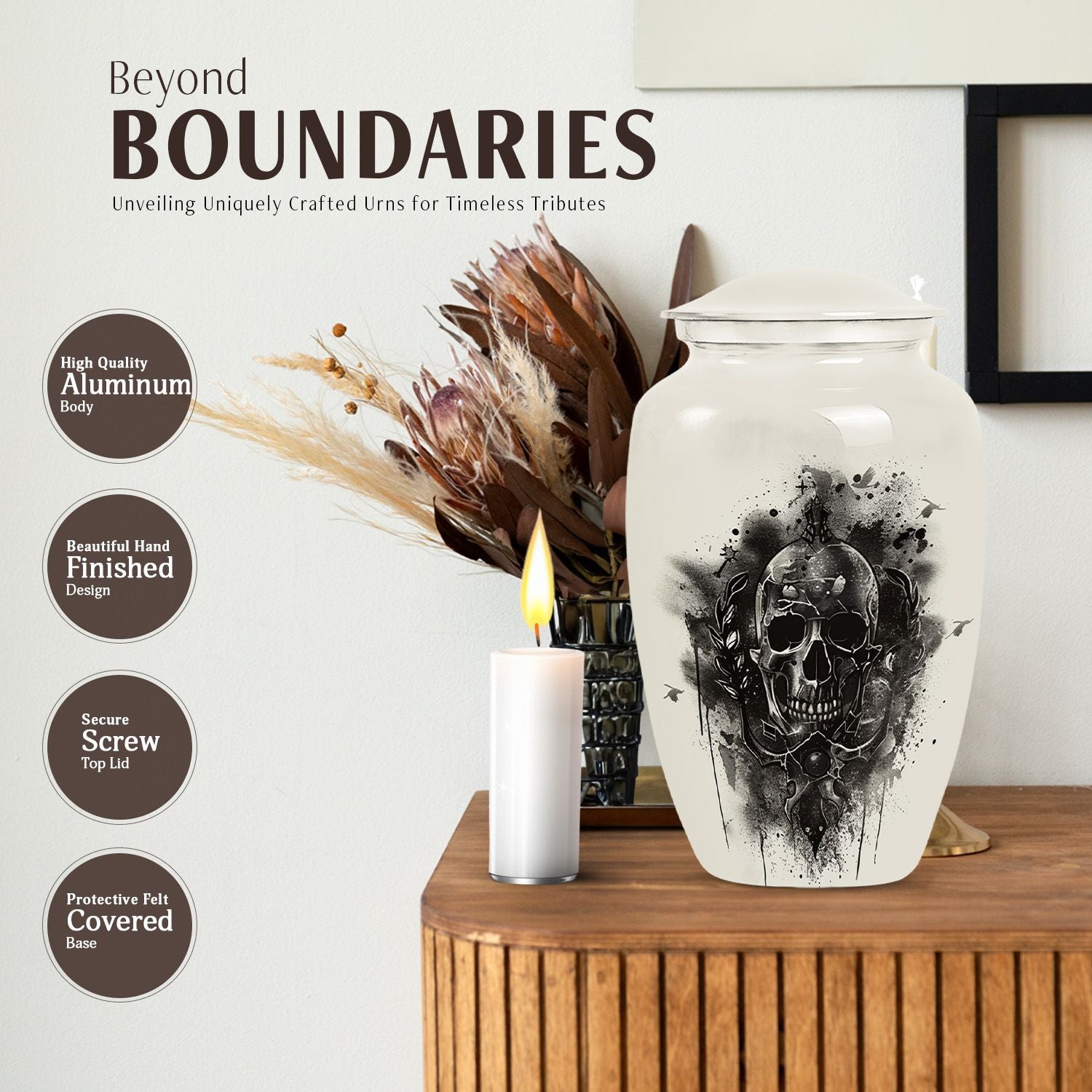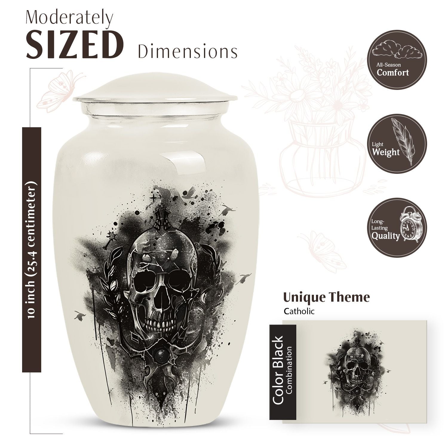 Bring peace and serenity to your cherished memories with our 10-inch Classic Catholic Urn. This large urn is perfect for honoring and remembering your loved ones. Crafted from high-quality aluminium, it weighs a solid 3.3 pounds and has a capacity to hold 200 cubic inches of ashes. The Abstract theme suggested in its well-thought-out structure illuminates the notion of eternal memory and reflects a unique character, making it unlike any other funeral ash urn or cremation urn. Additionally, this urn comes with a velvet pouch for containment of ashes, ensuring a dignified respect for the ashes of your loved one. As a special touch, our urn can be customized with engraved names, adding a deeply personal element that makes it all the more precious. This thoughtful memorial urn for mom ashes, urn human ash urns is more than just a vessel. It is a tribute, a testament to life, love, and shared memories. Please note, this urn does not include the 'Design' attribute. A popular choice in the category of memorial ceremony supplies, our urn offers a unique alternative to ordinary metal urns for adult human ashes.