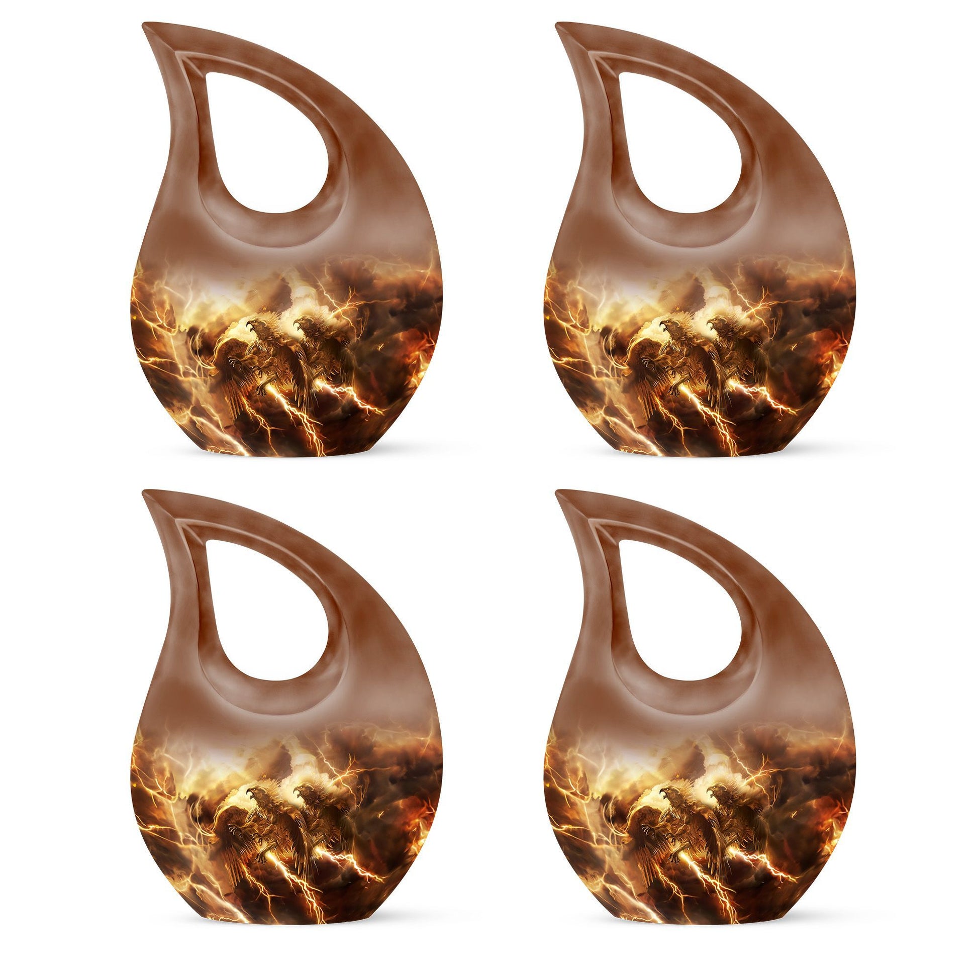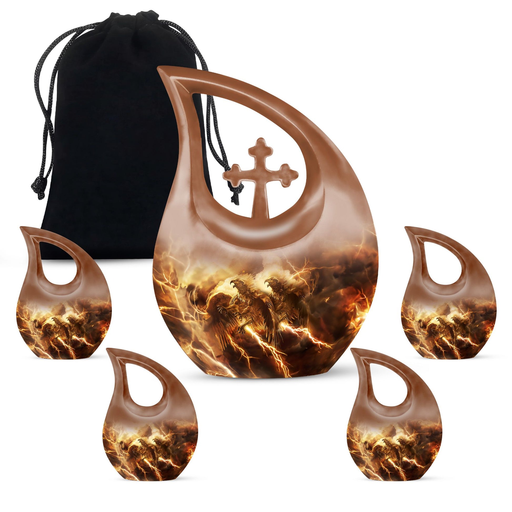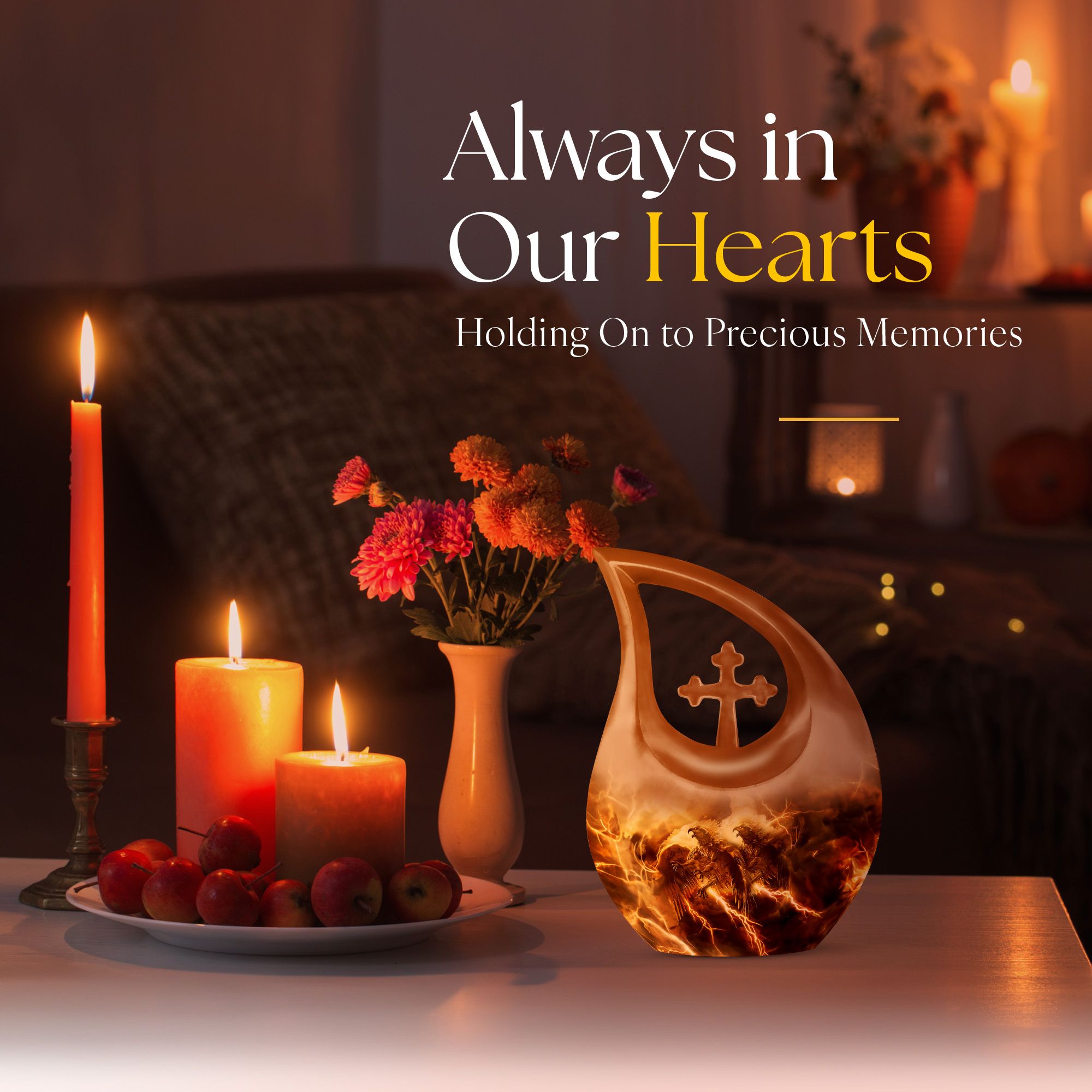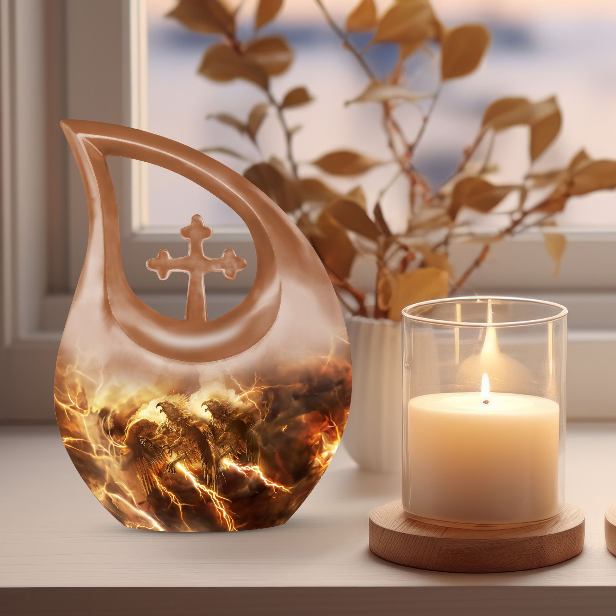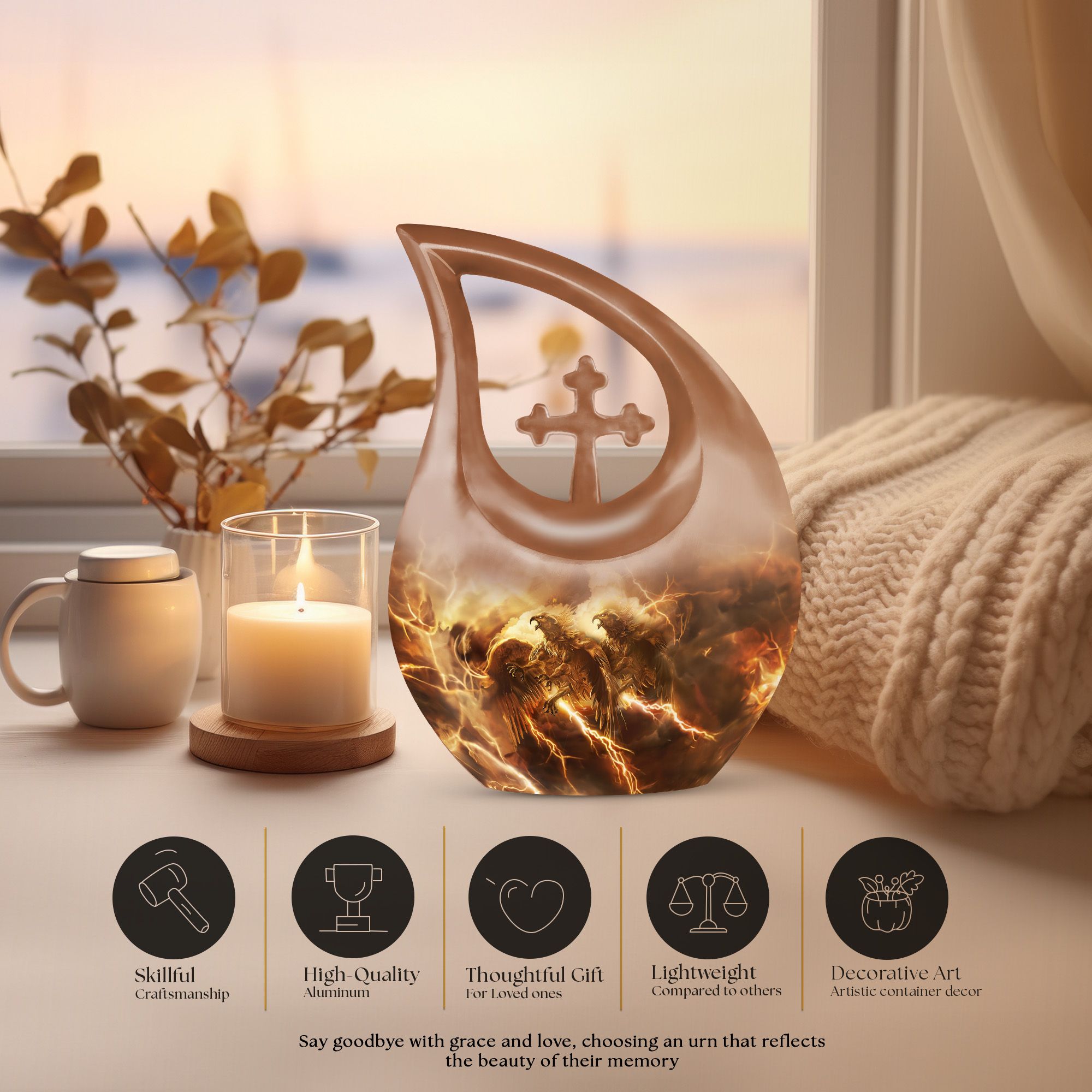 Explore your spiritual connection with our Catholic Cross Drop Urn, a definitive choice for individuals looking for catholic urns or large urns. Our exclusively crafted memorial urns, sized at 10 inches, allow you peace and tranquility as they honor your loved ones. Made from resilient aluminium, these urns ensure lasting durability. They exhibit a soothing theme with a Catholic Cross Drop that resonates with faith and hope. These urns are not just symbols of remembrance but also a testament of a spiritual journey. Our product package comes inclusive of a velvet pouch, an elegant containment for ashes. Moreover, the capacity stands at 200 cubic inches, sufficient to hold the ashes diligently. Weighing just 3.3 pounds, the urn is quite manageable. We also offer customization options to engrave names, making our keepsake cremation urns a personal treasure. So, whether you're in search of garden urns or personalized urns for human ashes, our product stands as an optimal choice.