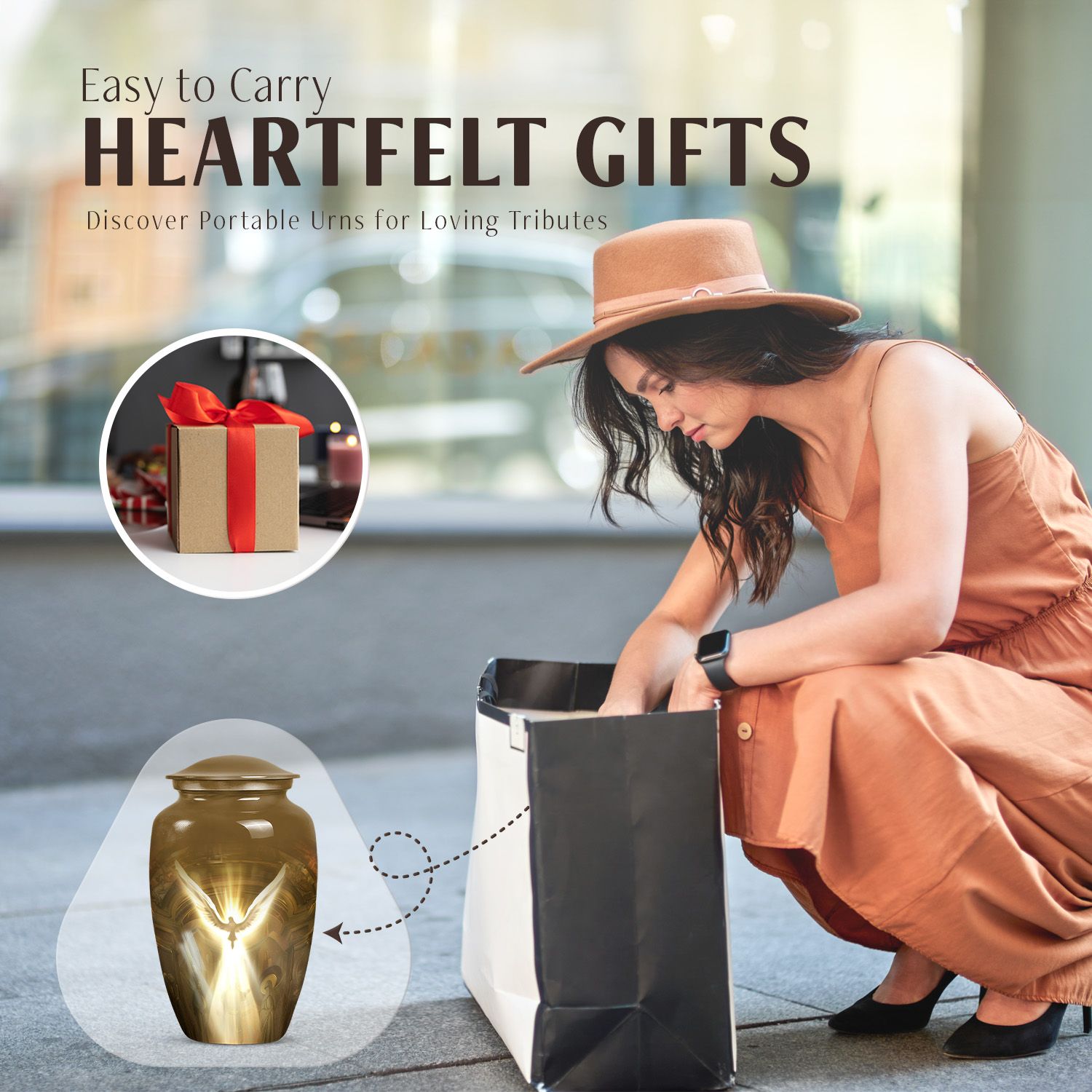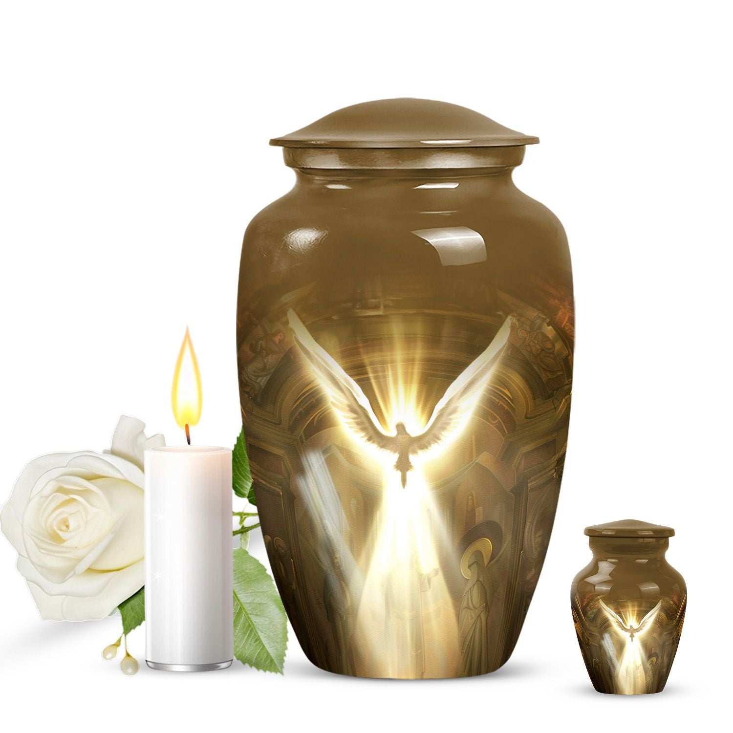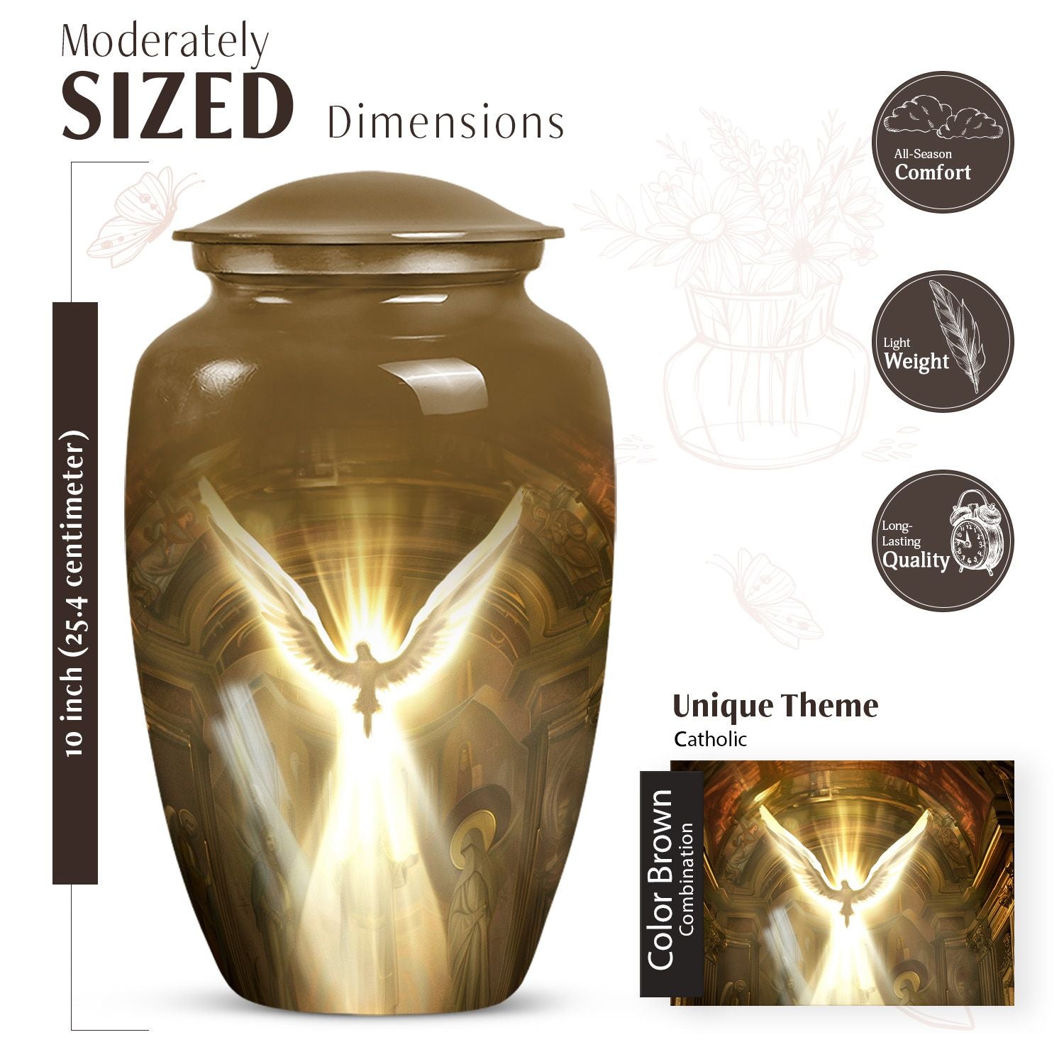 Experience a dignified and respectful memorial with the 'Abstract' themed Large Urn, specially crafted for Catholic rites. This cremation urn is fashioned from robust aluminium, with a classic design that brings tranquillity and comfort during moments of remembrance. Sized at 10 inches, this urn weighs a sturdy 3.3 pounds, designed to etch its presence permanently in your memories as a sublime representation of your loved one's life. With a capacity of 200 cubic inches, it effortlessly accommodates the ashes and offers a velvet pouch for their containment. Notably, this urn opens space for personalizing with engraved names, introducing a unique touch to each urn, which goes beyond the conventional cremation medium urns for human ashes. Catering to its universal appeal, it makes an excellent inclusion in the array of burial cremation urns for human ashes. This product signifies a heartfelt blend of respect, love, and remembrance in the face of human cremation. This product transcends the reverence of Christianity and makes a poignant statement in memory of your loved one, proving to be a significant addition to your memorial ceremony supplies.