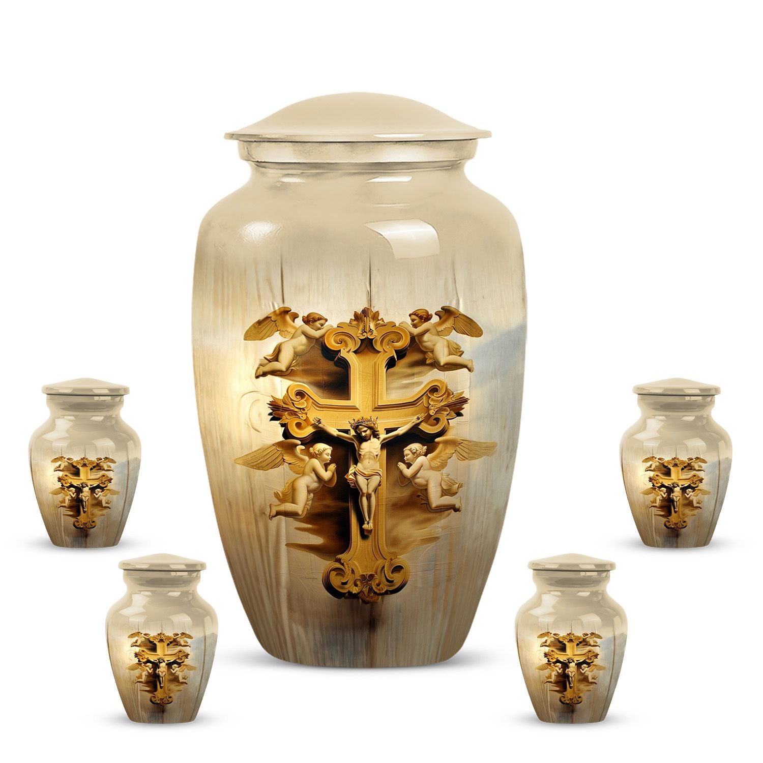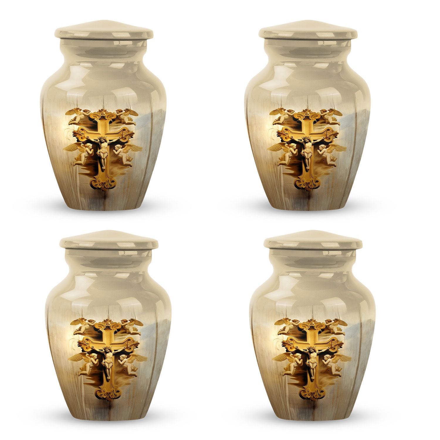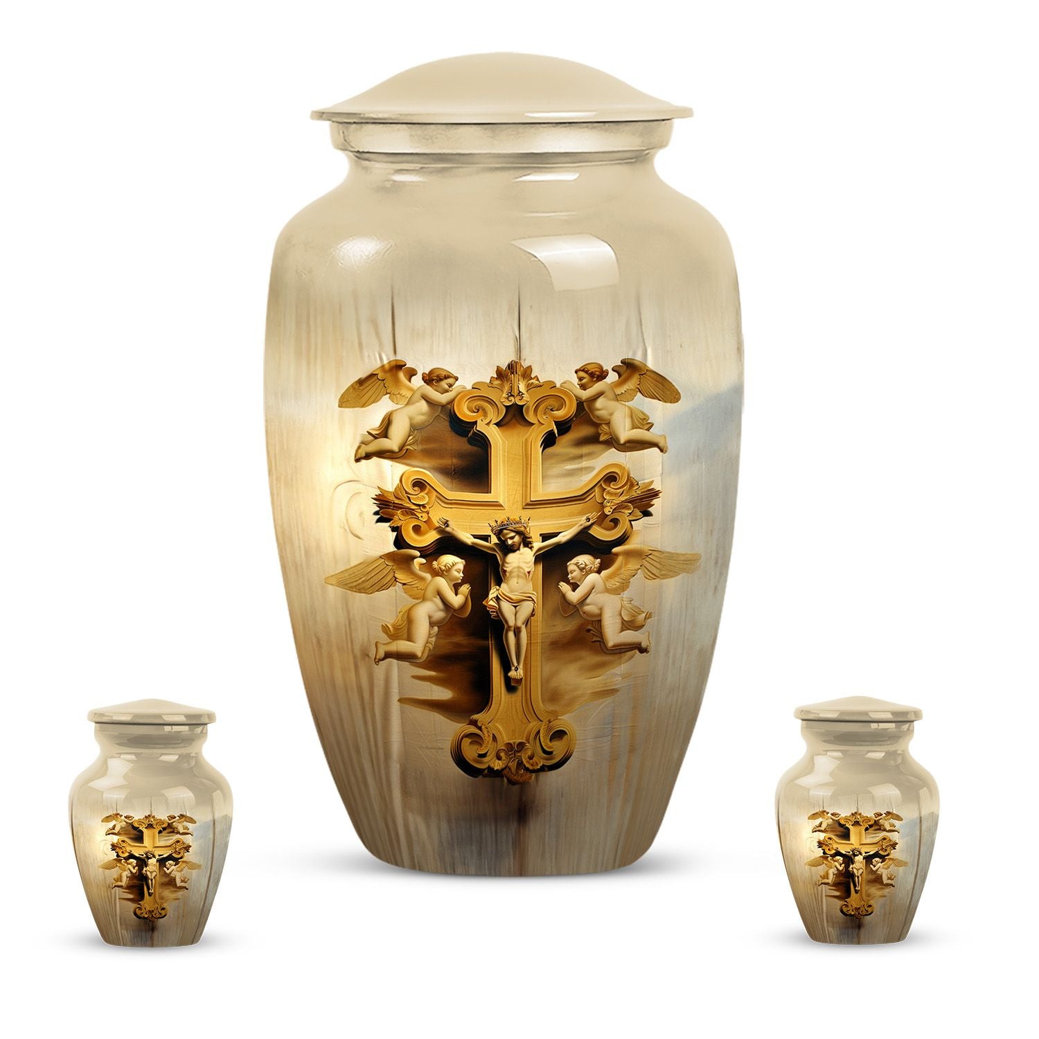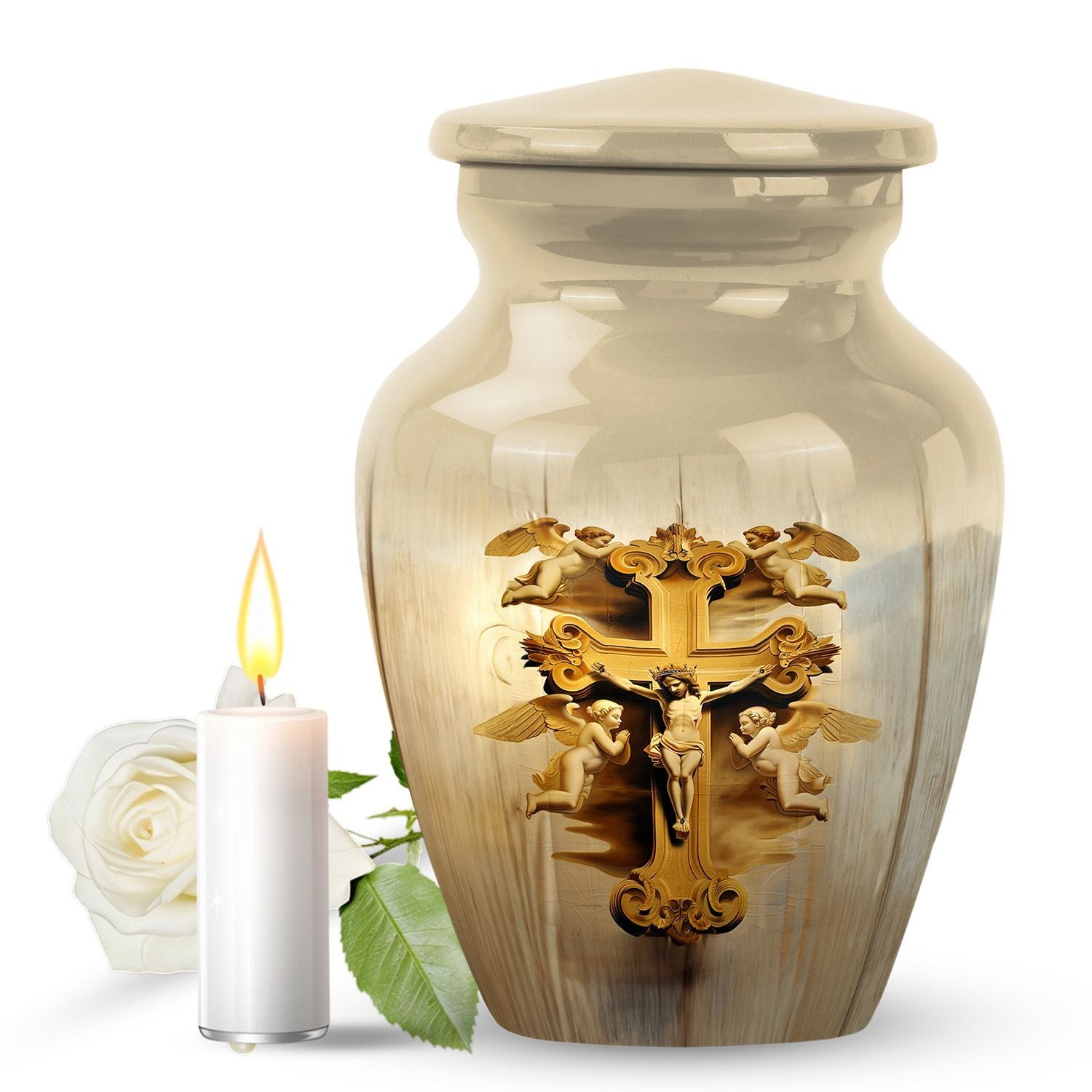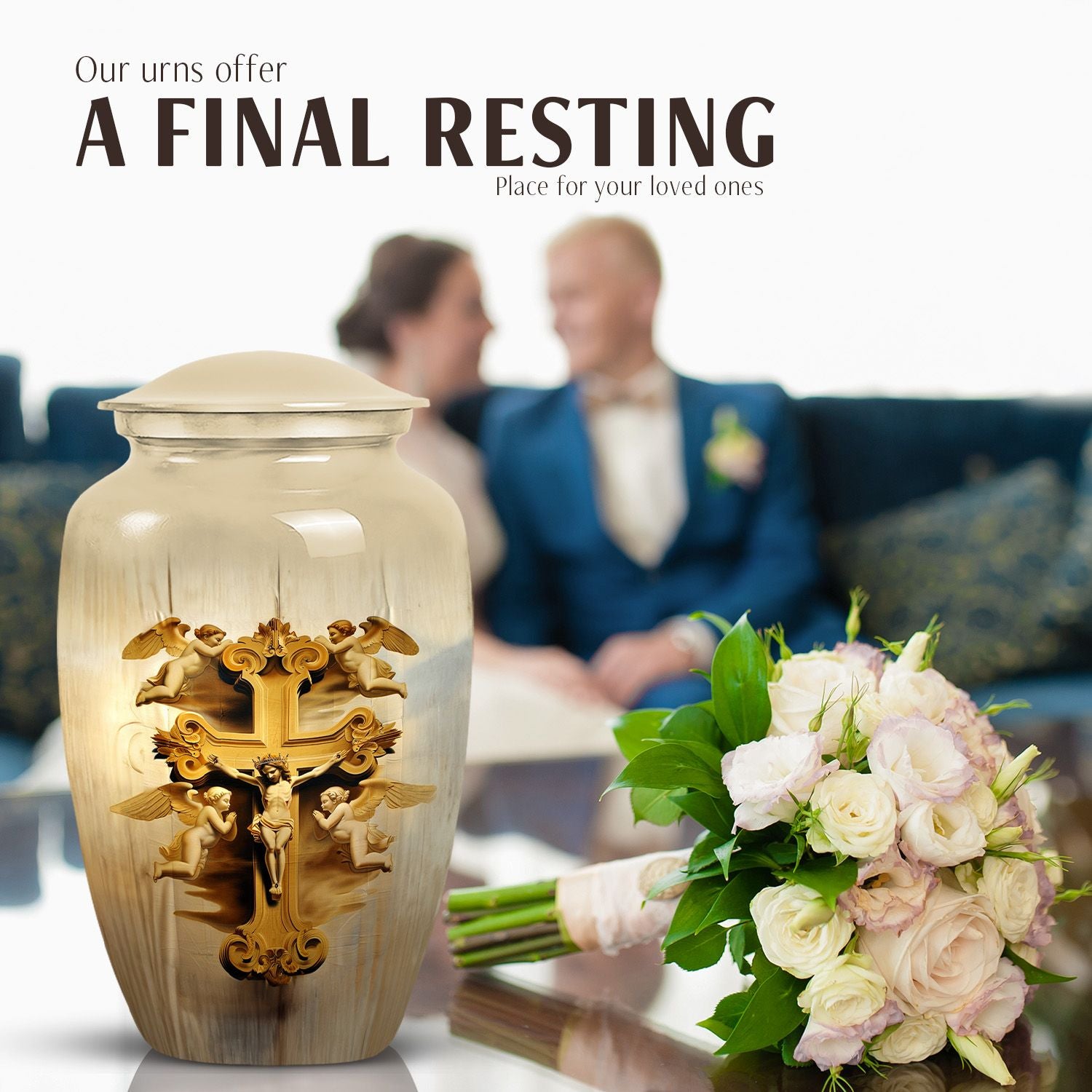 Introducing an elegant final resting place, our Catholic Urn is carefully crafted from premium Aluminium, ensuring durability and long-lasting peace of mind. Sized at a dignified 10 inches, this cremation urn for human ashes is an adult male size with a generous capacity of 200 cubic inches, suitable for various needs. Its substantial weight of 3.3 pounds further stamps its permanence. Provision for personal engraving allows you to etch the names of your loved ones, making this more than an urn, but a tribute. It steps away from mundane designs, showcasing an abstract theme that is unique, yet respectful. This packaged deal also comes with a sophisticated velvet pouch, facilitating easy containment and transportation of ashes. In the vast ocean of cremation urns, burial medium size urns, and funeral urns for adult ashes women, this Catholic Urn stands as a beacon, merging sentimentality with striking aesthetics. It is not only a large urn but a symbol of cherished memories cast in timeless aluminium.