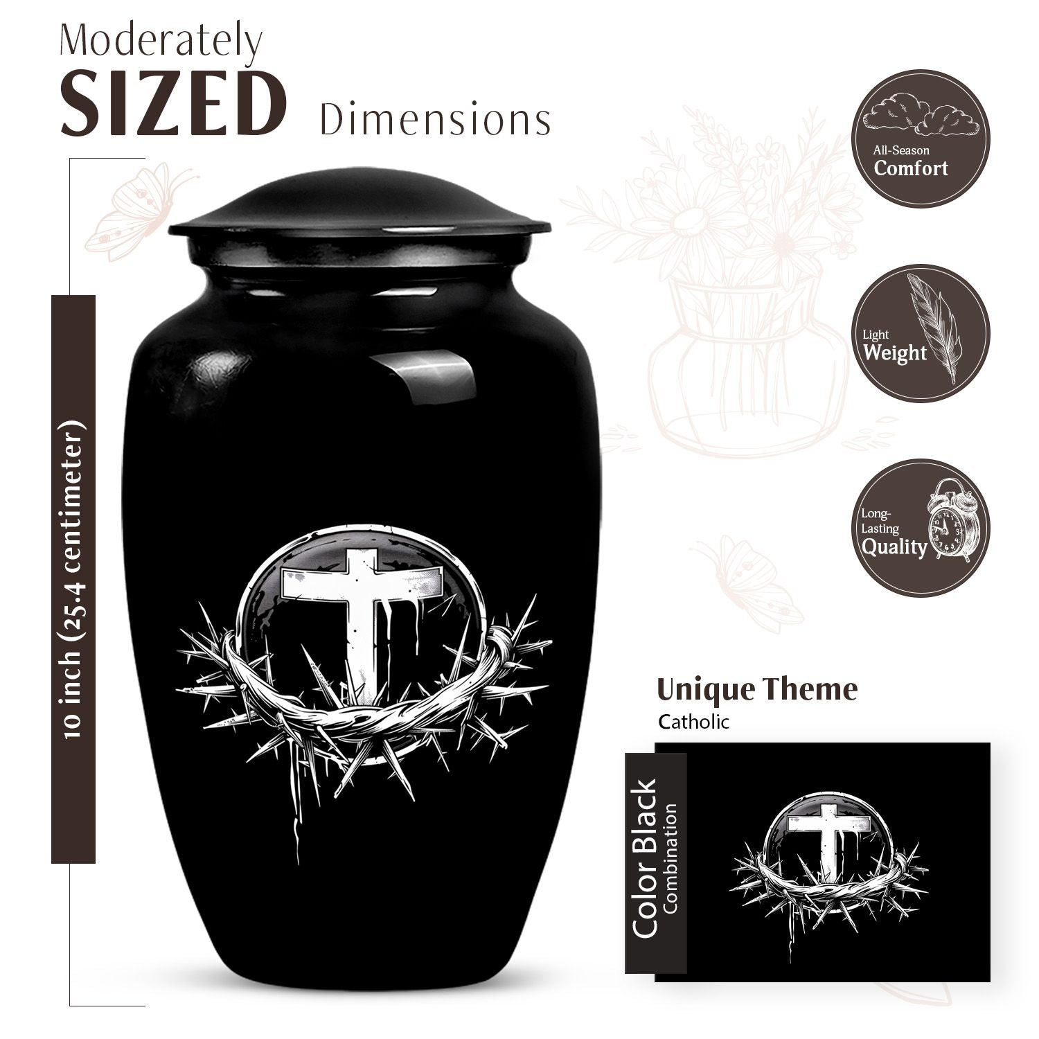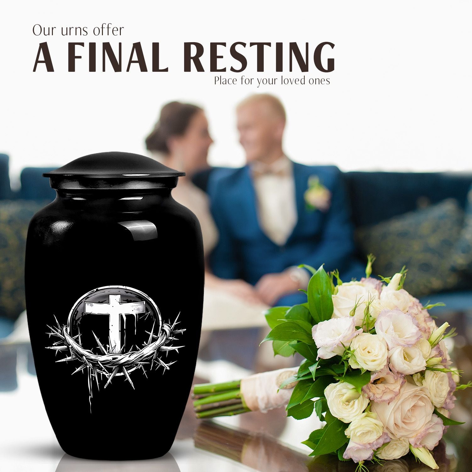 Experience a timeless remembrance with our exceptional Catholic urn. This Large Urn, crafted from robust Aluminium, showcases an impressive capacity of 200 cubic inches, ready to honor and cherish your loved ones in a unique way. Measuring 10 inches in height, it's just the perfect size to be a dignified home for your loved one's memories. The Classic Urn design, dipped in an abstract theme, brings an element of artful sophistication. This funeral ash urn also includes a velvet pouch, tastefully providing containment for ashes. Weighing 3.3 pounds, it guarantees durability and permanence. Add a touch more personal by engraving names on this cremation urn. Perfect for your memorial ceremony supplies, this urn human ash urn offers not just a resting place, but a symbol of everlasting love and respect. This unique urn, catering to Catholic rites, never fails to impress with its alluring design and solemn reverence.
