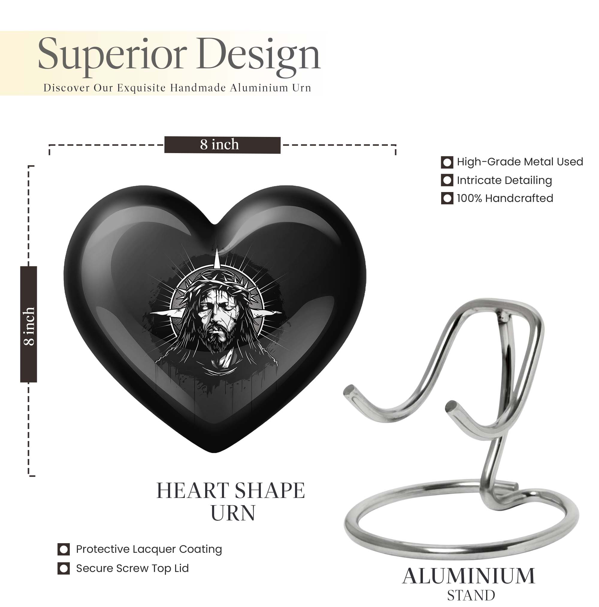 Immerse in a sacred tribute to a departed loved one with our catholic urn, thoughtfully crafted for a gentle embrace of remembrance. This Heart Urn, delicately formed in an abstract theme, is designed to suit your memorial ceremony needs. The urn, bearing dimensions of 10 inches in height, is composed of durable aluminium ensuring lasting preservation. It weighs 3.3 pounds and is purpose-built to accommodate up to 200 cubic inches of human ashes, a fitting capacity for functionally decorative urns for home. Each burial funeral cremation urn features an option of customization, allowing you to personalize it with engraved names, adding a touch of intimacy and dedicatory sentiment. The package arrives with a velvet pouch for containment of ashes, enhancing the preservation purpose while adding a refined touch. This elegant and sturdy cremation urn is a powerful embodiment of love and honor for your cherished one's memory. Uncommonly thoughtful in design, function, and sentiment, it upholds your tribute with the dedicated reverence it deserves.