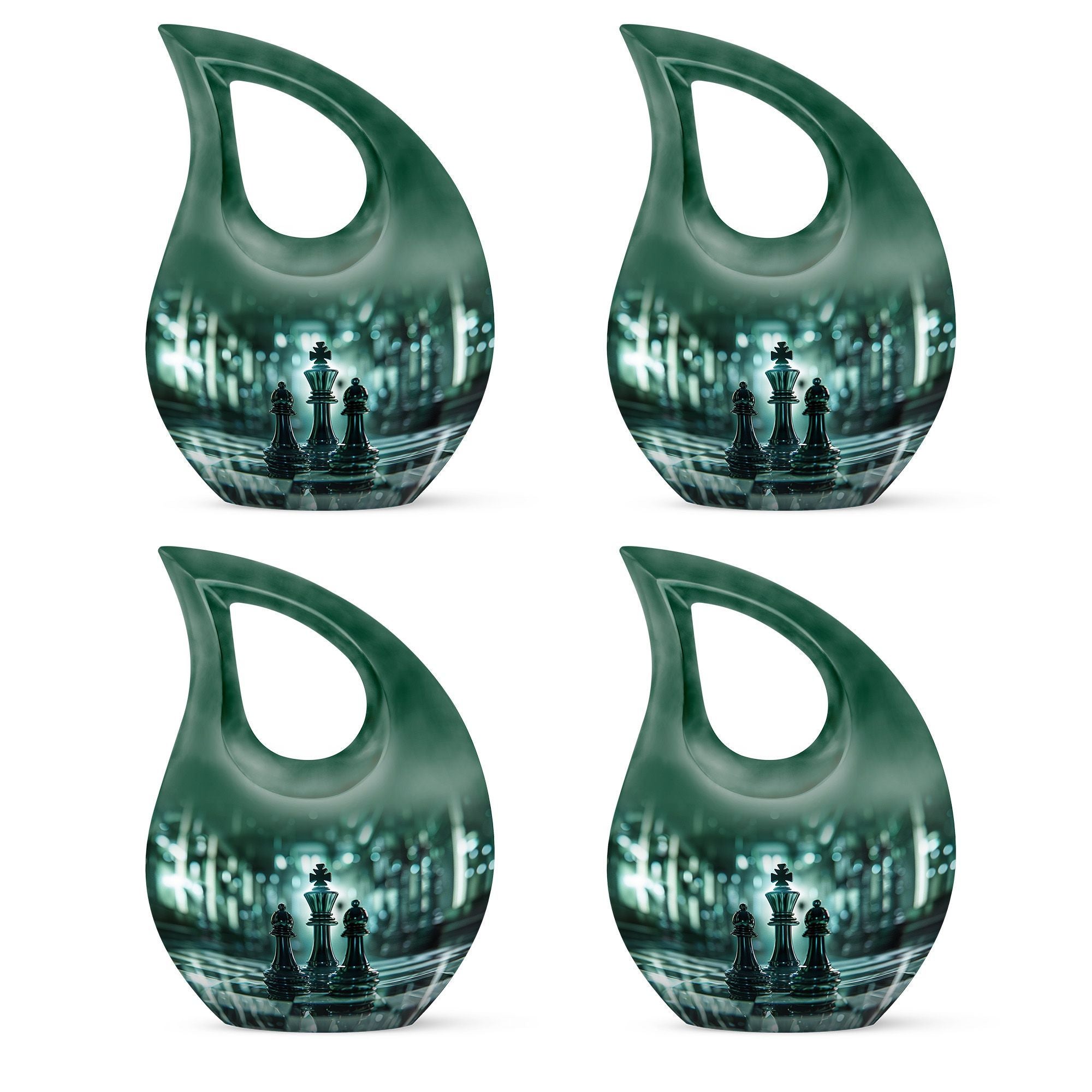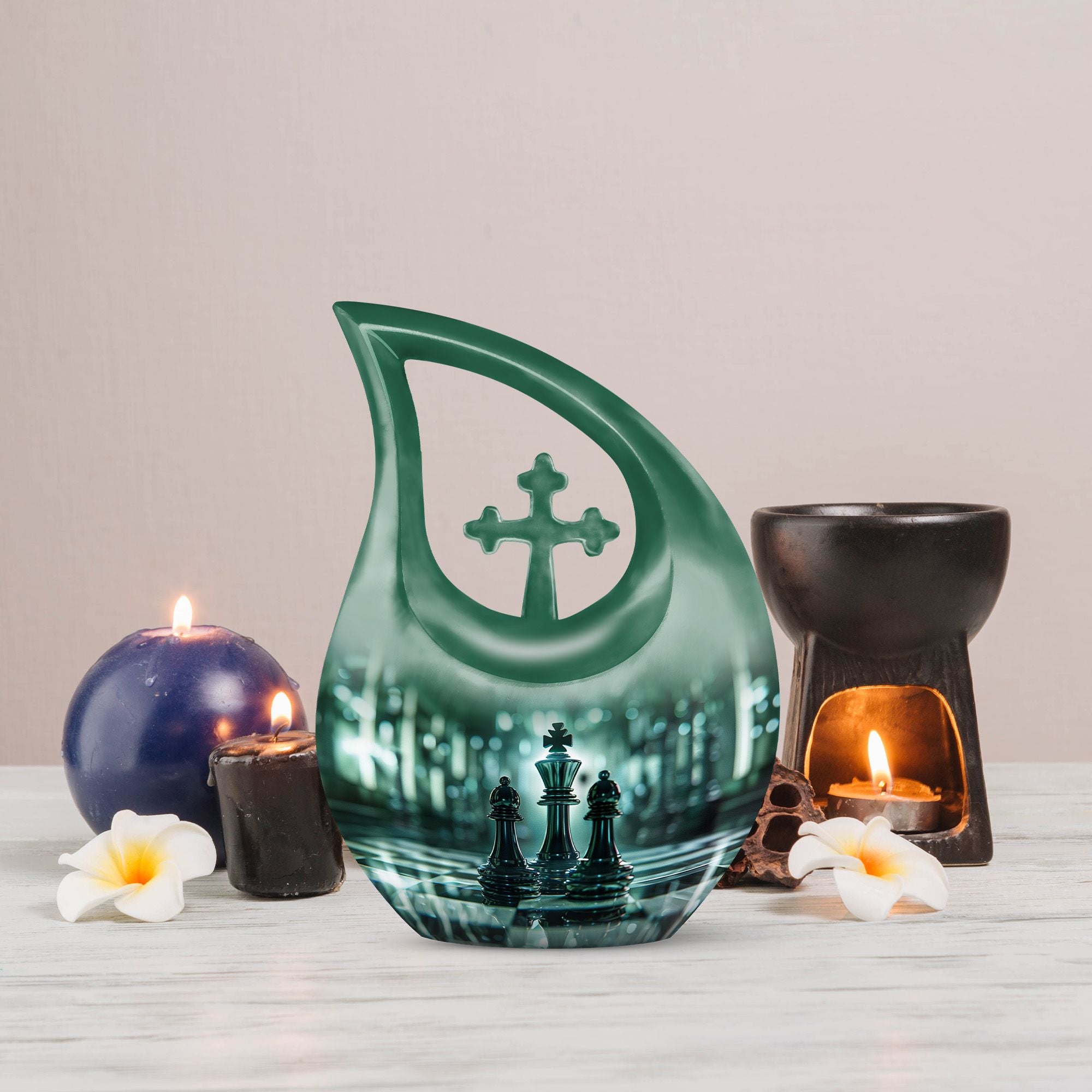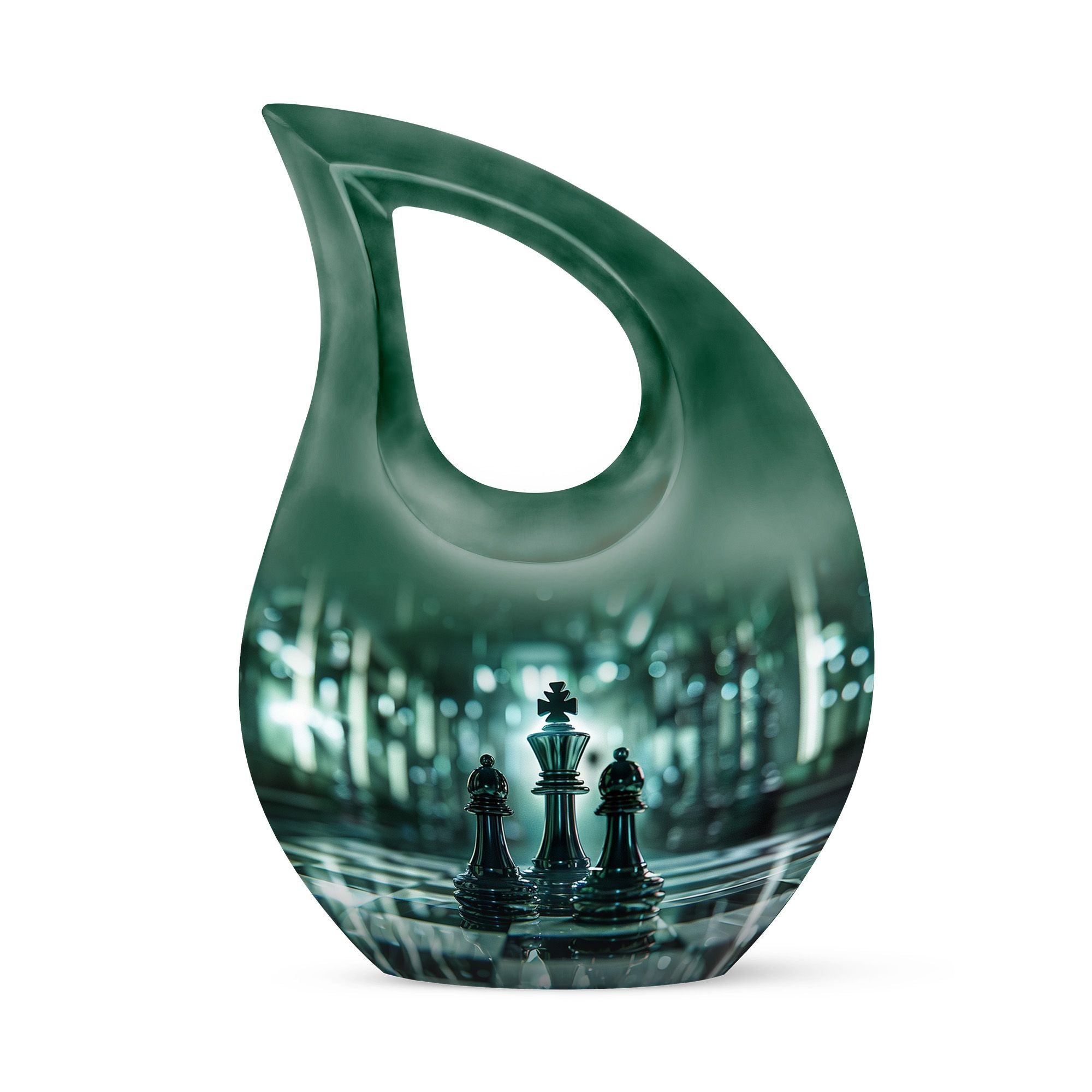 Presenting our distinct Cross Drop design Chess Urn - a combination of sophistication and significance for the refinement of your cherished memories. This 10-inch medium size urn is intricately crafted entirely from robust Aluminium, ensuring its elegance as well as lifetime endurance. Despite its intriguing chess theme artistry, it weighs a mere 3.3 pounds and encapsulates up to '200 cubic inches' of precious ashes or keepsakes. The Chess Urn bears the capacity suitable for most adults, making it an infallible choice amongst customized urns for ashes. To heighten its profound appeal, we offer the provision to personalize the urn with engraved names, encapsulating the essence of your love permanently. Accompanied by a soothing velvet pouch, your memorial tribute finds a respectful containment. Often sought after as a sophisticated keepsake for a man, its charm lies in its originality and symbolic design. Trust our Cross Drop Chess urn to be a memento of mindful memorial urns, curating eternal memories with grace and dignity.