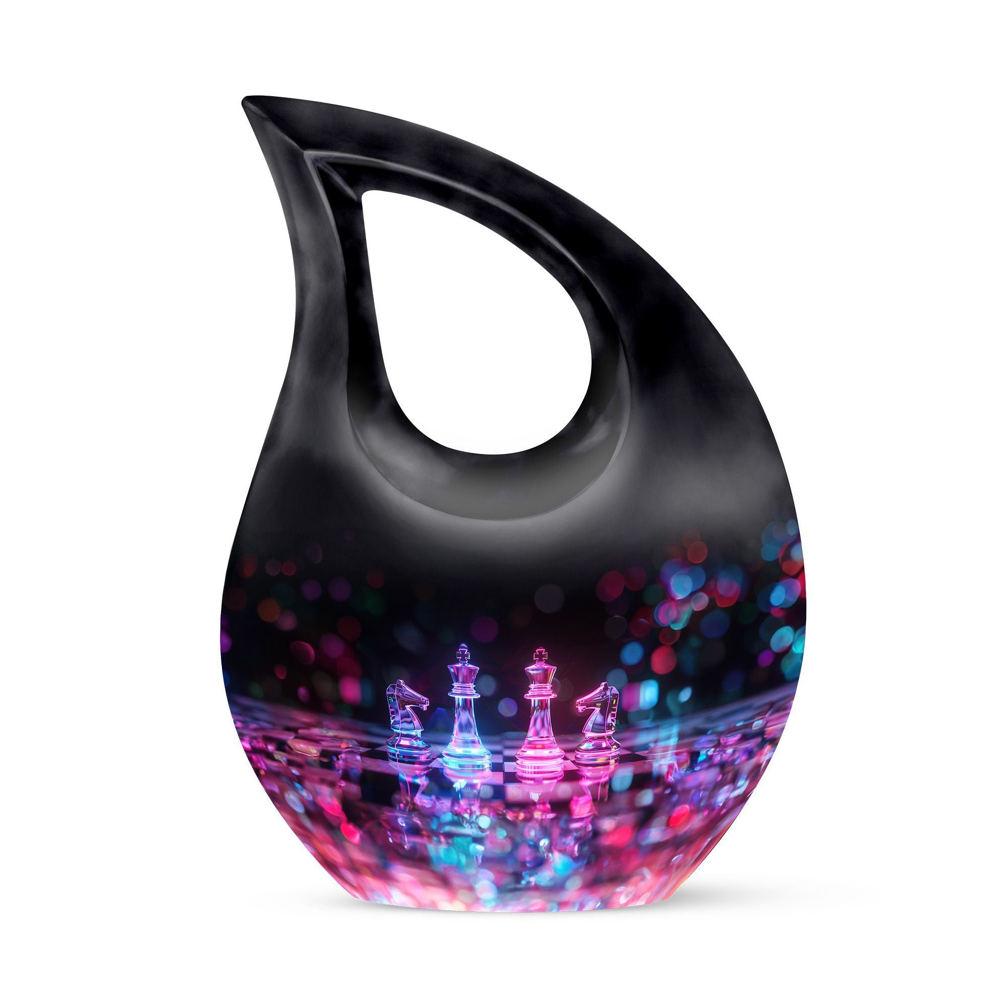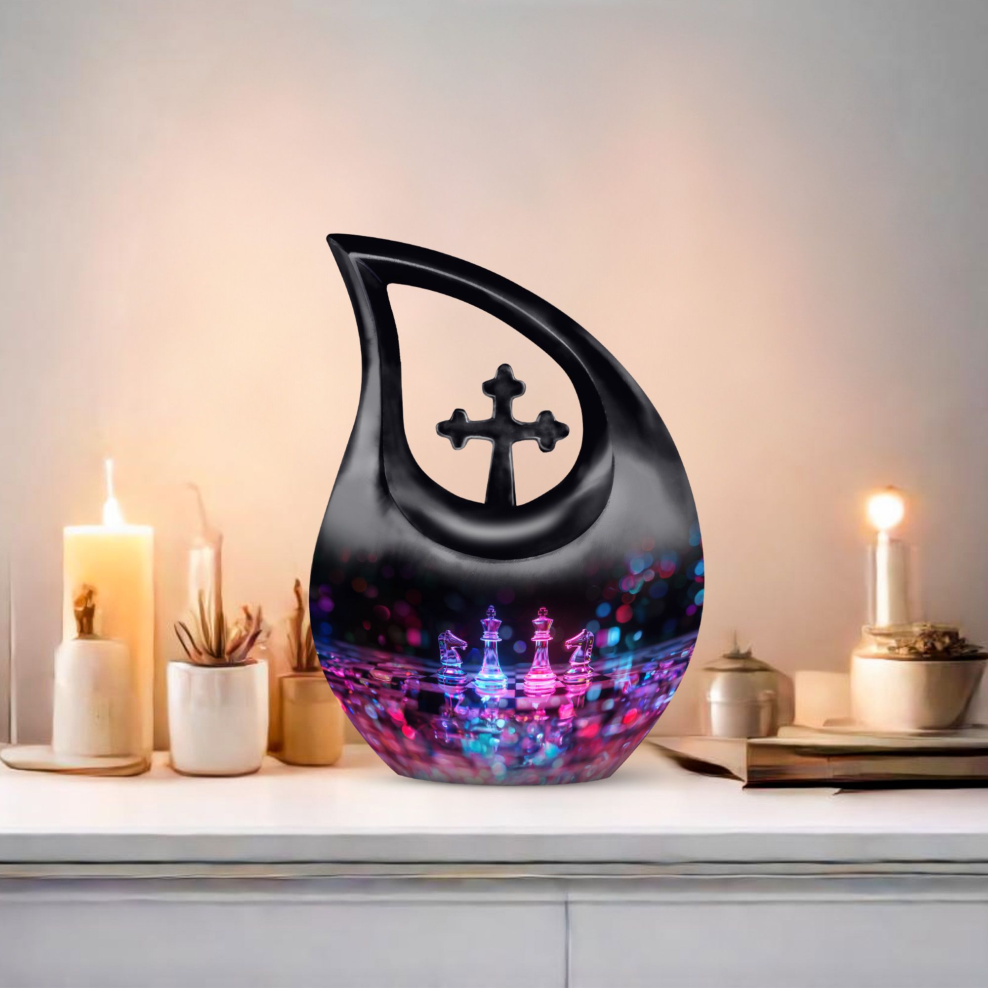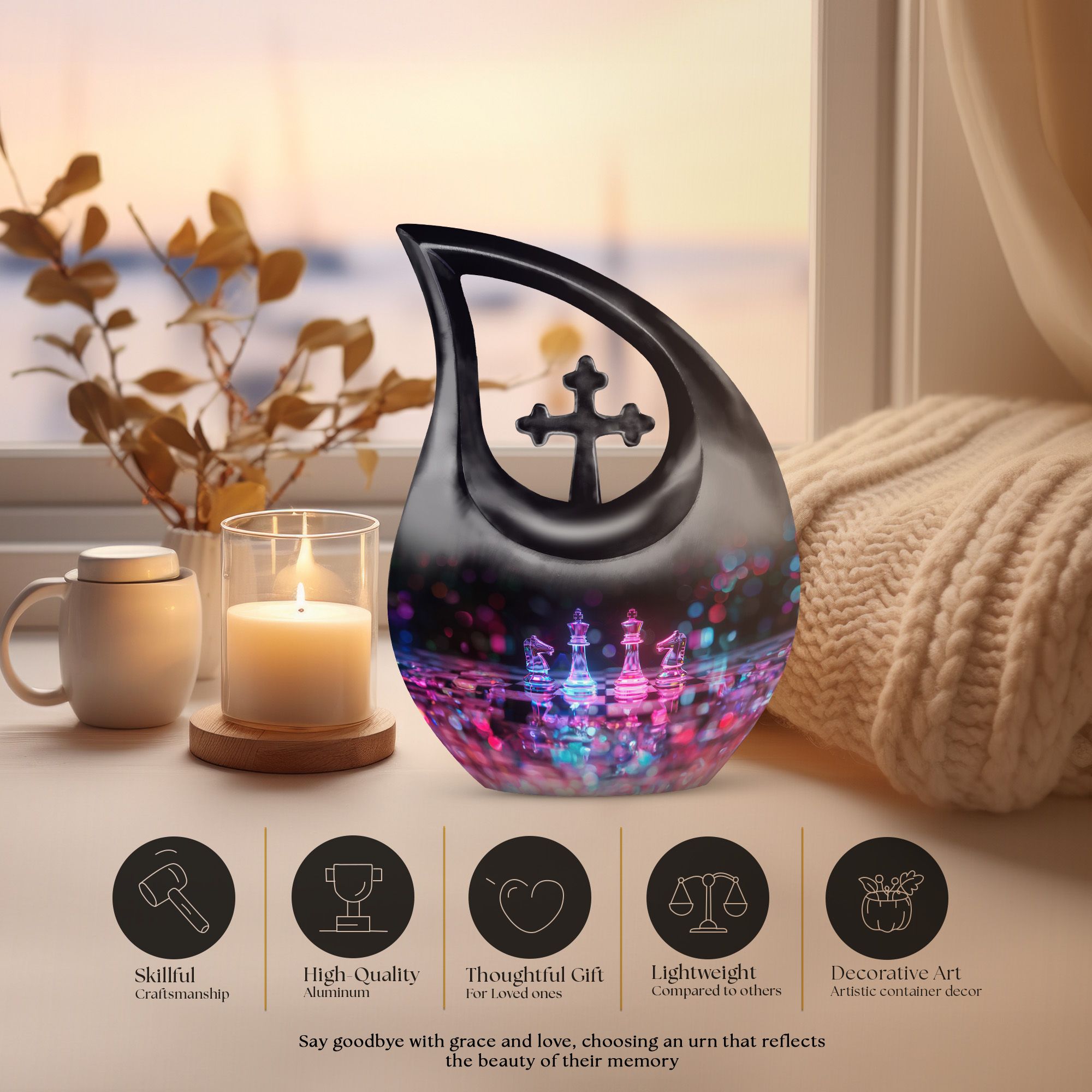 Discover the Chess Urn, a distinctively created memorial urn, encompassing both elegance and exceptional craftsmanship. Sized at 10 inches, this remarkable item stands as a medium-sized urn, balanced and proportioned to perfection. Fashioned from durable aluminium, the urn carries a weight of 3.3 pounds - demonstrating its robust structure and quality, capable of standing the test of time. It possesses a generous capacity of 200 cubic inches, an ample space to securely contain ashes in the included velvet pouch. Signature of its chess theme is the unique Cross Drop pattern. What sets this urn apart is the thoughtful option of personalizing it with engraved names, making it that much more special. This Large Urn is not just a memorabilia, but a keepsake memory box - treasured for its relevance and the comfort it provides. As cool urns go, it ranks as one of the best urns available. Serving as a Companion Urn for Ashes, it exemplifies solemn beauty and tranquil remembrance.