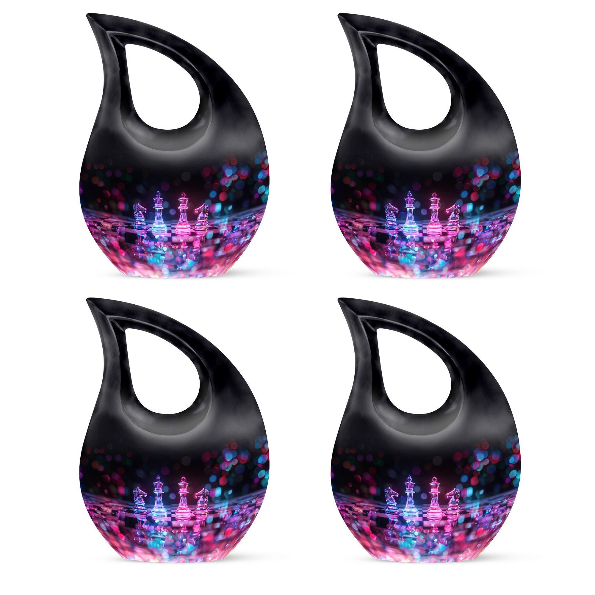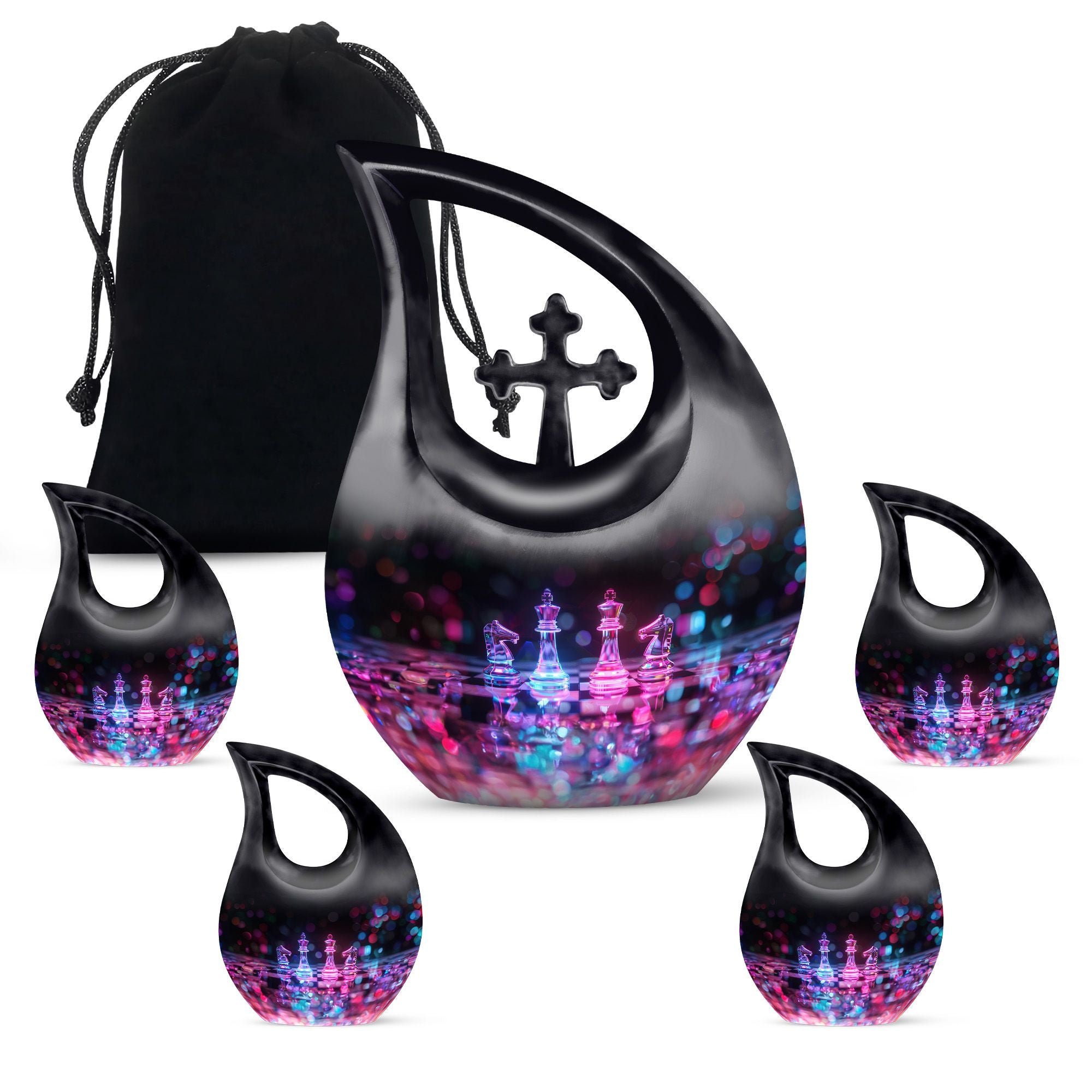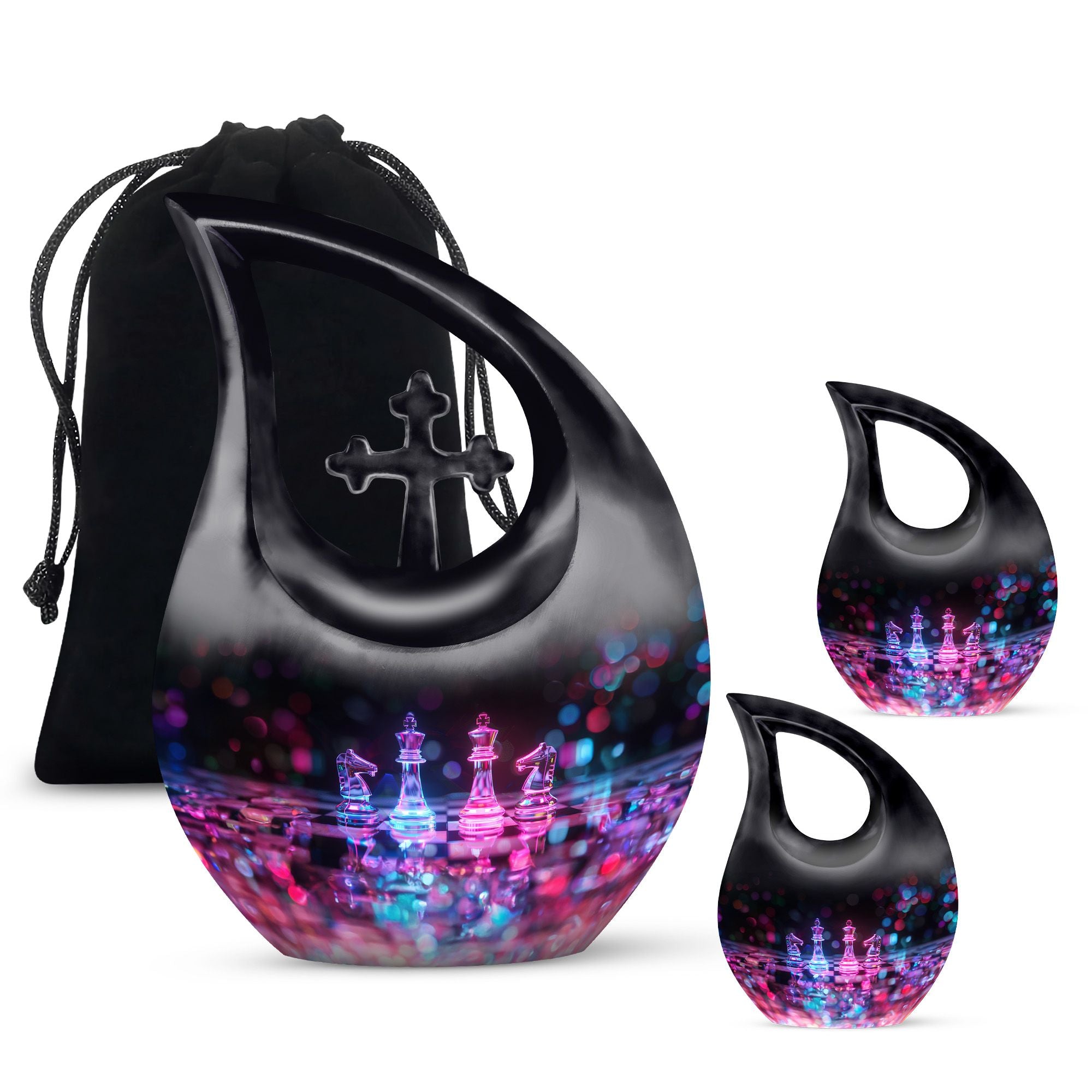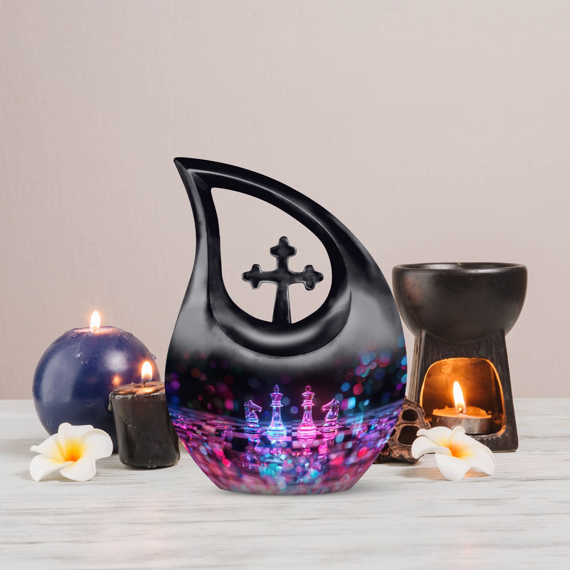 Discover the Chess Urn, a distinctively created memorial urn, encompassing both elegance and exceptional craftsmanship. Sized at 10 inches, this remarkable item stands as a medium-sized urn, balanced and proportioned to perfection. Fashioned from durable aluminium, the urn carries a weight of 3.3 pounds - demonstrating its robust structure and quality, capable of standing the test of time. It possesses a generous capacity of 200 cubic inches, an ample space to securely contain ashes in the included velvet pouch. Signature of its chess theme is the unique Cross Drop pattern. What sets this urn apart is the thoughtful option of personalizing it with engraved names, making it that much more special. This Large Urn is not just a memorabilia, but a keepsake memory box - treasured for its relevance and the comfort it provides. As cool urns go, it ranks as one of the best urns available. Serving as a Companion Urn for Ashes, it exemplifies solemn beauty and tranquil remembrance.