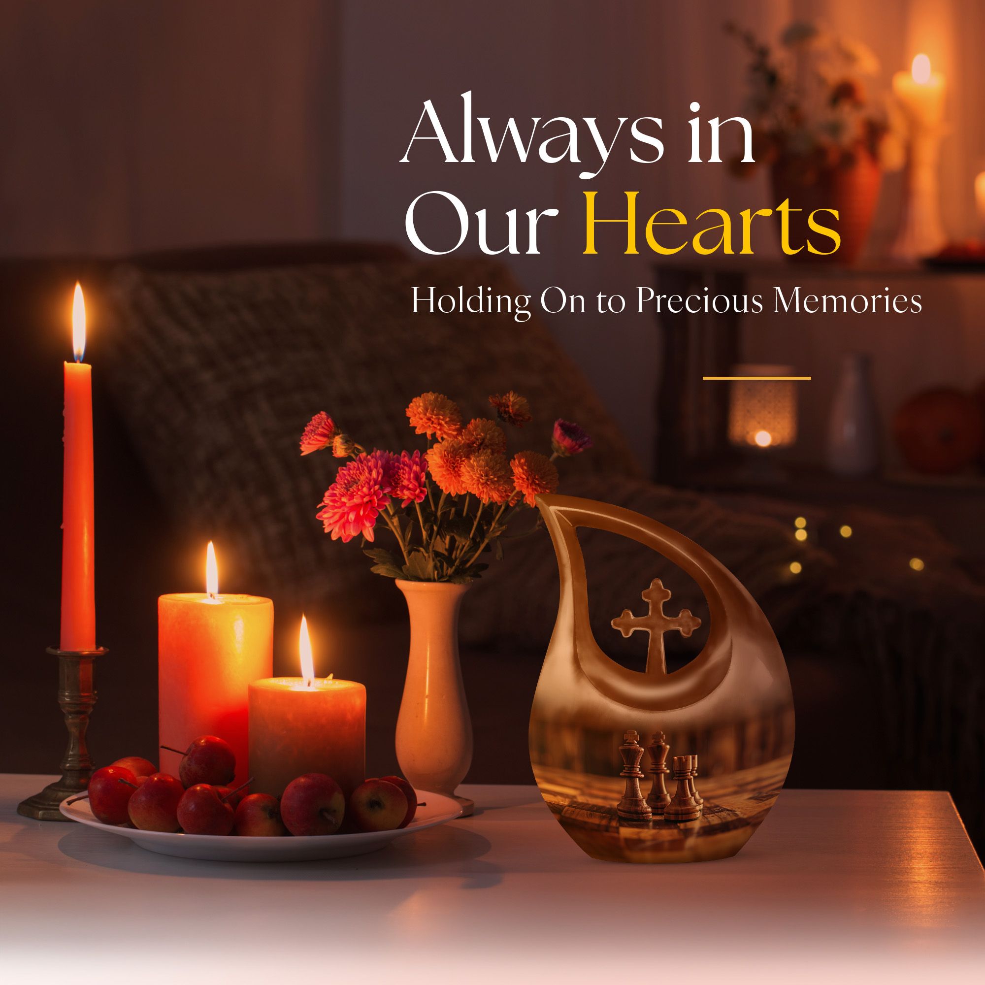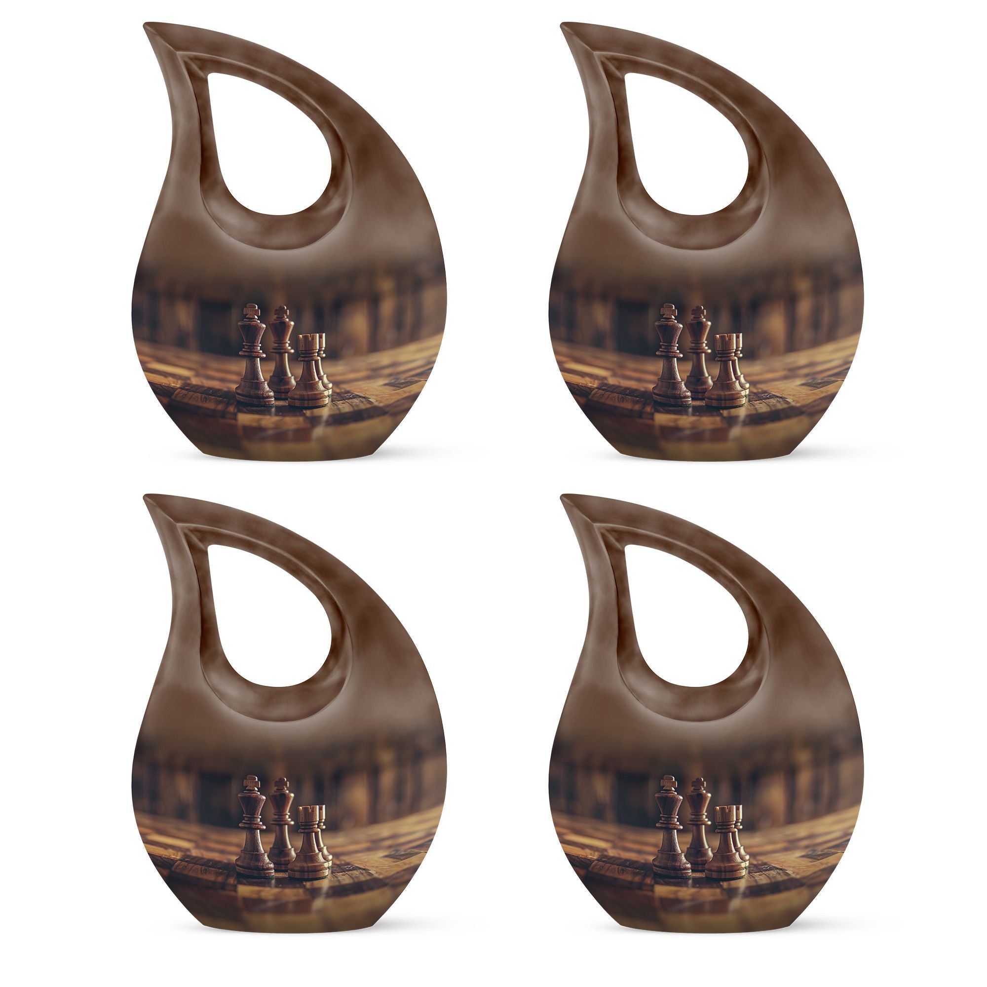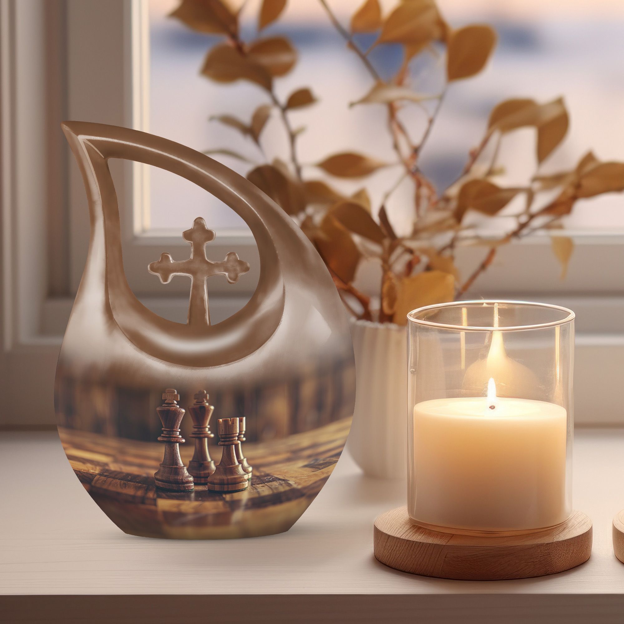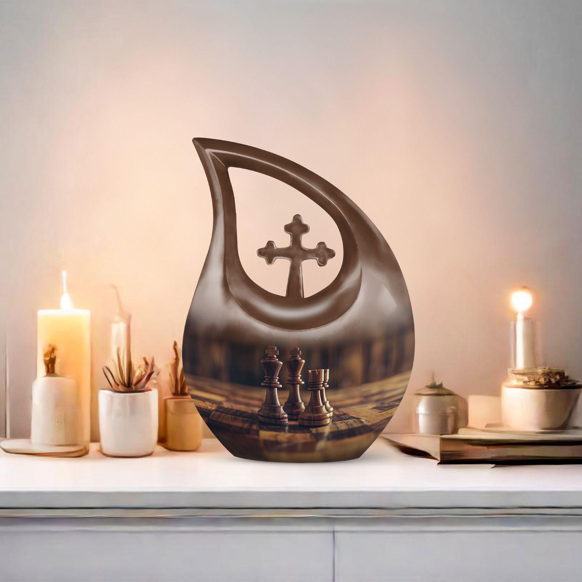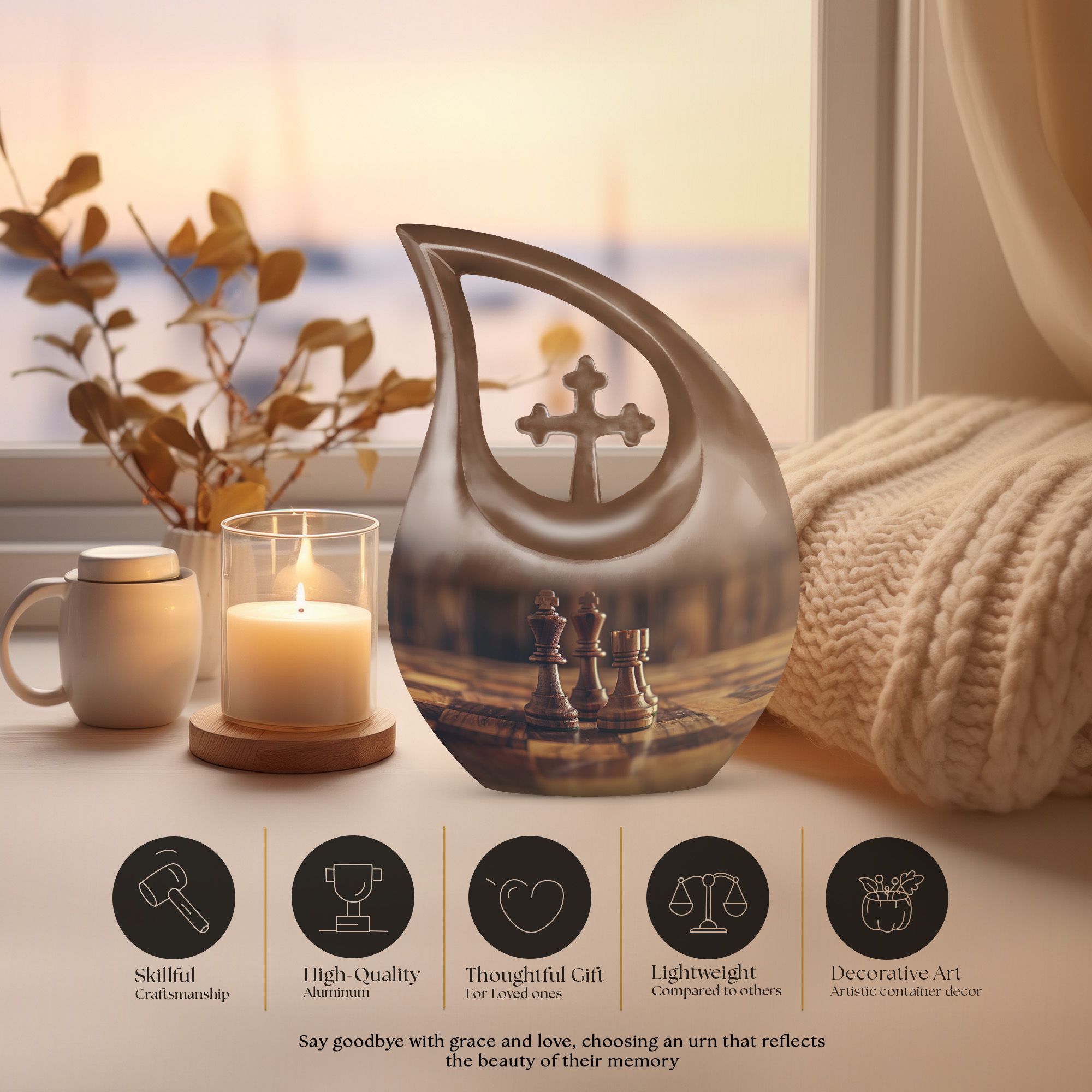 Honor your departed loved one with the Cross Drop Chess Urn, a uniquely styled memorial urn curated with elements of the cherished game. Crafted from premium-grade aluminum, this 10-inch urn is meticulously fashioned to exude subtle sophistication while serving as a trusted vessel for cremation ashes. Its striking physical features - painting a rich picture of dignity and tranquility - make it an ideal choice as a cool urn for memorial needs. The urn's substantial capacity can comfortably hold up to 200 cubic inches of ashes, denoting a fitting tribute to the memories of your dear one. This product lends a personalized touch with the possibility of engraving names. The urn is easily insertable and secured using the accompanying velvet pouch, serving a thoughtful solution for treasured keepsakes. Despite its high quality, it remains an affordable urn with a weight of 3.3 pounds, proving manageable and transportable when needed. Also notable as a companion urn for humans ashes, its uniqueness shines within your interior space, effortlessly catching glimpses with its large size and chess theme. The item also stands out as a perfect choice among memorial urns for human ashes.