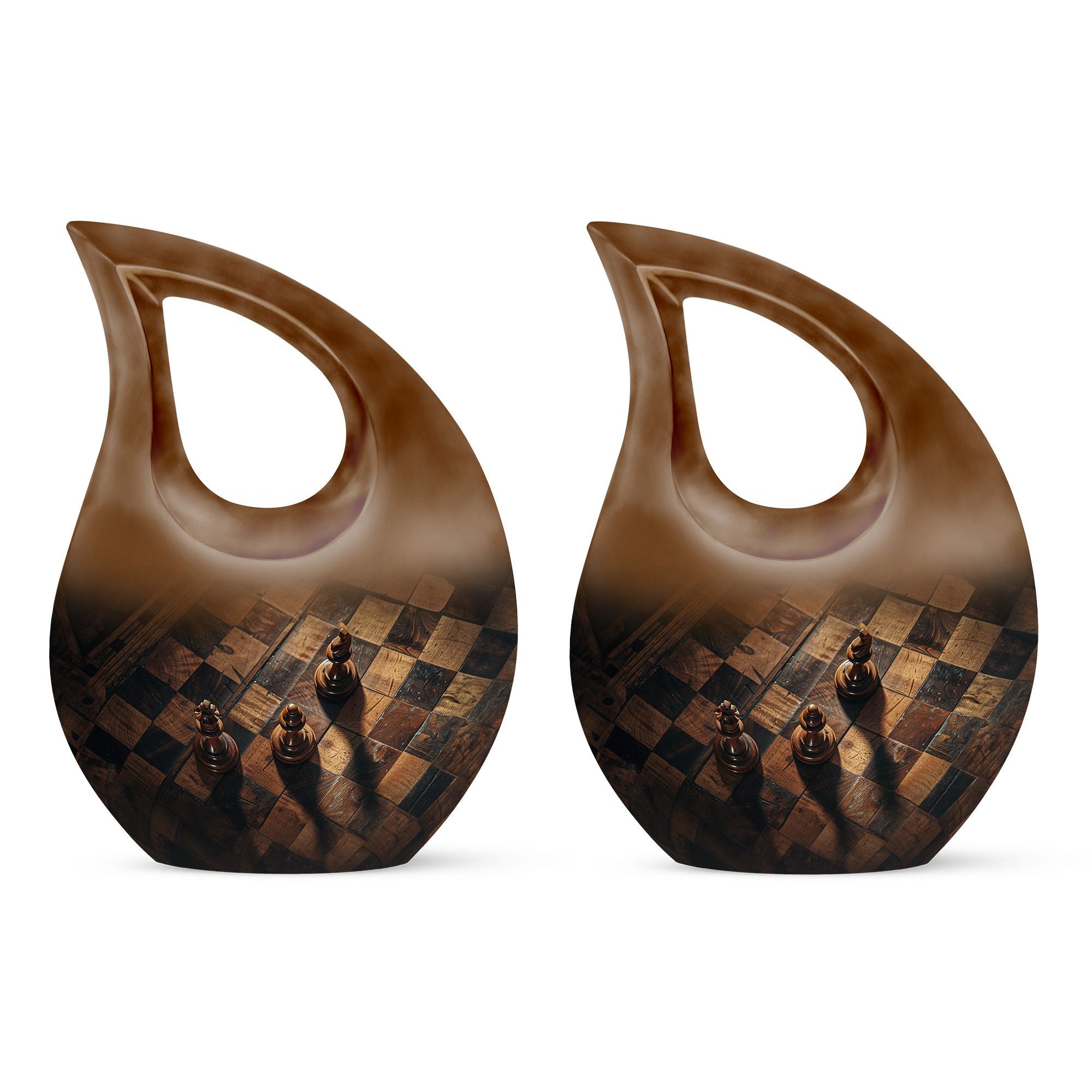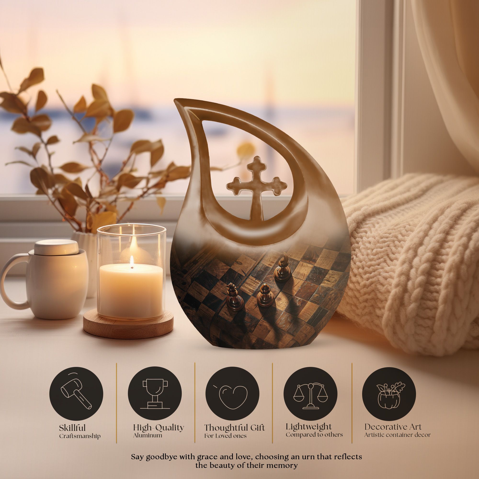 Embrace the serene comfort of our Chess Urn, an exquisite all faith funeral urn crafted from robust aluminium. Sporting a distinctive Chess theme, this urn pairs an emotionally resonant Cross Drop motif with a full capacity of 200 cubic inches, large enough to hold the remains of your loved ones. Measuring 10 inches in height and weighing a solid 3.3 pounds, this urn is designed for longevity, subtly signaling a substantial and ever-present tribute. To add to its intimate appeal, you can personalize the urn with engraved names, making it a unique memorial item. The package also includes a delicate velvet pouch for containment of ashes, ensuring that the essence of those you cherish is safely nestled. People searching for words like 'Chess Urn,' 'all faith funeral urn,' 'memorial urns,' ‘small urn,' 'miniature urns,' 'custom cremation urns,' or 'funeral urns for adults' might find this product perfectly suited to their needs.