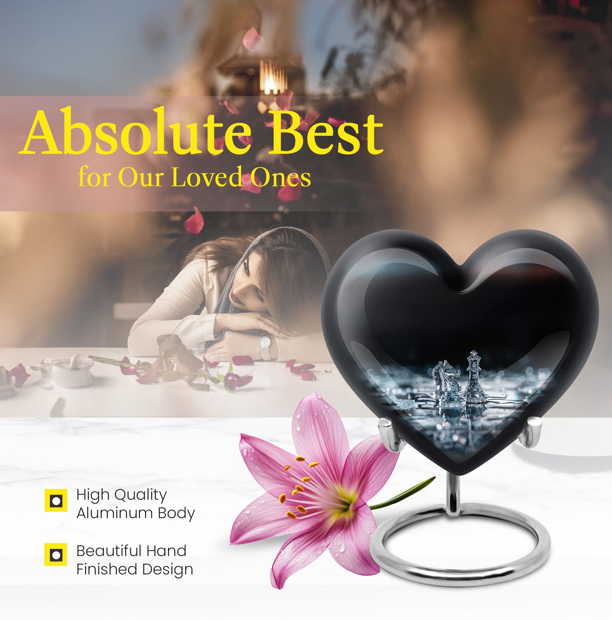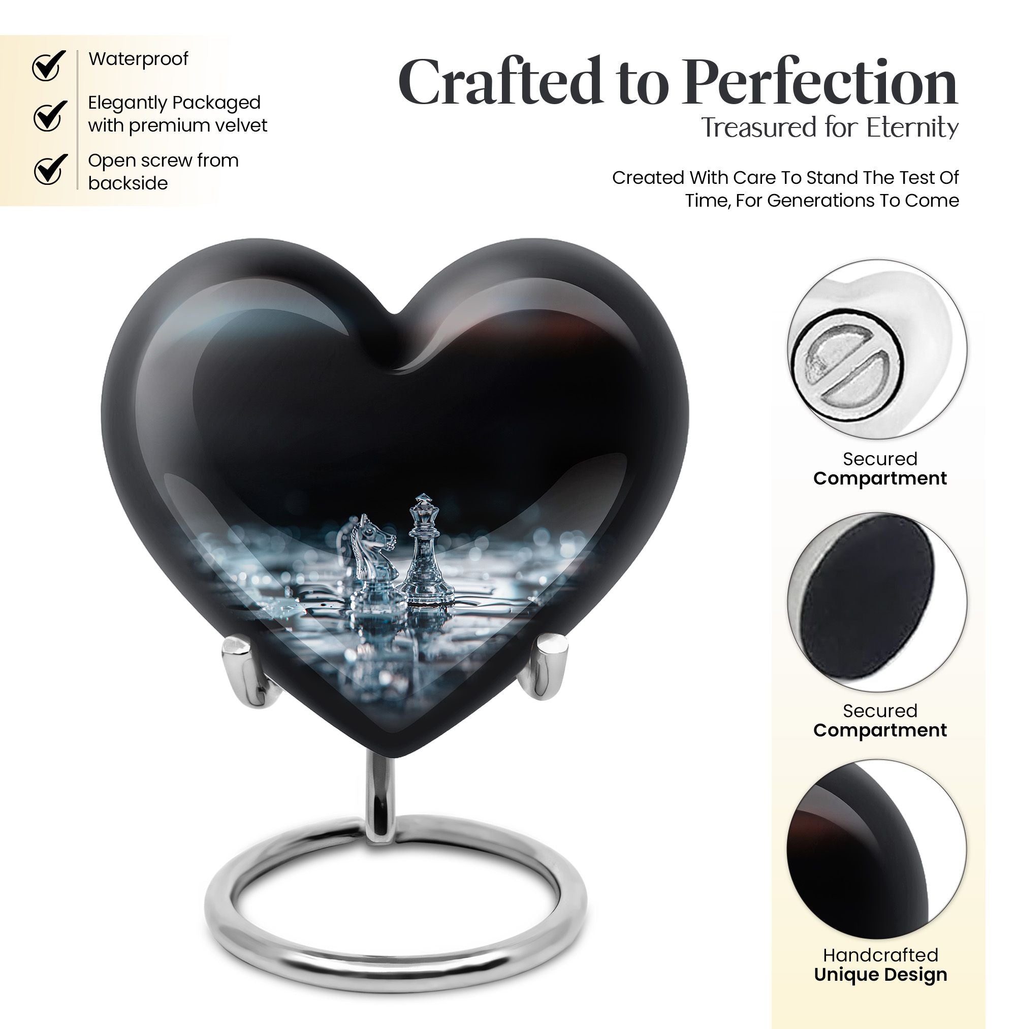 Introducing our distinctly crafted Chess Urn, a touching tribute to commemorate your loved one's memory. This large, 10-inch memorial urn for women's ashes blends functionality and sentimentality in a unique design - the Heart Urn. Its substantial size, weighing 3.3 pounds and measuring 10 inches in height, affords a generous capacity of 200 cubic inches. Crafted from high-quality aluminum, this cremation urn ensures longevity while delivering an aesthetically pleasing display. The package includes a velvet pouch, providing a dignified containment for the ashes. Adding a more personal touch, this urn can be customized with engraved names, manifesting a bespoke memorial. Catering to a woman's spirit, our Chess Urn signifies a tasteful and heartfelt way to remember and honor a departed loved one. Its simple yet elegant design fits perfectly for ground burial or as a keepsake. With uncommon terms like 'metal urns for human ashes adult female' or 'Urn for Ground Burial', your search could yield similar urns, but none as unique and personal as our Chess Urn.