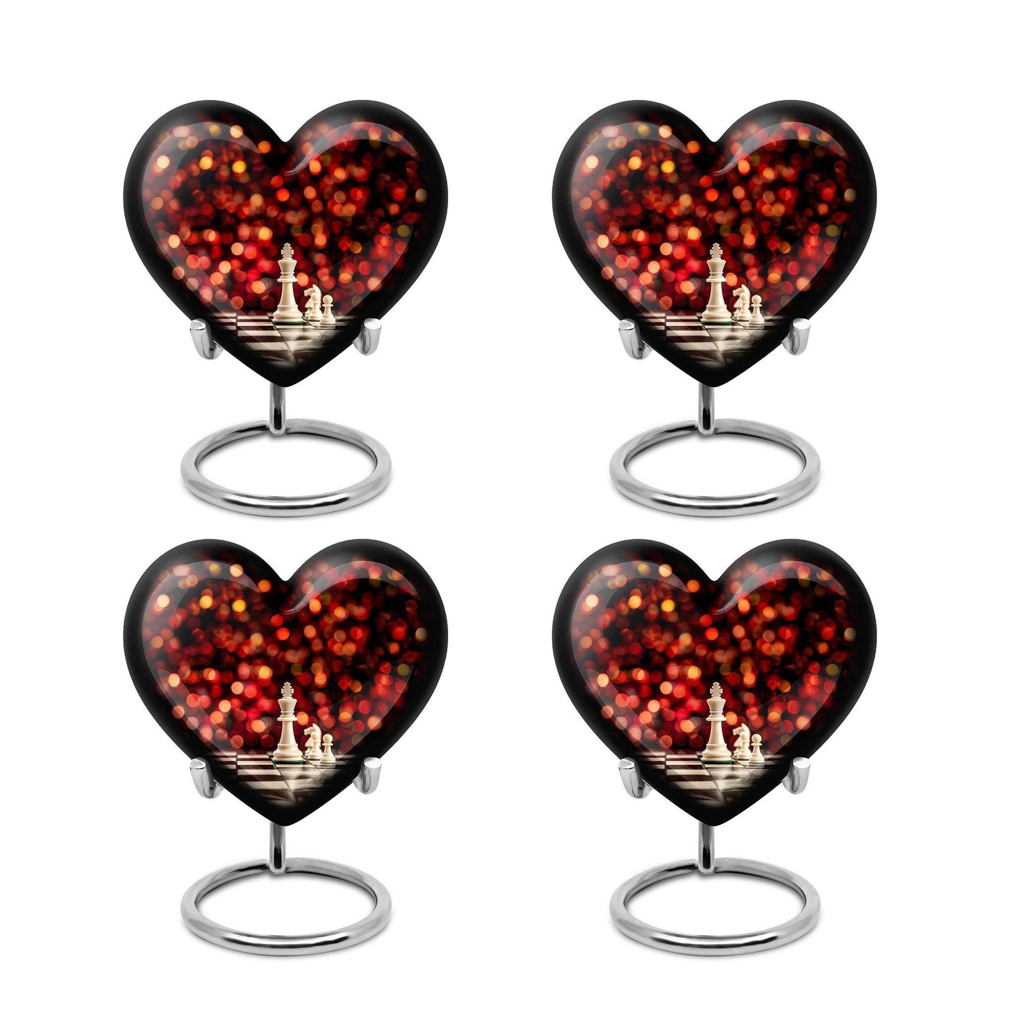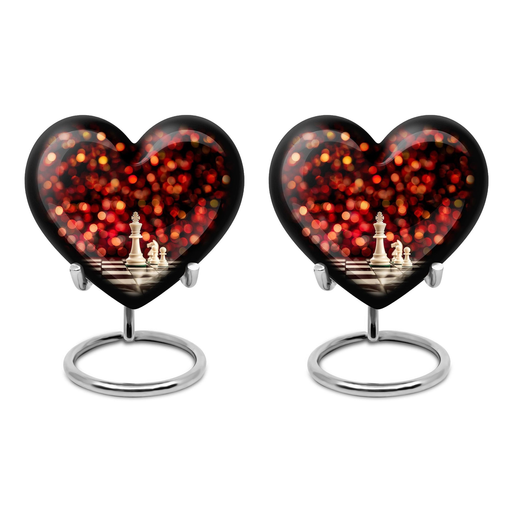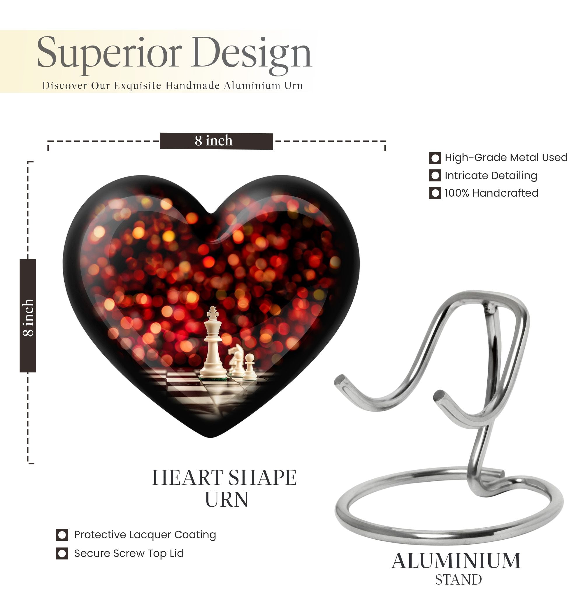 Unveiling our Chess Urn, a one-of-a-kind expression of homage combining the time-honored game's intellectual charm with a heartfelt commemoration for your beloved adult male. This large urn, handcrafted from resilient aluminium, ensures durability, while its impressive 10-inch dimension and 200 cubic inches capacity tender ample space for ashes. This cremation urn, weighing a solid 3.3 pounds, comes with a plush velvet pouch, providing added protection and reverence for the cherished remains. The considerable size and sturdy build make it ideal for both men and women's ashes and adhere to common requirements for burial urns, ensuring it can be used for stowing the ashes in the ground. Our Chess Urn also allows you to further personalize it by engraving names, making your tribute to the departed even more poignant and unique. The distinguished Chess motif instills a unique aura of remembrance, making it a fitting pick in the memorial urns category. Note: Design element not mentioned. Please consult directly for any queries related this aspect.