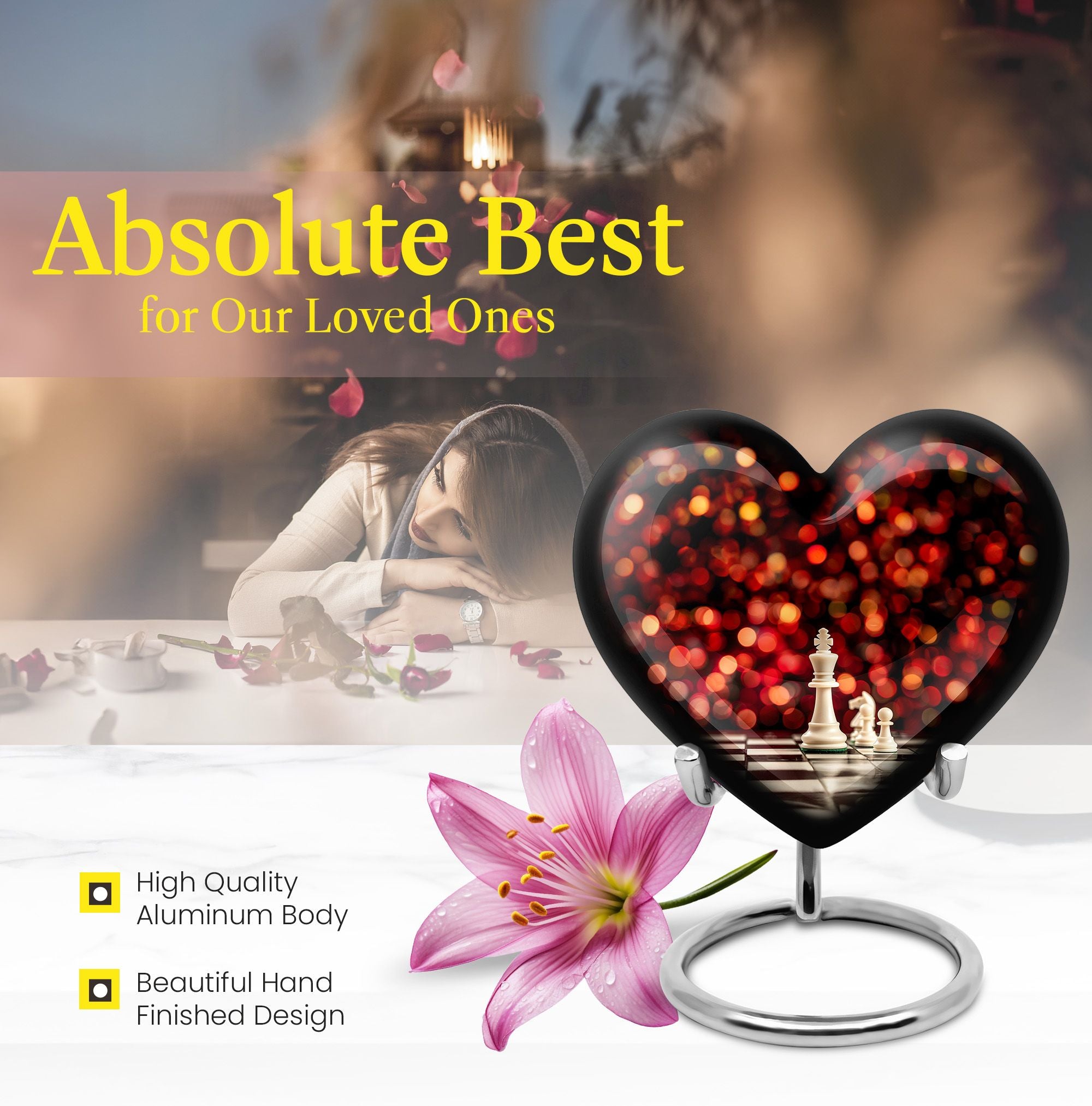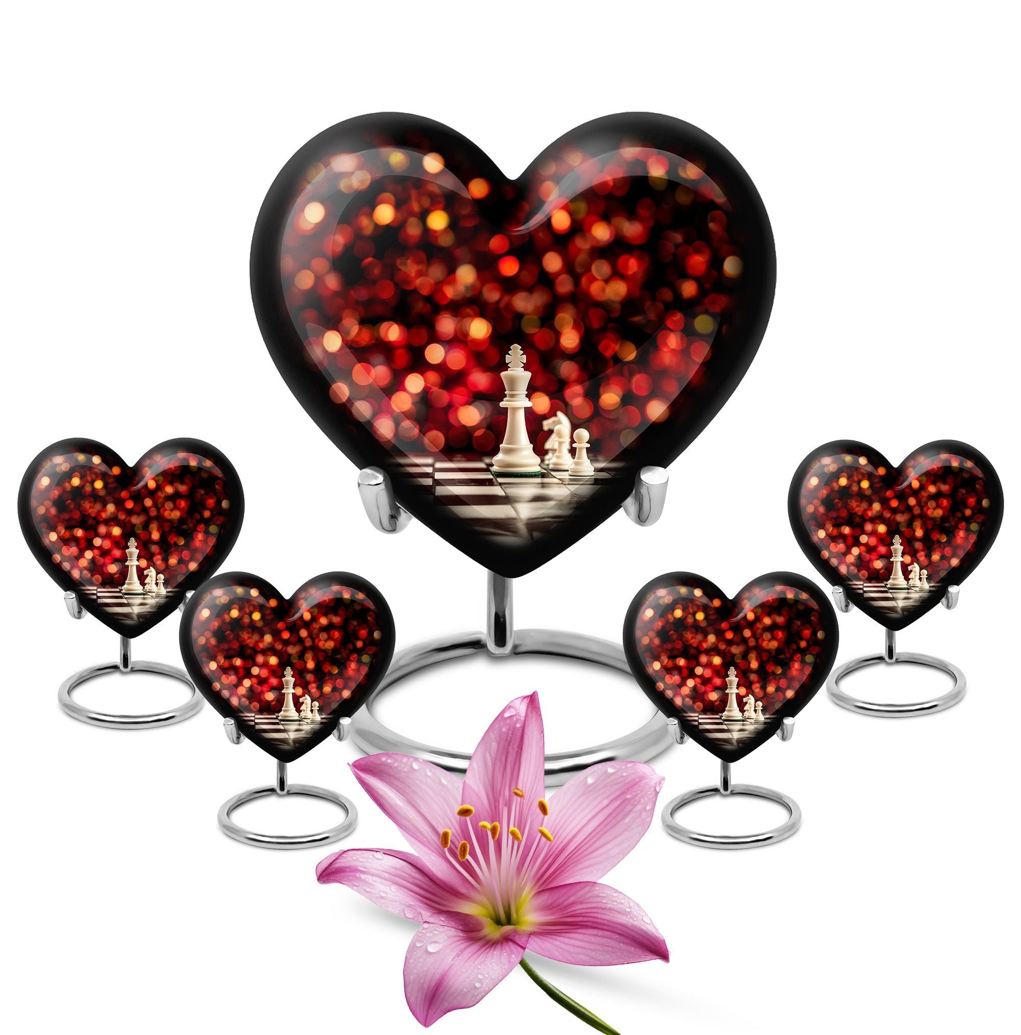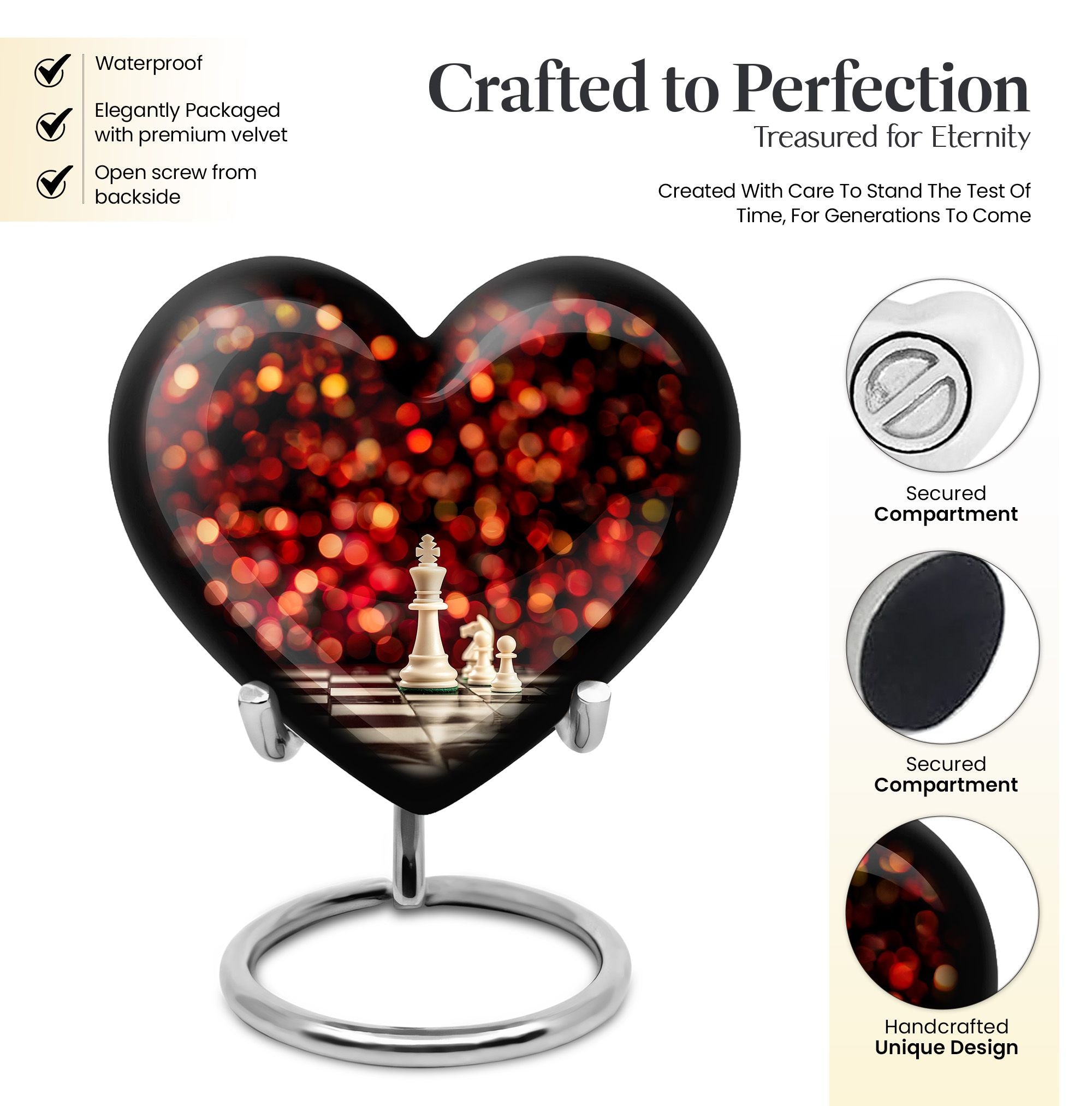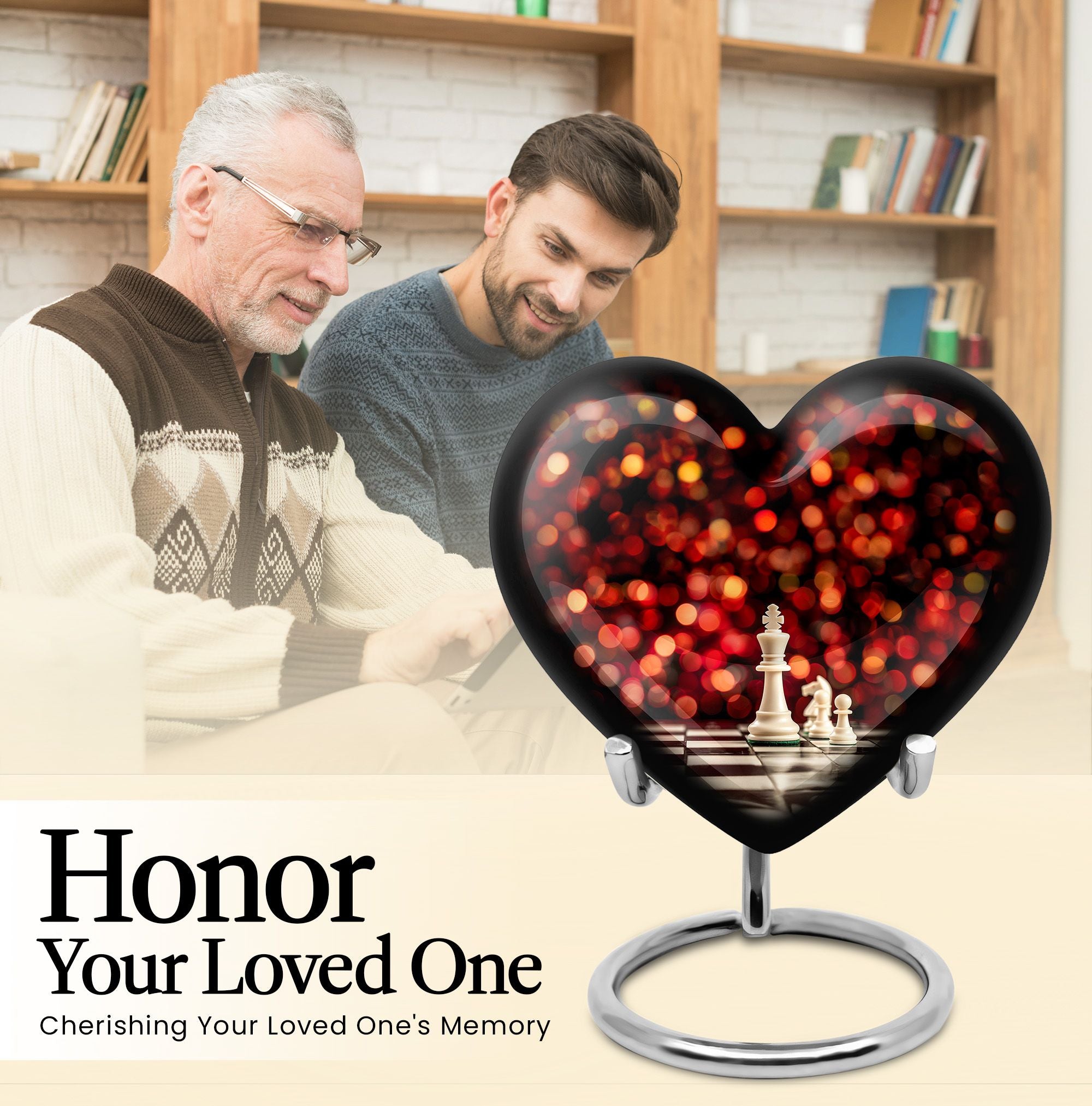 Unveiling our Chess Urn, a one-of-a-kind expression of homage combining the time-honored game's intellectual charm with a heartfelt commemoration for your beloved adult male. This large urn, handcrafted from resilient aluminium, ensures durability, while its impressive 10-inch dimension and 200 cubic inches capacity tender ample space for ashes. This cremation urn, weighing a solid 3.3 pounds, comes with a plush velvet pouch, providing added protection and reverence for the cherished remains. The considerable size and sturdy build make it ideal for both men and women's ashes and adhere to common requirements for burial urns, ensuring it can be used for stowing the ashes in the ground. Our Chess Urn also allows you to further personalize it by engraving names, making your tribute to the departed even more poignant and unique. The distinguished Chess motif instills a unique aura of remembrance, making it a fitting pick in the memorial urns category. Note: Design element not mentioned. Please consult directly for any queries related this aspect.