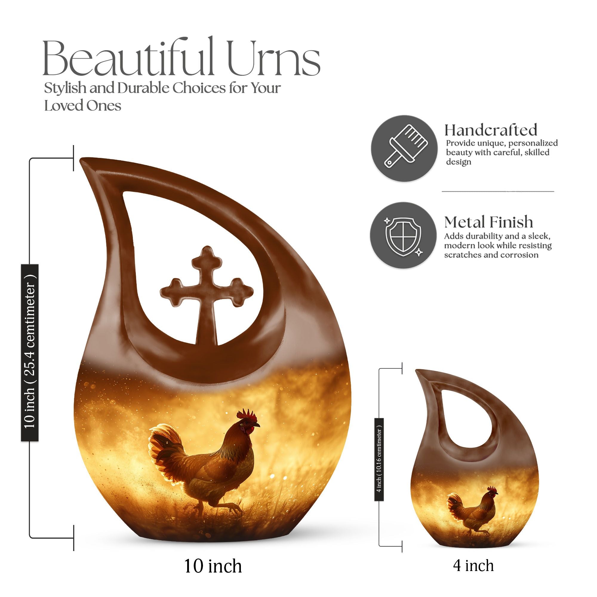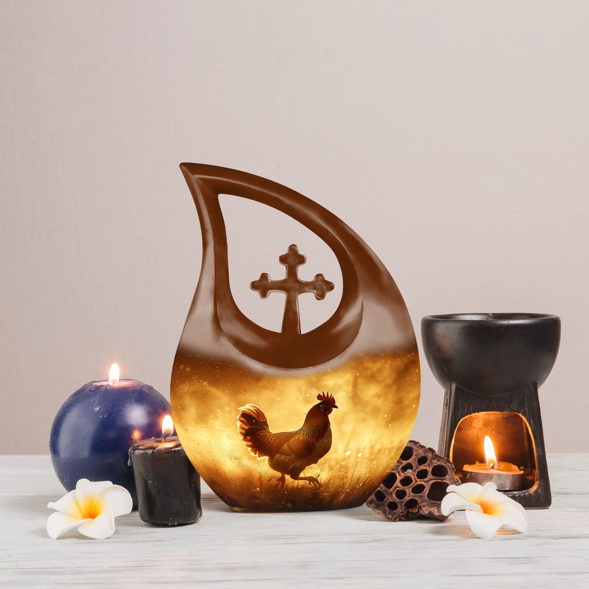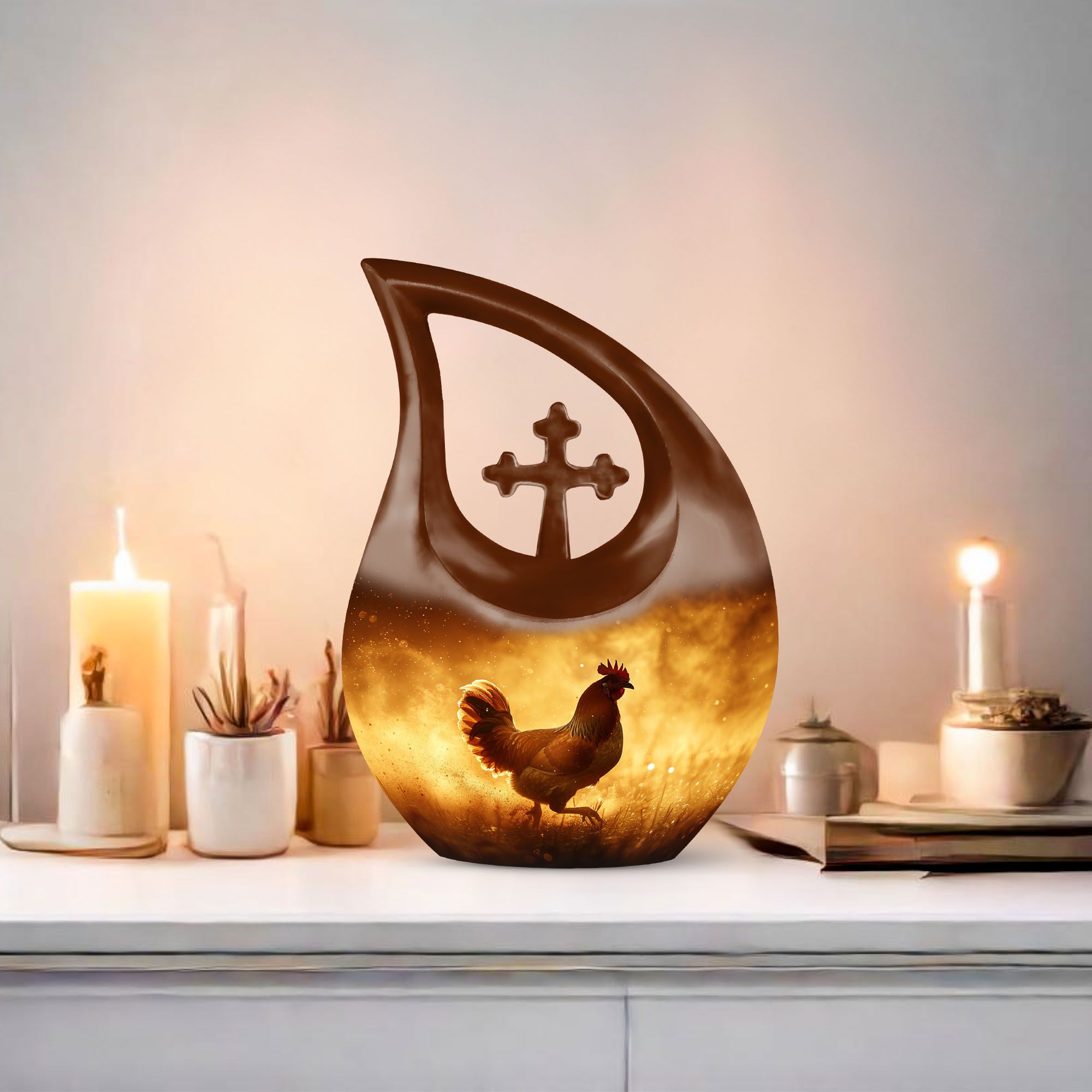 Introducing our Chicken Urn in Cross Drop theme, a sentimental keepsake designed to bring peace and comfort, while fitting seamlessly into your home decor. Crafted meticulously from sturdy aluminium, this large urn measures 10 inches in height and a weight of 3.3 pounds, making it both durable and substantial. Our 10-inch urn is a practical and economical choice with the capacity to securely hold up to 200 cubic inches of ashes. This accent piece comes with a velvet pouch providing a soft and safe containment for your loved one's remains. Personalization is available to add an intimate touch, engrave the names of your loved ones for an enduring tribute. With our Urn, you get the rare combination of an affordable and unique memorial solution. Our product effectively captures your precious memories. Perfect for customers searching for 'large cremation urns', 'miniature urns for ashes', 'large urns for human ashes' or a 'medium urn'. Convey your enduring love with our Chicken Urn in Cross Drop theme, a respectful tribute to the times shared.