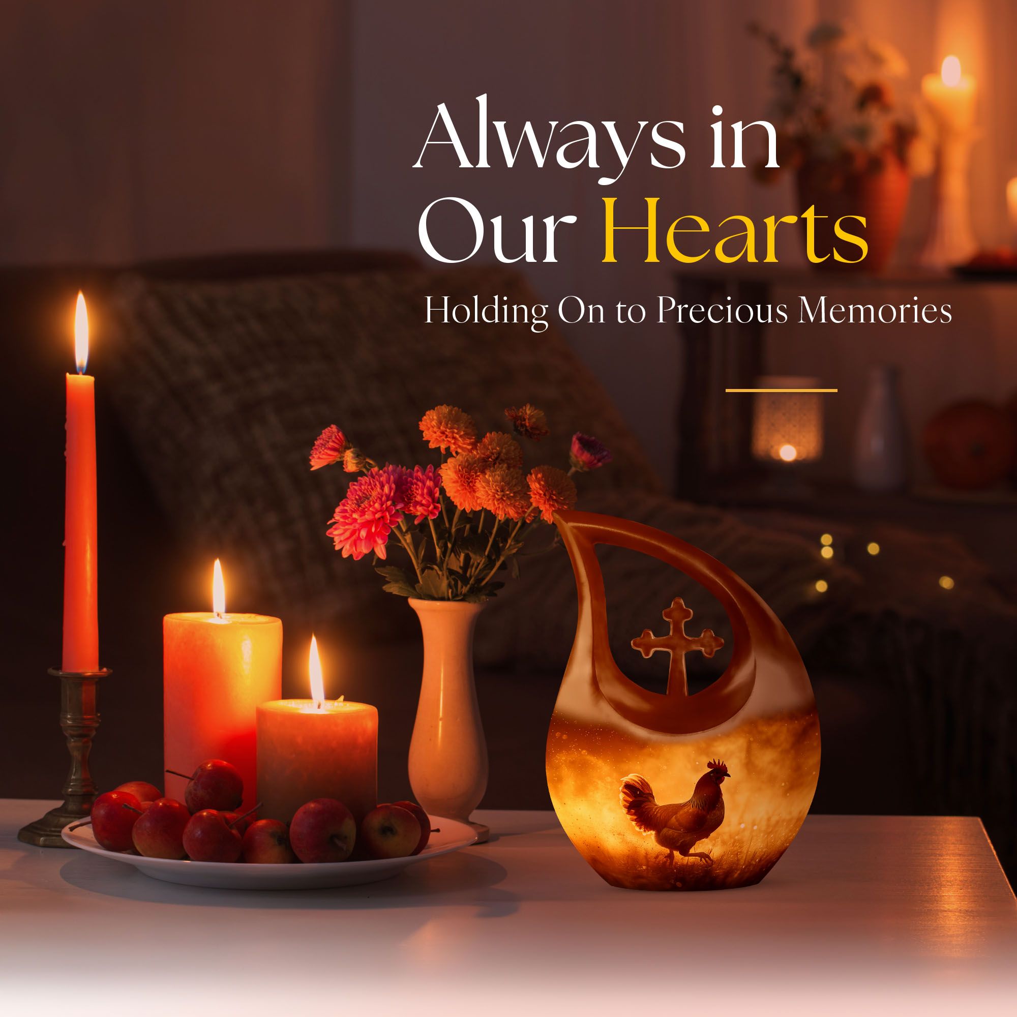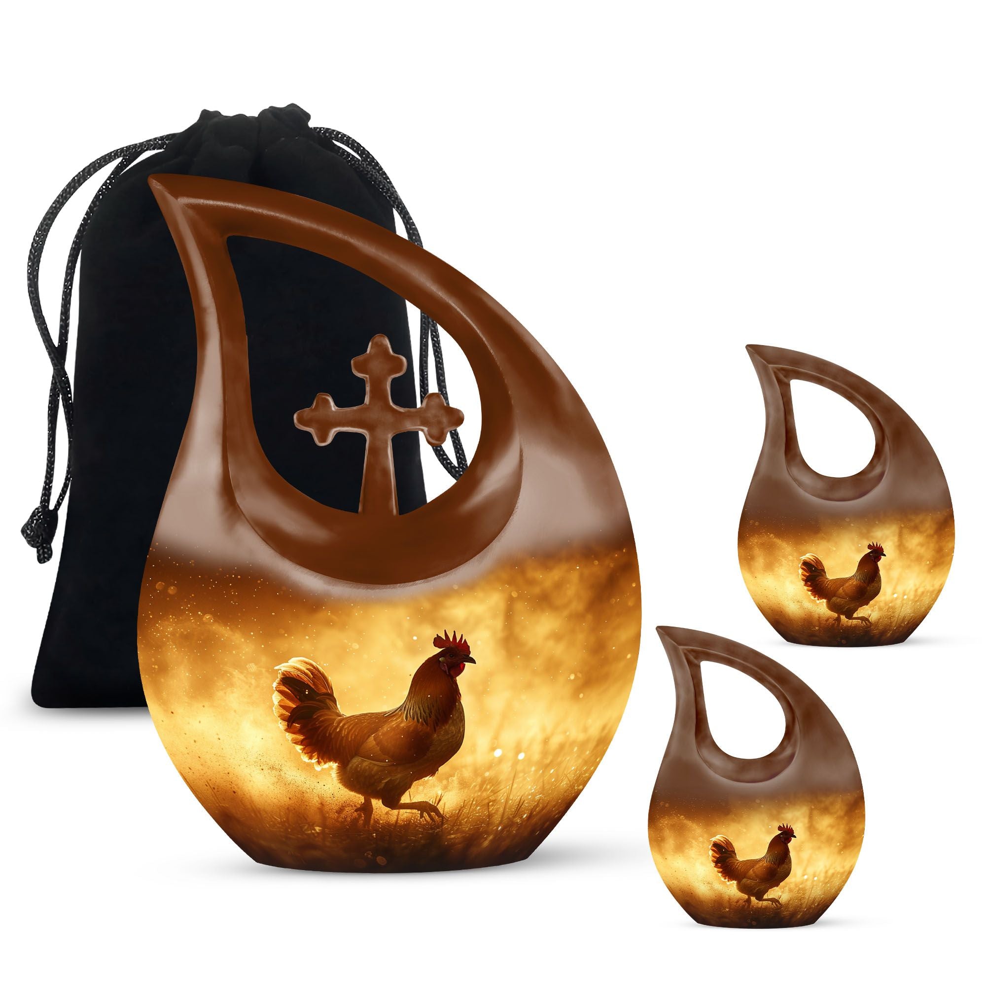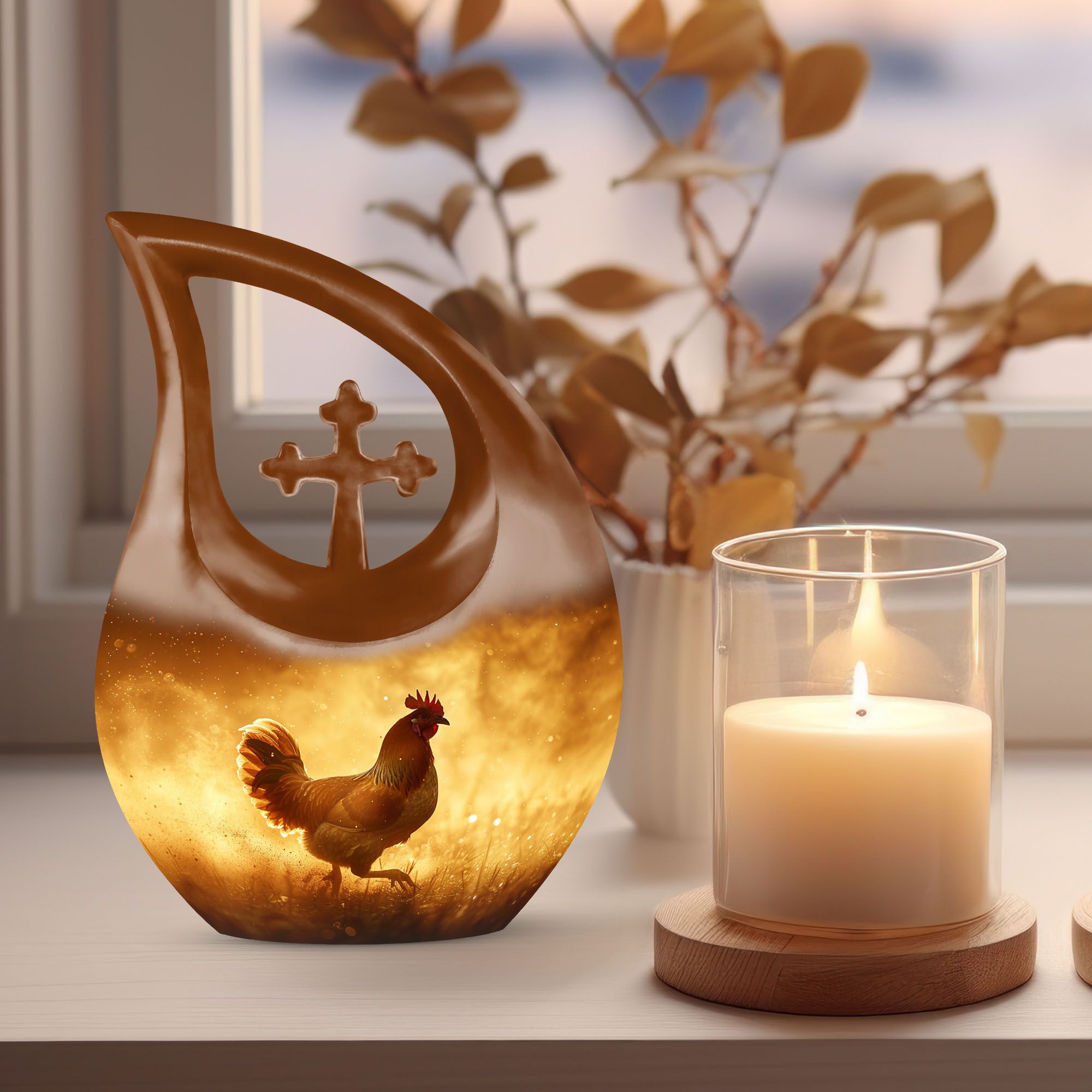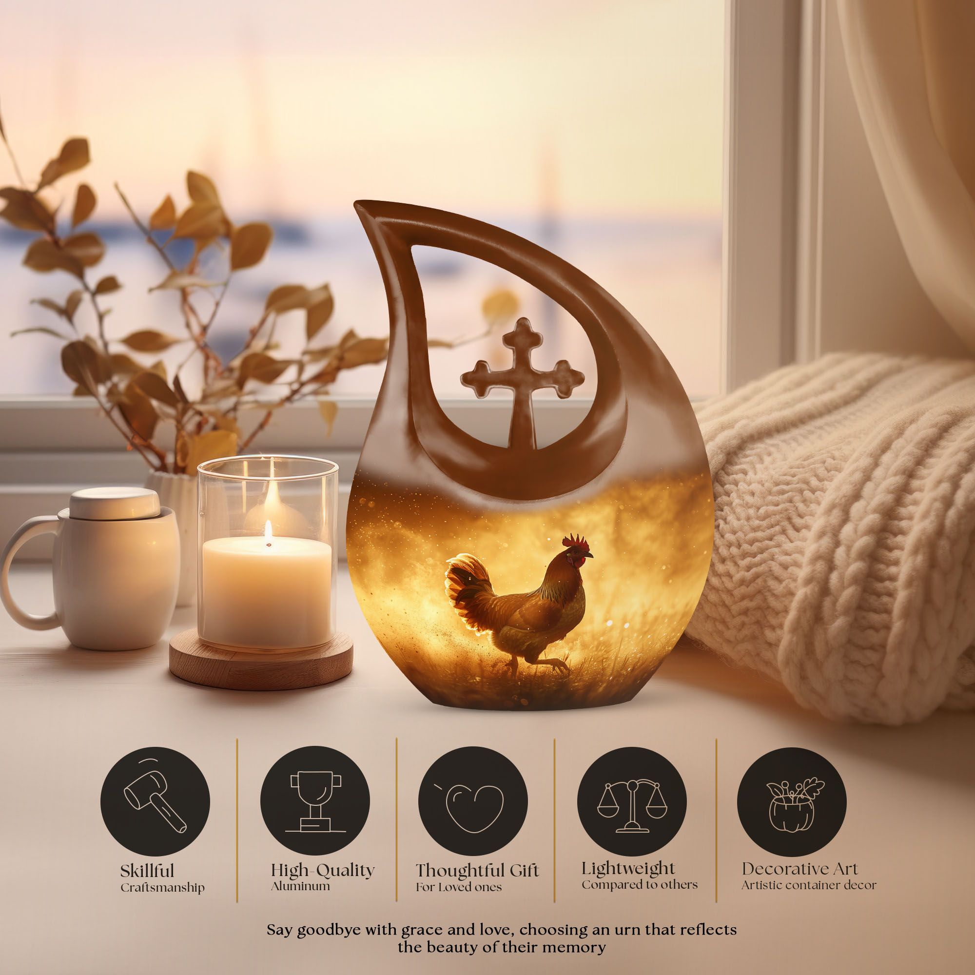 Introducing our Chicken Urn in Cross Drop theme, a sentimental keepsake designed to bring peace and comfort, while fitting seamlessly into your home decor. Crafted meticulously from sturdy aluminium, this large urn measures 10 inches in height and a weight of 3.3 pounds, making it both durable and substantial. Our 10-inch urn is a practical and economical choice with the capacity to securely hold up to 200 cubic inches of ashes. This accent piece comes with a velvet pouch providing a soft and safe containment for your loved one's remains. Personalization is available to add an intimate touch, engrave the names of your loved ones for an enduring tribute. With our Urn, you get the rare combination of an affordable and unique memorial solution. Our product effectively captures your precious memories. Perfect for customers searching for 'large cremation urns', 'miniature urns for ashes', 'large urns for human ashes' or a 'medium urn'. Convey your enduring love with our Chicken Urn in Cross Drop theme, a respectful tribute to the times shared.