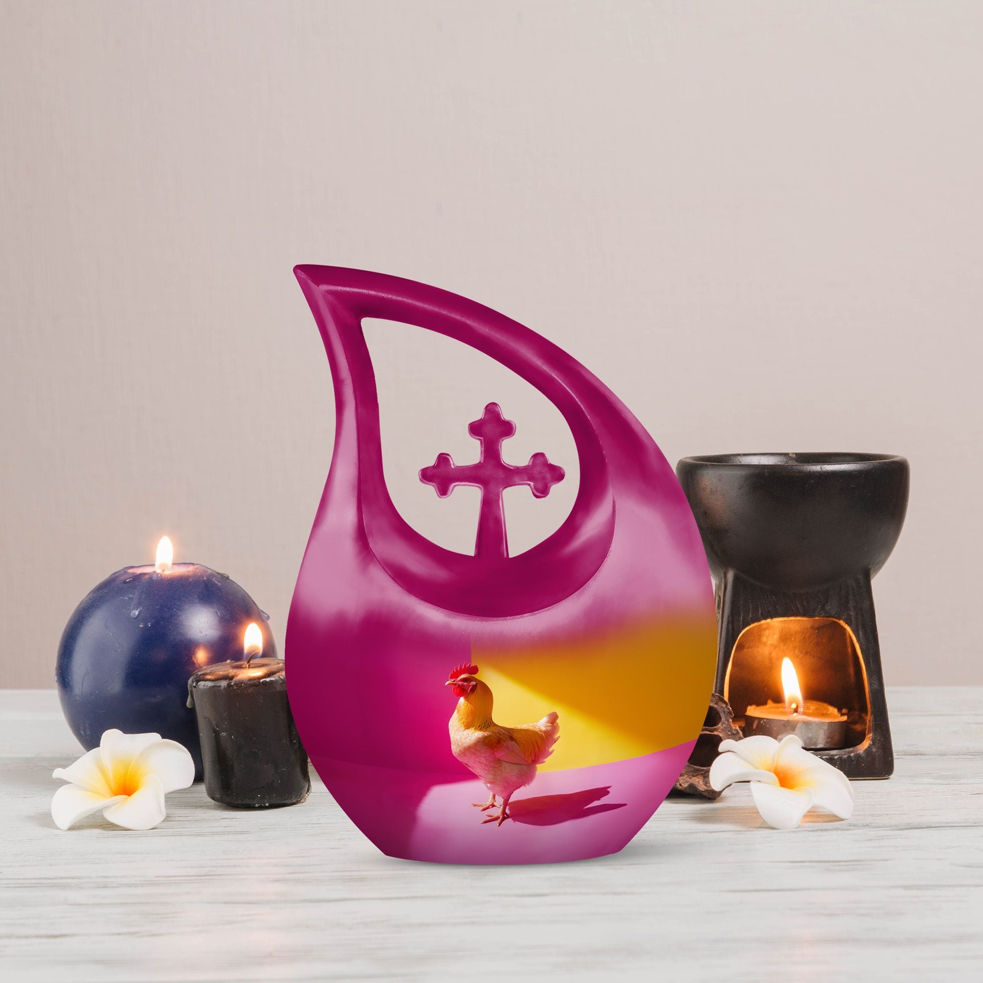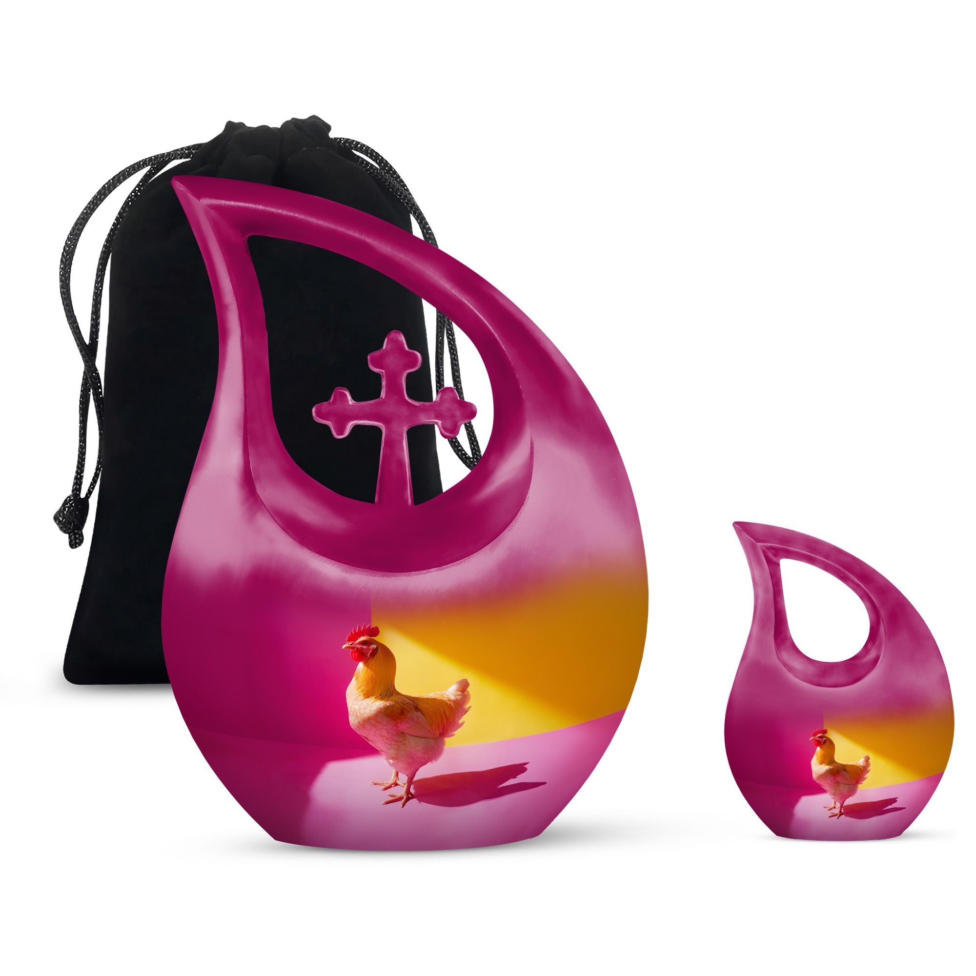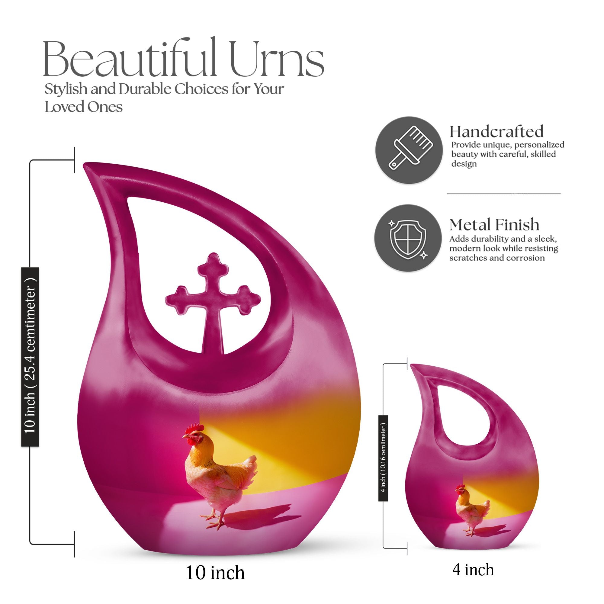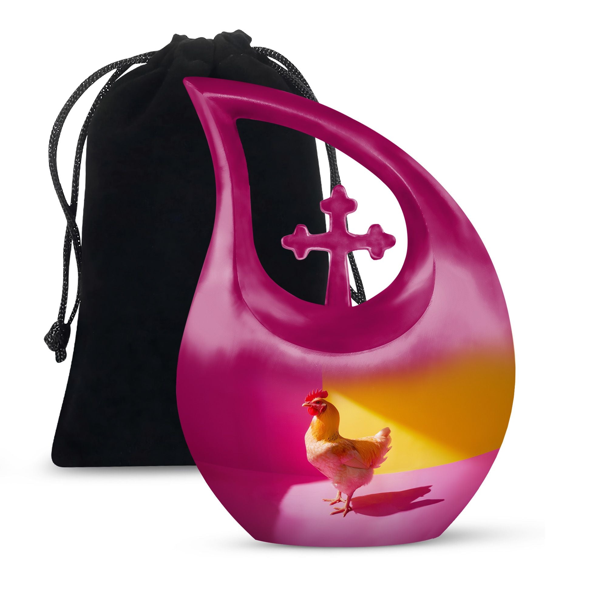 Unearth a cherished route to remember your loved ones with our Chromatic Chicken Contrast Urn. This sizeable 10-inch Aluminium urn, weighing 3.3 pounds, amalgamates both durability and grandeur. Its magnificent Cross Drop theme exhibits a blend of traditionality and modernity, emphasizing its unique and outstanding coruscating design. Not only is this cremation box remarkably composed, but also it significantly holds a capacity of 200 cubic inches, sufficient to contain substantial ashes of beloved adults. The package includes a soft velvet pouch that modestly and securely contains the corresponding ashes, subtly respecting your sentiments. Furthermore, make this urn a truly unique memory with our customization option to personalize it with engraved names, embracing the dear bond you shared. Distinguished as a fitting choice among memorial urns, our urn perfectly serves as a companion urn for two adults or as an individual urn, creating a timeless tribute. Noted for affordability without compromising quality, it's an ideal choice for those seeking inexpensive urns with an overflow of warmth and honor. This urn stands as a beacon of comfort, love, and remembrance.