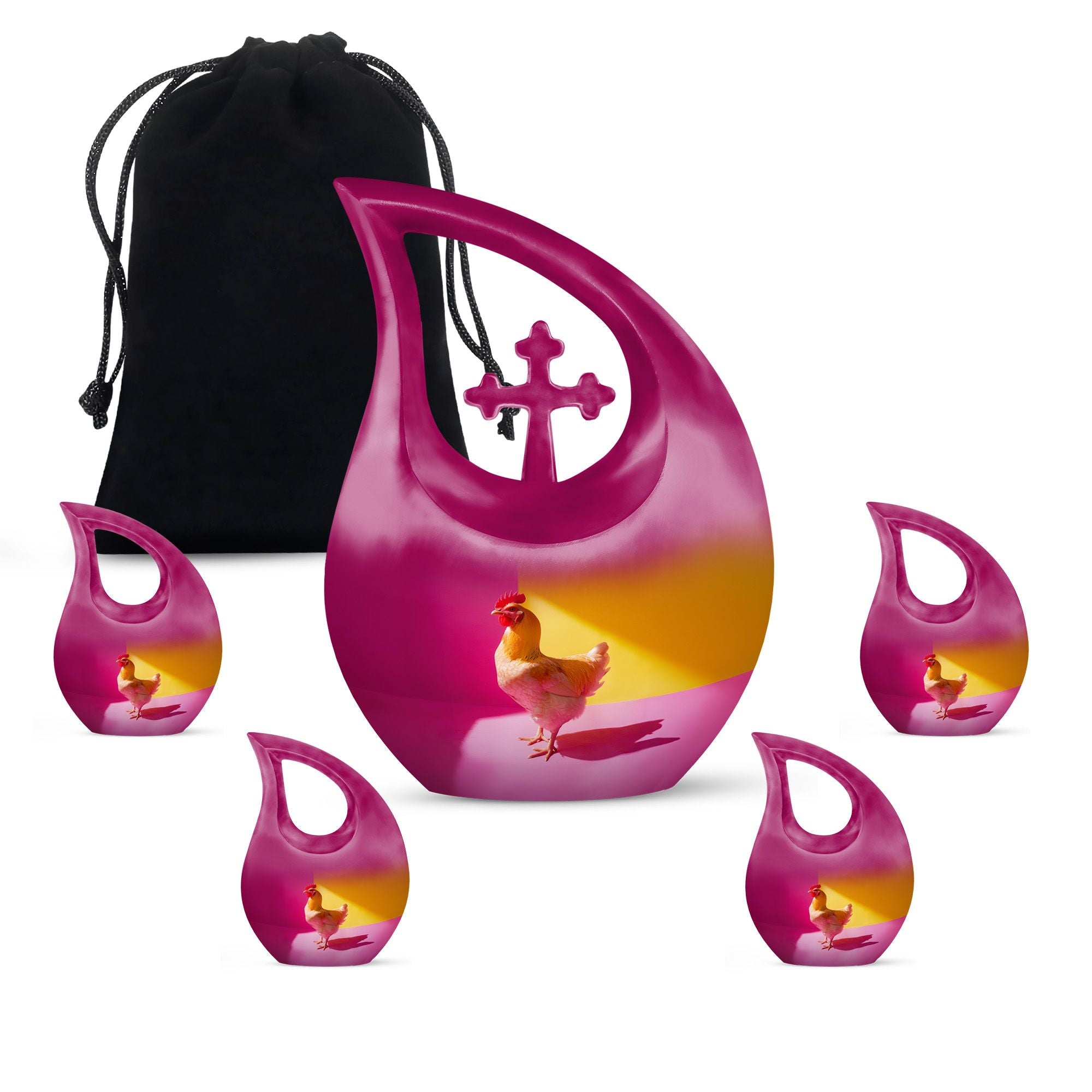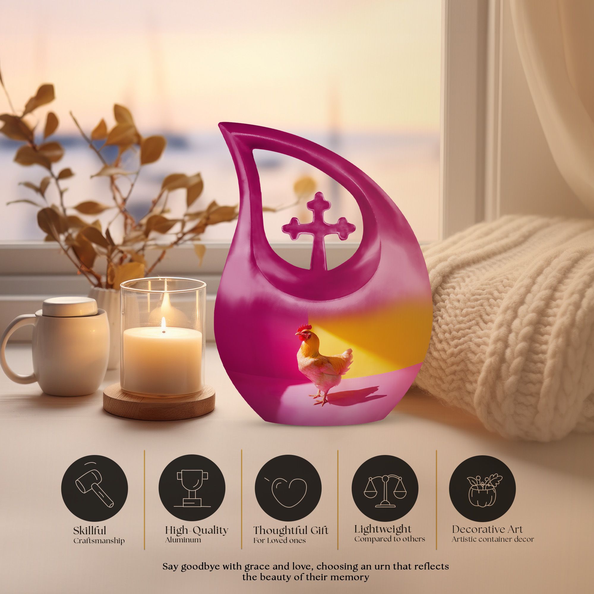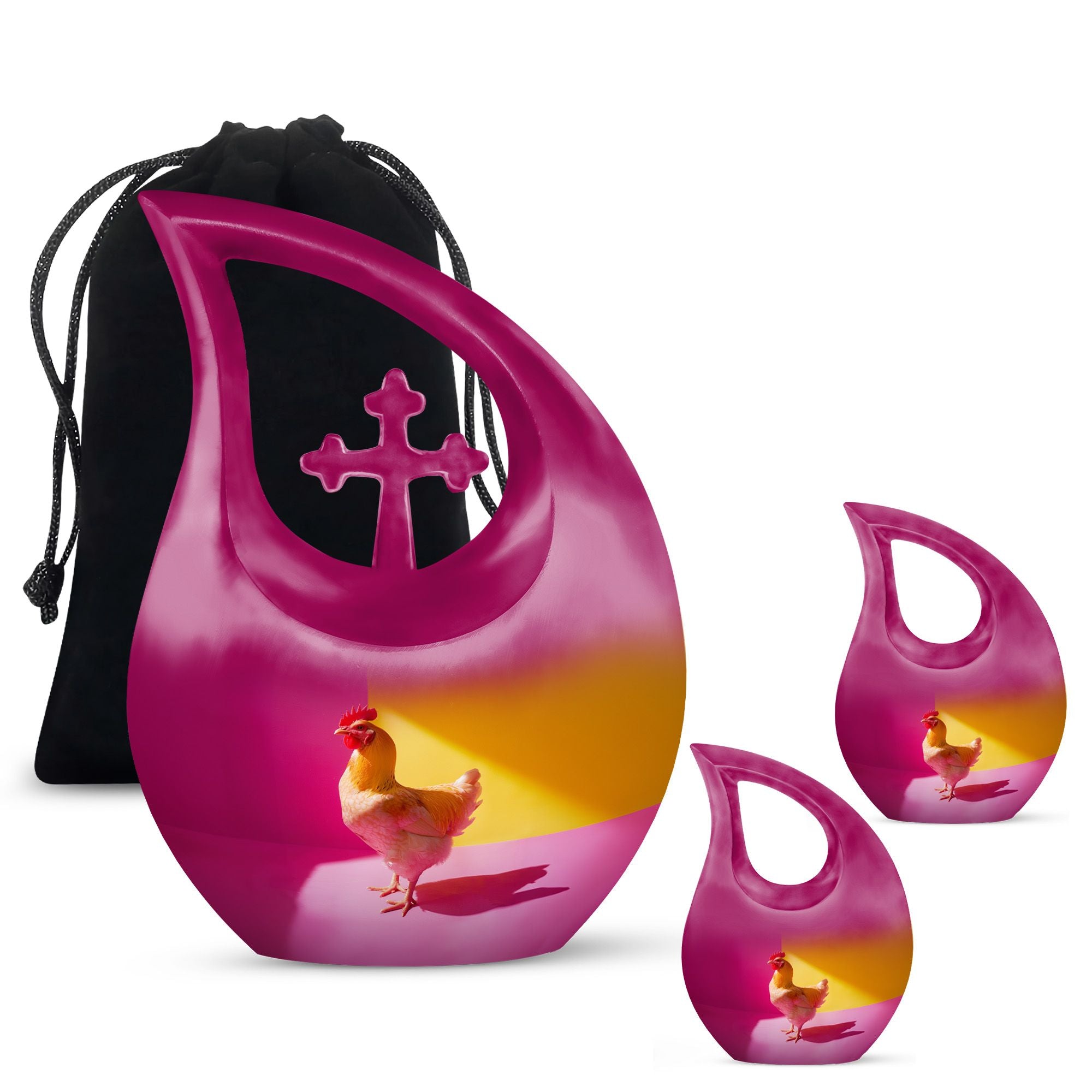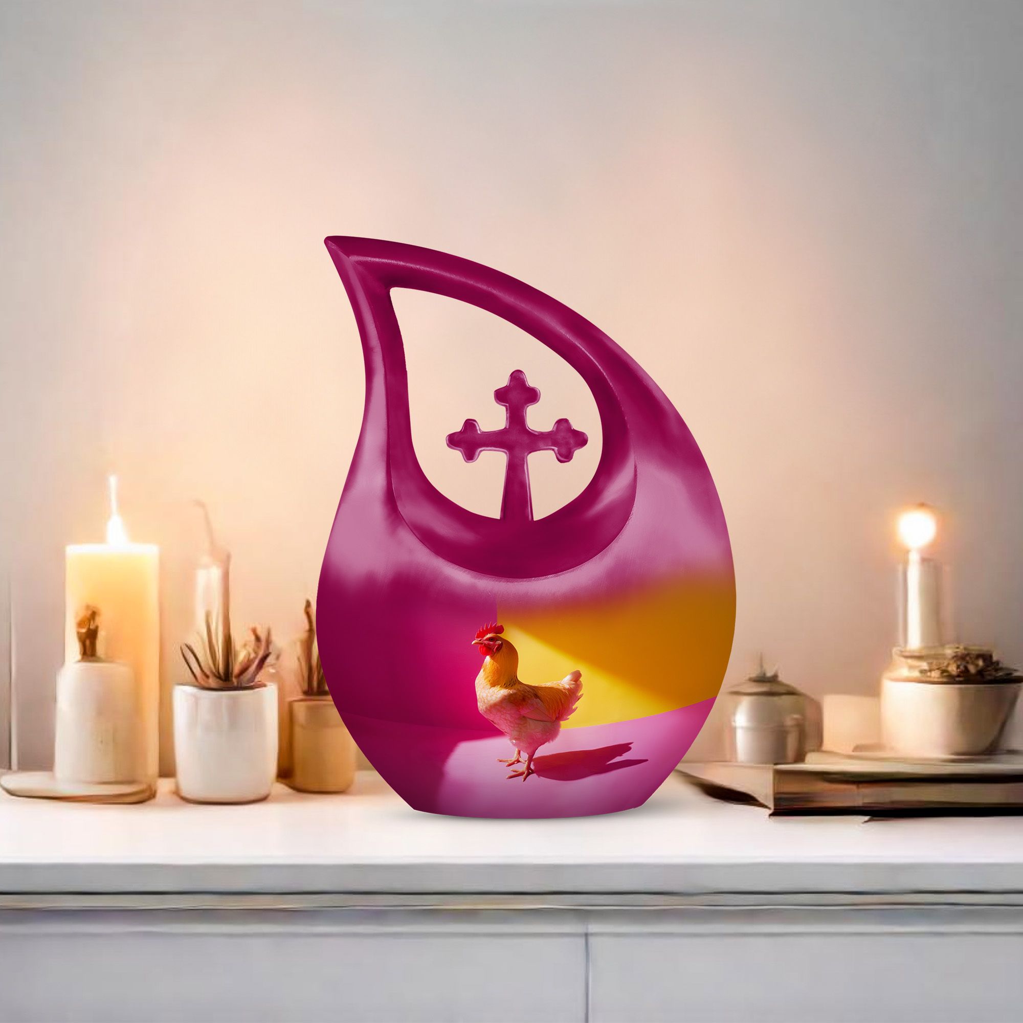 Unearth a cherished route to remember your loved ones with our Chromatic Chicken Contrast Urn. This sizeable 10-inch Aluminium urn, weighing 3.3 pounds, amalgamates both durability and grandeur. Its magnificent Cross Drop theme exhibits a blend of traditionality and modernity, emphasizing its unique and outstanding coruscating design. Not only is this cremation box remarkably composed, but also it significantly holds a capacity of 200 cubic inches, sufficient to contain substantial ashes of beloved adults. The package includes a soft velvet pouch that modestly and securely contains the corresponding ashes, subtly respecting your sentiments. Furthermore, make this urn a truly unique memory with our customization option to personalize it with engraved names, embracing the dear bond you shared. Distinguished as a fitting choice among memorial urns, our urn perfectly serves as a companion urn for two adults or as an individual urn, creating a timeless tribute. Noted for affordability without compromising quality, it's an ideal choice for those seeking inexpensive urns with an overflow of warmth and honor. This urn stands as a beacon of comfort, love, and remembrance.