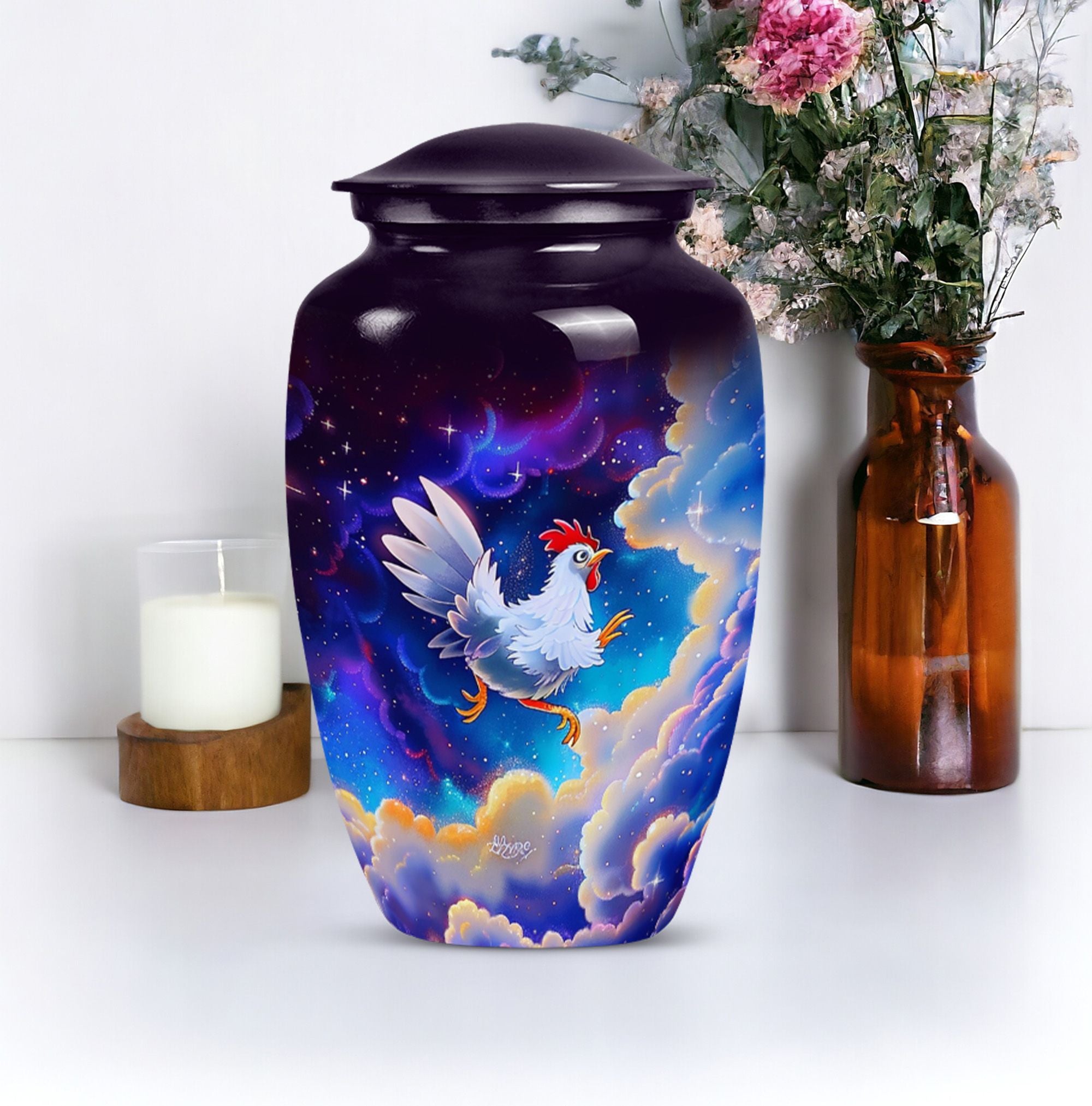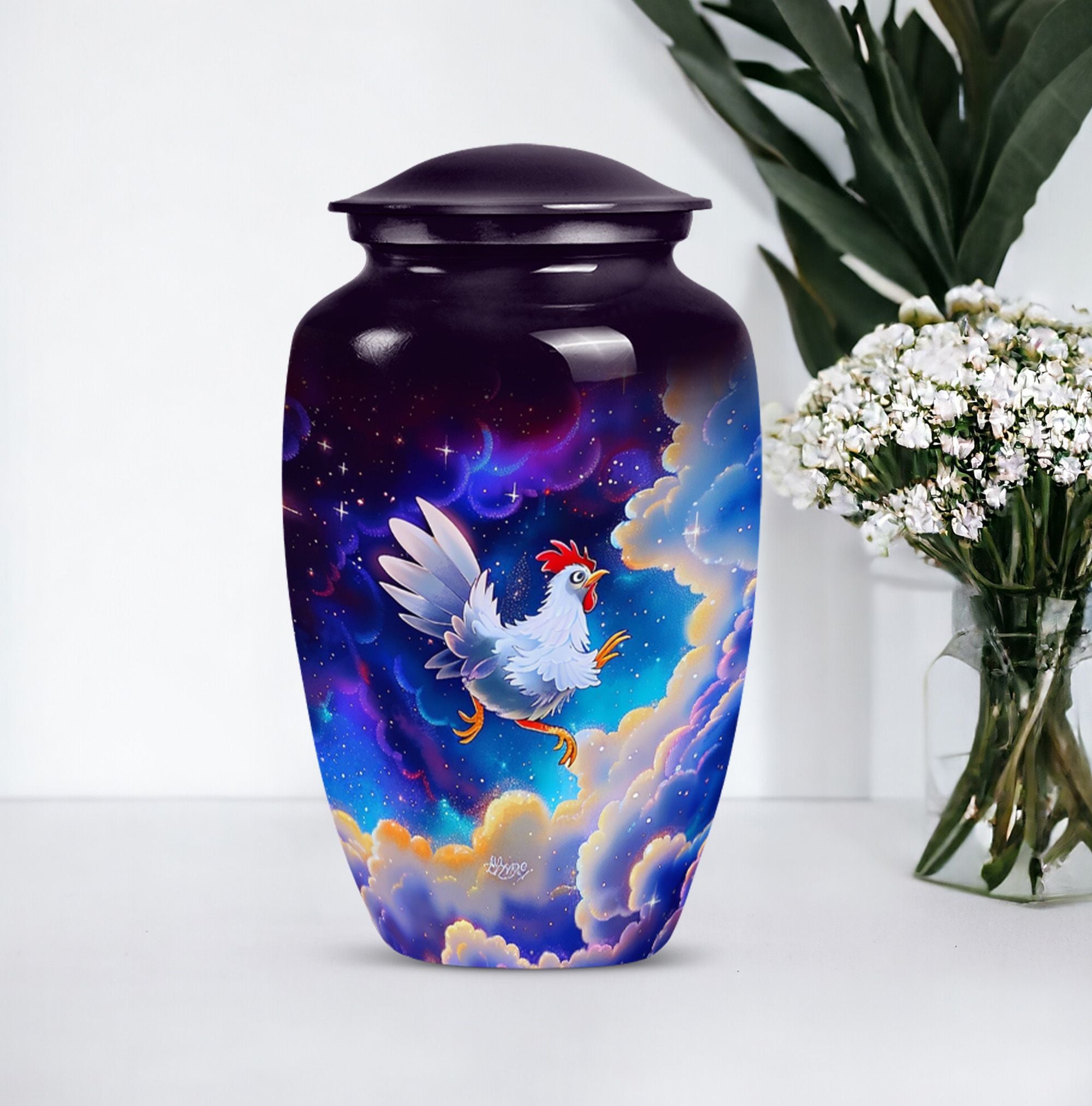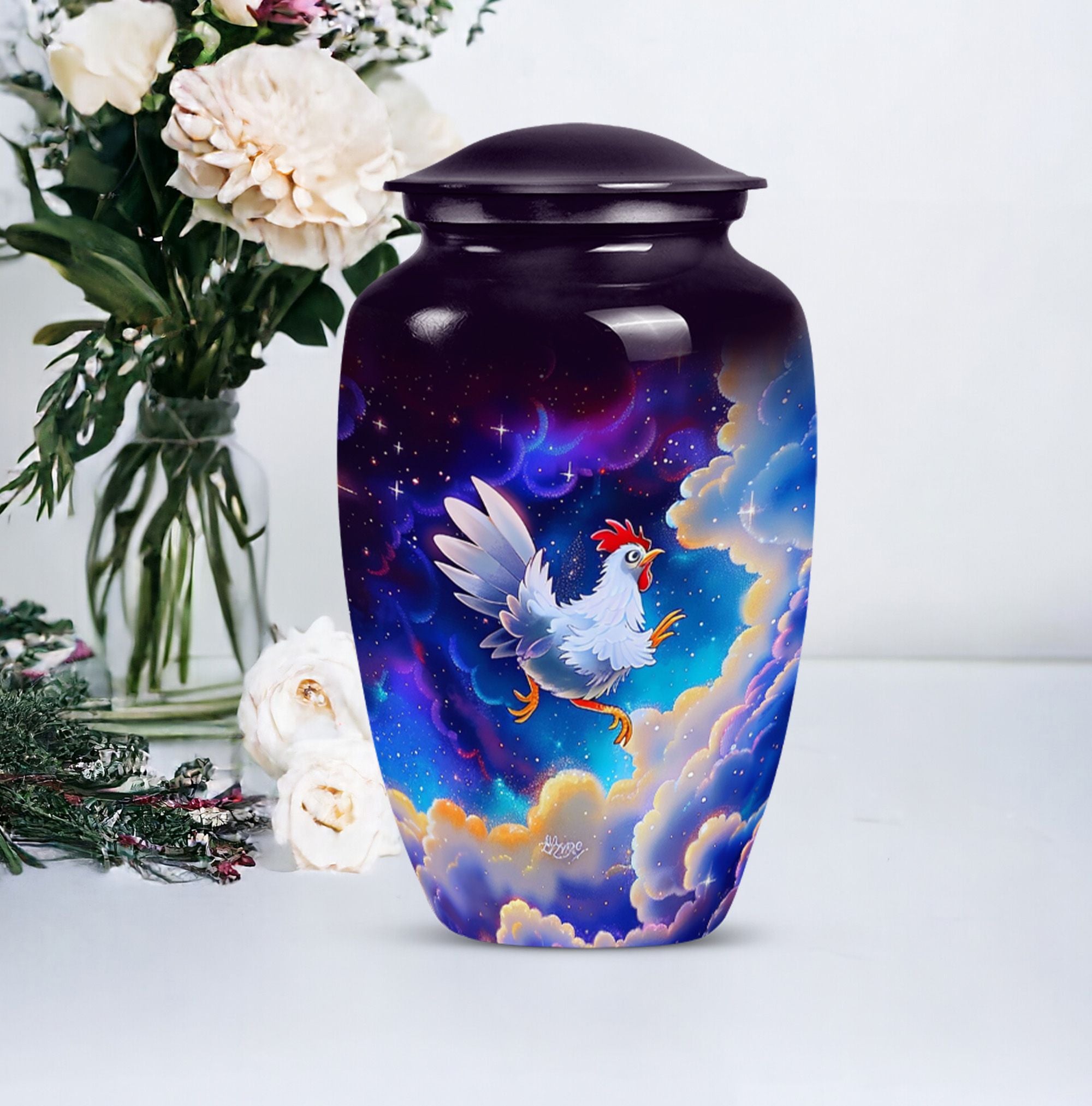 Our lovingly crafted chicken urn, a sublime fusion of functionality and artistry, provides you the ideal vessel to honor and preserve the memories of your departed loved ones. Not your ordinary, run-of-the-mill burial ashes urn, but one that communicates the tenderness and respect you hold for your dearly departed. Cast from durable aluminum, this urn boasts of a generous size of 10 inches and a substantial weight of 3.3 pounds. The intricately designed flower theme radiates a sense of peace and serenity. This urn has a large capacity of 200 cubic inches, ensuring ample space for adult ashes. You have the option to personalize the urn with your loved one's name, making it an intimate memorial. An accompanying velvet pouch is provided to securely contain the ashes. Suitable for both adults and seniors looking for urns for cremation ashes, our product is a testament to our dedication to help you keep your departed ones' memories alive.
