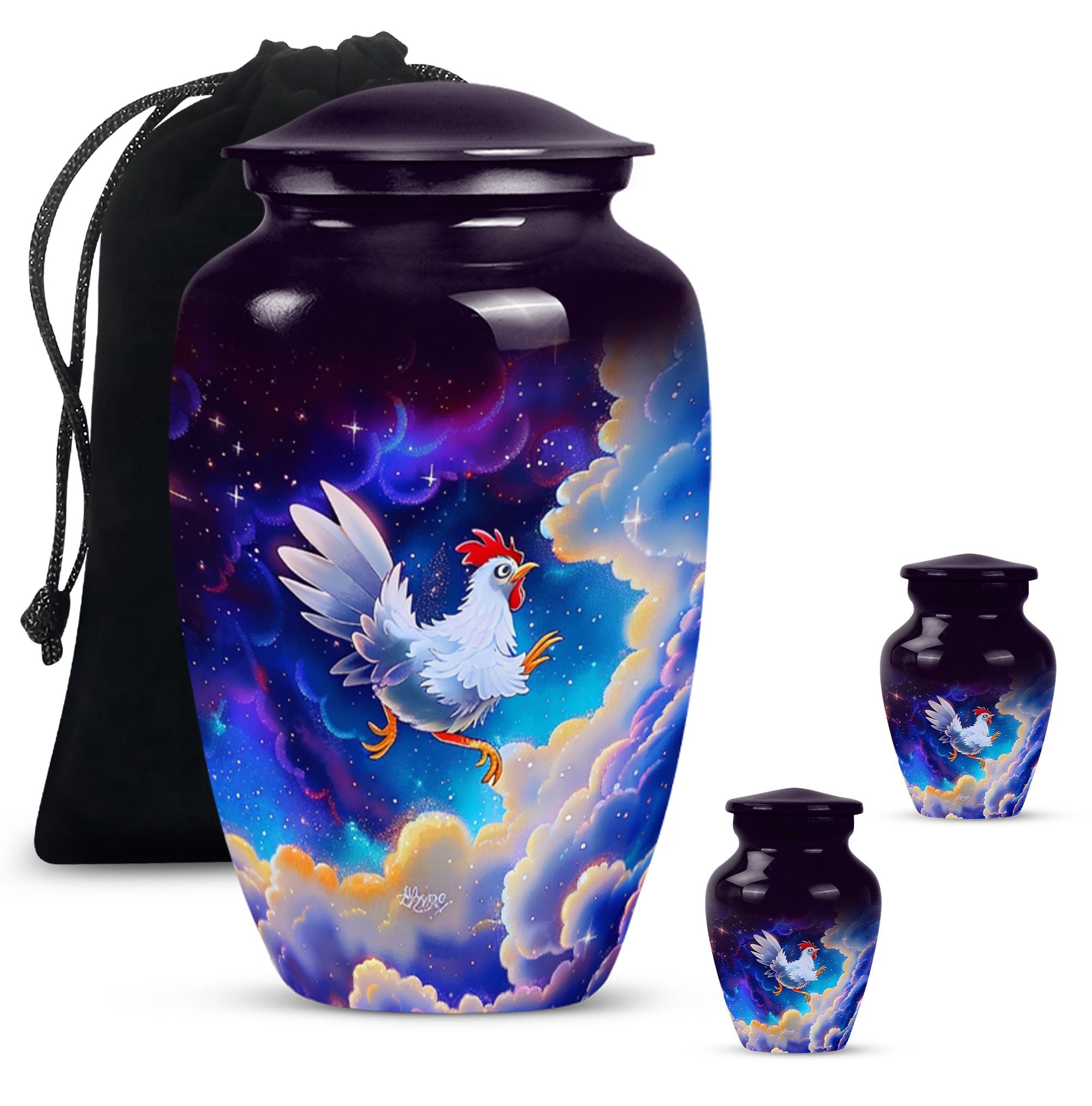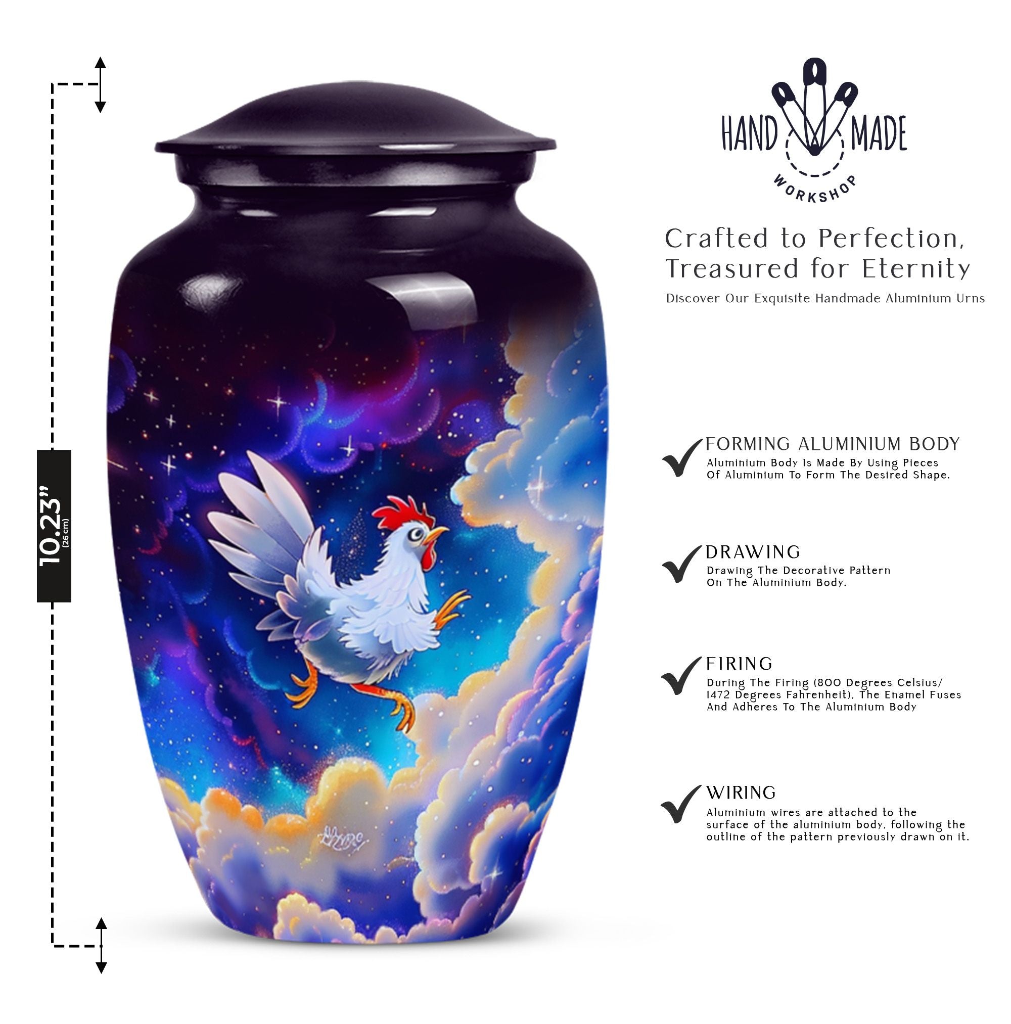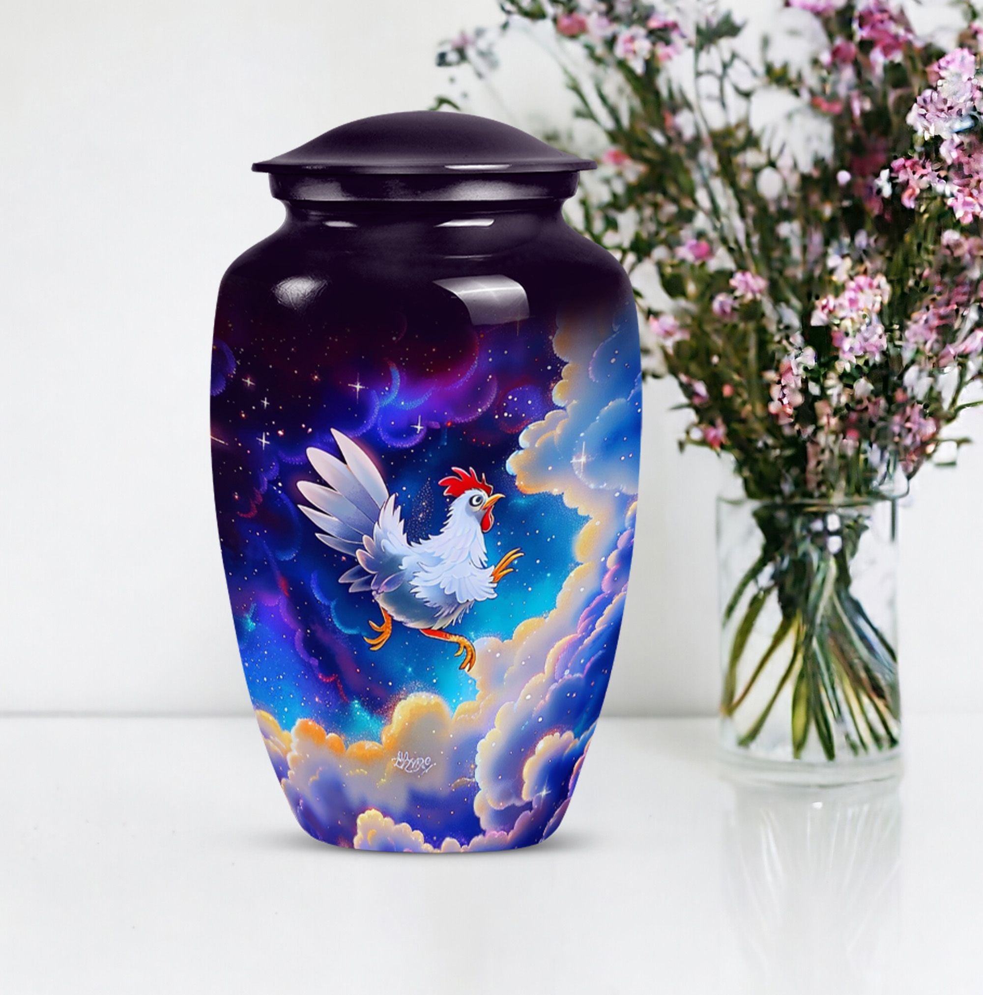 Our lovingly crafted chicken urn, a sublime fusion of functionality and artistry, provides you the ideal vessel to honor and preserve the memories of your departed loved ones. Not your ordinary, run-of-the-mill burial ashes urn, but one that communicates the tenderness and respect you hold for your dearly departed. Cast from durable aluminum, this urn boasts of a generous size of 10 inches and a substantial weight of 3.3 pounds. The intricately designed flower theme radiates a sense of peace and serenity. This urn has a large capacity of 200 cubic inches, ensuring ample space for adult ashes. You have the option to personalize the urn with your loved one's name, making it an intimate memorial. An accompanying velvet pouch is provided to securely contain the ashes. Suitable for both adults and seniors looking for urns for cremation ashes, our product is a testament to our dedication to help you keep your departed ones' memories alive.
