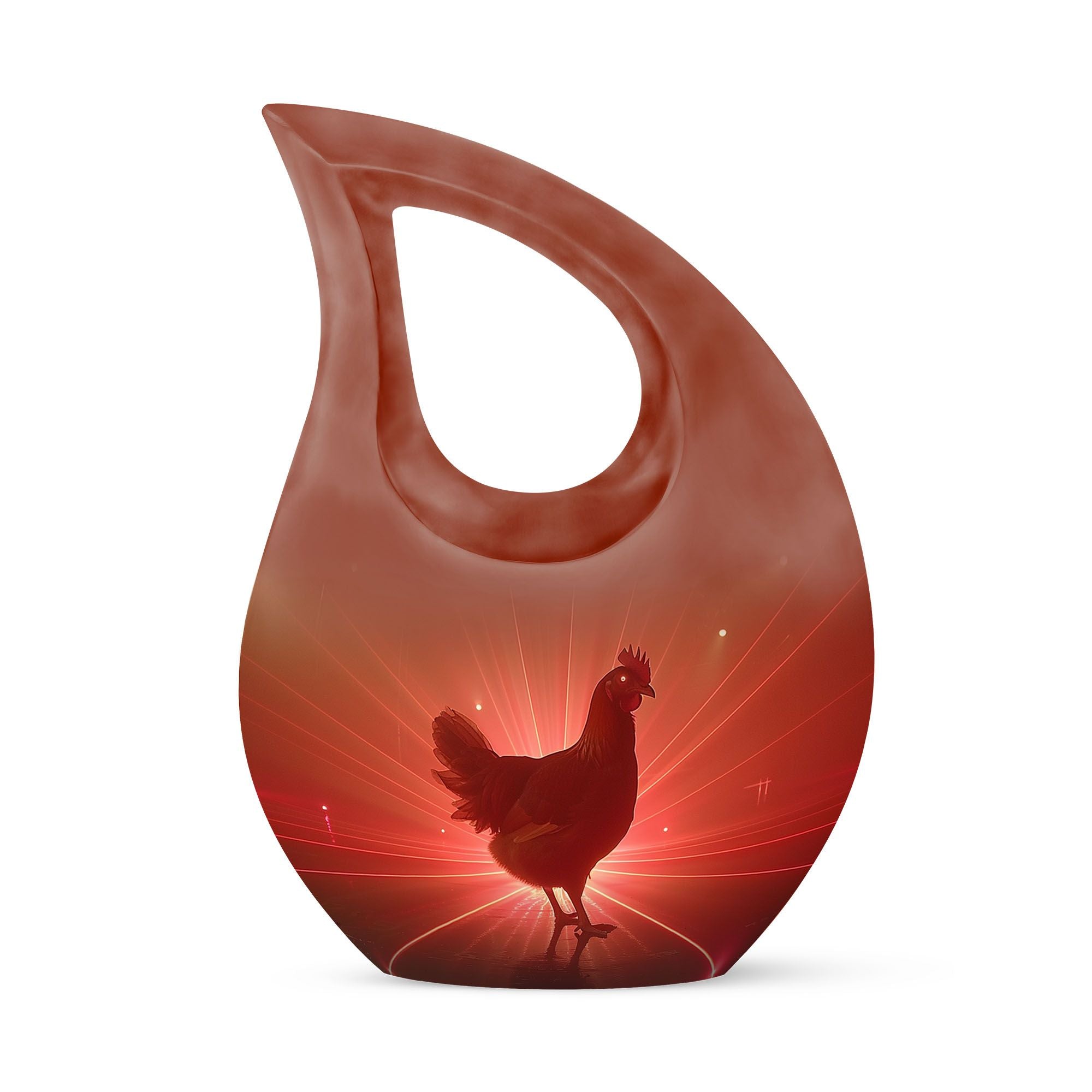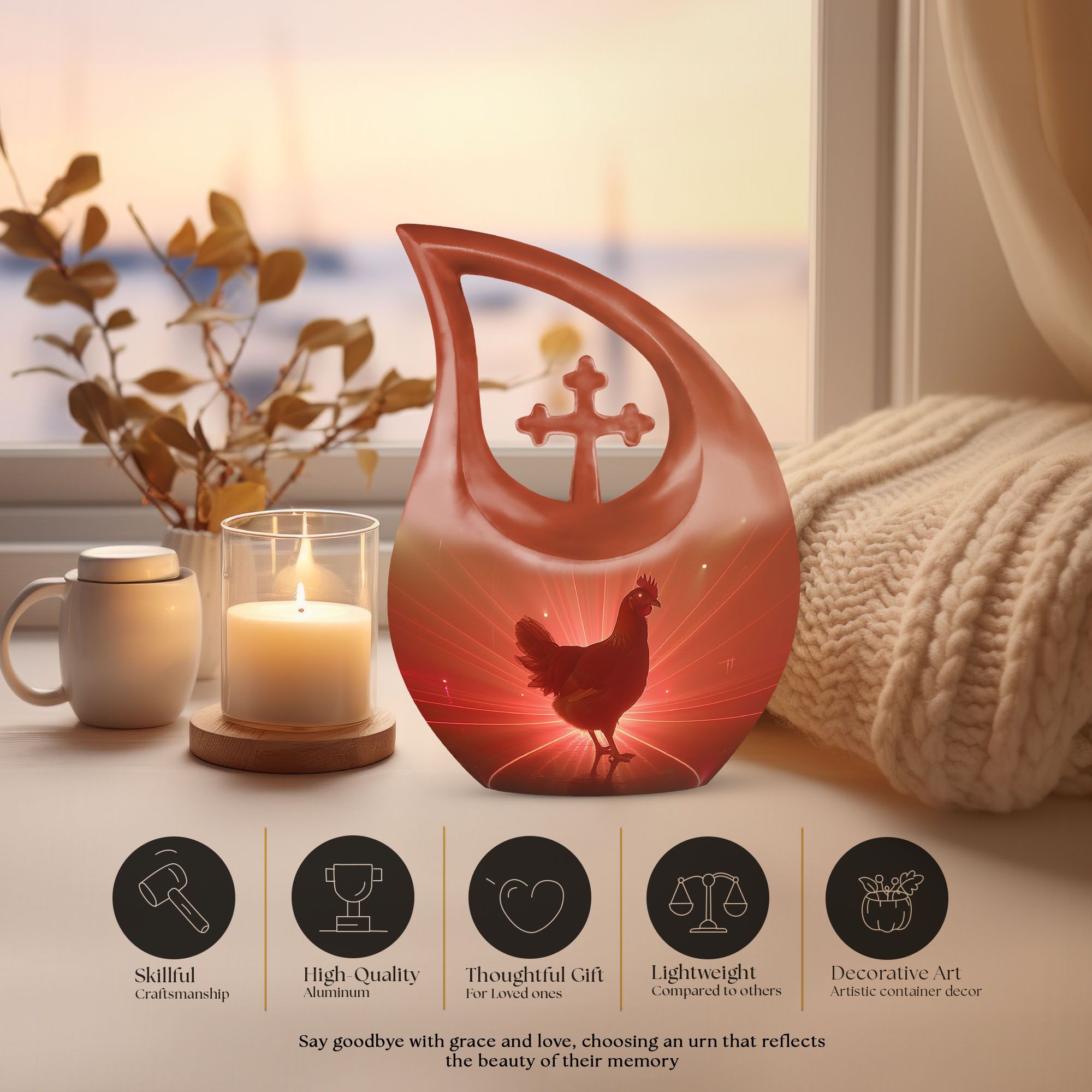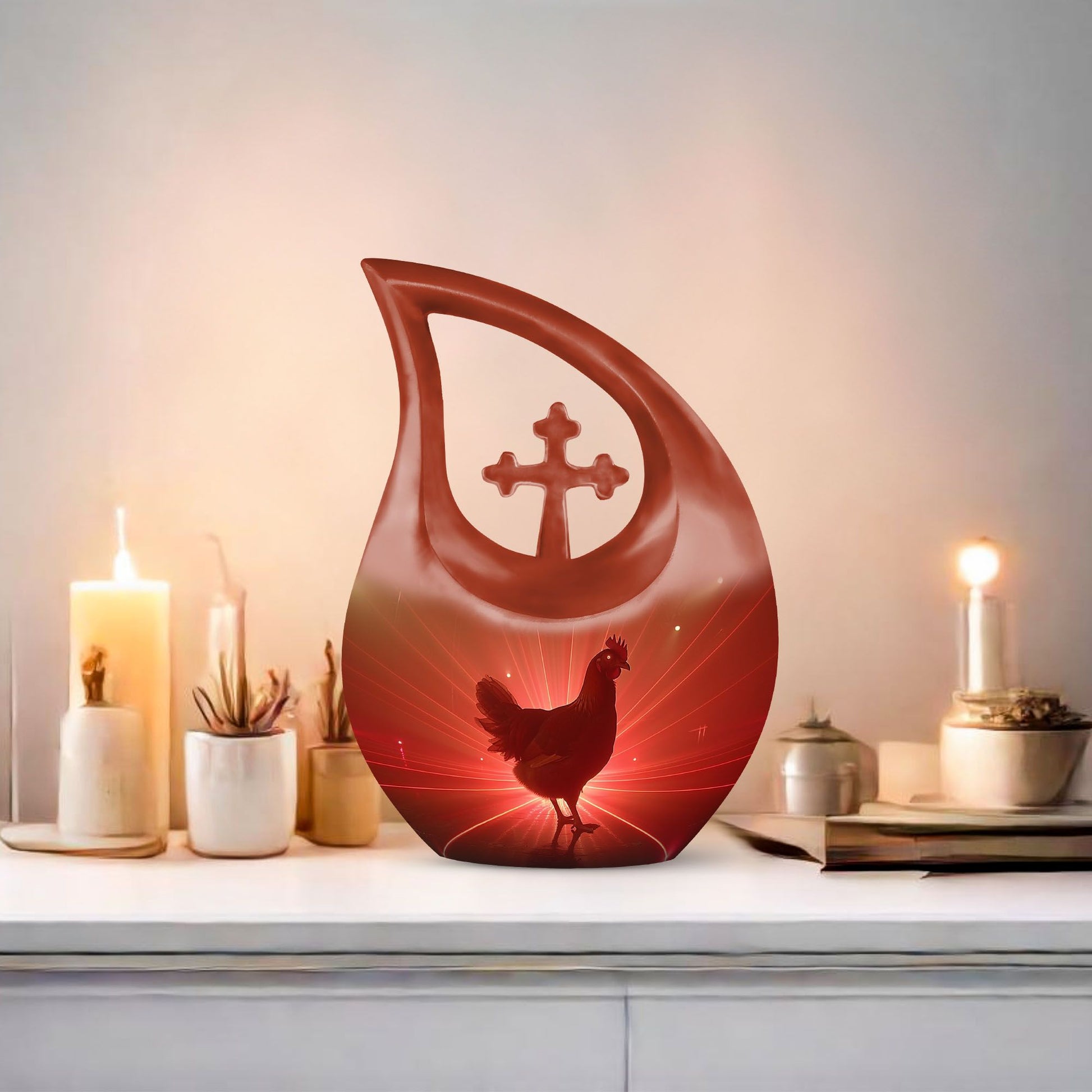 Introducing the Chicken Themed Cross Drop Urn, a harmonious fusion of faith and affection to commemorate the life of your loved one. At a height of 10 inches and weighing 3.3 pounds, this urn is perfect for preserving precious memories. It has a capacity of 200 cubic inches, allowing for an ample collection of ashes. Crafted meticulously from sturdy aluminium, it assures the ability to withstand years. The urn comes alongside a velvet pouch that gracefully contains the ashes, providing an added layer of protection and respect. Our 10-inch Chicken Urn is available for customization, enabling you to engrave names and make it as unique as the individual it is dedicated to. Among our affordable urns, this product stands distinctively. It's conveniently classified as a large urn and may also find a fitting home in gardens. Seek solace and serenity with our personalized urns for ashes, a perfect memorial for your loved ones. Pre-eminent keywords include but are not limited to 'Chicken Urn,' 'Personalized Urns For Ashes,' 'Garden Urns For Ashes,' 'Affordable Urns,' 'Cremation Boxes,' and 'Medium Urn.' Collect and keep the precious memories intact, reminding you of their vibrant life.