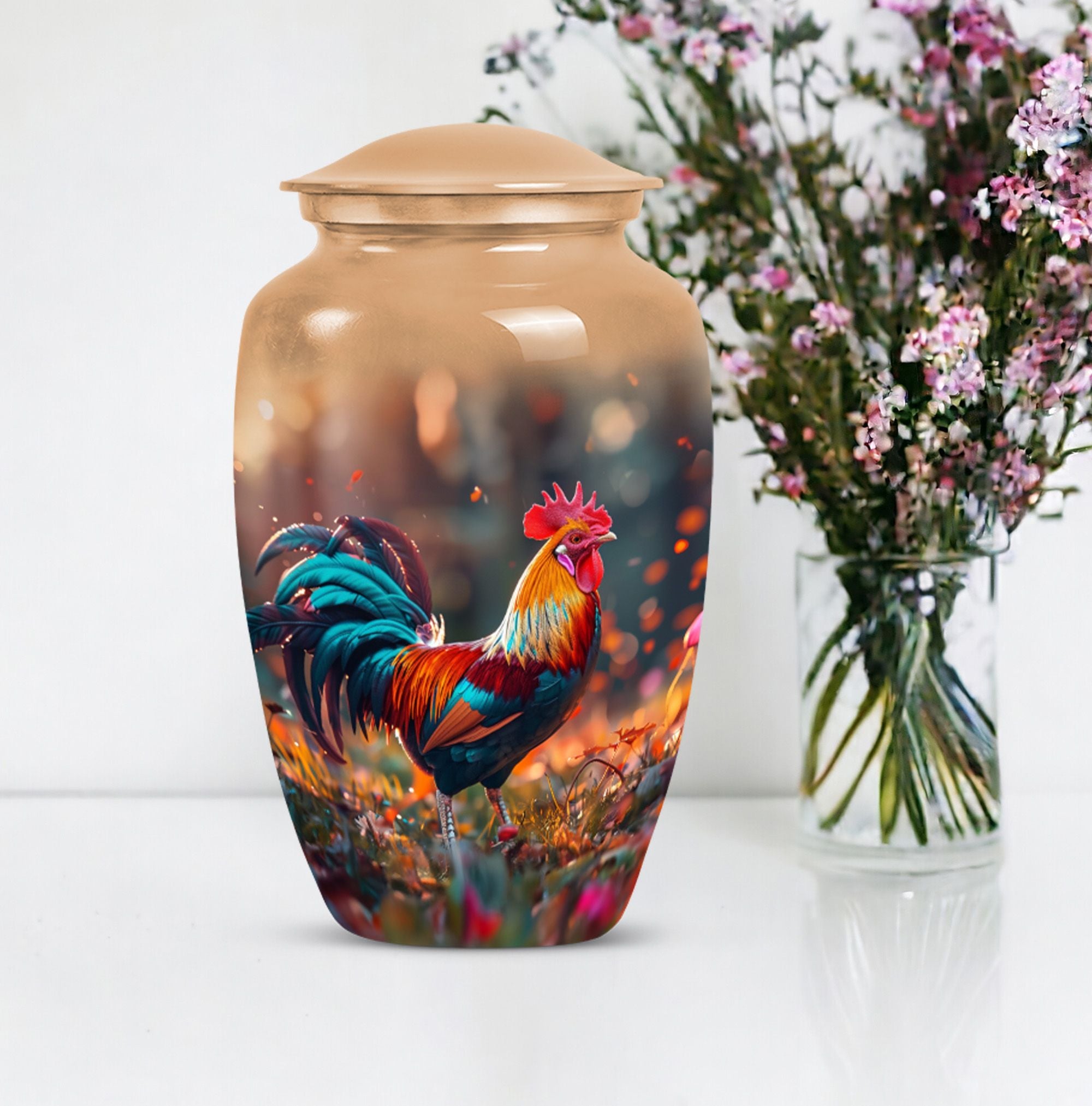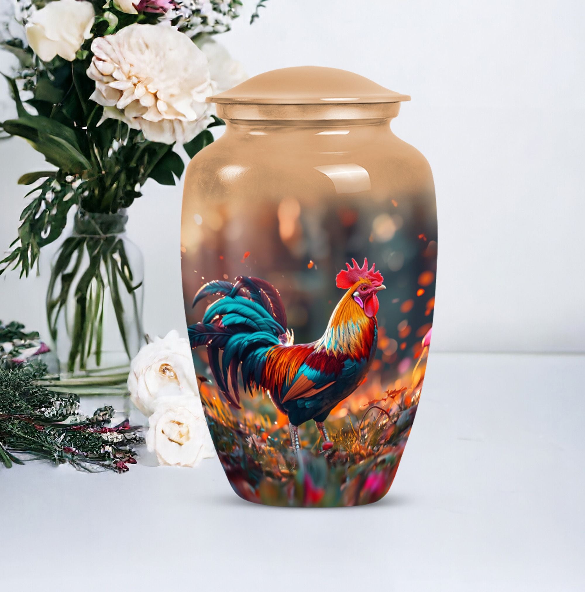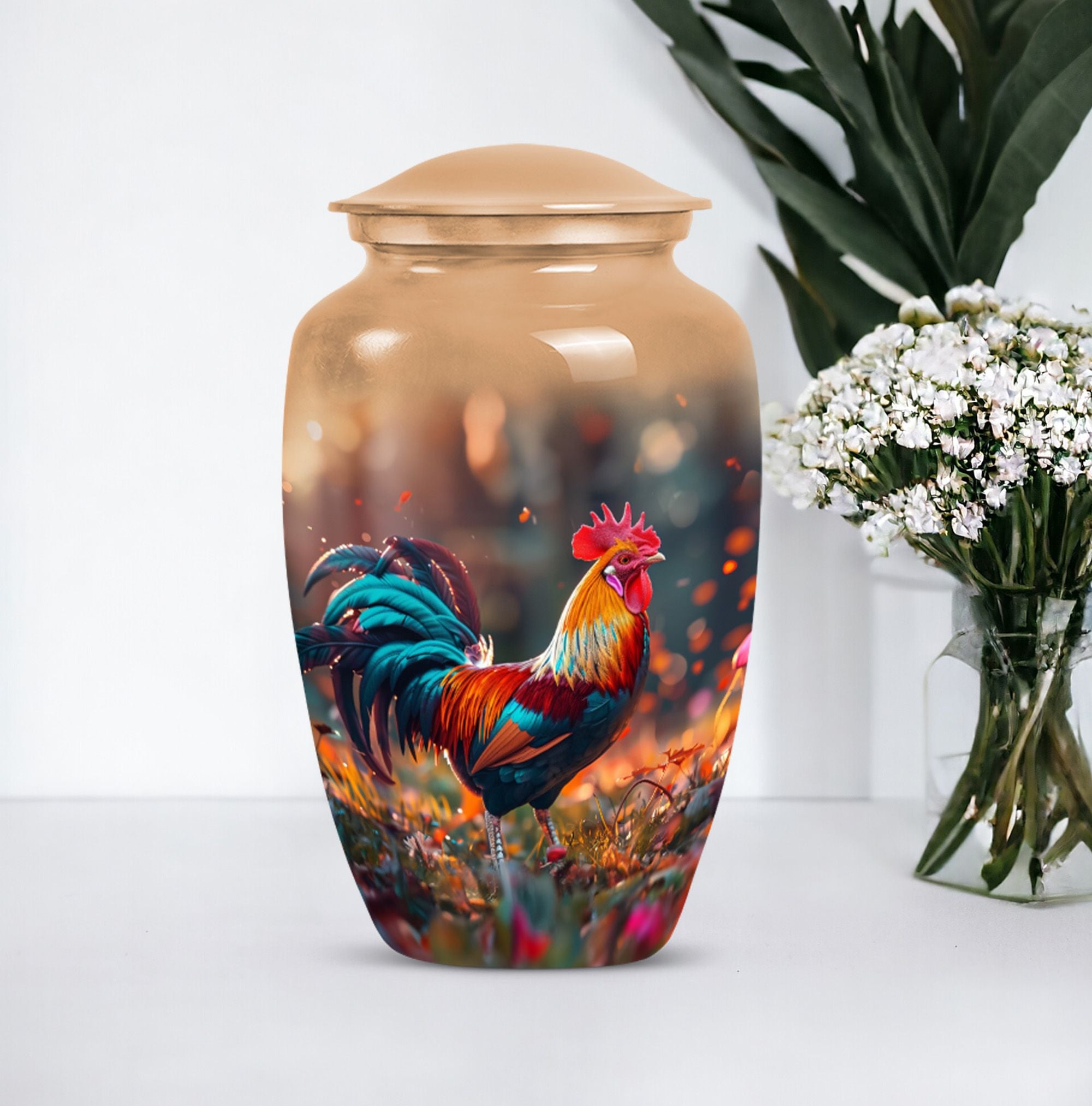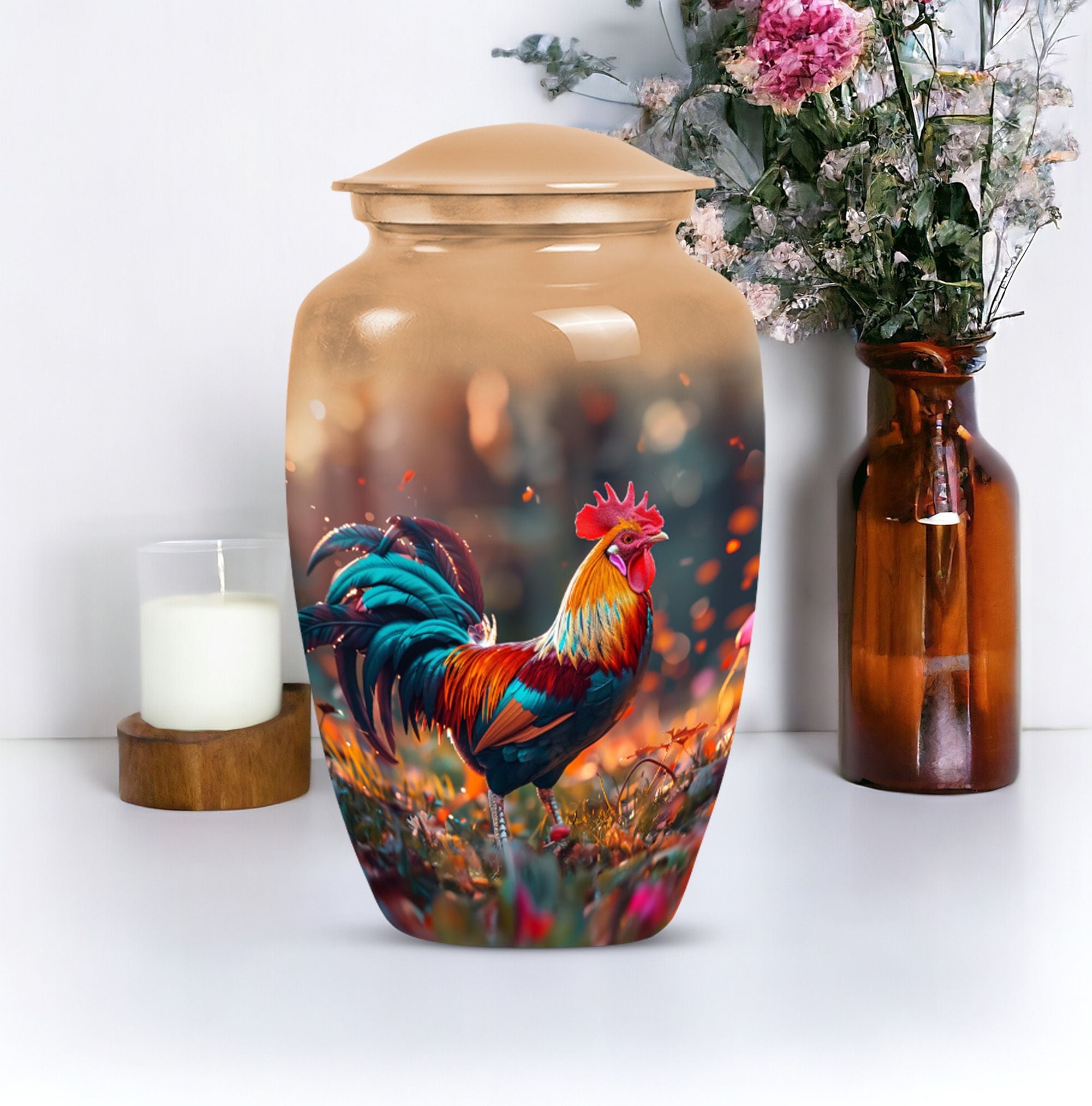 Representing serenity and respect, this 10 inch Classic cremation urn offers a durable resting place for your loved ones. Weighing at a substantial 3.3 pounds, this large urn has been thoughtfully crafted from robust aluminium, ensuring longevity. The urn boasts a capacity of 200 cubic inches, making it a suitable choice for adults. An intricate floral-themed design elevates its simple elegance, creating a tribute that radiates dignity. It also offers the unique option of personalizing with engraved names, giving it an exclusive touch. Your purchase includes a velvet pouch for secure containment of ashes. Seek solace in this respectful artefact of remembrance. Our chicken urn is an enduring statement of love suitable for burial ash urns for humans. It’s not just a cremation urn; it's a choose for treasured memories. Offering urns for adult cremation ashes for both men and women, this product provides an authoritative presence that matches the magnitude of your profound loss. Note: This product is intended for 'en' speaking consumers.