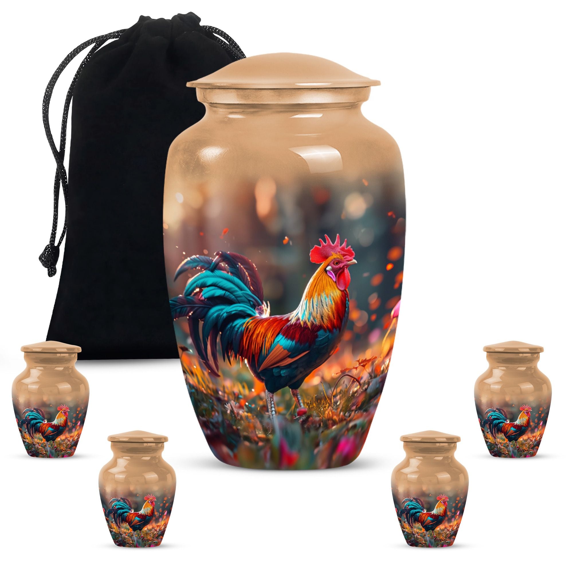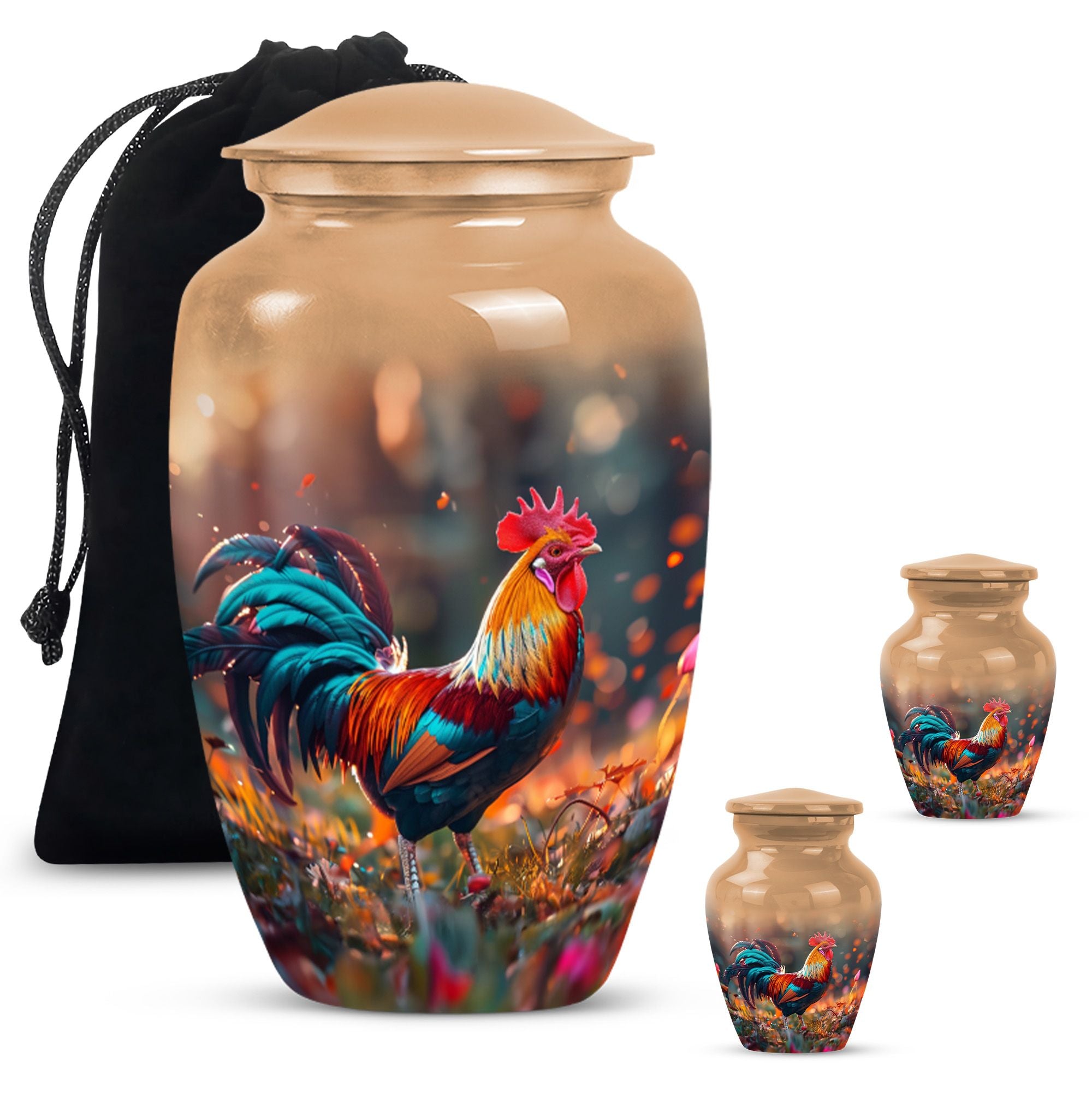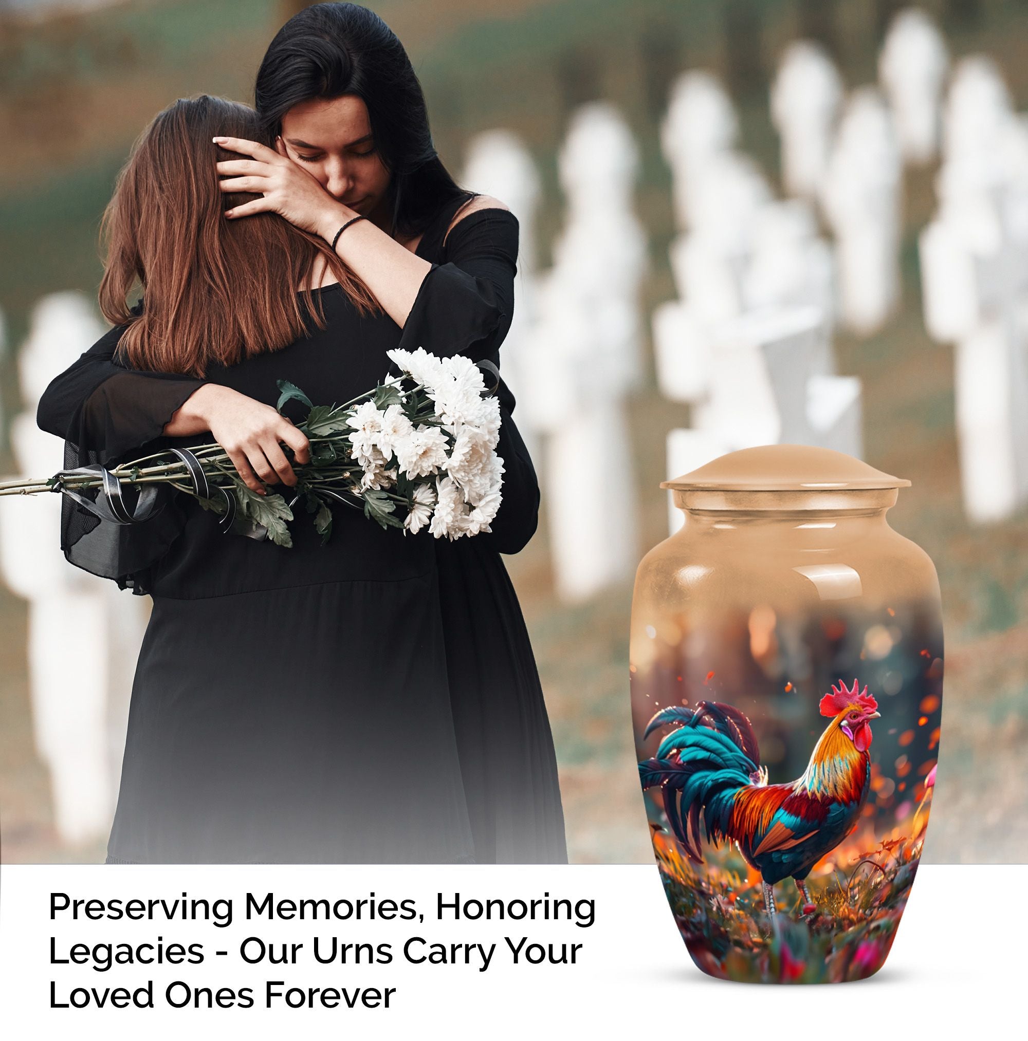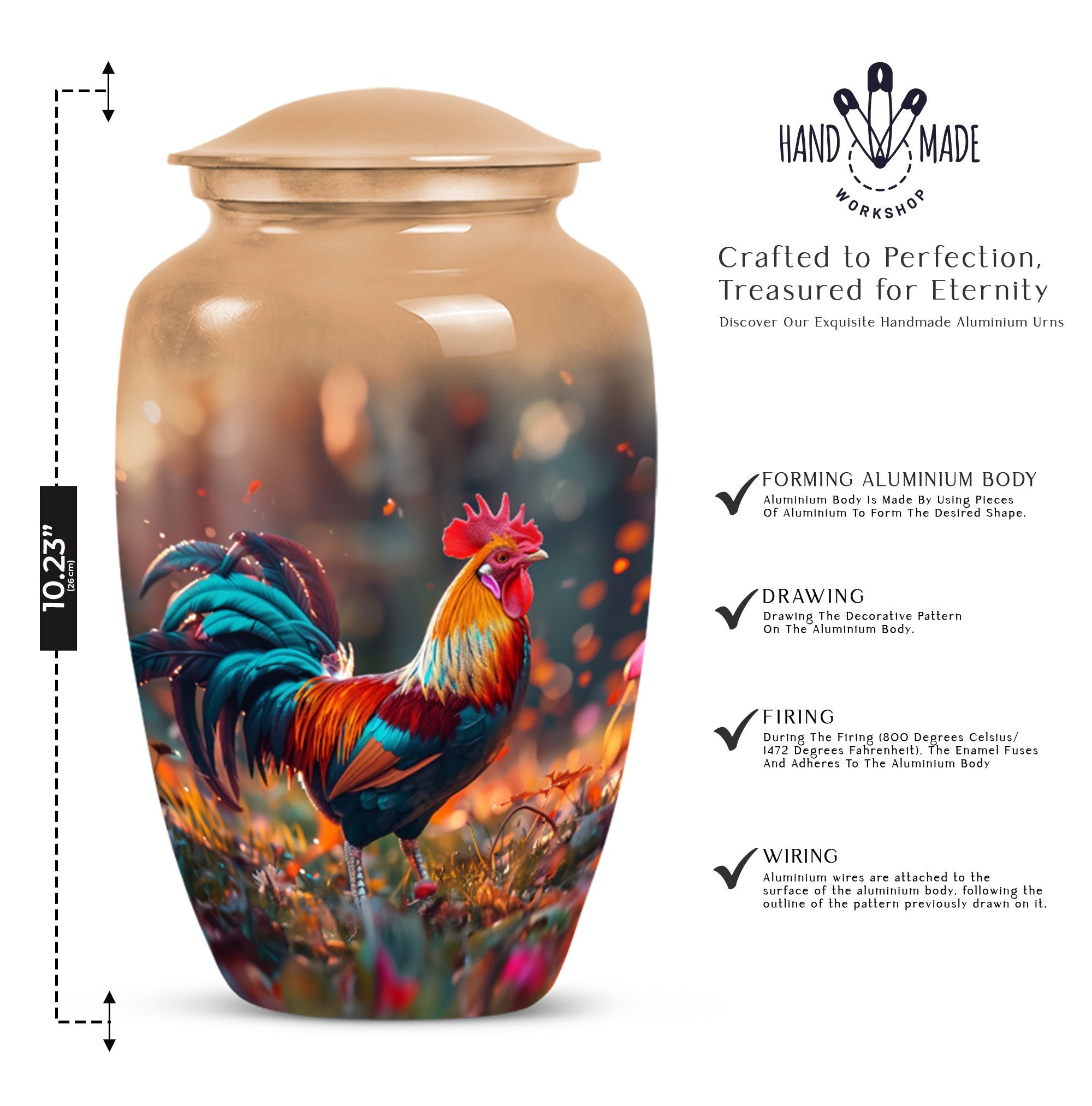Representing serenity and respect, this 10 inch Classic cremation urn offers a durable resting place for your loved ones. Weighing at a substantial 3.3 pounds, this large urn has been thoughtfully crafted from robust aluminium, ensuring longevity. The urn boasts a capacity of 200 cubic inches, making it a suitable choice for adults. An intricate floral-themed design elevates its simple elegance, creating a tribute that radiates dignity. It also offers the unique option of personalizing with engraved names, giving it an exclusive touch. Your purchase includes a velvet pouch for secure containment of ashes. Seek solace in this respectful artefact of remembrance. Our chicken urn is an enduring statement of love suitable for burial ash urns for humans. It’s not just a cremation urn; it's a choose for treasured memories. Offering urns for adult cremation ashes for both men and women, this product provides an authoritative presence that matches the magnitude of your profound loss. Note: This product is intended for 'en' speaking consumers.