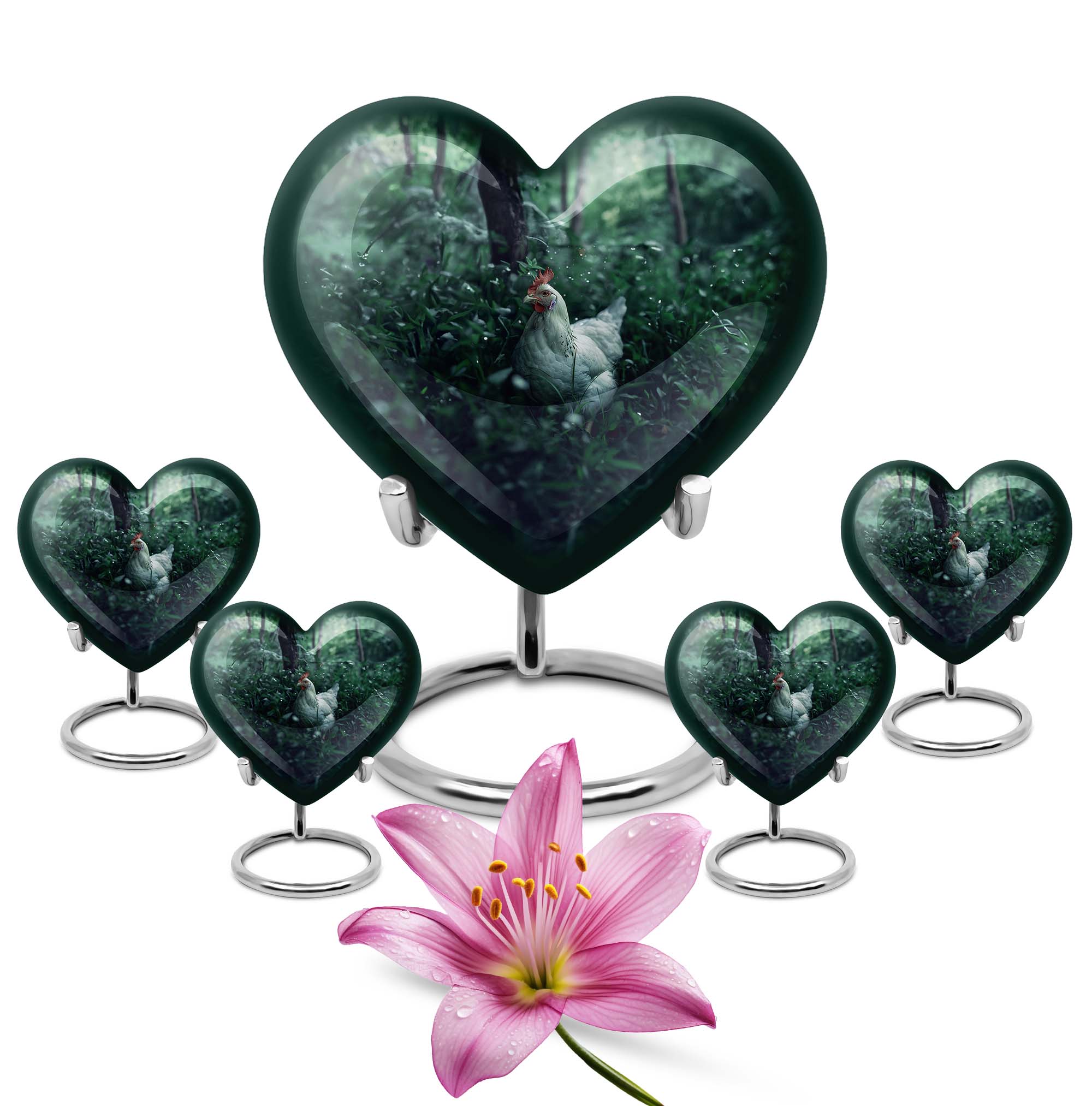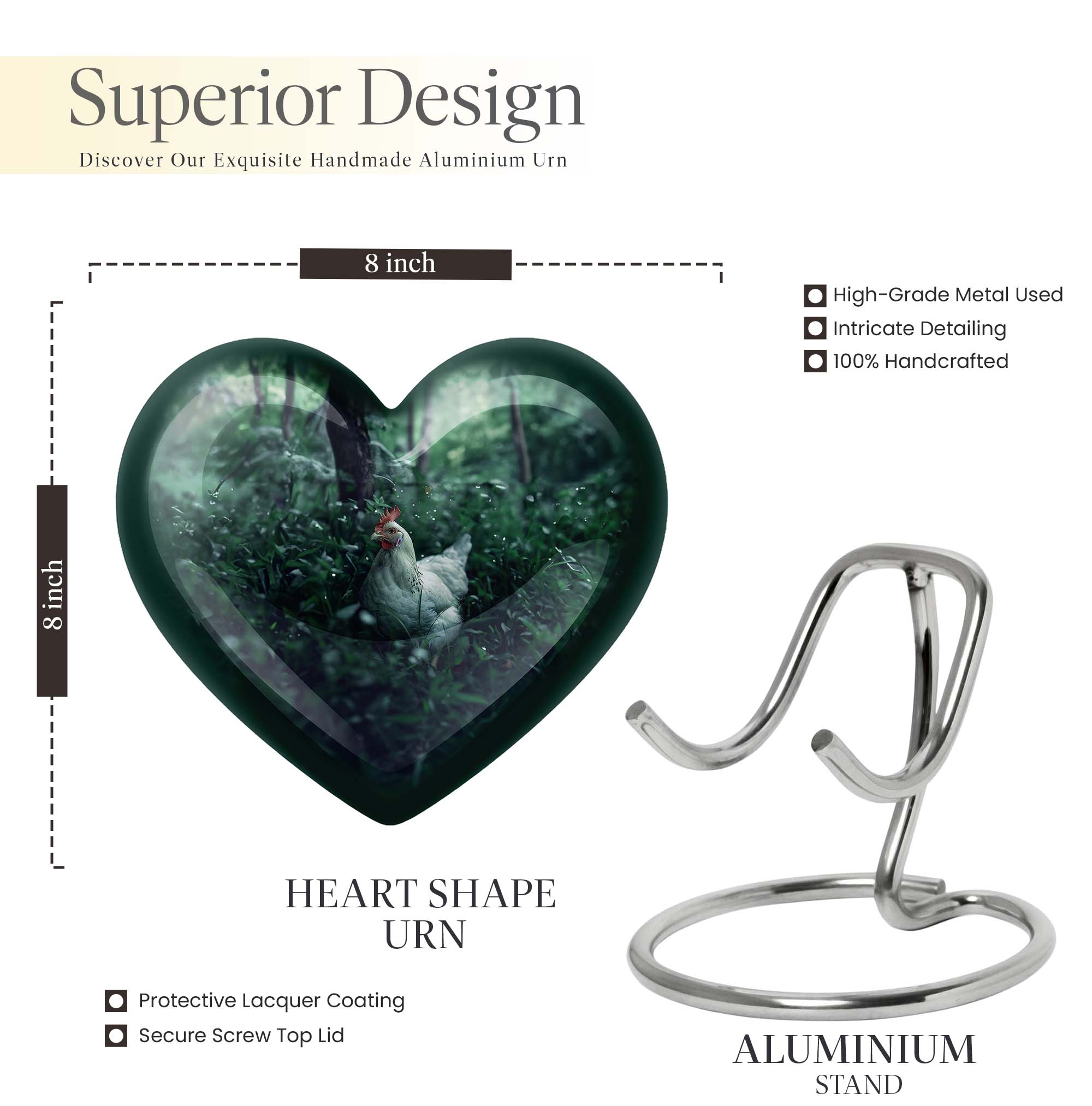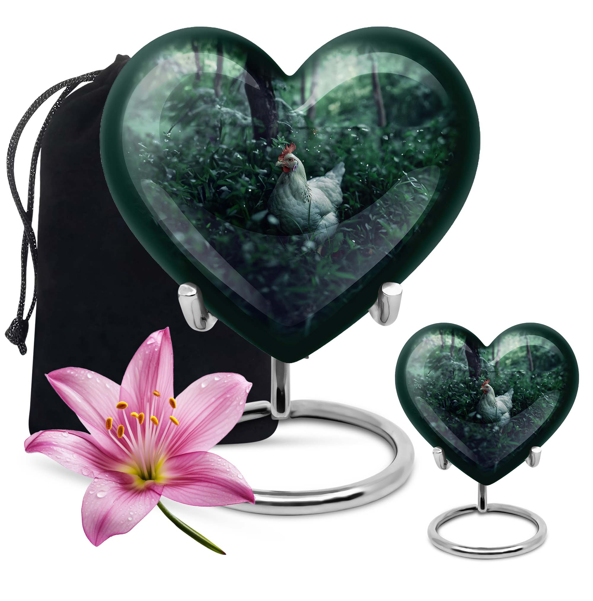 Embrace the memory of your loved ones with this beautifully crafted Chicken Urn that artfully serves as a memorable token. Crafted from resilient Aluminium, this cremation urn stands majestically at 10 inches in height, bearing the weight at a minimal 3.3 pounds. Themed with delicately designed flowers to add a heart-warming touch to this sacred vessel. With the capacity to hold up to 200 cubic inches, this cremation urn for men elegantly bridges the gap between style and sentimentality. Our Chicken Urn comes encased in a sophisticated velvet pouch, ensuring a respectful containment of ashes. Offering the convenience of customization, personalize this large urn with engraved names, further establishing its unmatched uniqueness. It's more than just an urn human burial urn; it's a dignified tribute. Whether you’re searching for memorial urns or a memorable 'urn for human ashes adult men', our Chicken Urn stands as a distinguished choice.