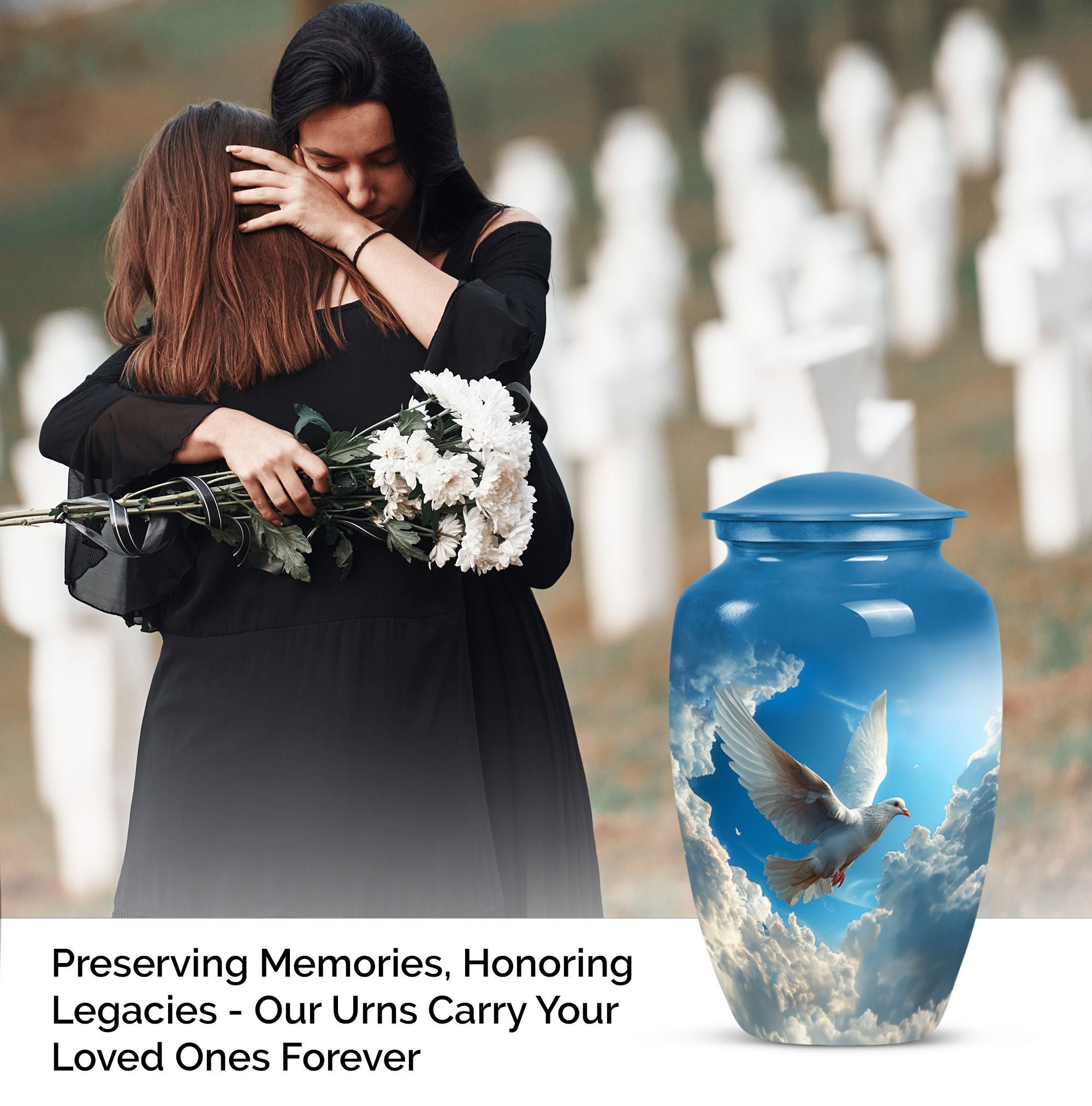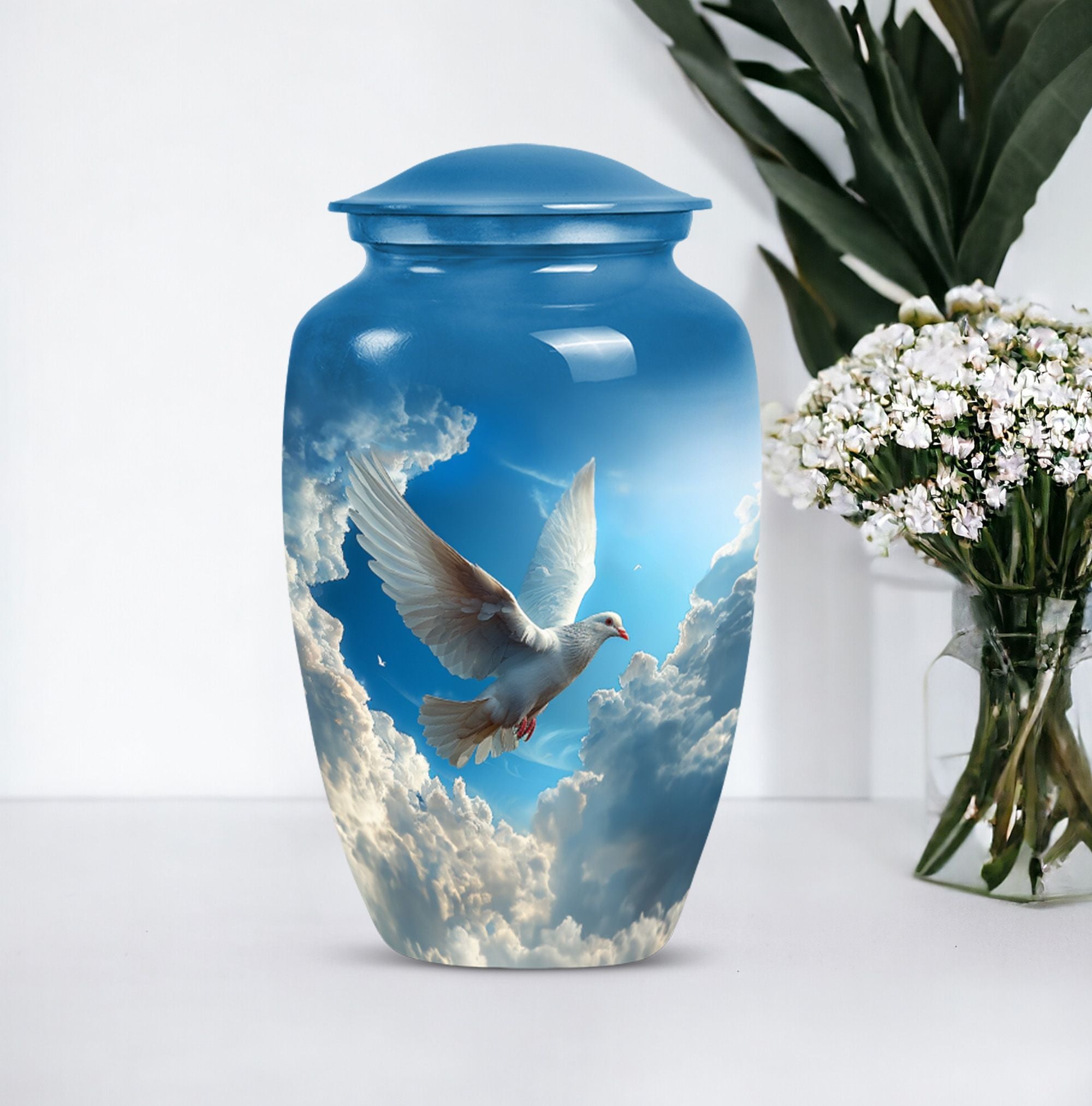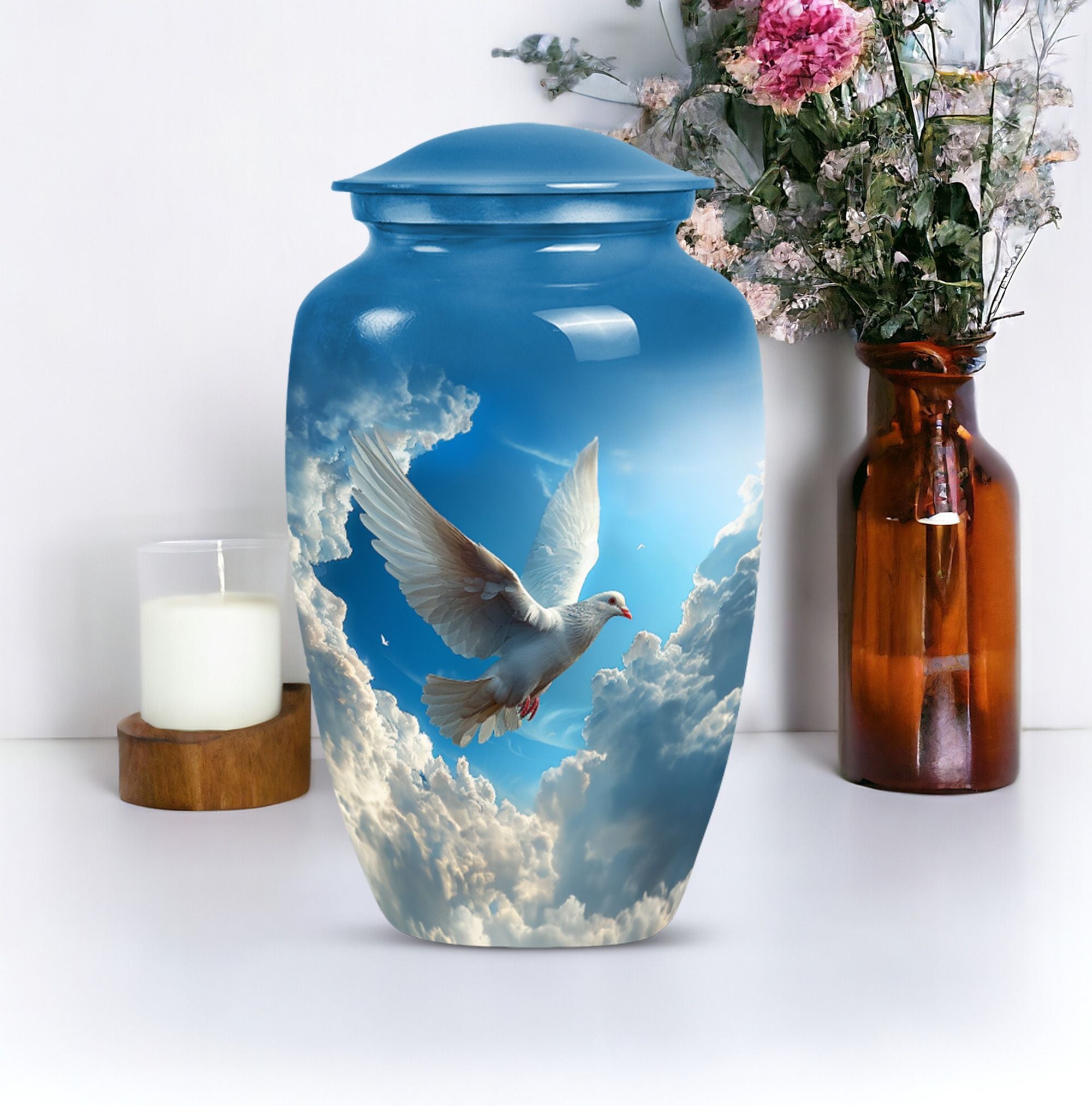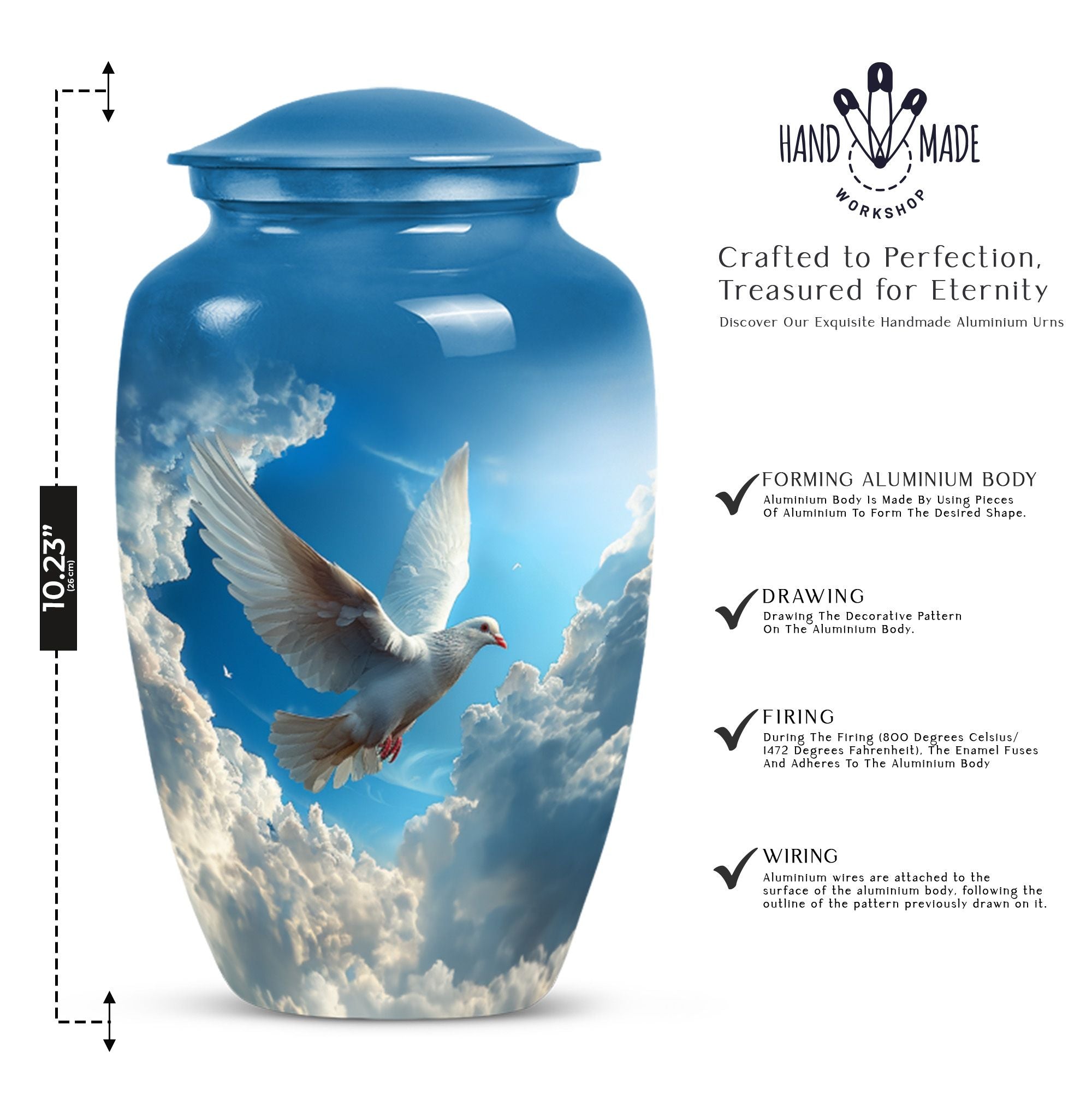 Cherish the memories of your loved ones with this dove urn, a timeless statement of elegance and refinement. This cremation urn for women, standing at a substantial 10 inches, is a distinguished choice from our large urns selection. It offers ample capacity with room for up to 200 cubic inches of remembrance. With a stately weight of 3.3 pounds, this aluminium urn, showcasing a charming theme of flowers, provides both beauty and durability. Each purchase includes a velvet pouch, perfectly suited for the containment of ashes. Further, pour in a touch of your heartfelt sentiments with our customization option. Personalize it with engraved names, reinforcing a truly unique tribute. This urn ticks all the boxes for unisex gifts for adults, endowing a respectful manner of treasuring the invaluable. Please note, cremation urns are not just functional; they serve as a lasting memorial for a life lived and loved. So, choose yours today and keep the essence alive.
