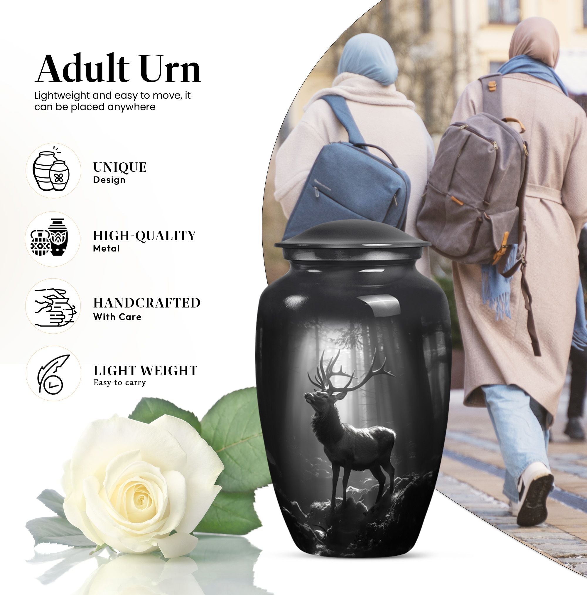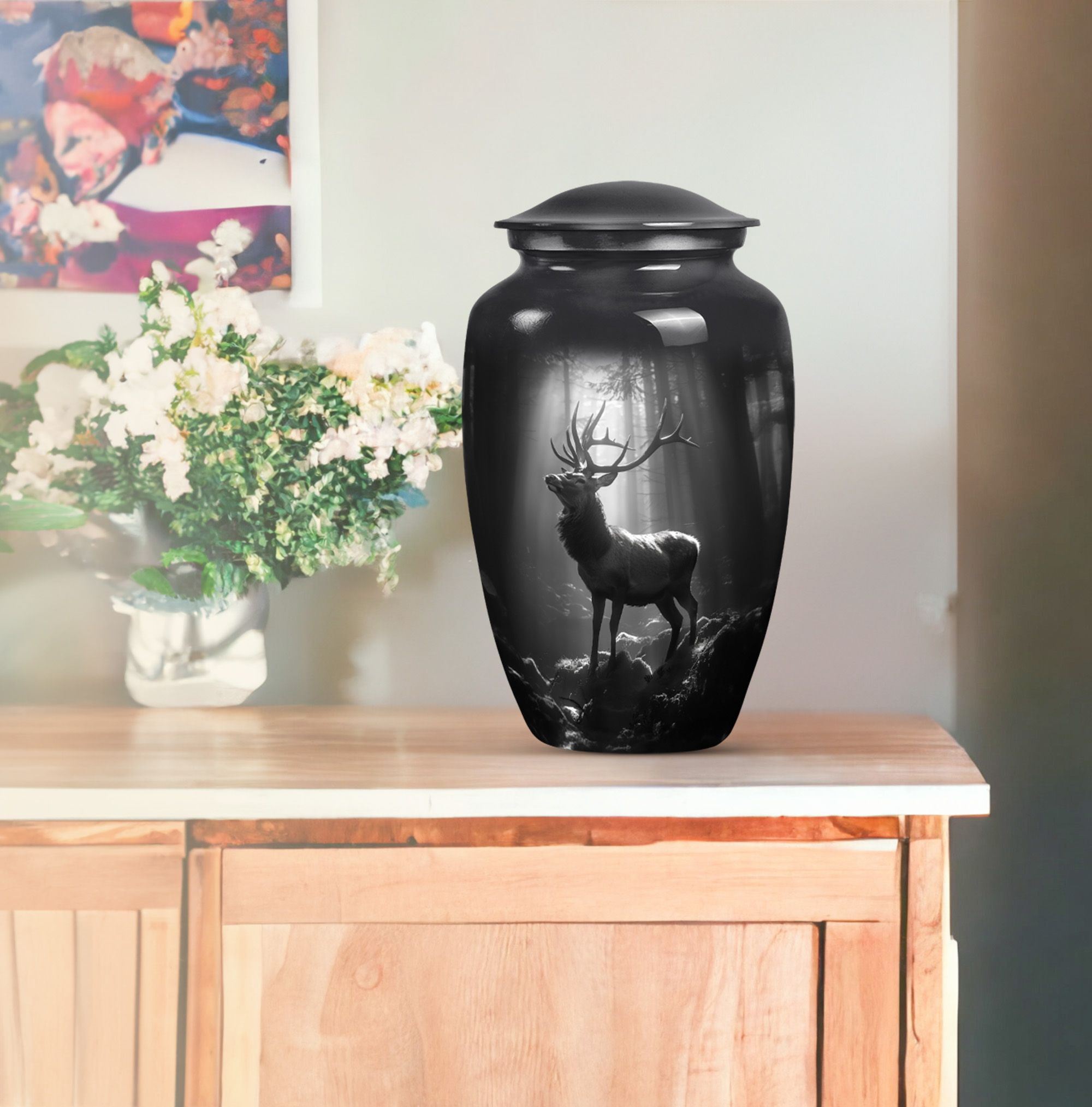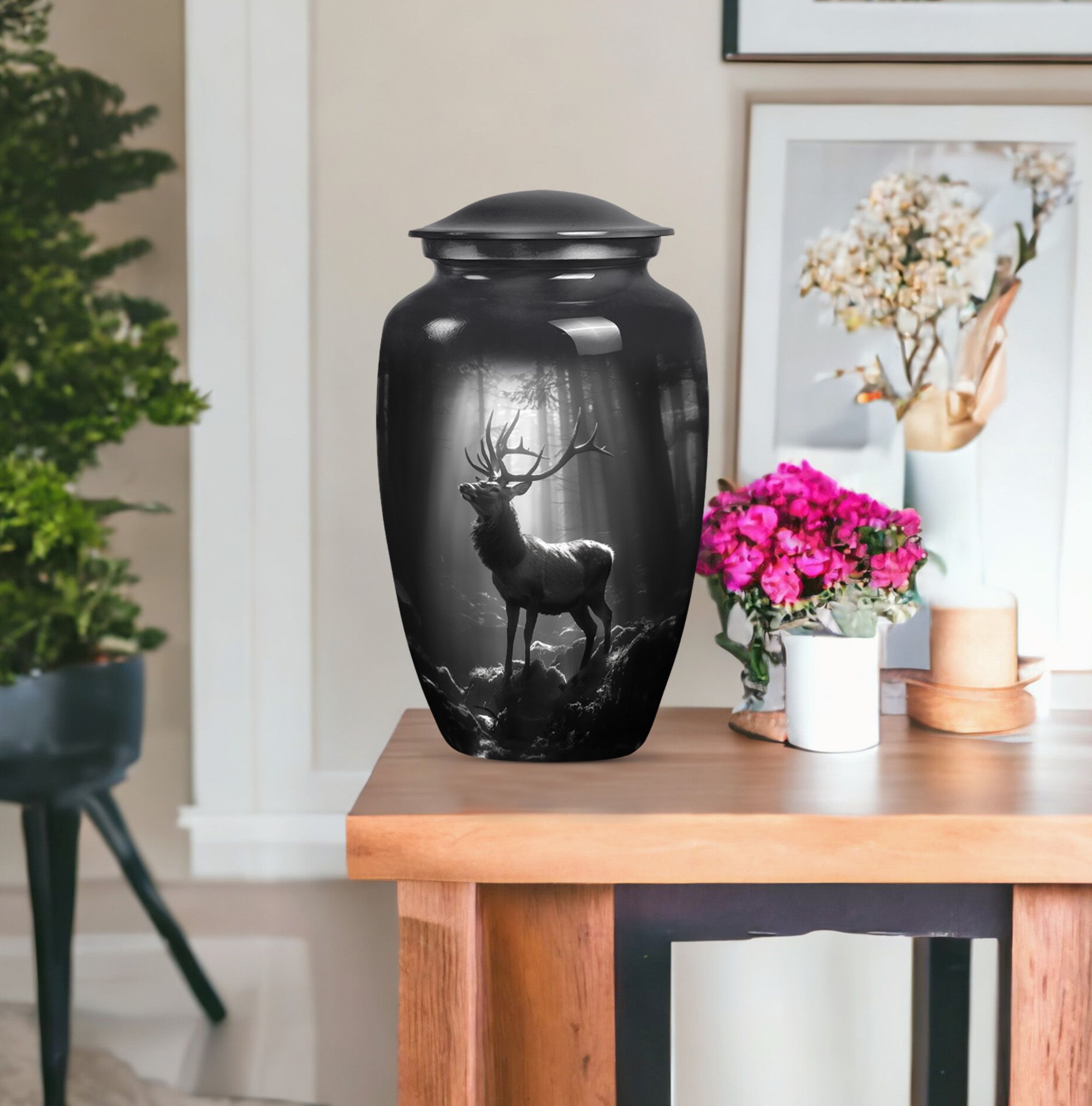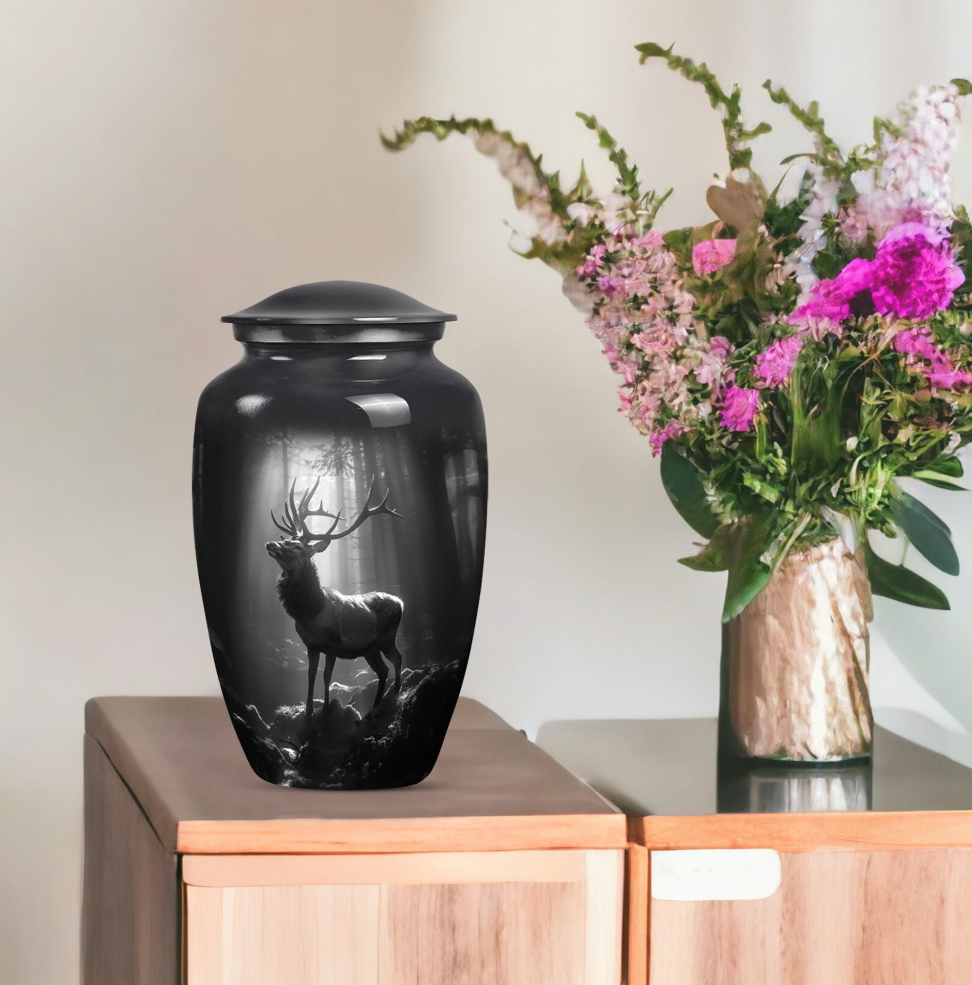 This 10-inch, grand Deer Urn is a reverential option for commemorating a loved one's journey to the next beyond. Crafted from lightweight yet durable aluminium material, it embodies the noble deer and the timeless beauty of a gramophone theme. With the substantial capacity of 200 cubic inches, it serves as a large urn suitable for adult human ashes, making it a meaningful choice for funeral burial needs. Weighing in at 3.3 pounds with 10 inches in height, it's designed to comfortably rest on your cherished 'shaped shelf.' It also ships with a velvet pouch to securely contain the ashes and maintain utmost respect. A distinguishing feature of this cremation urn is the customization option - allowing you to personalize it further by engraving names showing a heartfelt tribute. Our Deer Urn is a worthy testament to a memorable life lived and loved while peacefully serving as an elegant artefact in your home.
