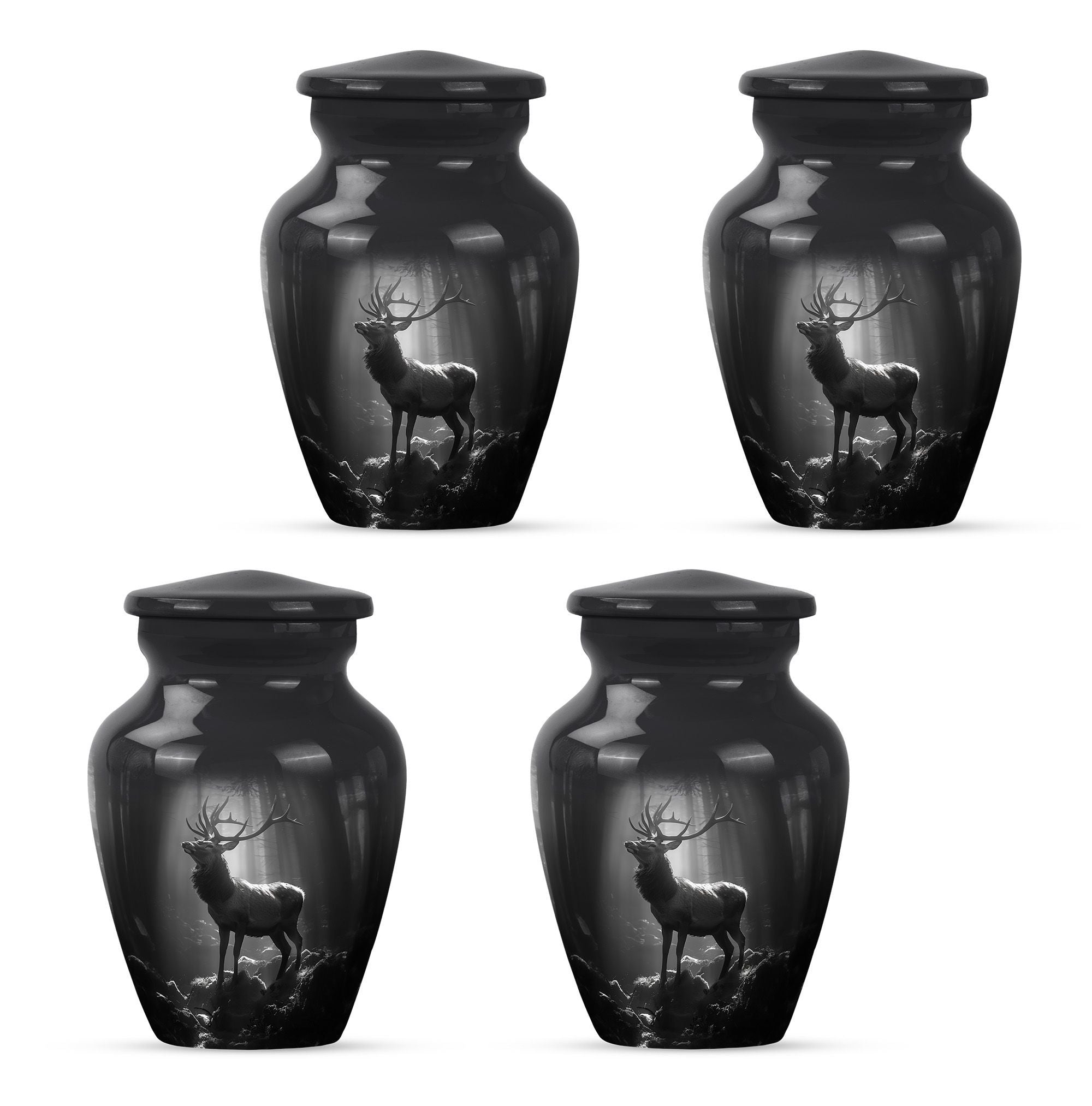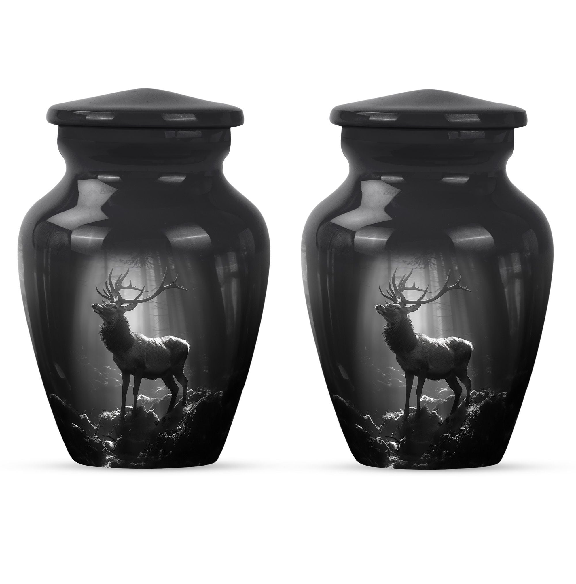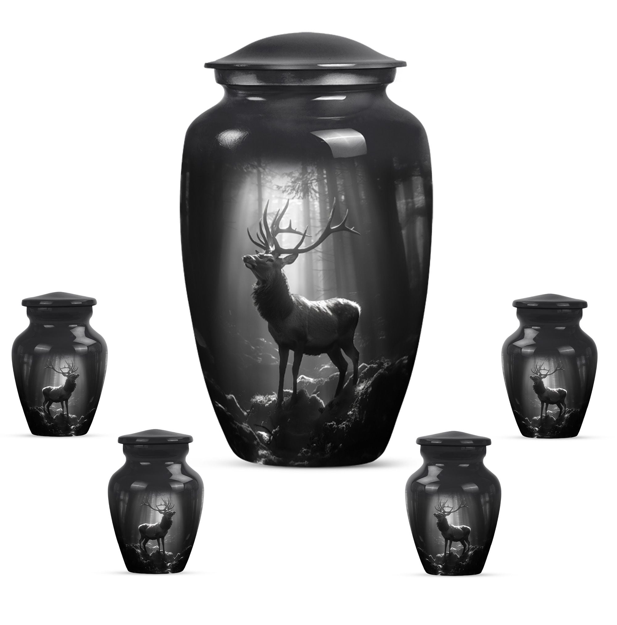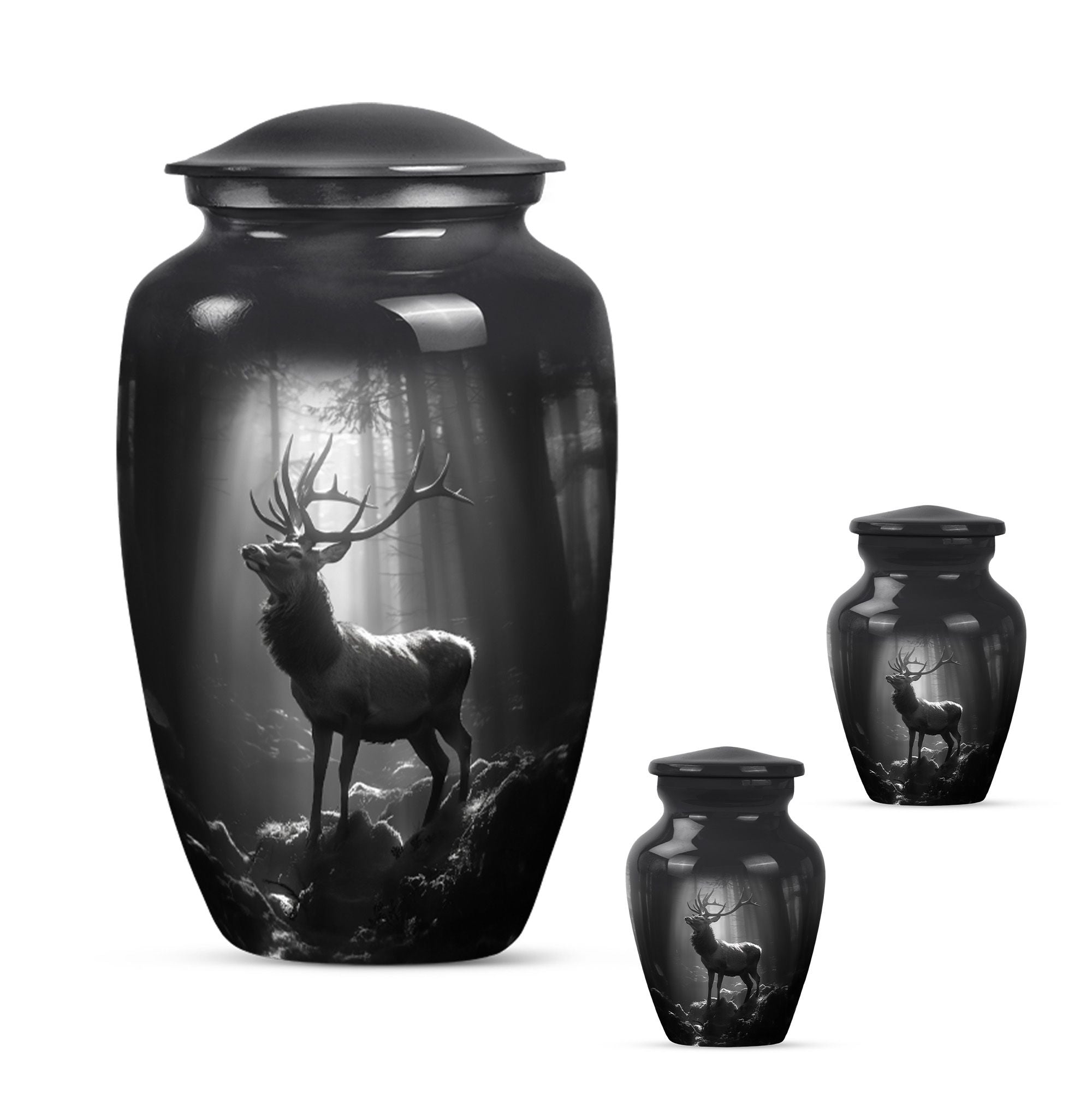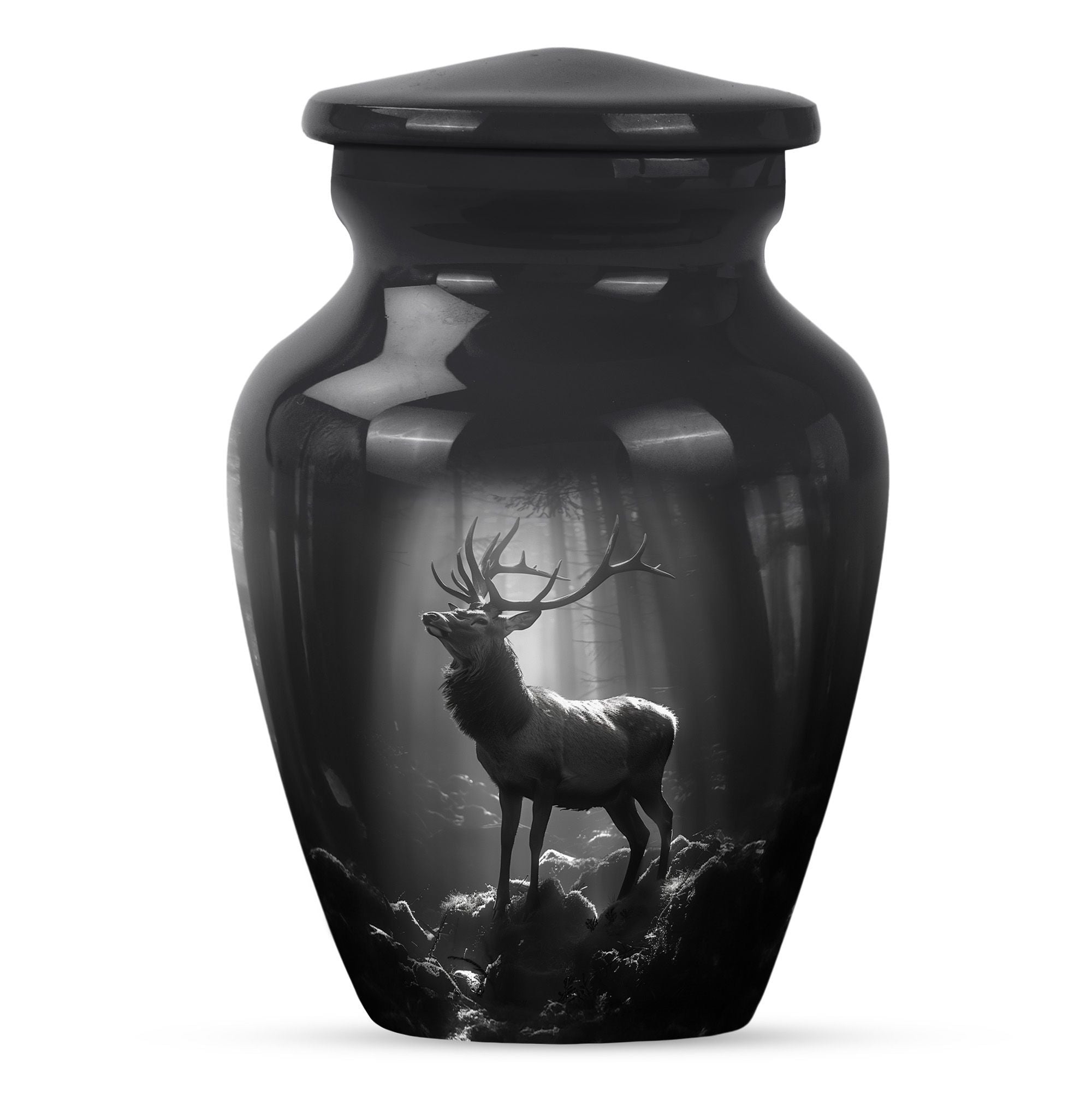 This 10-inch, grand Deer Urn is a reverential option for commemorating a loved one's journey to the next beyond. Crafted from lightweight yet durable aluminium material, it embodies the noble deer and the timeless beauty of a gramophone theme. With the substantial capacity of 200 cubic inches, it serves as a large urn suitable for adult human ashes, making it a meaningful choice for funeral burial needs. Weighing in at 3.3 pounds with 10 inches in height, it's designed to comfortably rest on your cherished 'shaped shelf.' It also ships with a velvet pouch to securely contain the ashes and maintain utmost respect. A distinguishing feature of this cremation urn is the customization option - allowing you to personalize it further by engraving names showing a heartfelt tribute. Our Deer Urn is a worthy testament to a memorable life lived and loved while peacefully serving as an elegant artefact in your home.