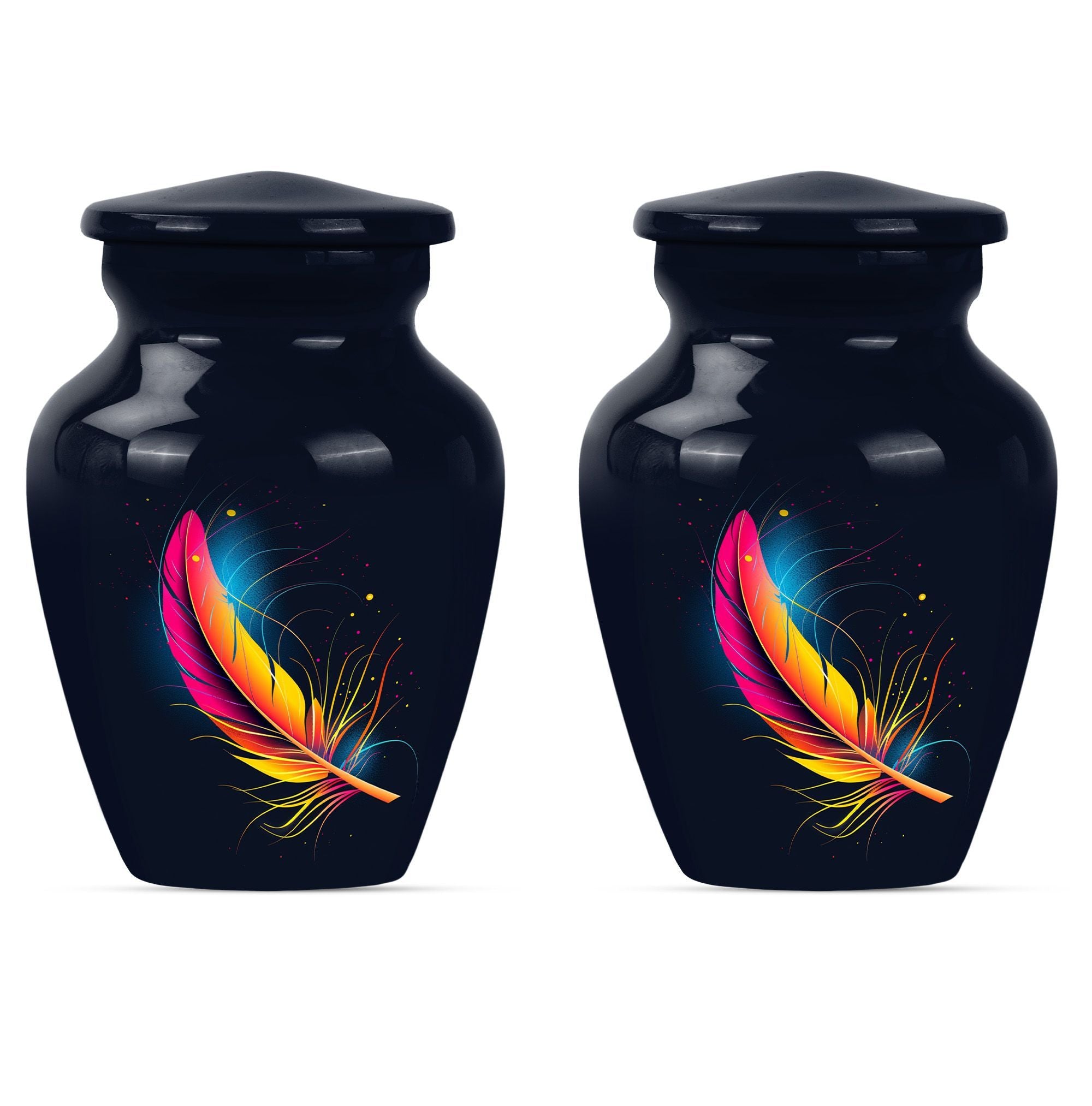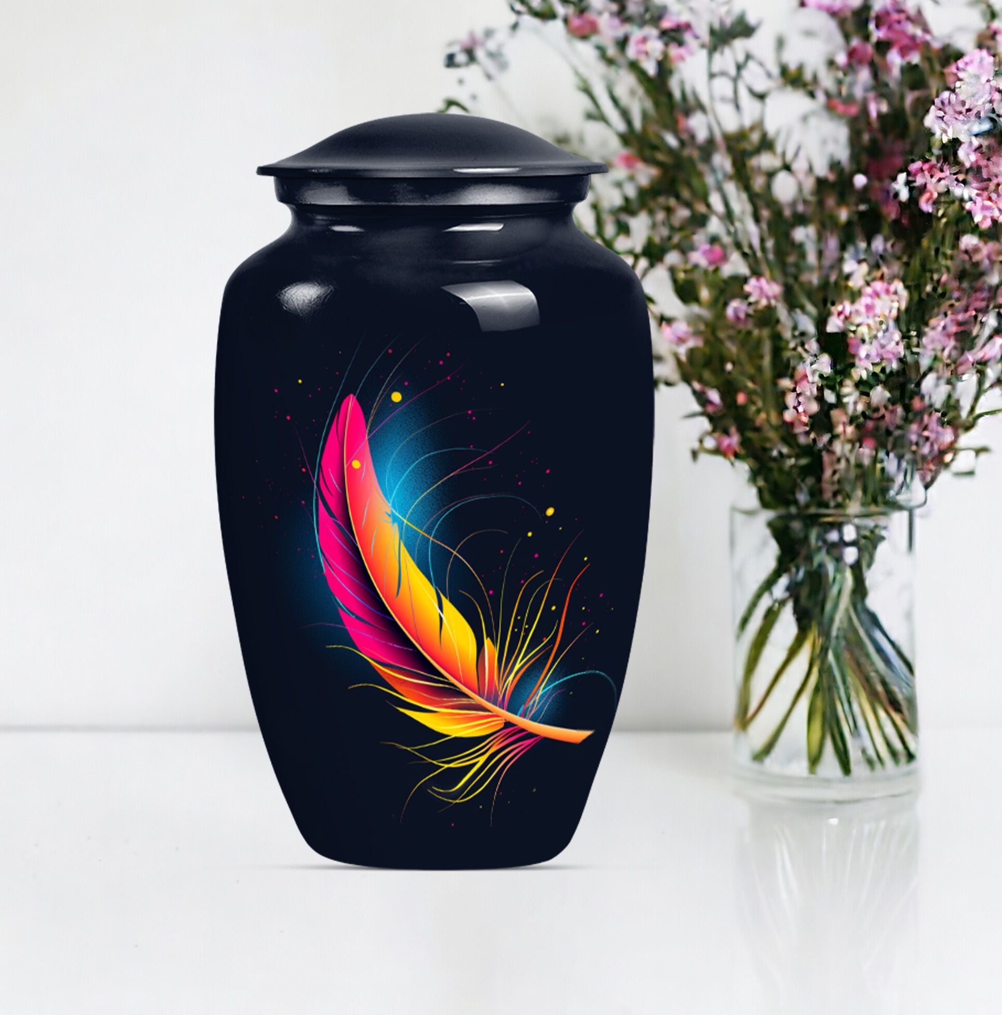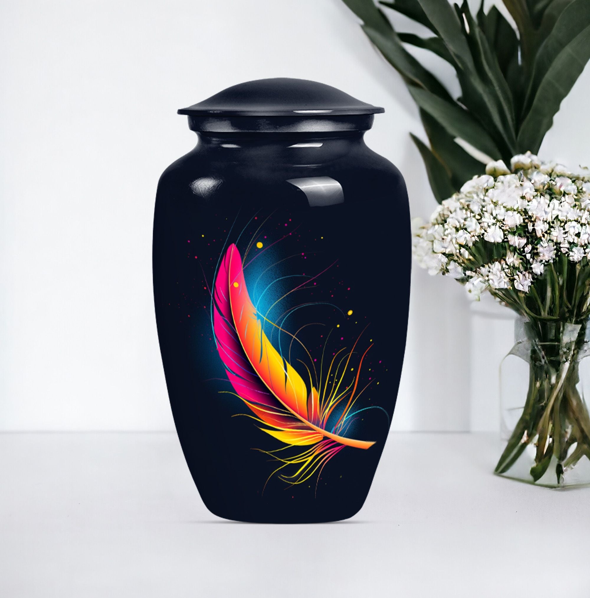 Immerse in the tranquility of your dearly departed's final resting place with our Purple Meadow themed 'Large Urns'. Crafted from premium quality aluminium, these funeral urns for an adult male dad or mom epitomize durability and elegance. The feather Urn measures 10 inches in height, offering a generous capacity of 200 cubic inches to safely hold the cremation ashes. It weighs a sturdy 3.3 pounds, characterized by a Classic Urn structure, blending seamlessly with any interior ambience. The cremation urn comes with a plush velvet pouch for the respectful containment of ashes. For a more personal touch, we extend the opportunity to personalize these memorial urns with engraved names, making the remembrance truly unique. Whether you are searching for feather Urns or cremation urns for a woman, our collection assures a memorable tribute to the cherished lives. Note: Design not detailed.