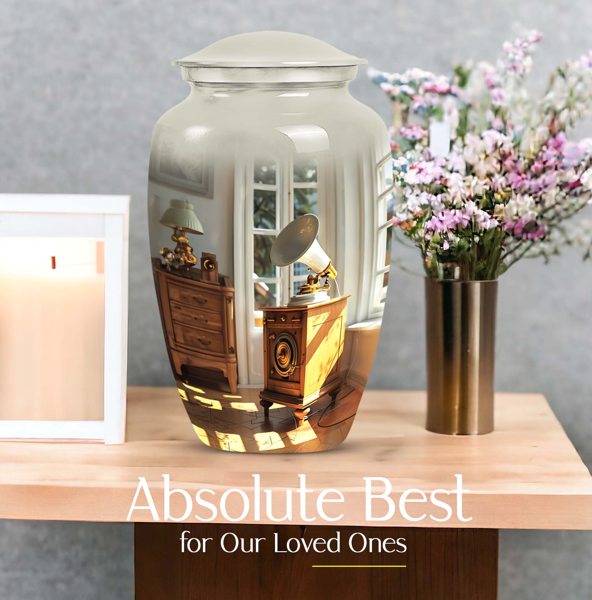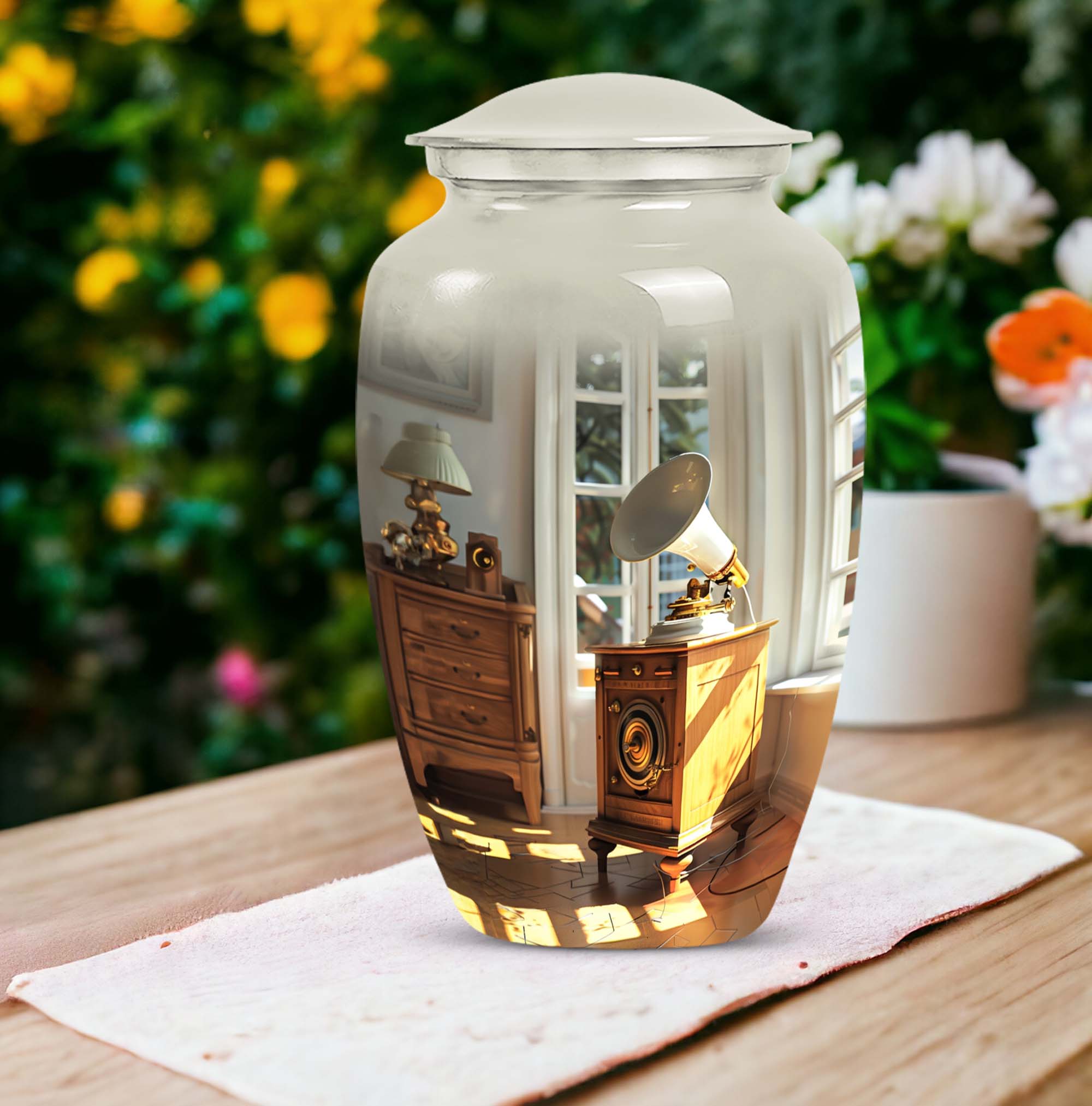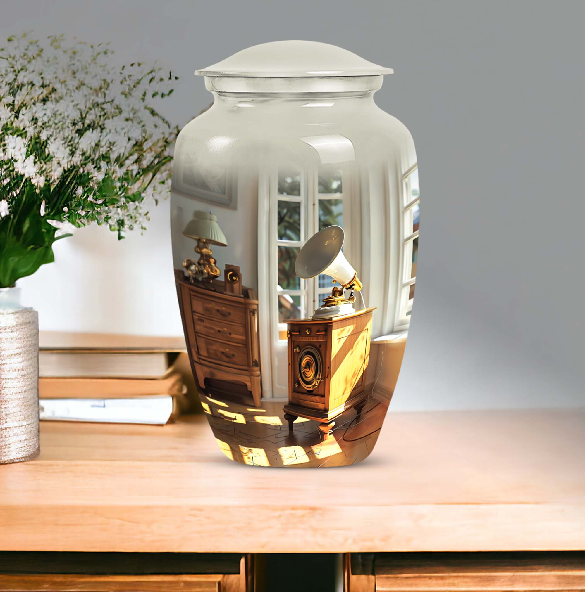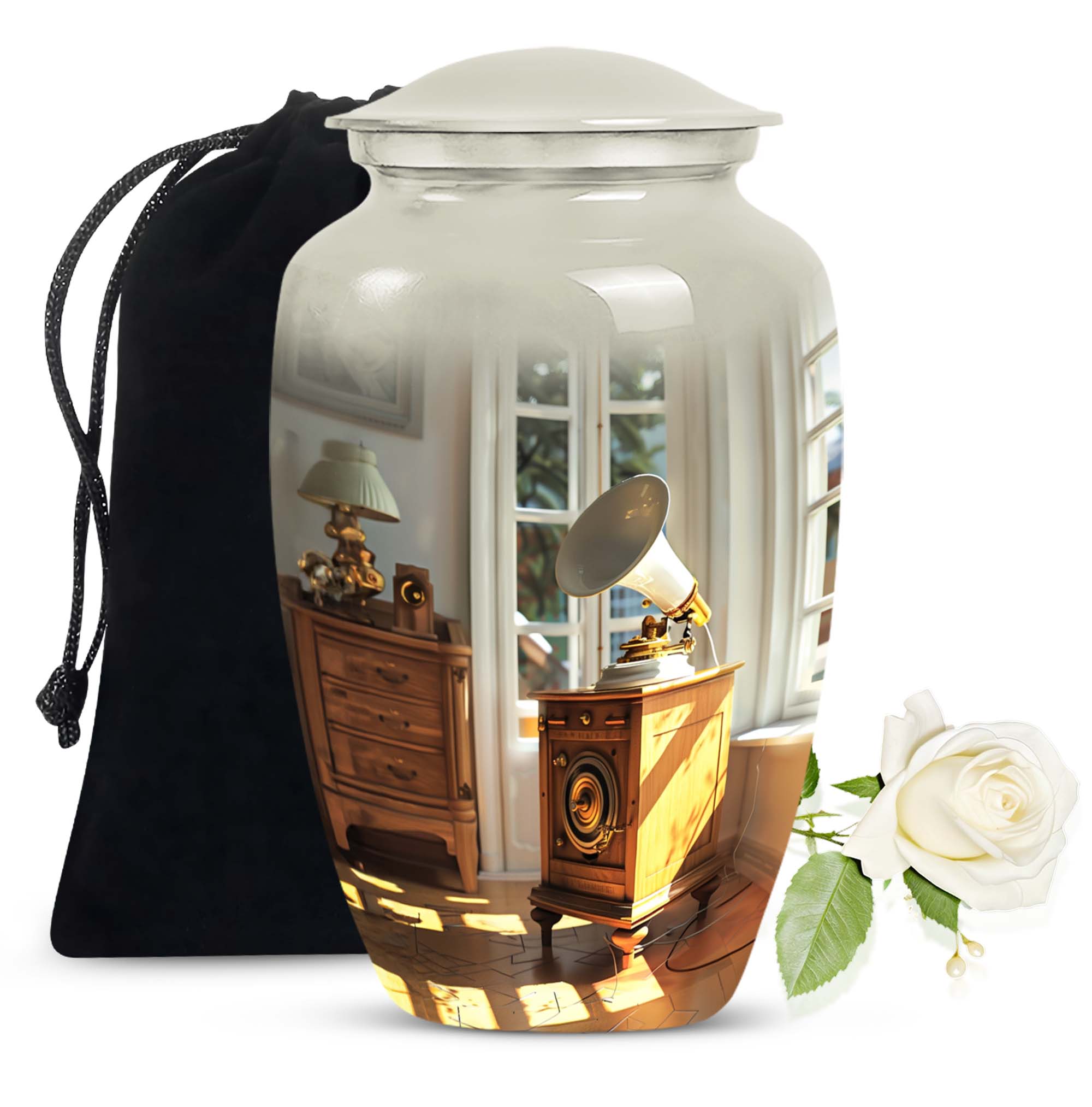Curate a unique and reverential remembrance with our Gramophone Urn, an extraordinary option in our range of memorial urns. A must-have Memorial Ceremony Supply, this urn is perfect for the preservation of the ashes of a beloved adult male. Fashioned from high-grade aluminium, this large urn provides a significant capacity of 200 cubic inches and weighs 3.3 pounds. Measuring 10 inches in height, it's an optimal fit for numerous traditional placements. The urn comes with a velvet pouch for respectful and dignified containment of your loved one’s ashes. As a meaningful feature, you can personalize this classic urn with engraved names, making it a truly unique memorial piece. Excellently sized, it comfortably classifies as a cremation urn, funeral medium size urns for human ashes or as companion cremation urns for 2 adults. Its gramophone theme adds an antiquated charm to the remembrance of the departed soul and can be found by searching 'human urn adult' or 'urns for human ashes adult' on the search engine.